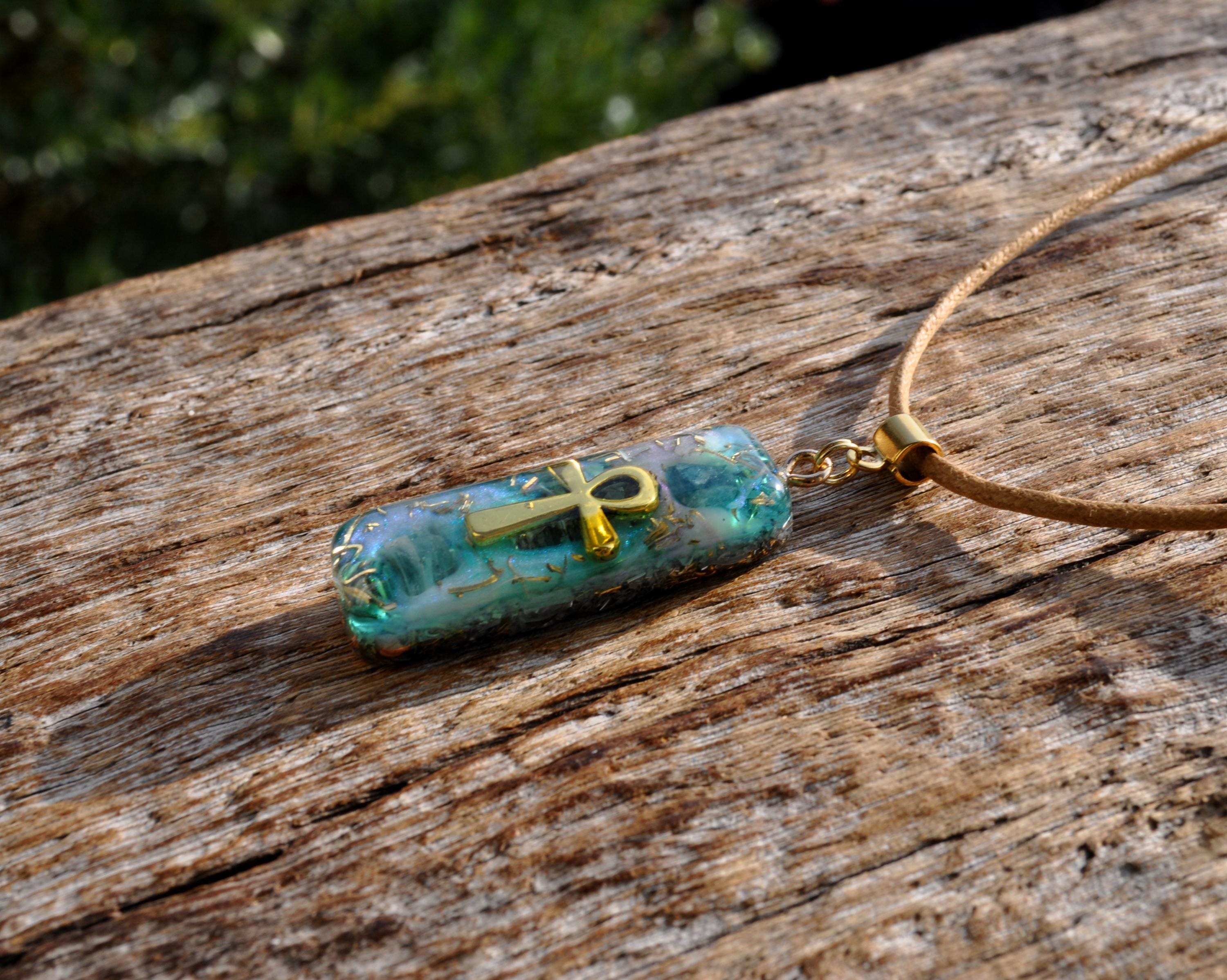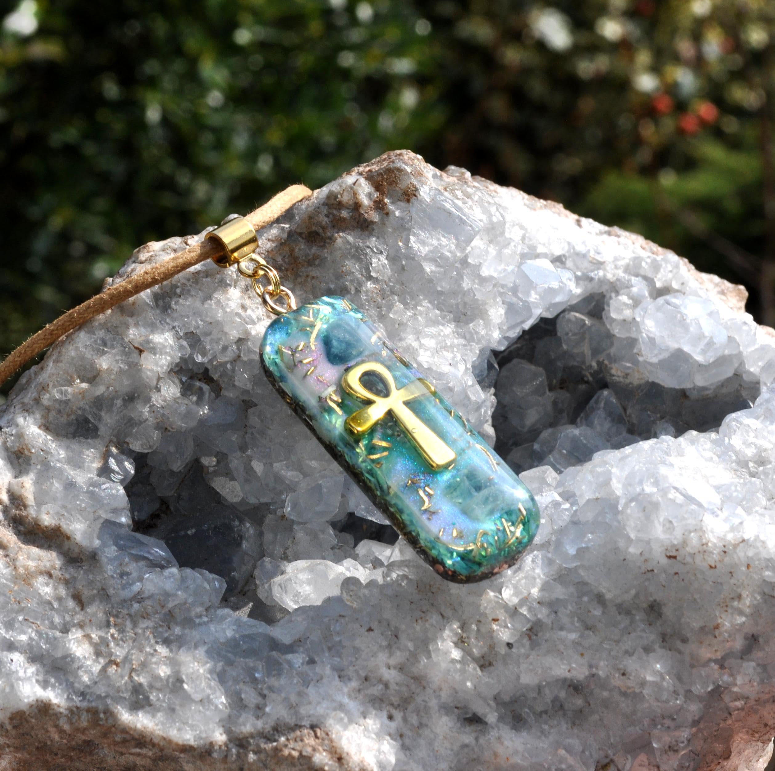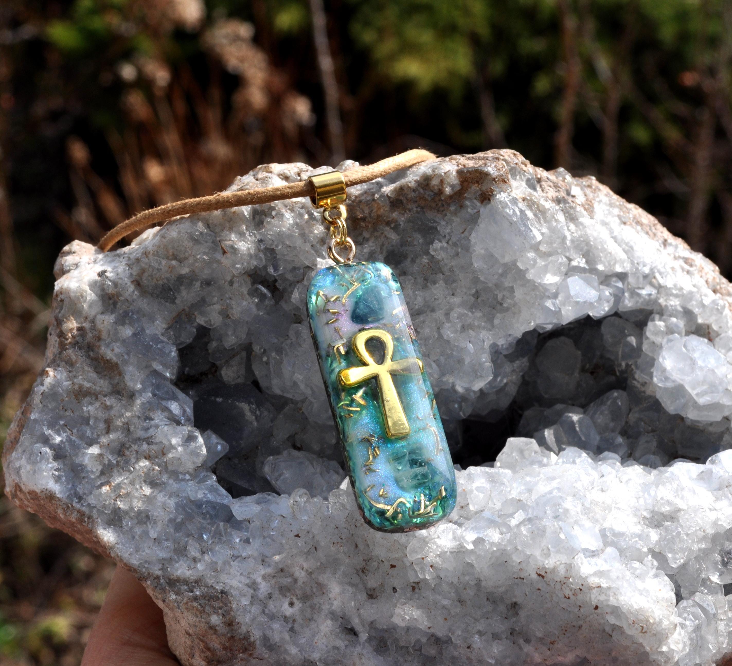 Behind the Ankh and crystals, I created a layered background in beautiful shades of blue with soft hints of violet, giving the pendant depth, movement, and a peaceful ocean-like feel.