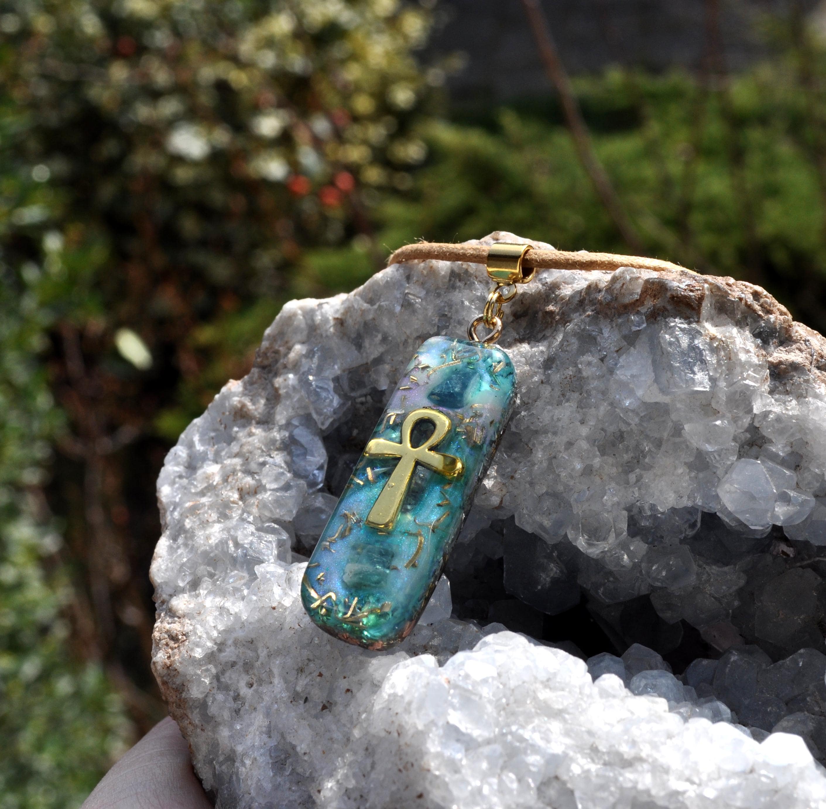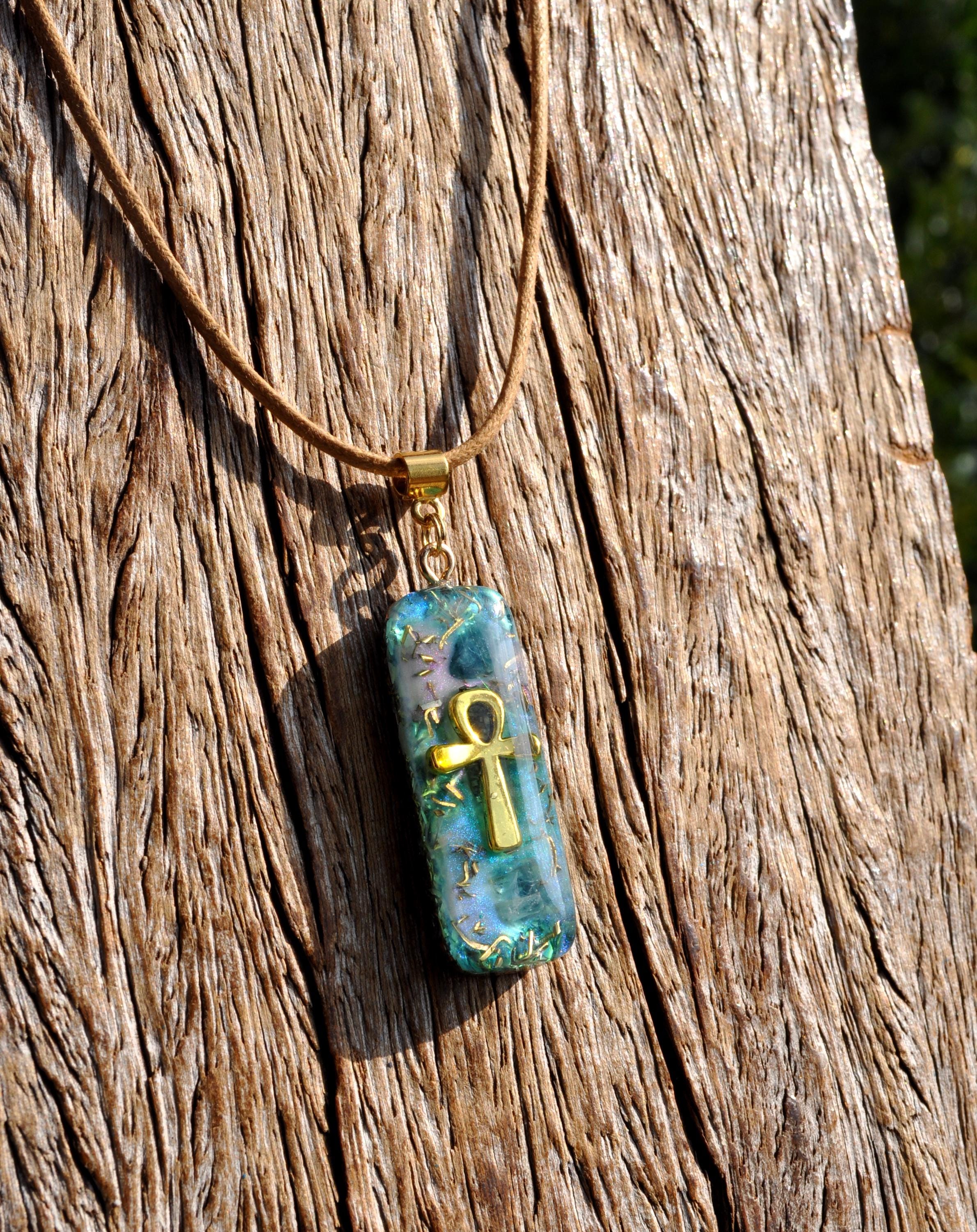 This handmade gold Ankh pendant combines ancient symbolism with calming blue crystal energy.