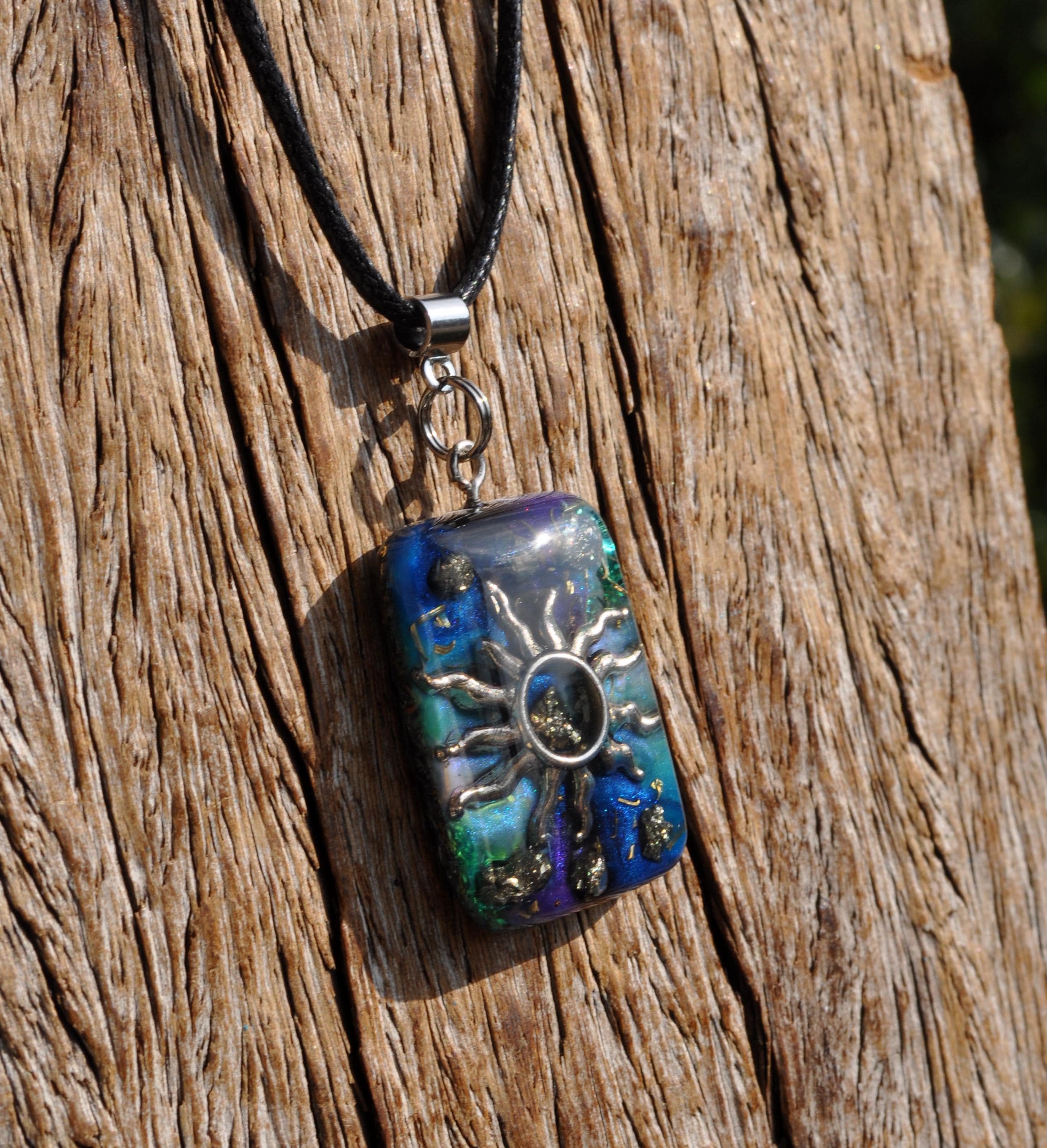This handmade Orgonite® pendant features a radiant Sun 🌞 symbol with a raw Pyrite stone at its center, set in a vibrant, hand-poured resin base. I carefully layer and blend shades of black, purple, green, and blue — a process that takes time and attention — so not all pendants have the same five colors, making each piece truly unique.