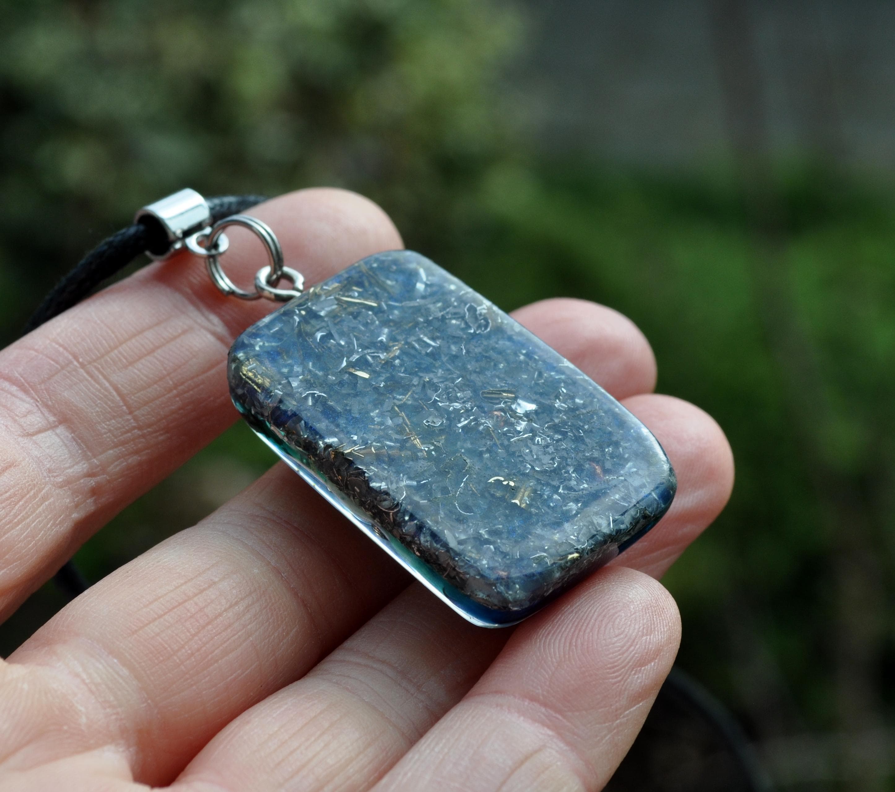 The pendant also contains a dynamic mix of aluminium, bronze, copper, and brass shavings to help harmonize energy, along with Shungite, Black Tourmaline, Rhodizite, Selenite, and Clear Quartz for protection, grounding, energy amplification, and clarity.