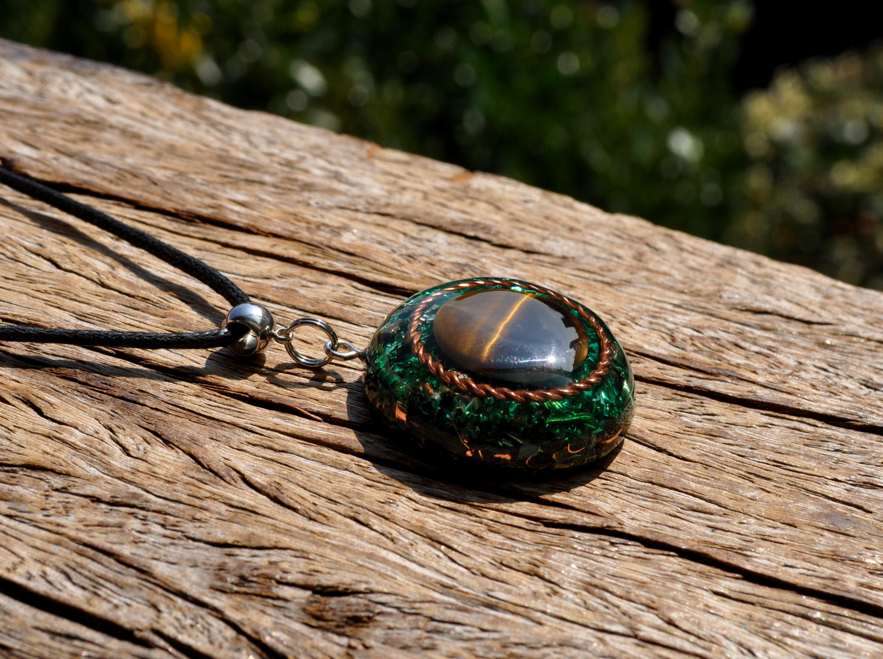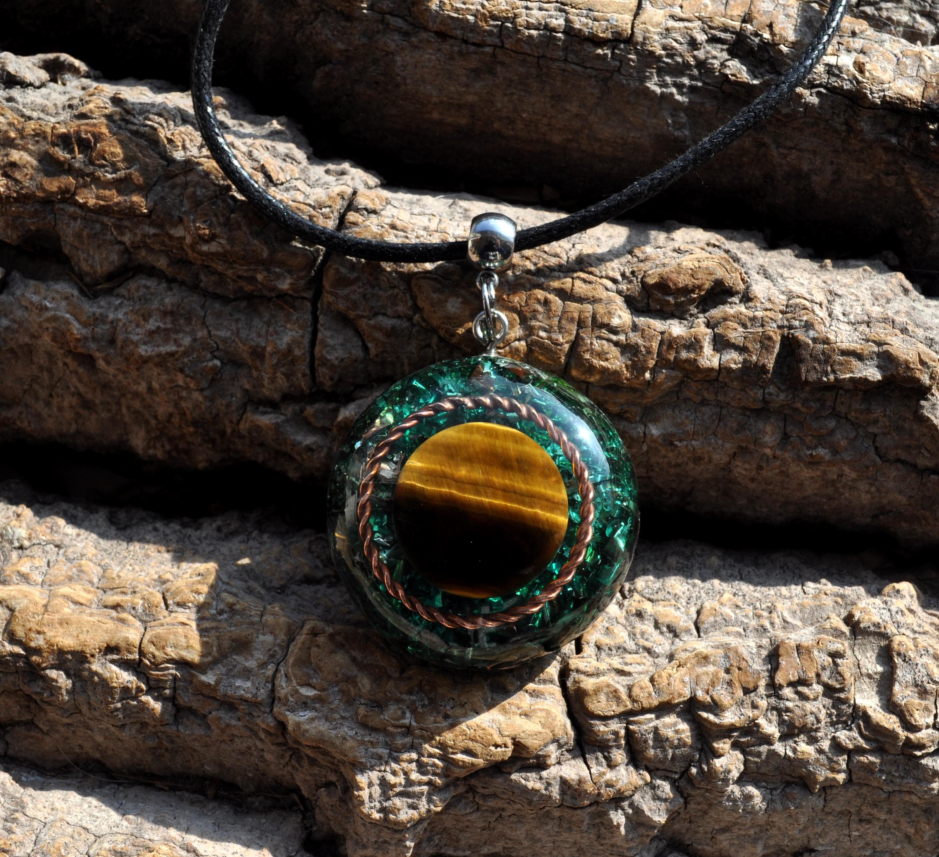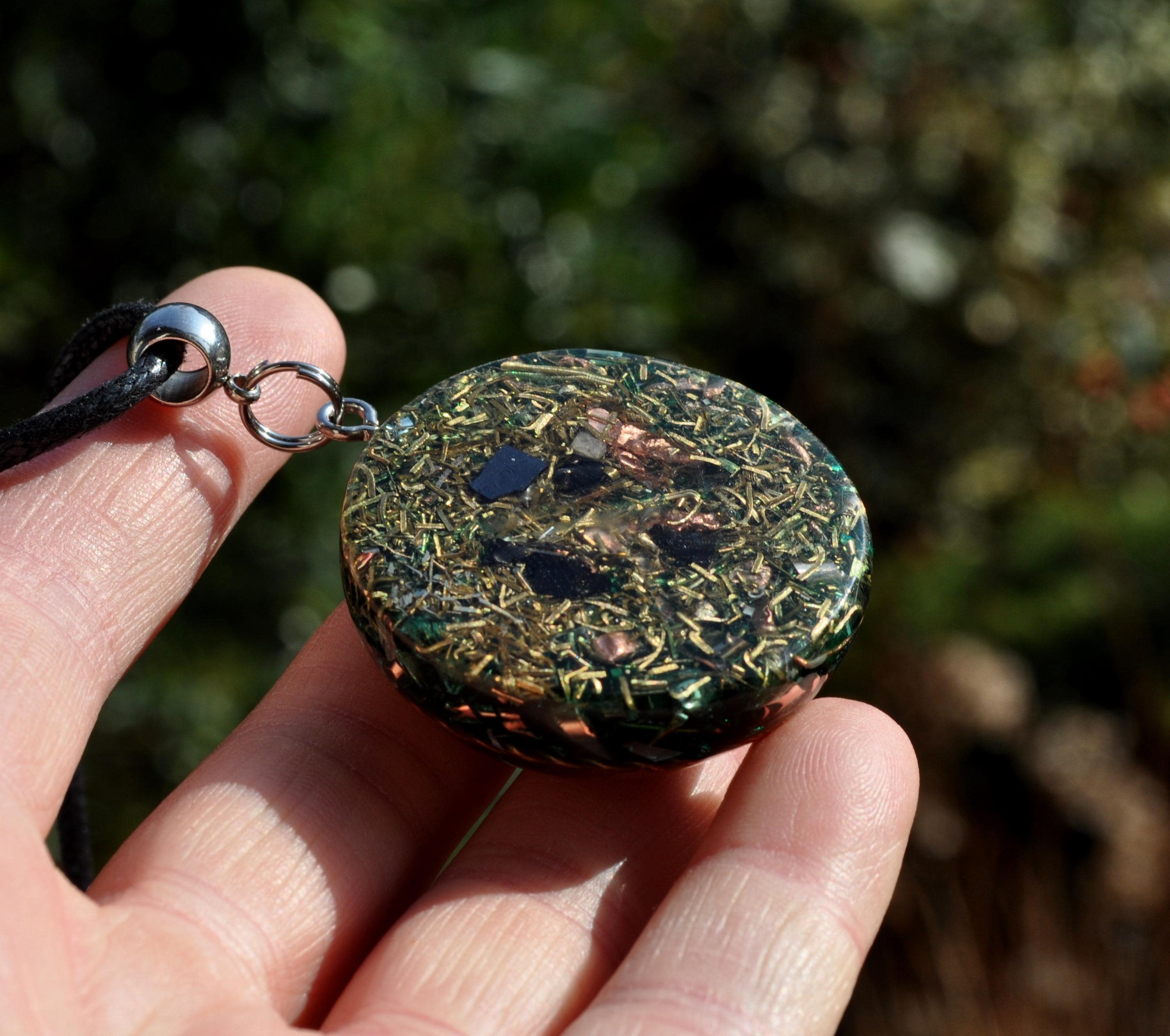 Orgonite combines resin, metal shavings, and quartz crystals to create a natural flow of harmonious energy. Quartz is especially valued because of its piezoelectric effect, producing a tiny electrical charge that enhances the energetic qualities of the pendant.