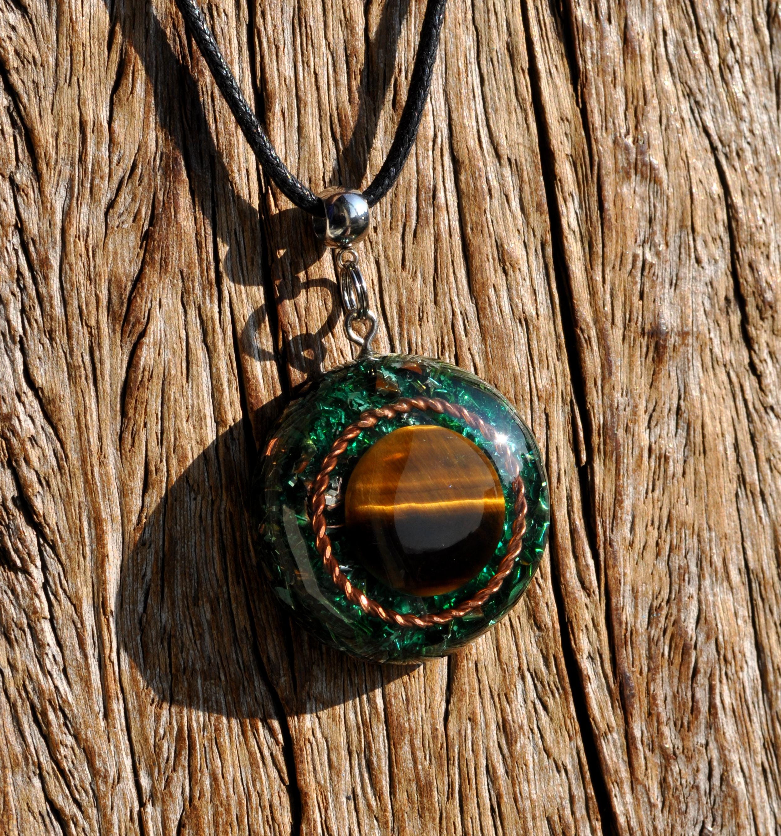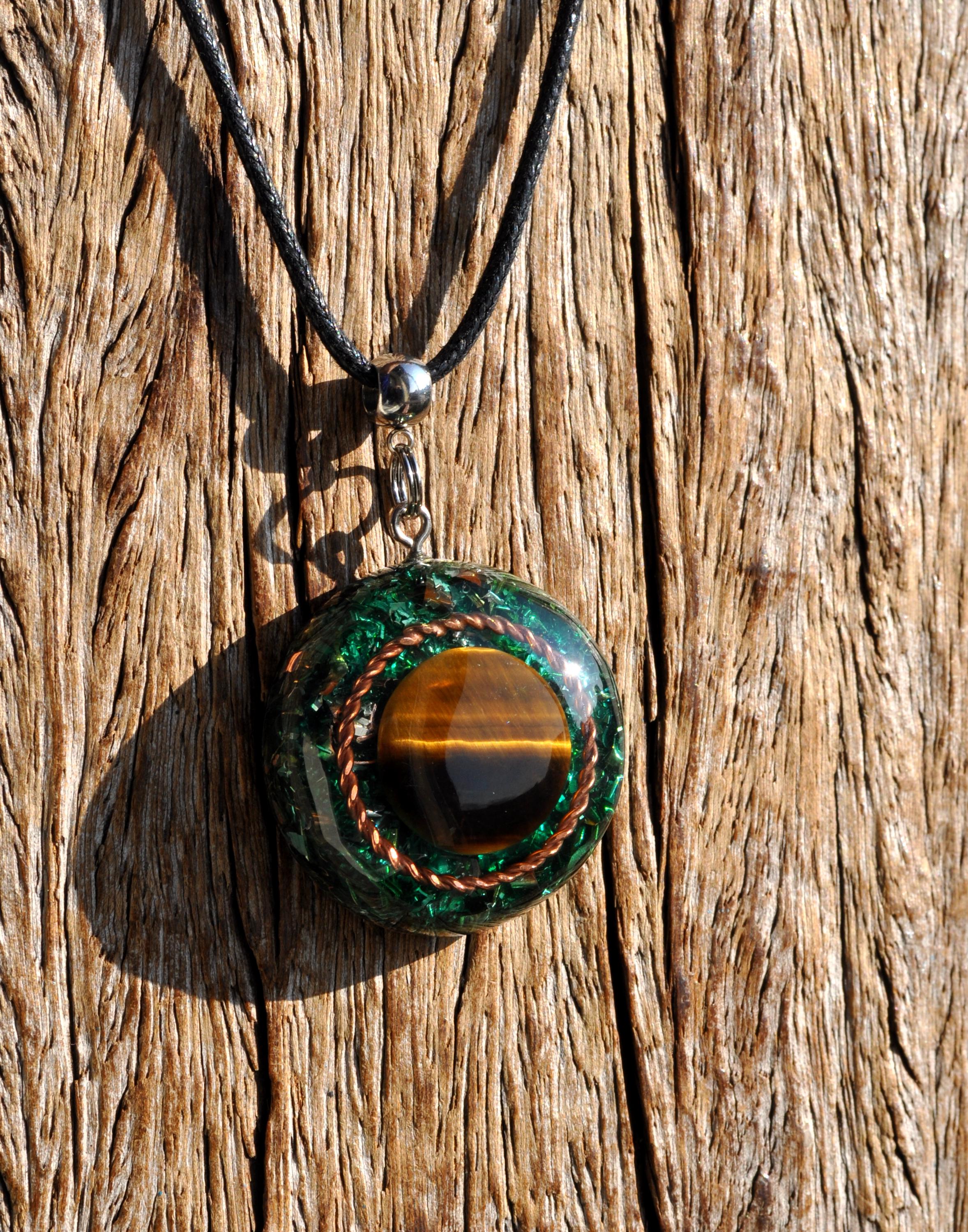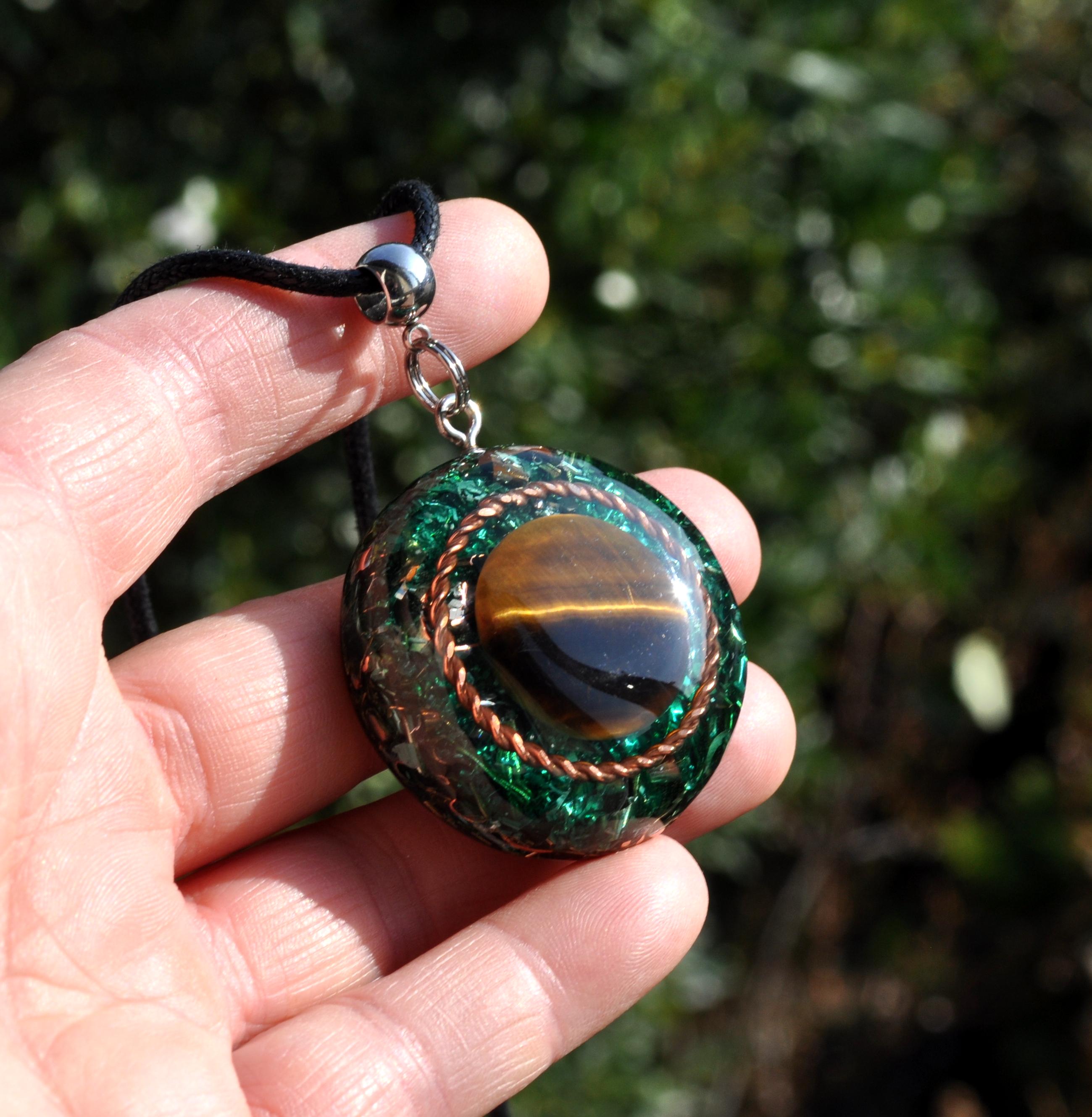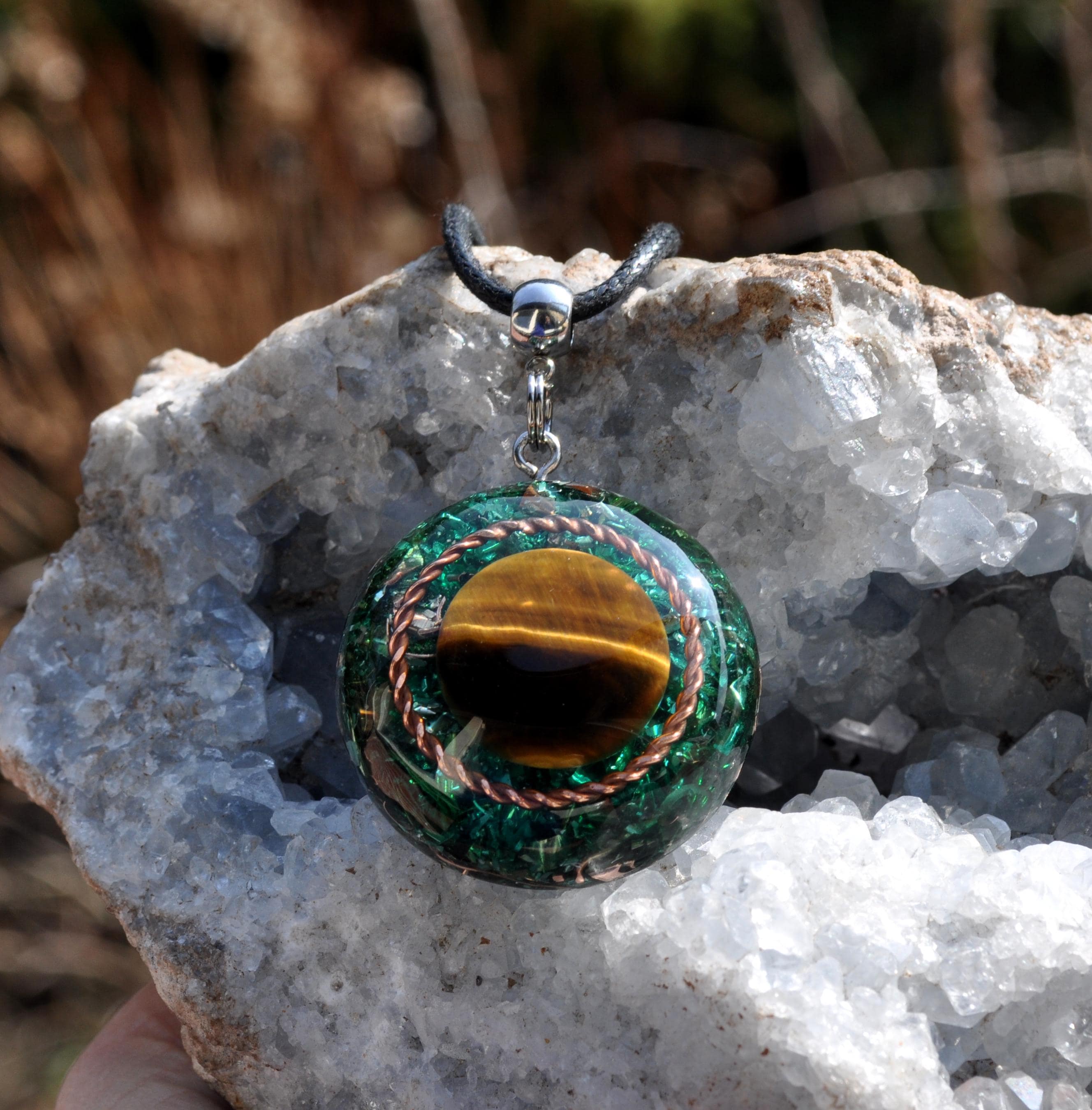 Orgonite combines resin, metal shavings, and quartz crystals to create a natural flow of harmonious energy. Quartz is especially valued because of its piezoelectric effect, producing a tiny electrical charge that enhances the energetic qualities of the pendant.