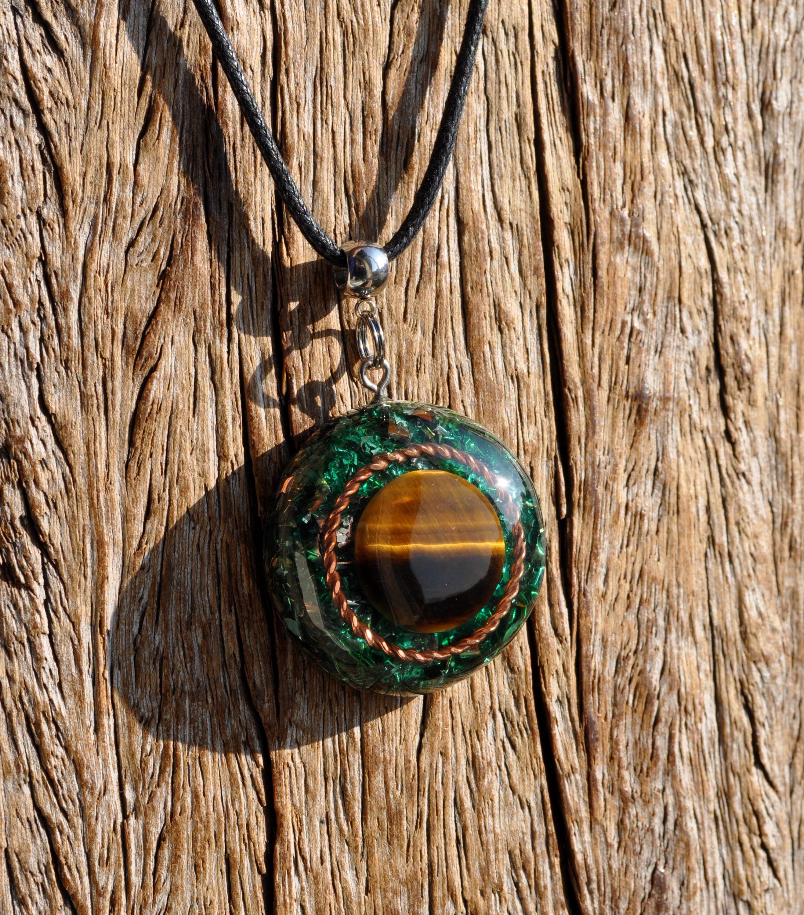 The round crystal at the center of this orgonite pendant is a shiny Tiger’s Eye, surrounded by a Copper Tensor Ring. This ring is carefully crafted to represent balance, harmony, and vitality. Tensor rings are often valued for their connection to energetic flow and their ability to bring stability and coherence to daily life.