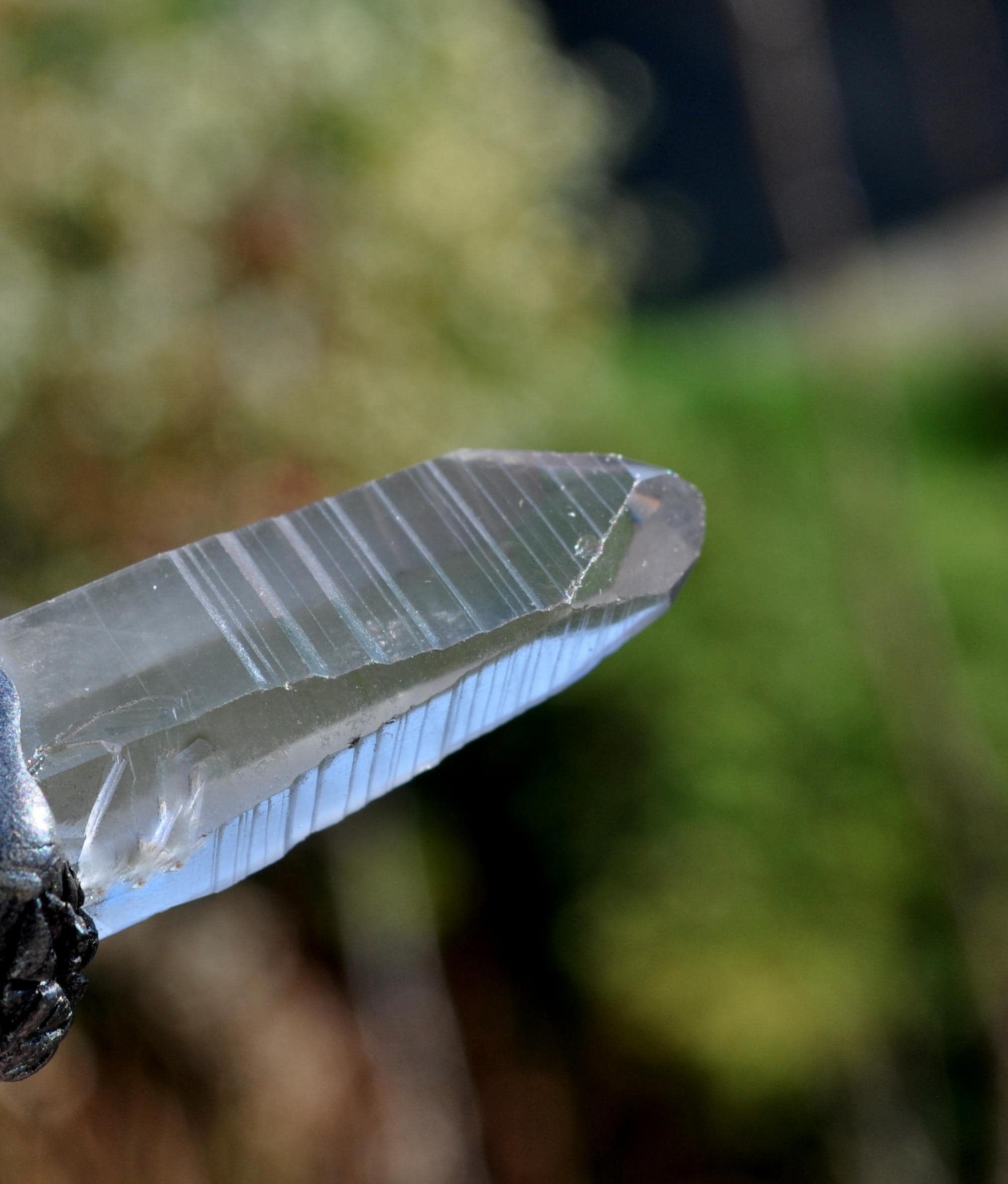 This hand-sculpted pendant combines three exceptional gemstones: a naturally terminated Lemurian Seed Crystal from Brazil, a vibrant Tanzanite, and a small green Peridot set at the top. The result is a visually striking and meaningful statement piece.