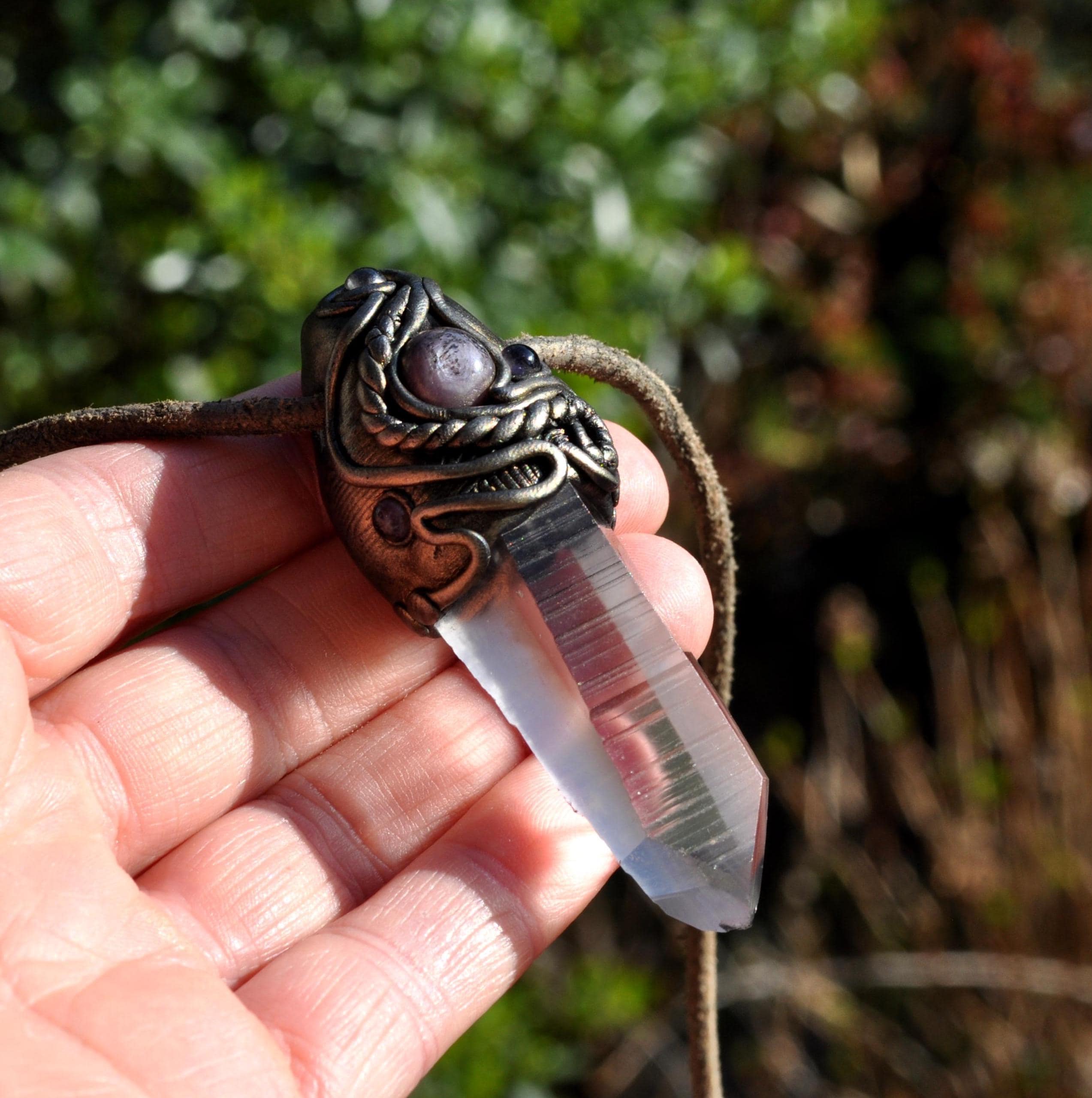This is a one-of-a-kind Laser Lemurian Quartz pendant, hand-sculpted by me with care. The crystal is AA-grade clear quartz with natural horizontal striations, tapering elegantly from a wide base to a sharp point.