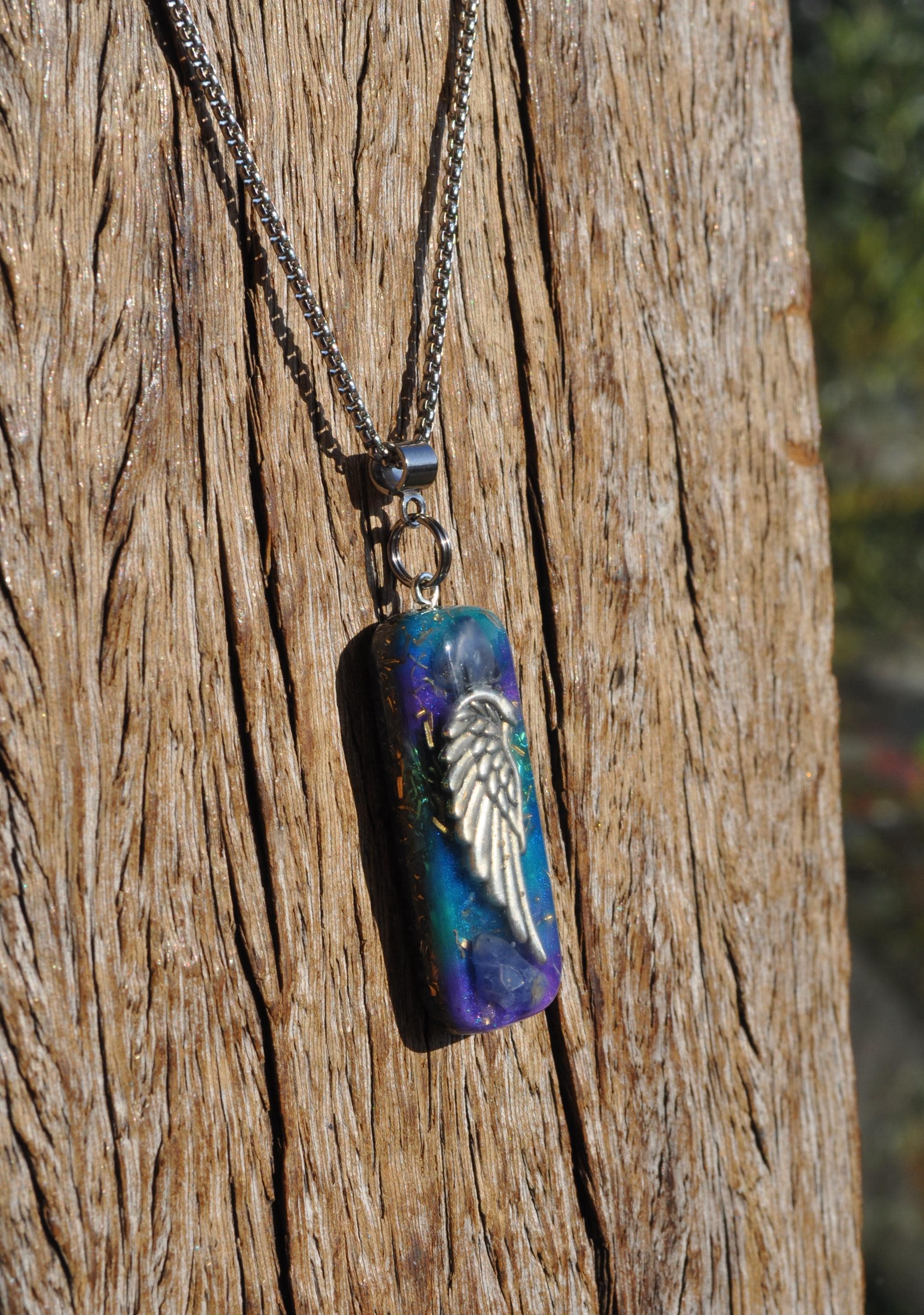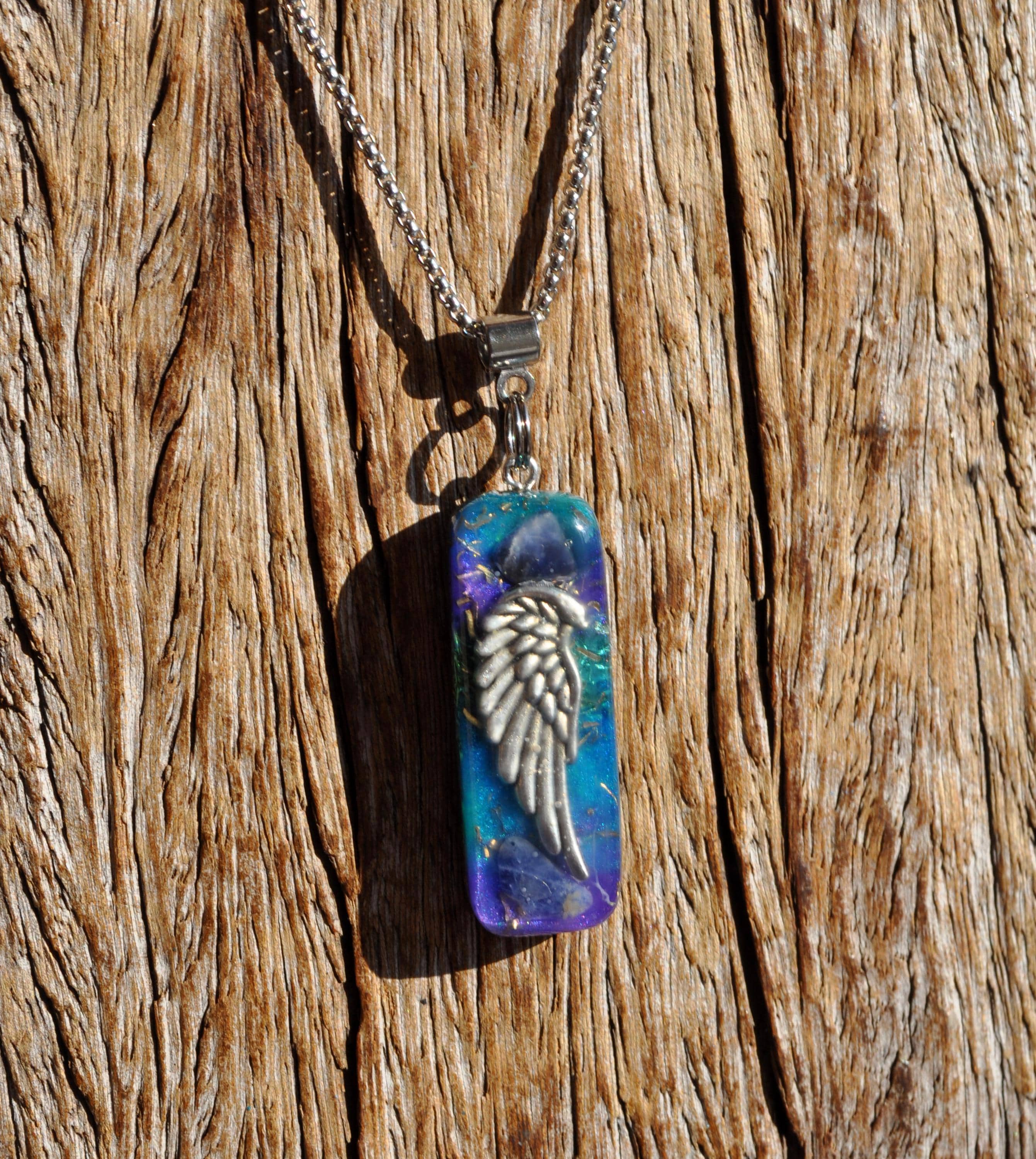 At the top sits a piece of Sodalite. Below it is a silver wing symbol. Under the wing, I poured layers of resin in blue, turquoise, and purple tones to create a flowing, multicolor background. Within these layers are metal shavings and a crystal mix, carefully arranged before the resin cured.