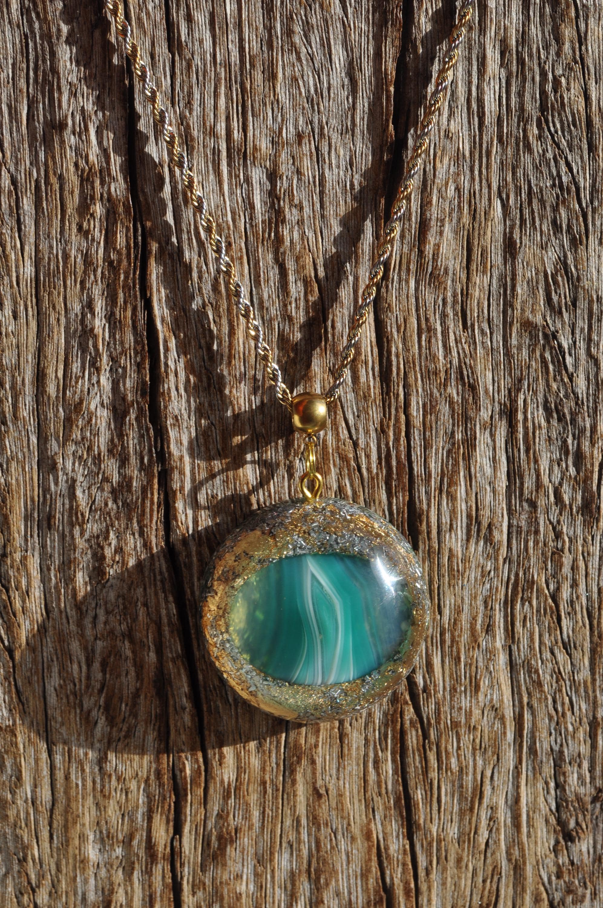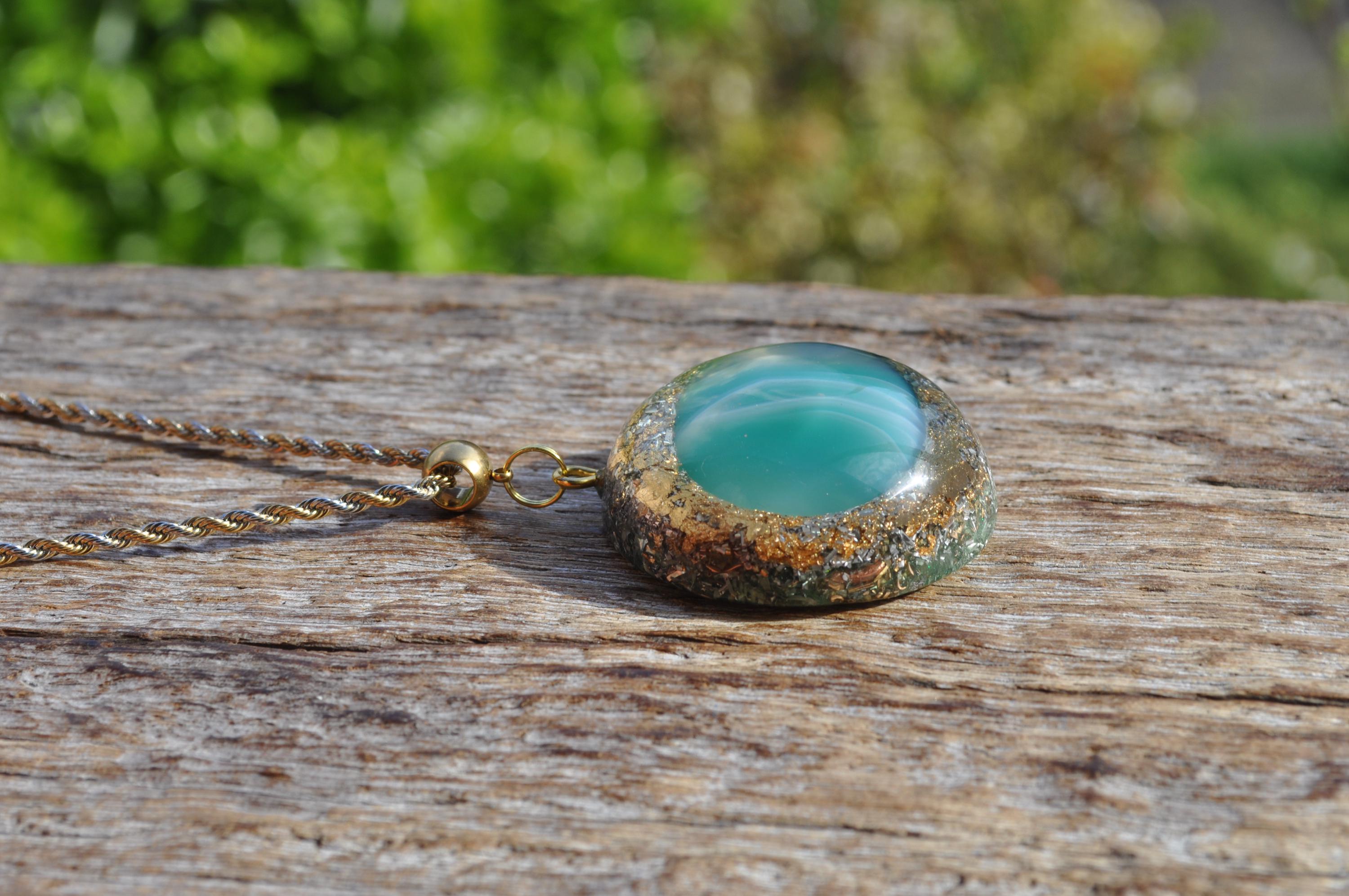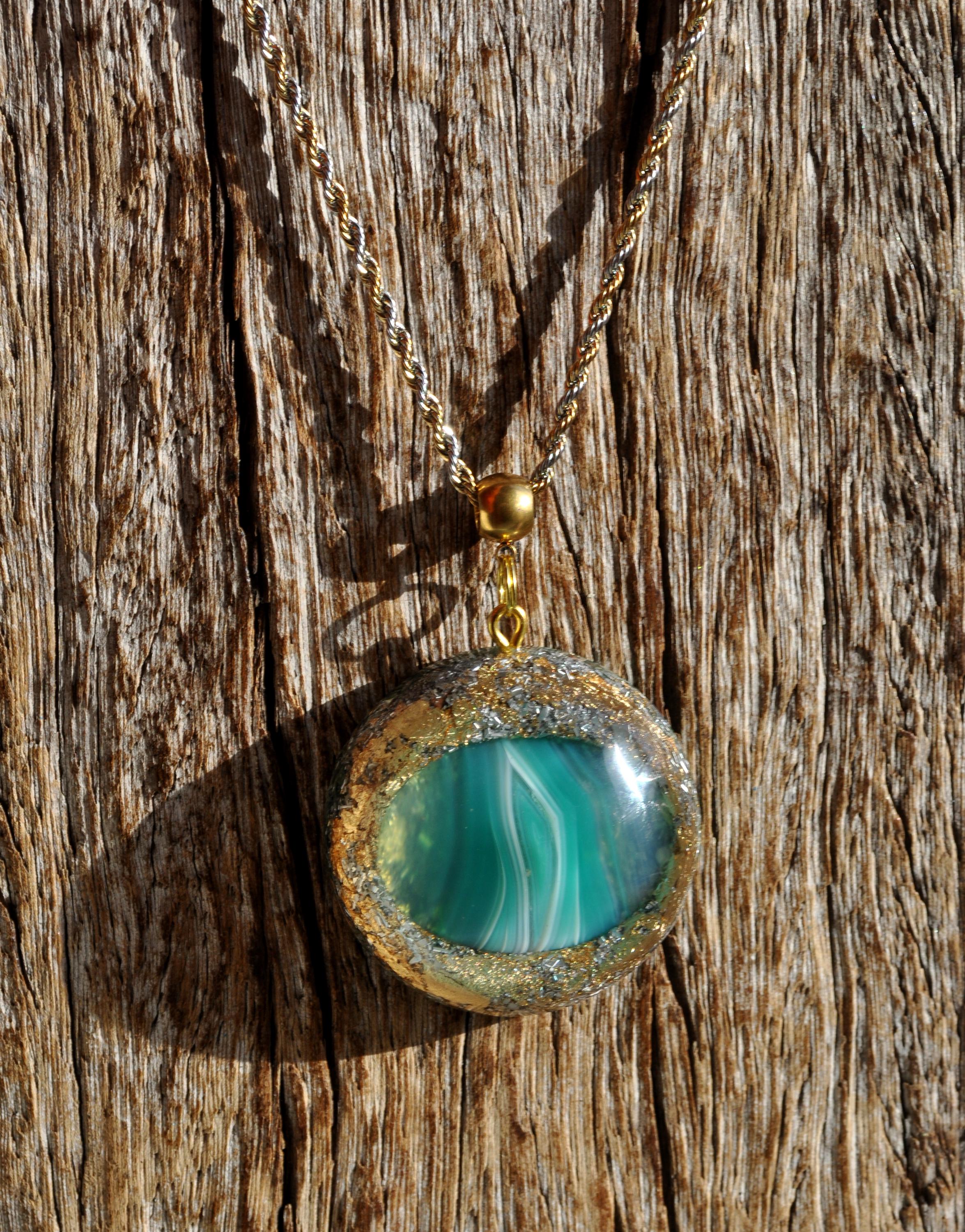 Make your look stand out with this beautiful handmade Orgonite® pendant. Measuring 4.2 cm (1.65 inches) wide, it features a striking green banded Agate at its center, carefully shaped and polished from raw stone by lapidarist Stefan. Natural white banding flows through the stone, making each piece truly one of a kind.