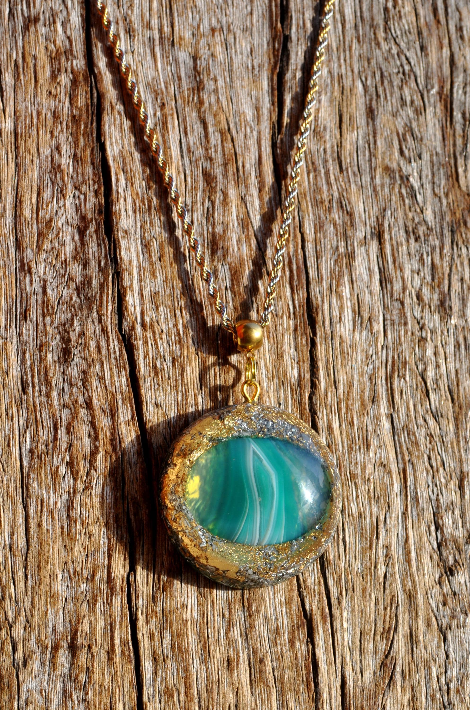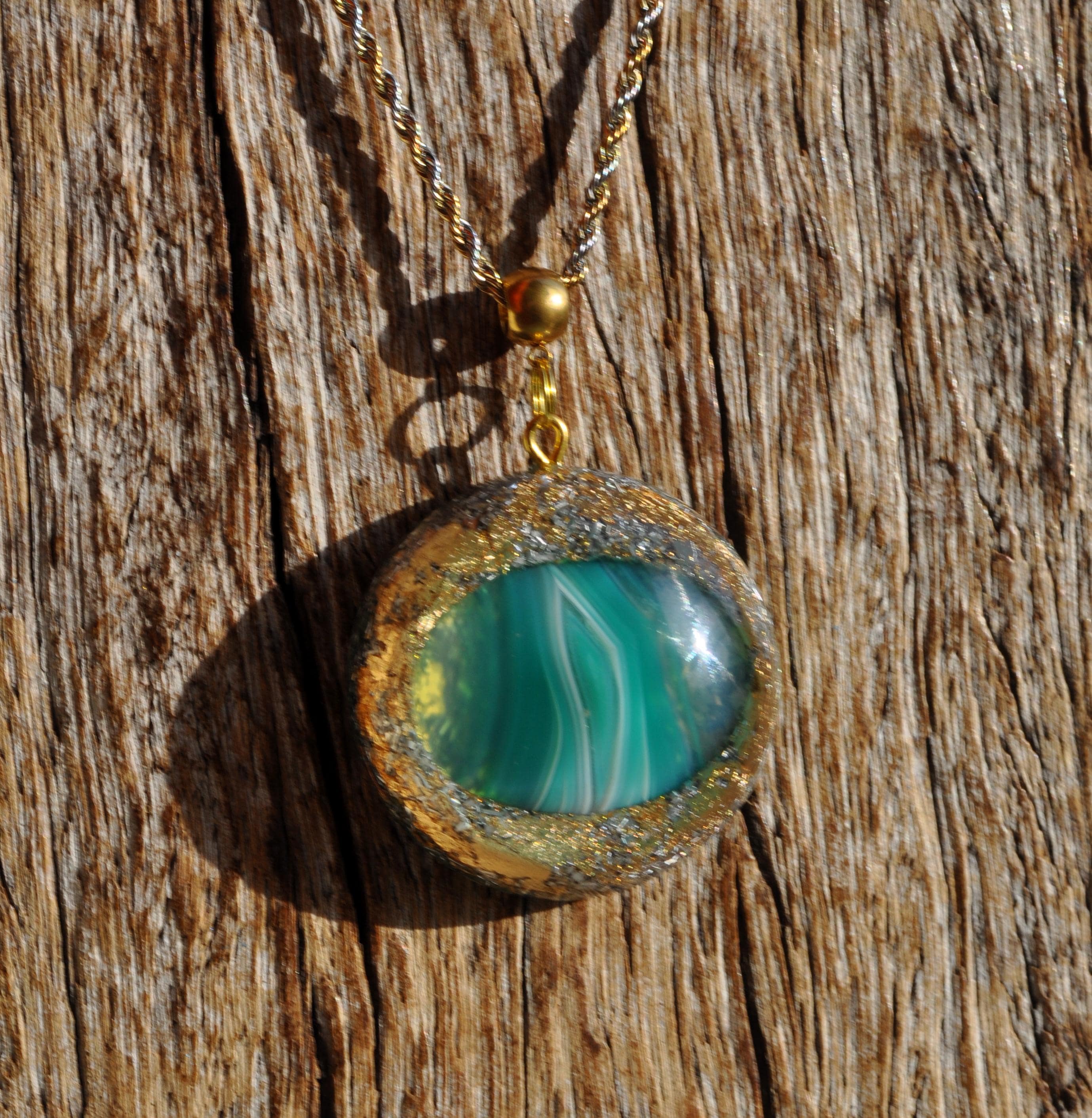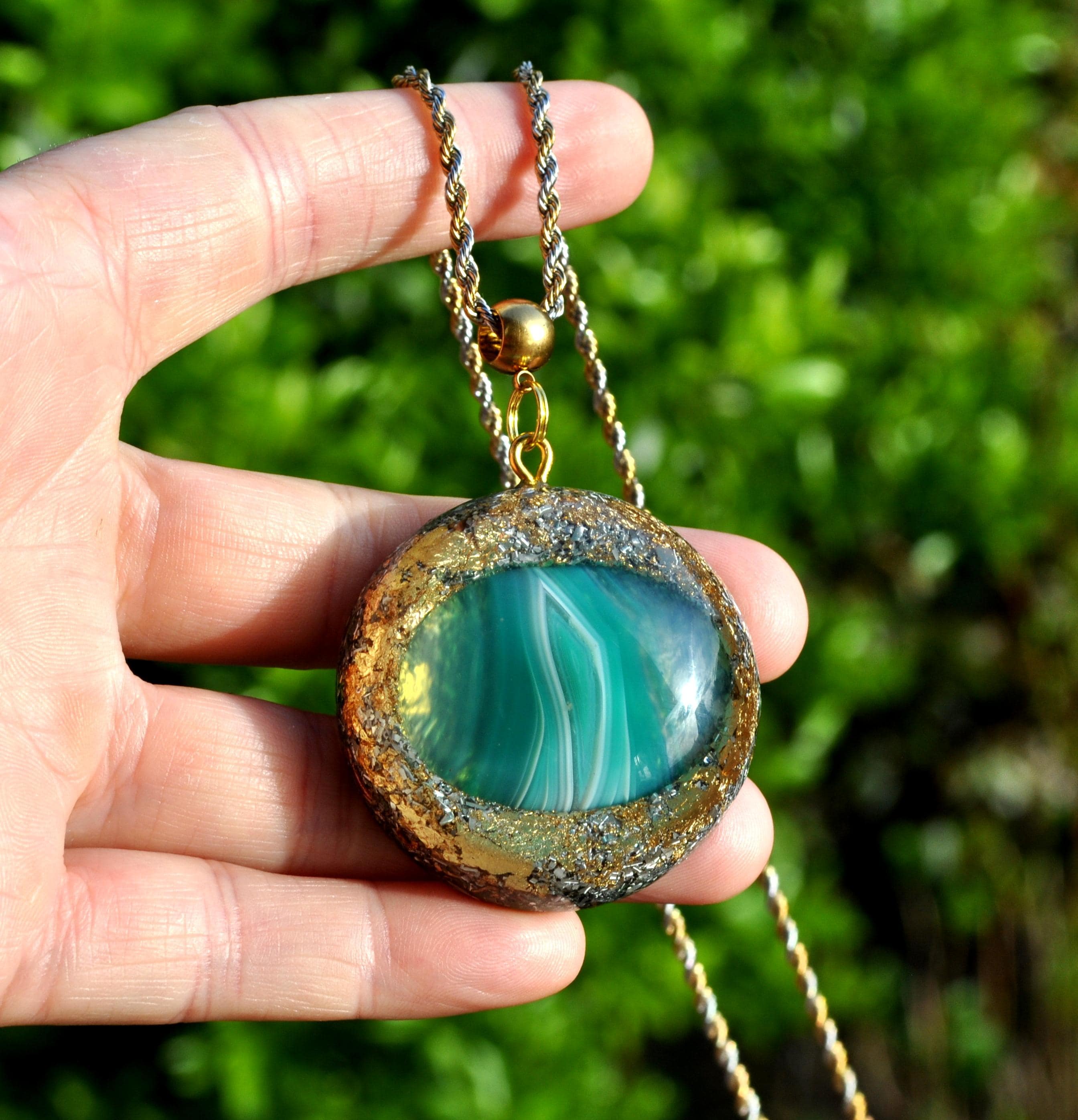 Make your look stand out with this beautiful handmade Orgonite® pendant. Measuring 4.2 cm (1.65 inches) wide, it features a striking green banded Agate at its center, carefully shaped and polished from raw stone by lapidarist Stefan. Natural white banding flows through the stone, making each piece truly one of a kind.