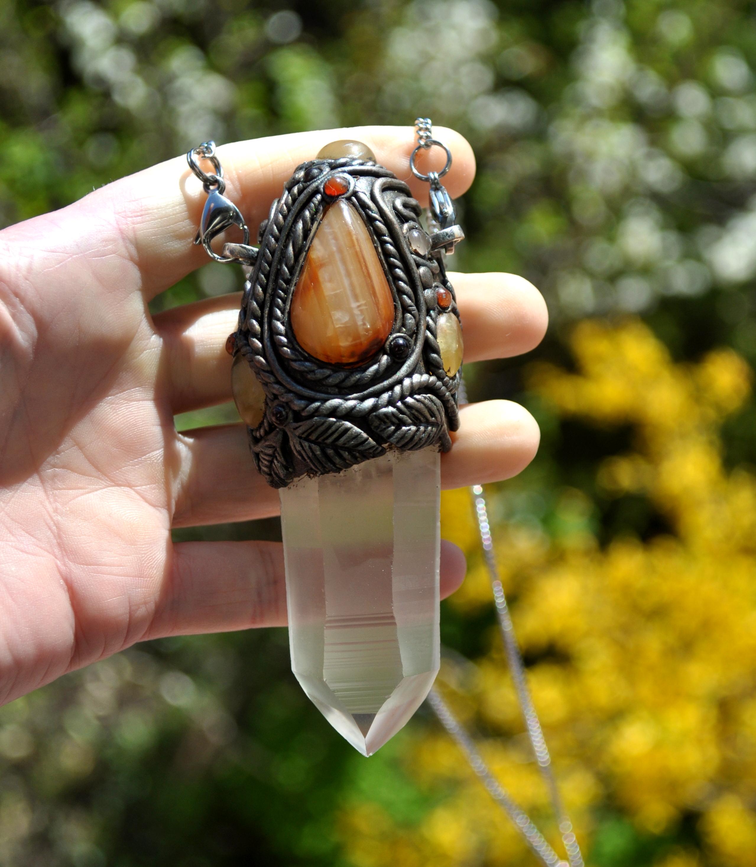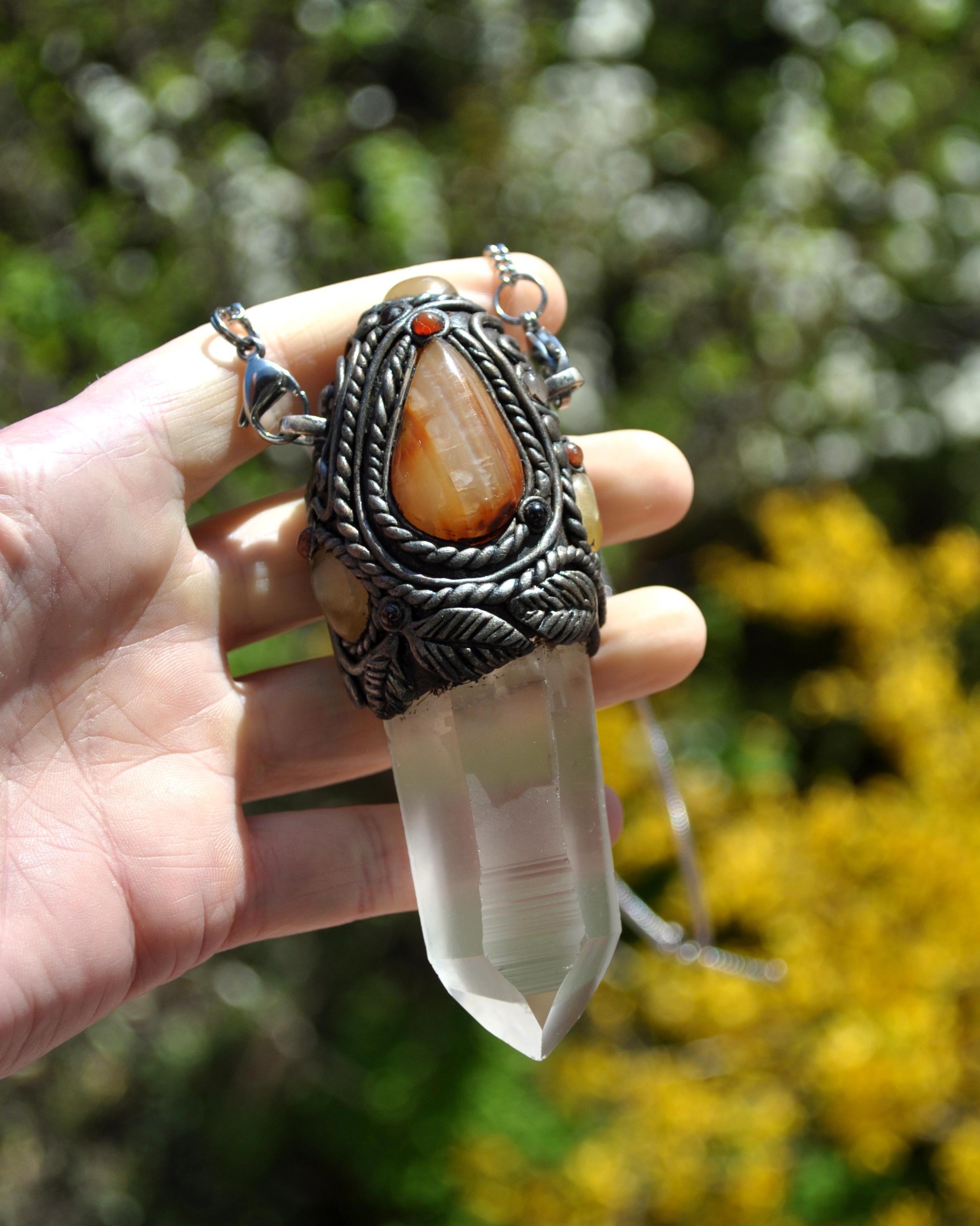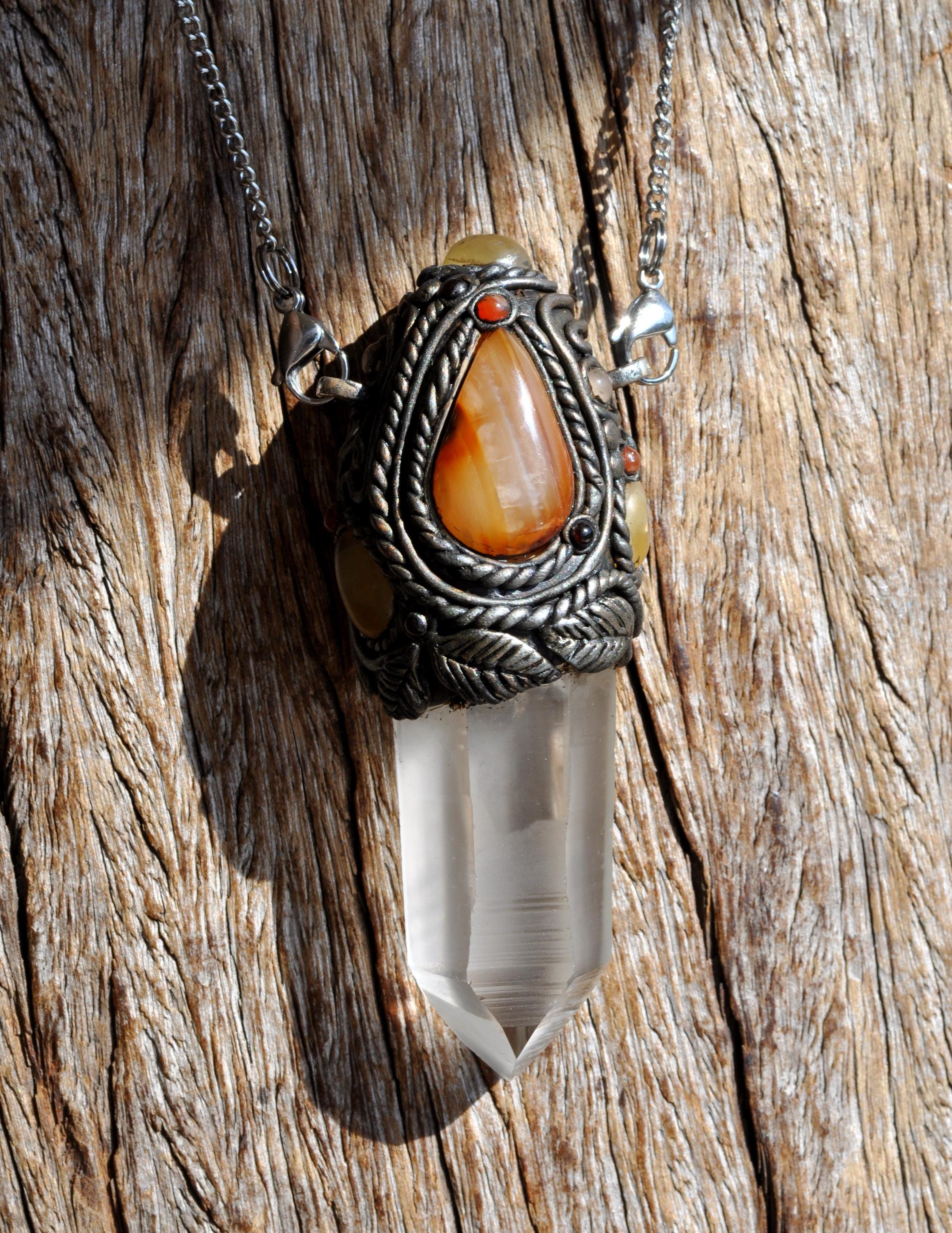 The Carnelian Agate teardrop serves as a grounding yet energizing focal point. Carnelian is traditionally associated with vitality, creativity, and confidence. It is often chosen by those seeking motivation, courage, and a stronger connection to their inner strength. Its warm, stabilizing character pairs beautifully with the clarity of Lemurian Quartz.