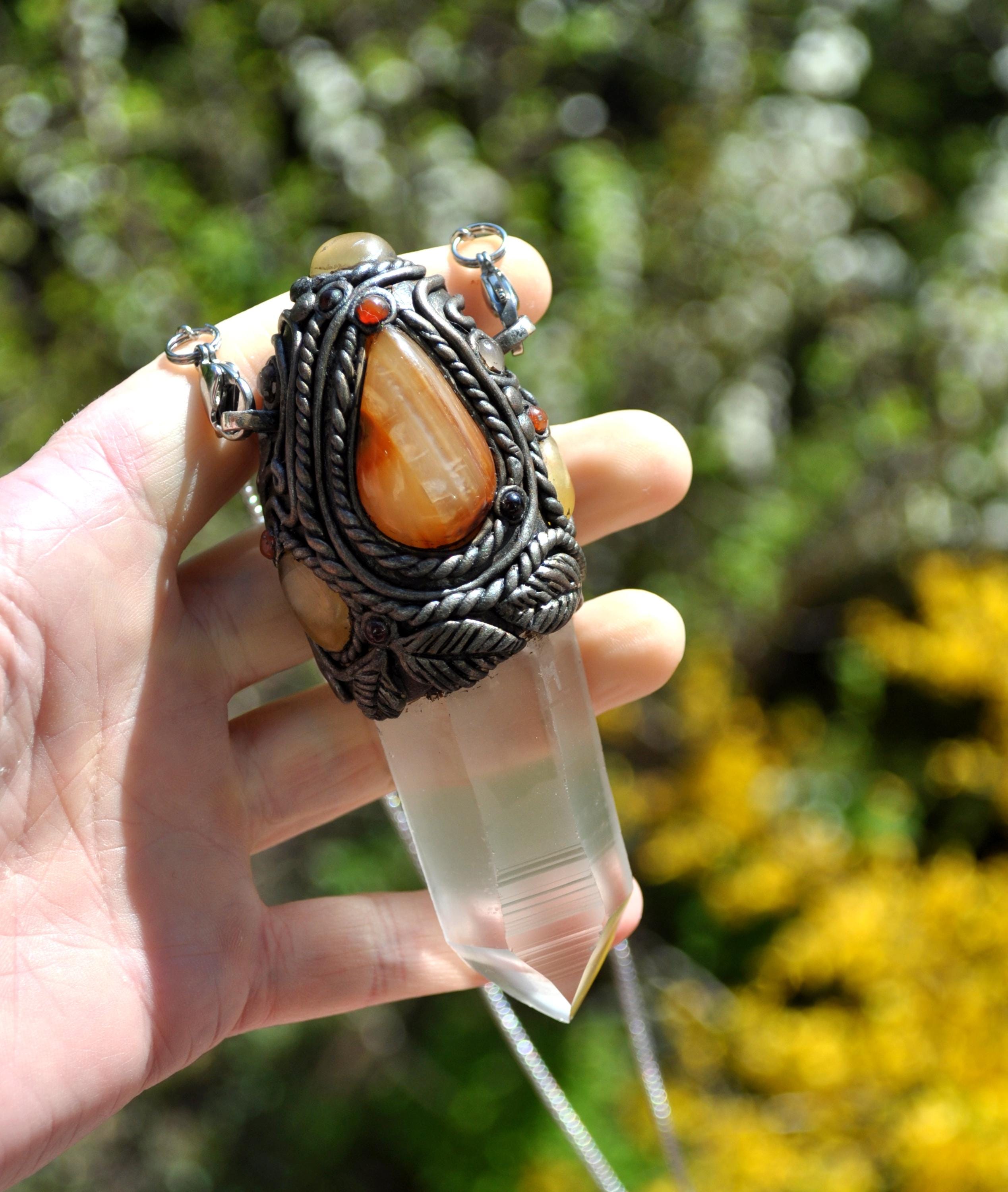 Lemurian Quartz Wand with Carnelian Agate Teardrop, Yellow Fluorite, Rose Quartz & Garnet | Crystal Healing Tool | Meditation Wand | Handmade Clay Setting