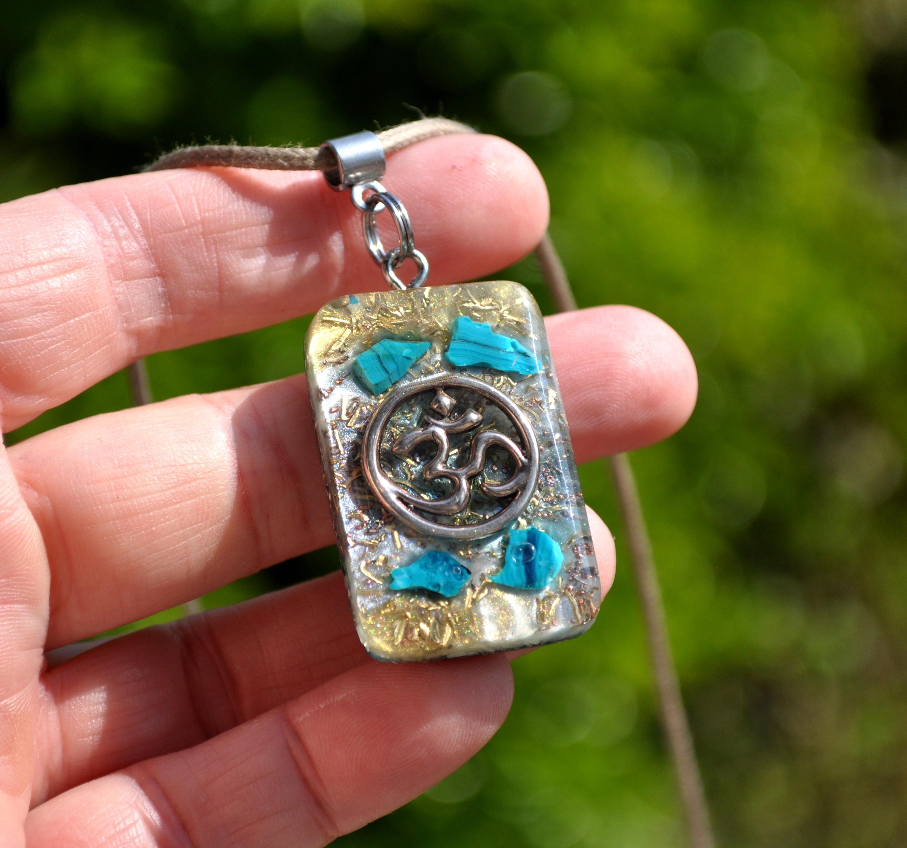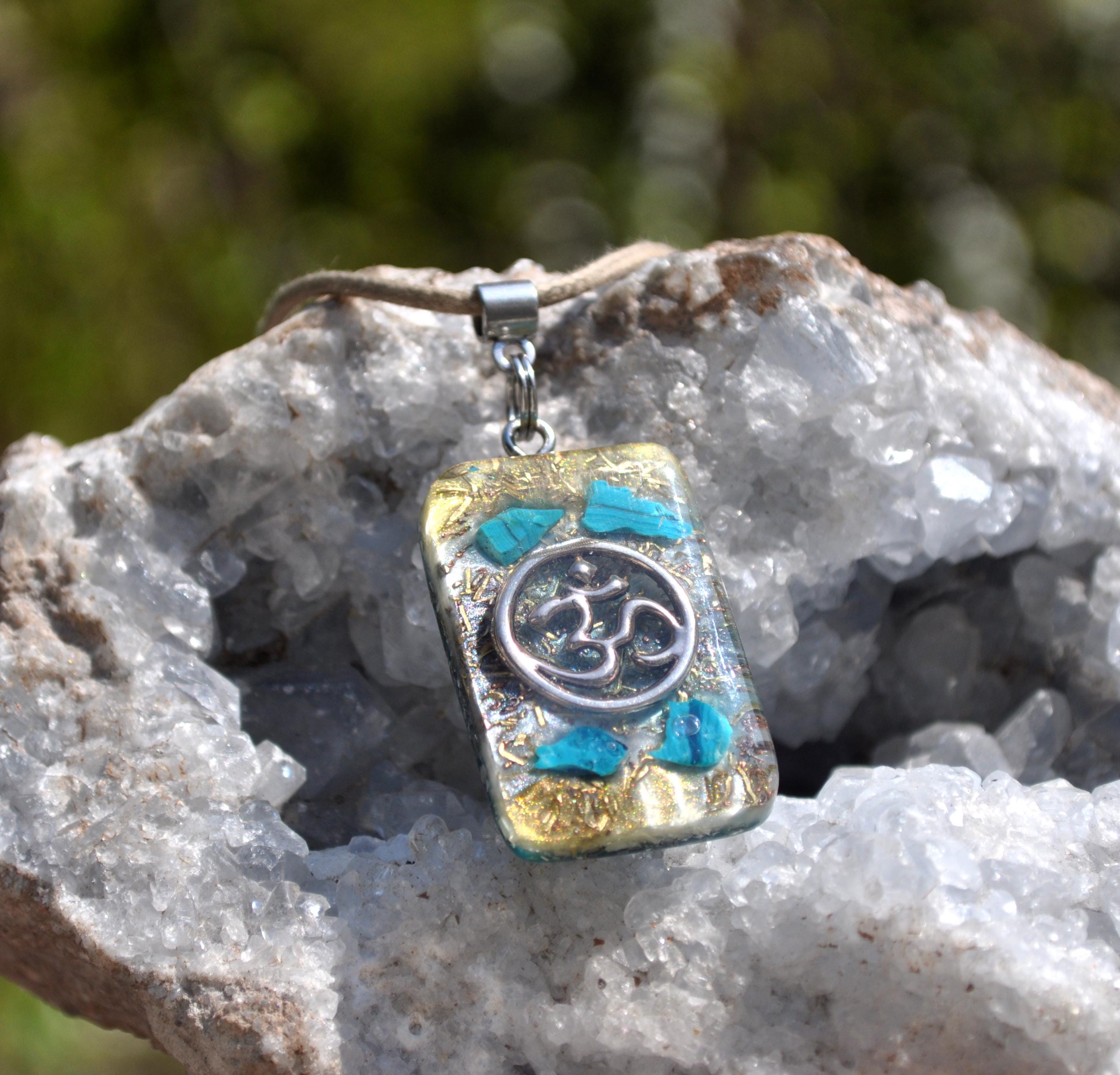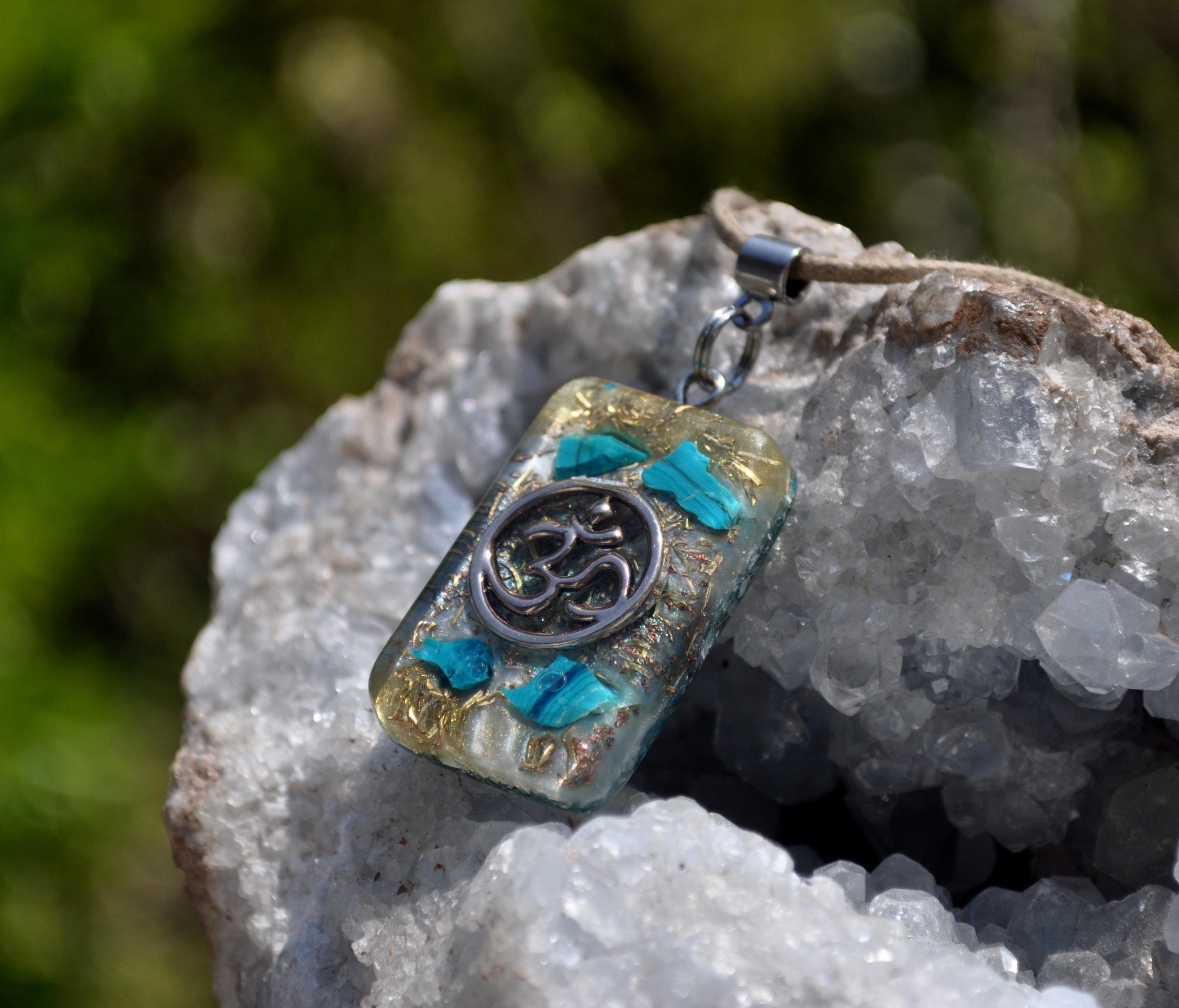 Orgonite® Pendant with AUM Symbol – Chrysocolla, Copper & Crystals (3.6 cm)