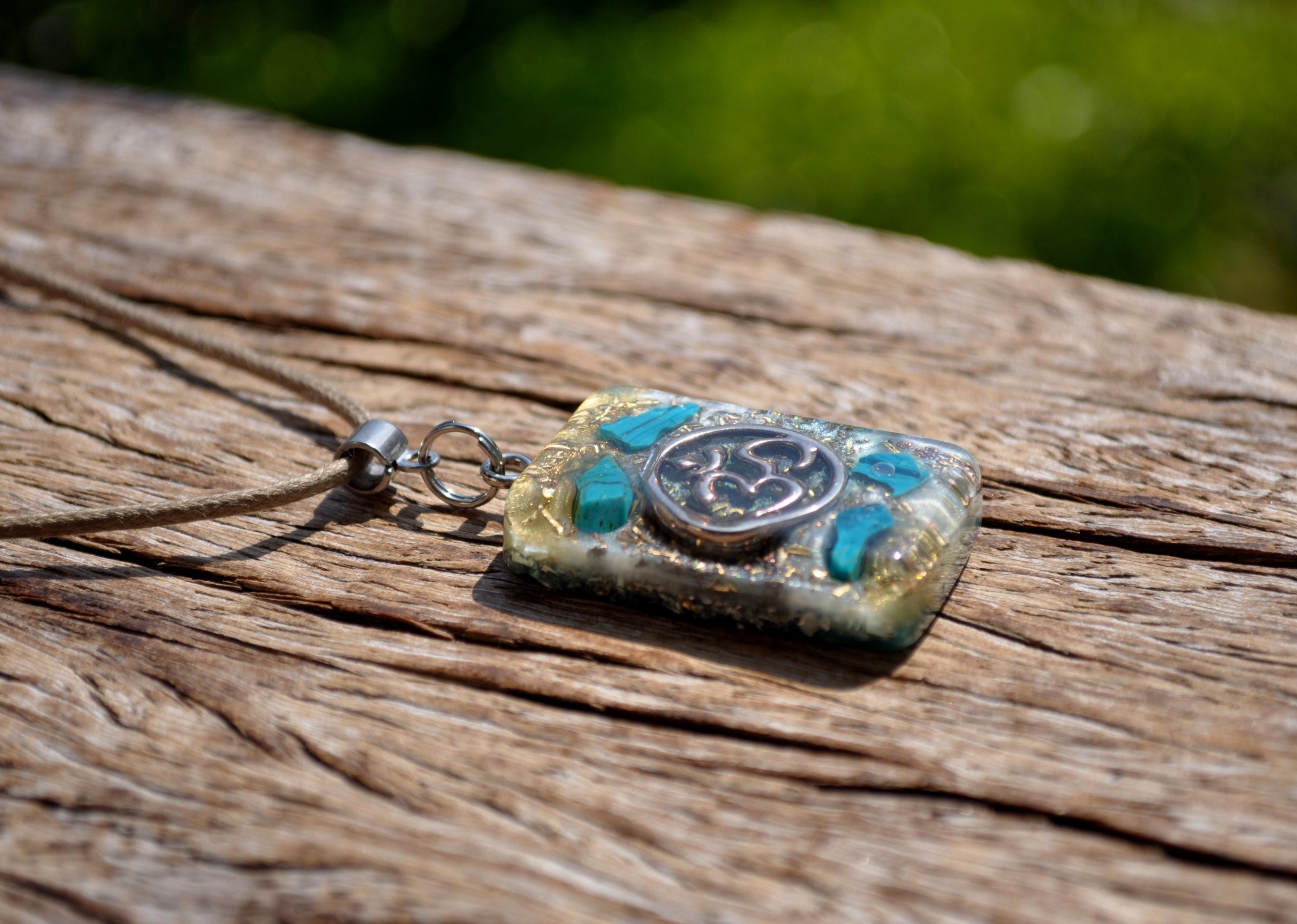 This Orgonite® pendant is made with a blend of aluminium, brass, bronze and copper shavings, combined with natural stones:
