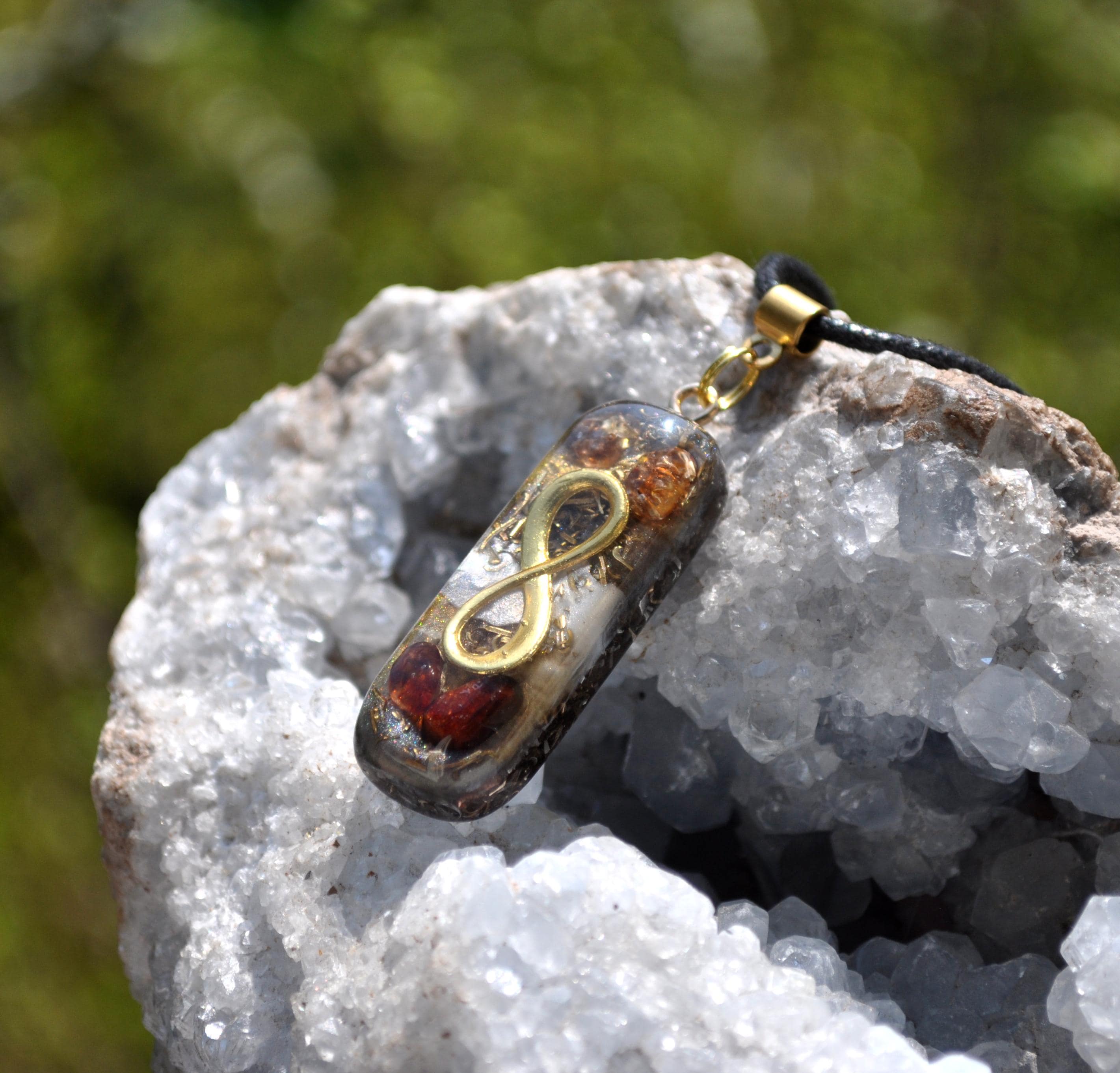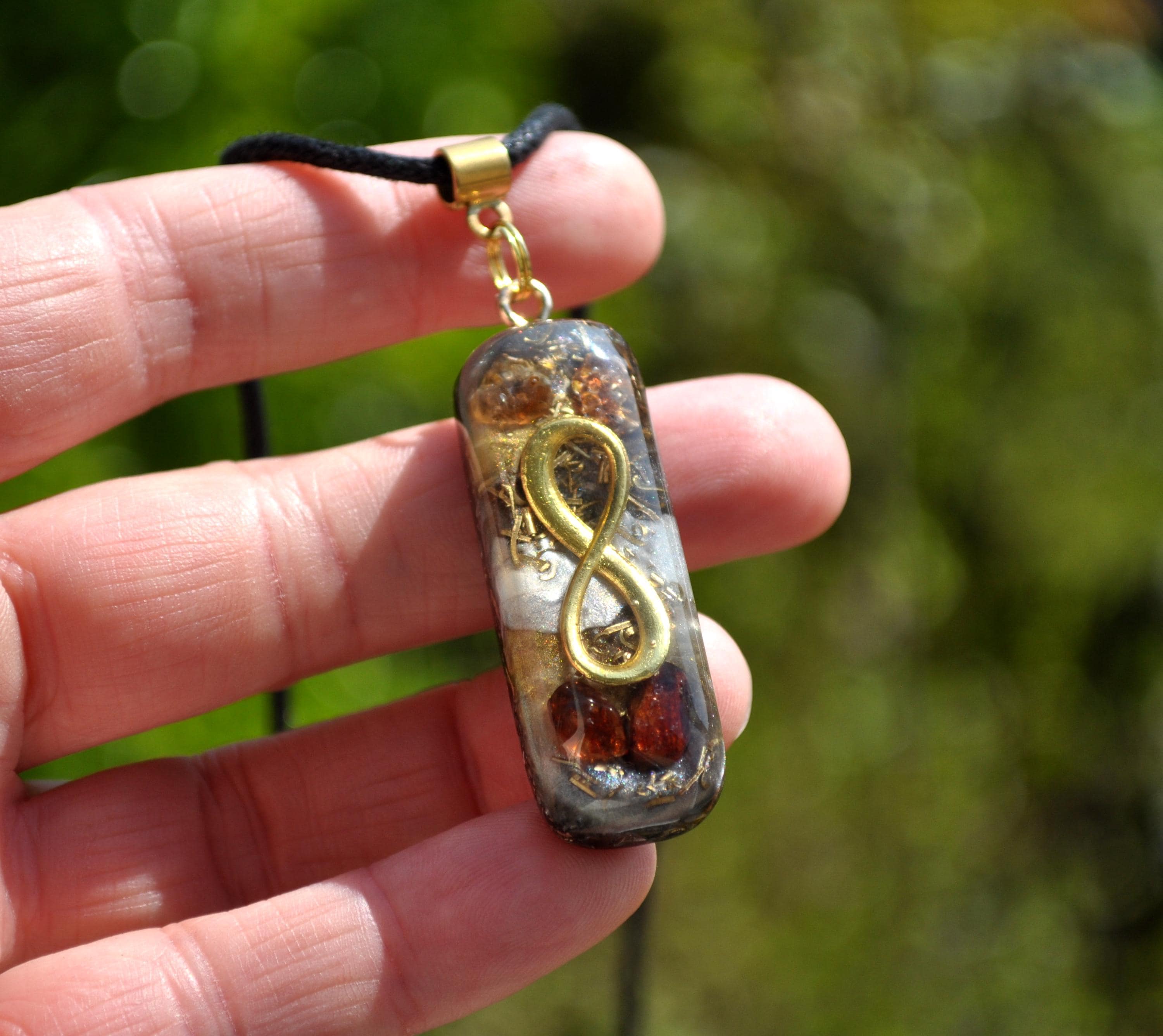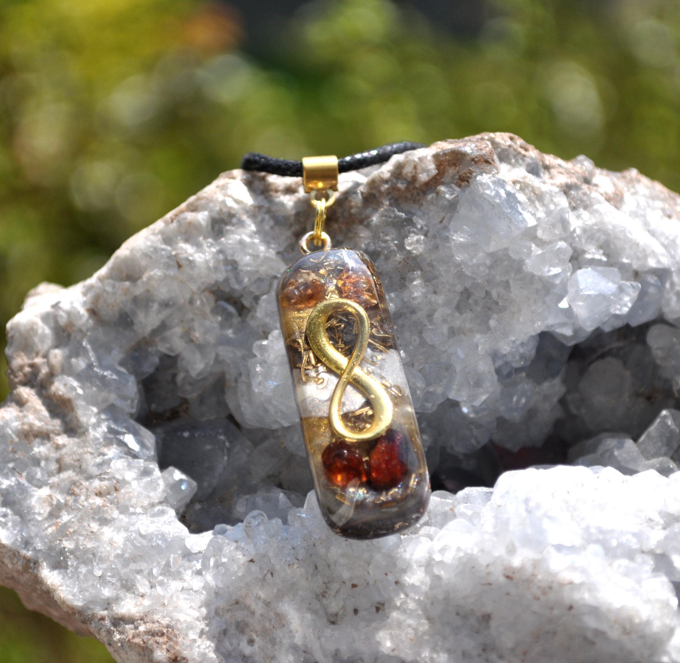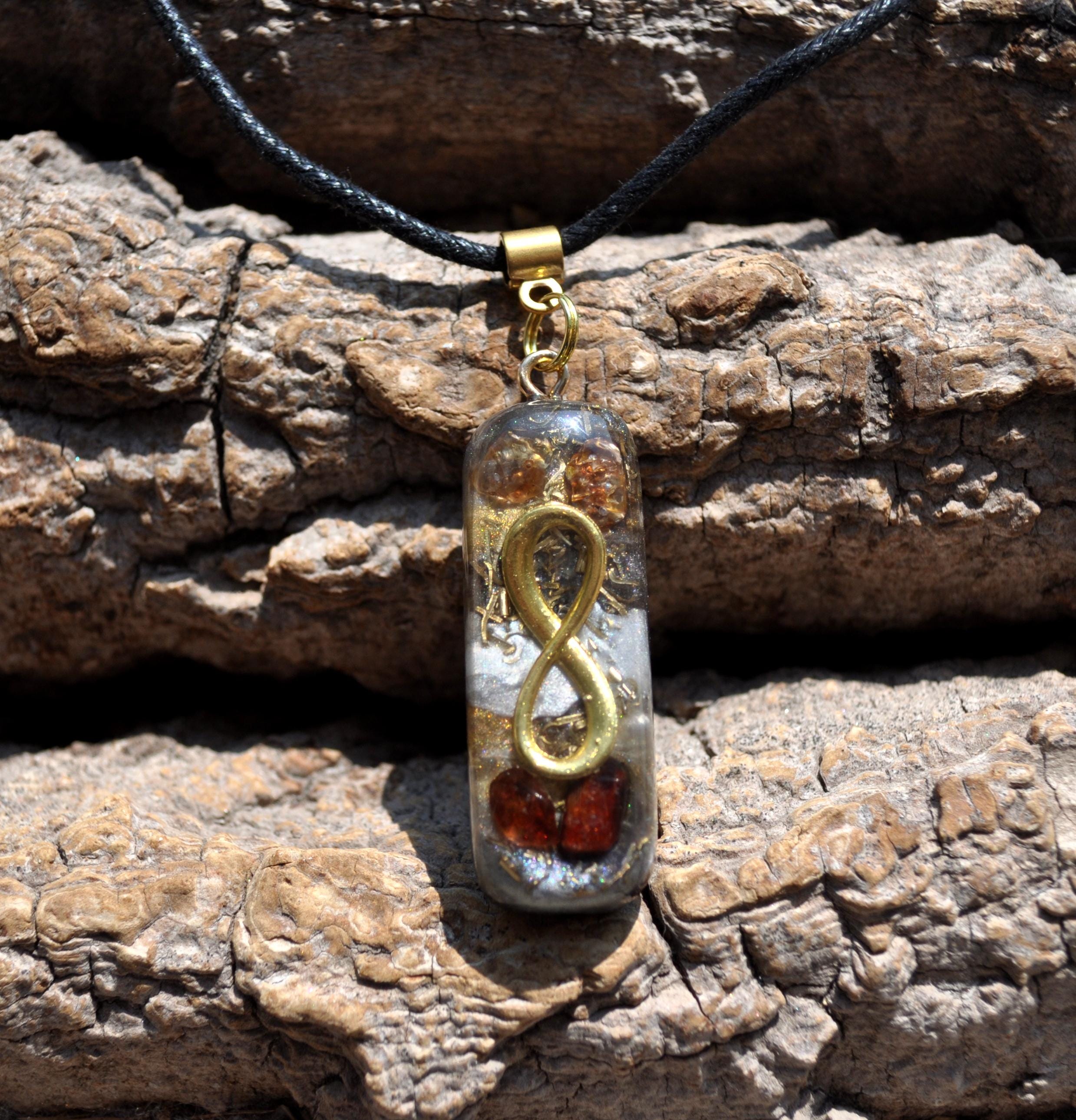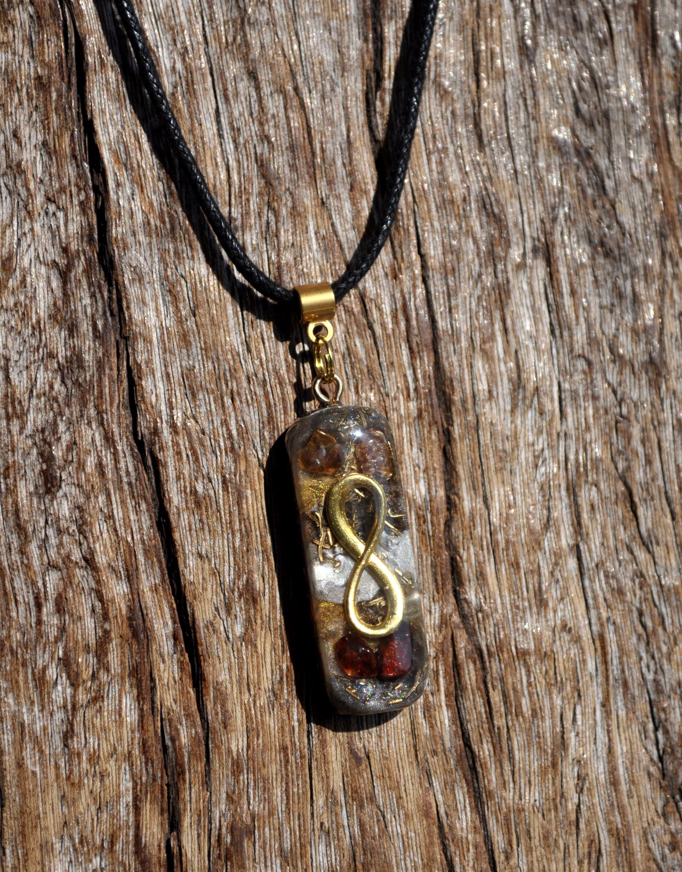 This handcrafted Infinity pendant features a genuine Hyacinth Zircon crystal, combined with a layered orgonite-style design. The warm reddish-orange tones of the zircon make each piece visually unique.