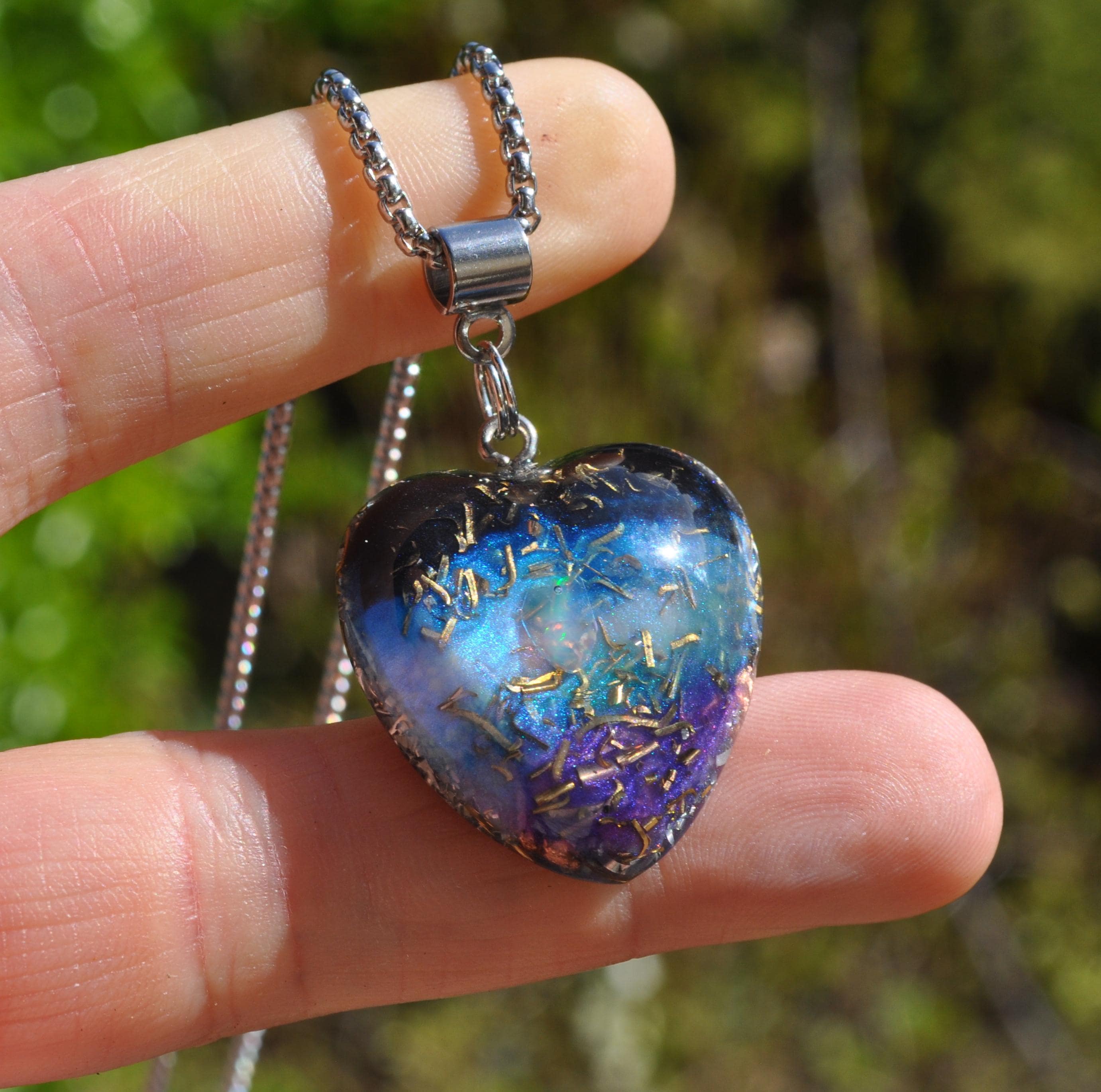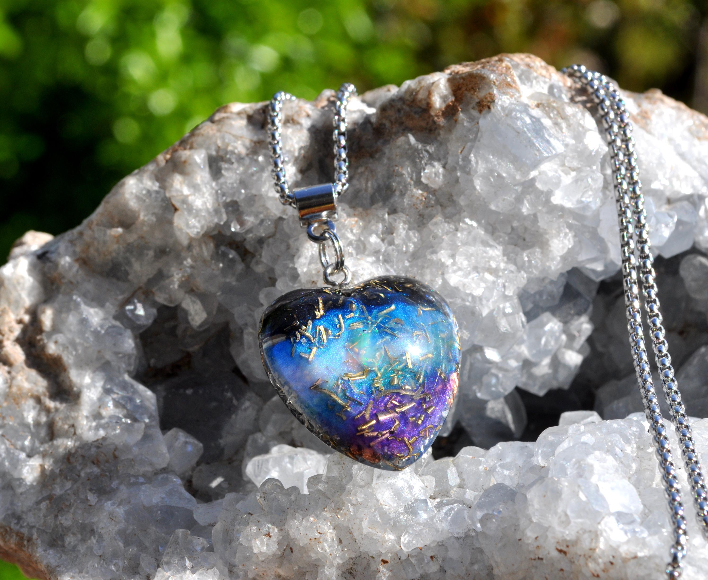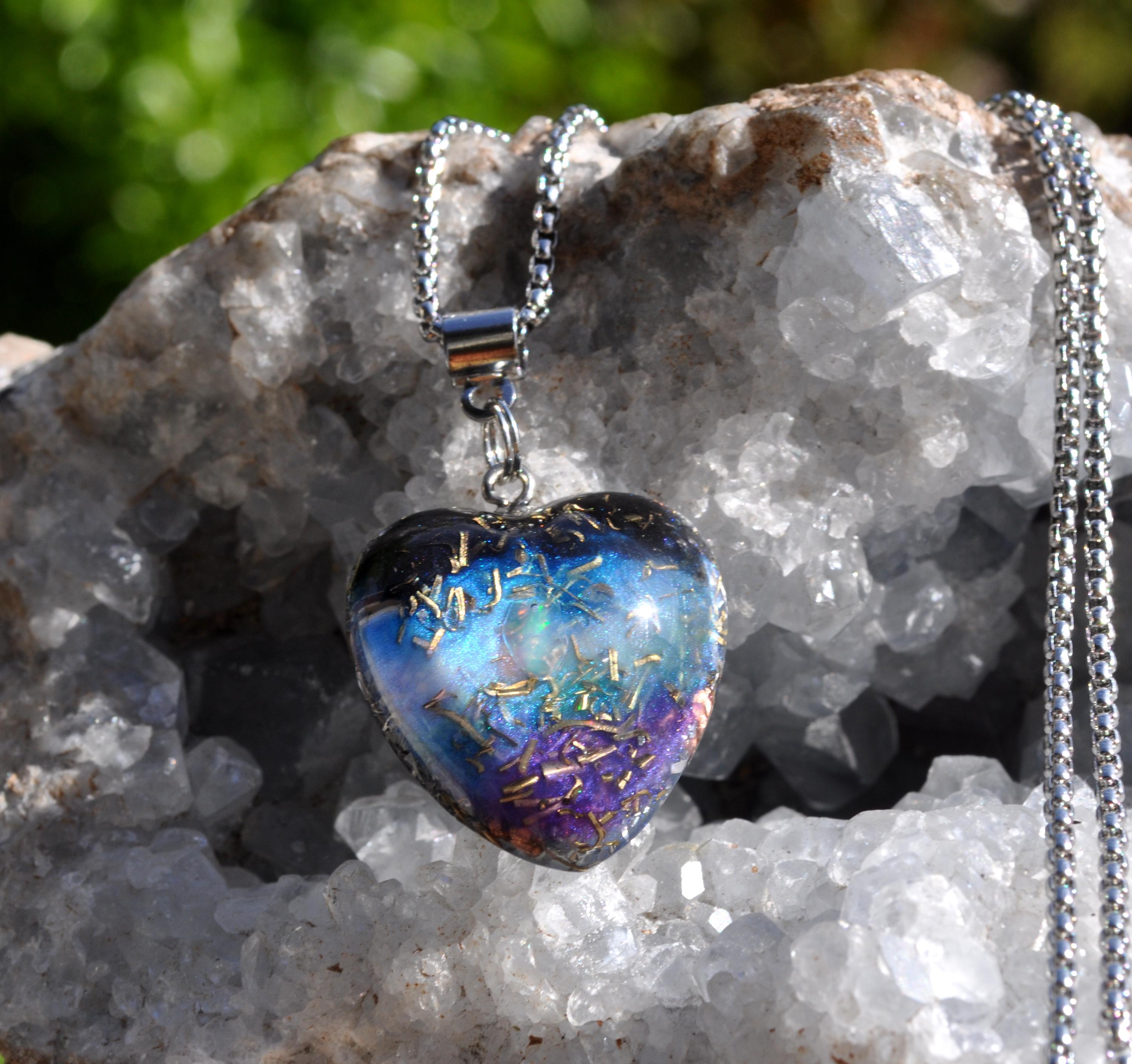 This one-of-a-kind heart-shaped orgonite® pendant is handmade using a balanced mix of resin and recycled metals.