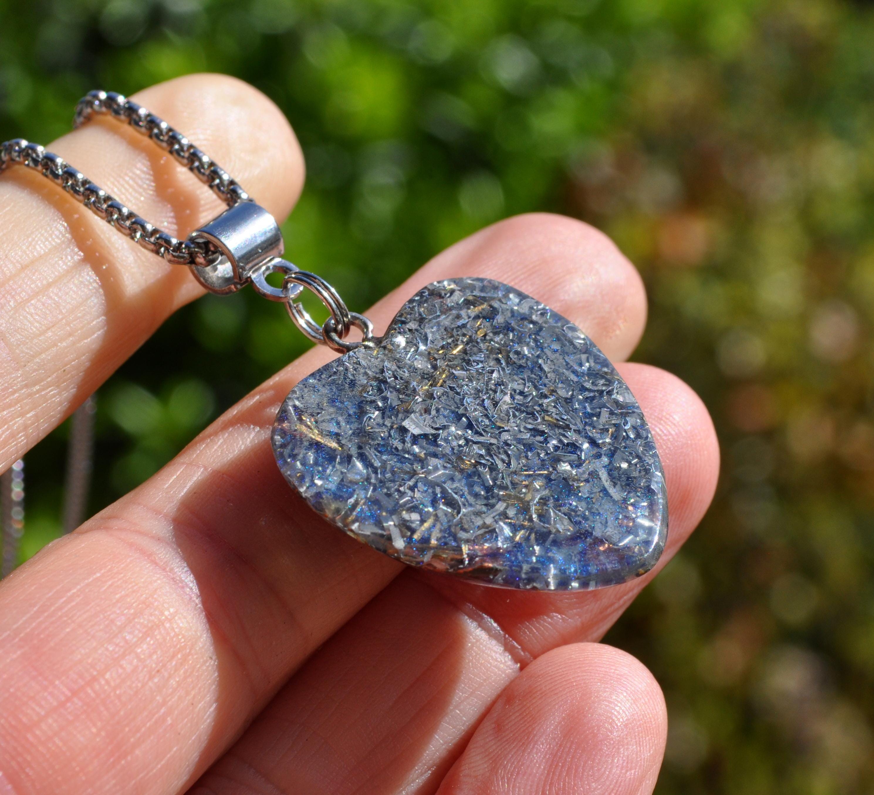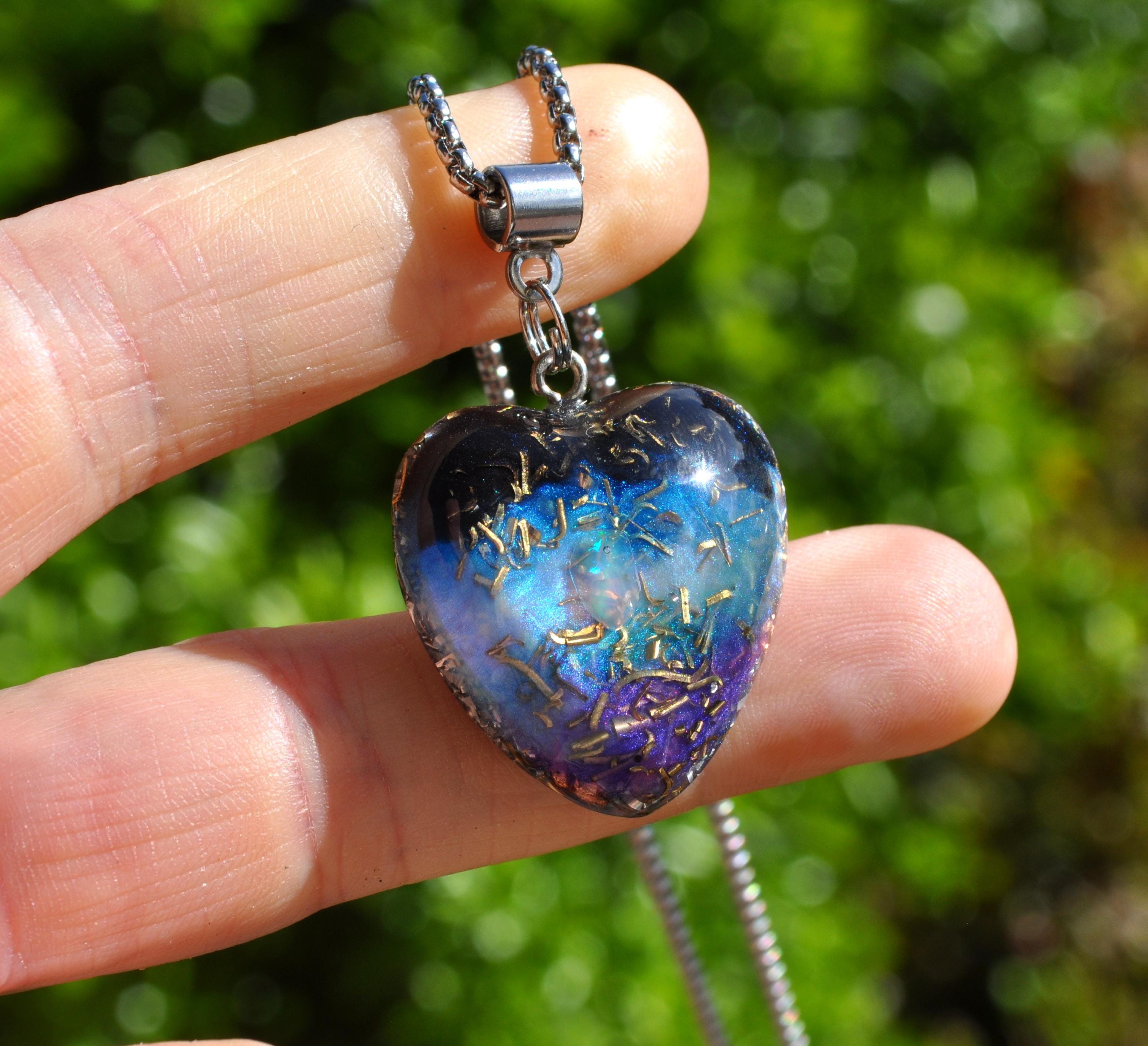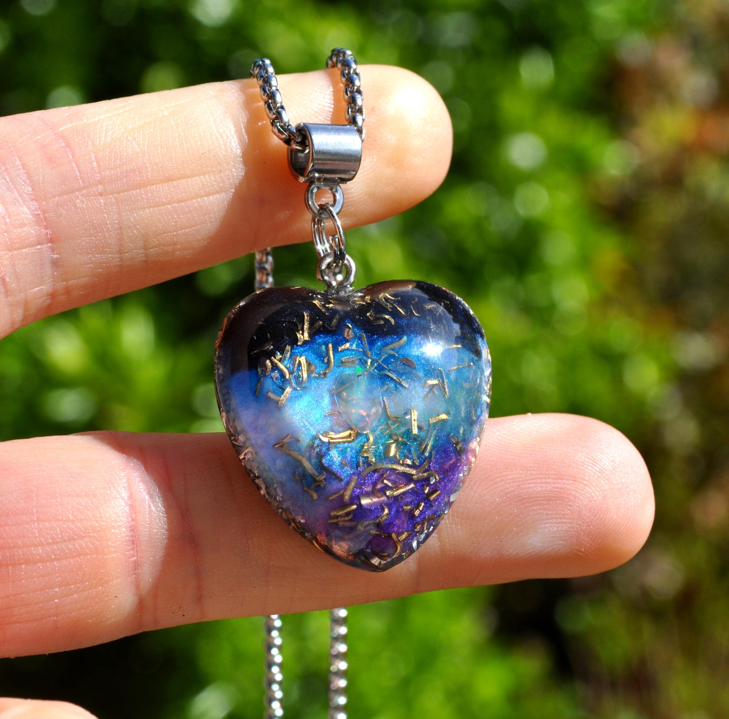 This one-of-a-kind heart-shaped orgonite® pendant is handmade using a balanced mix of resin and recycled metals.
