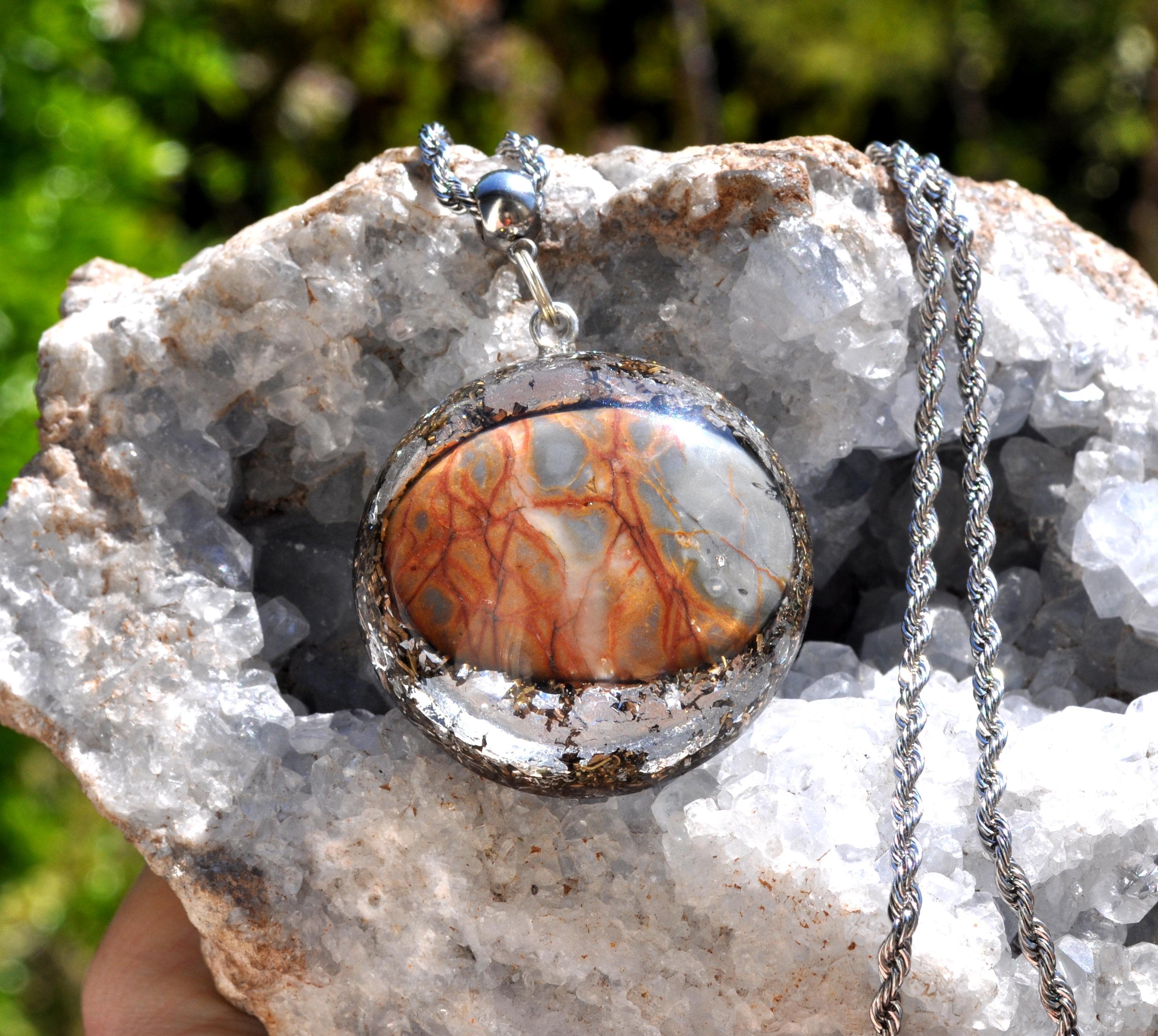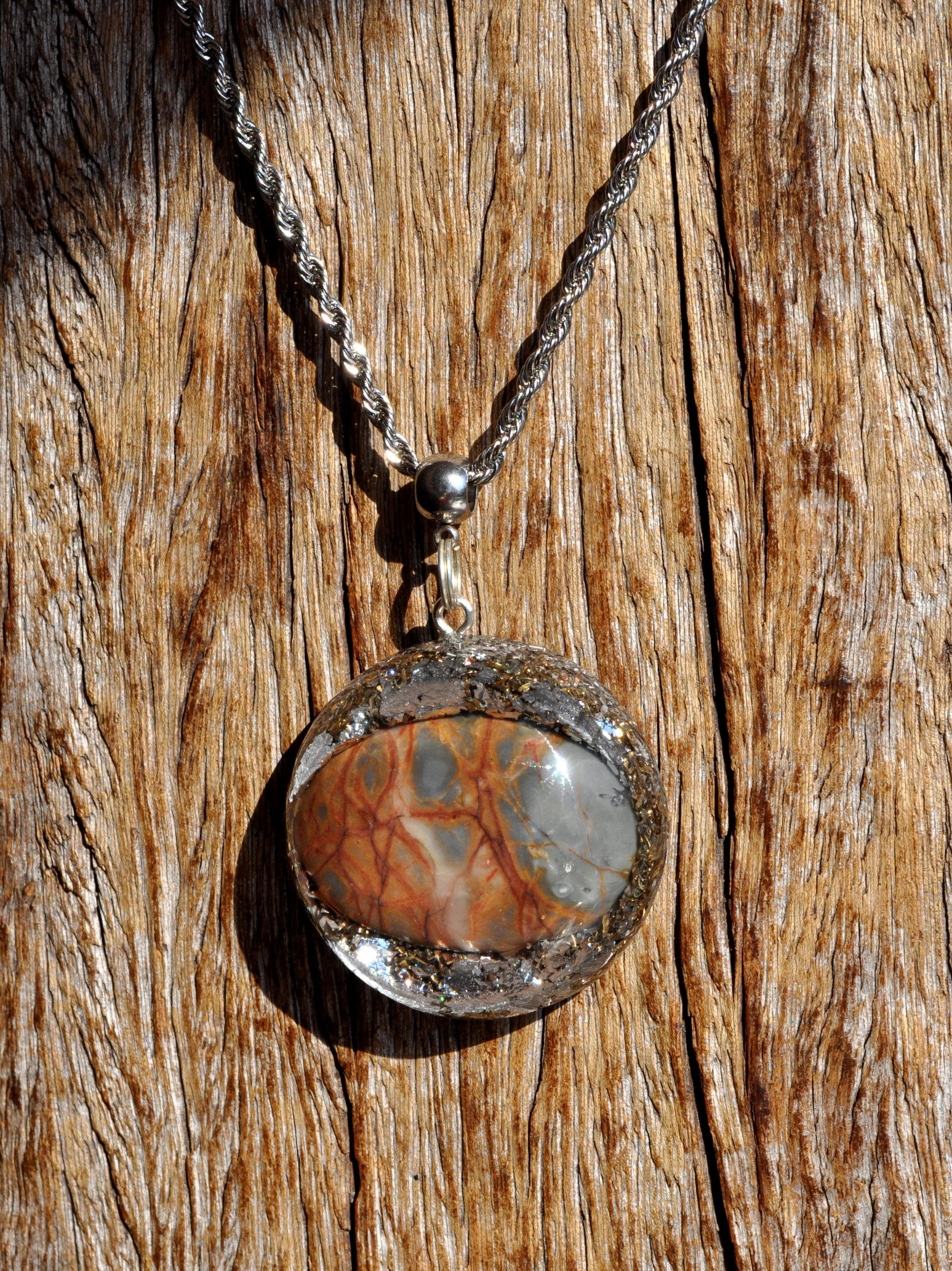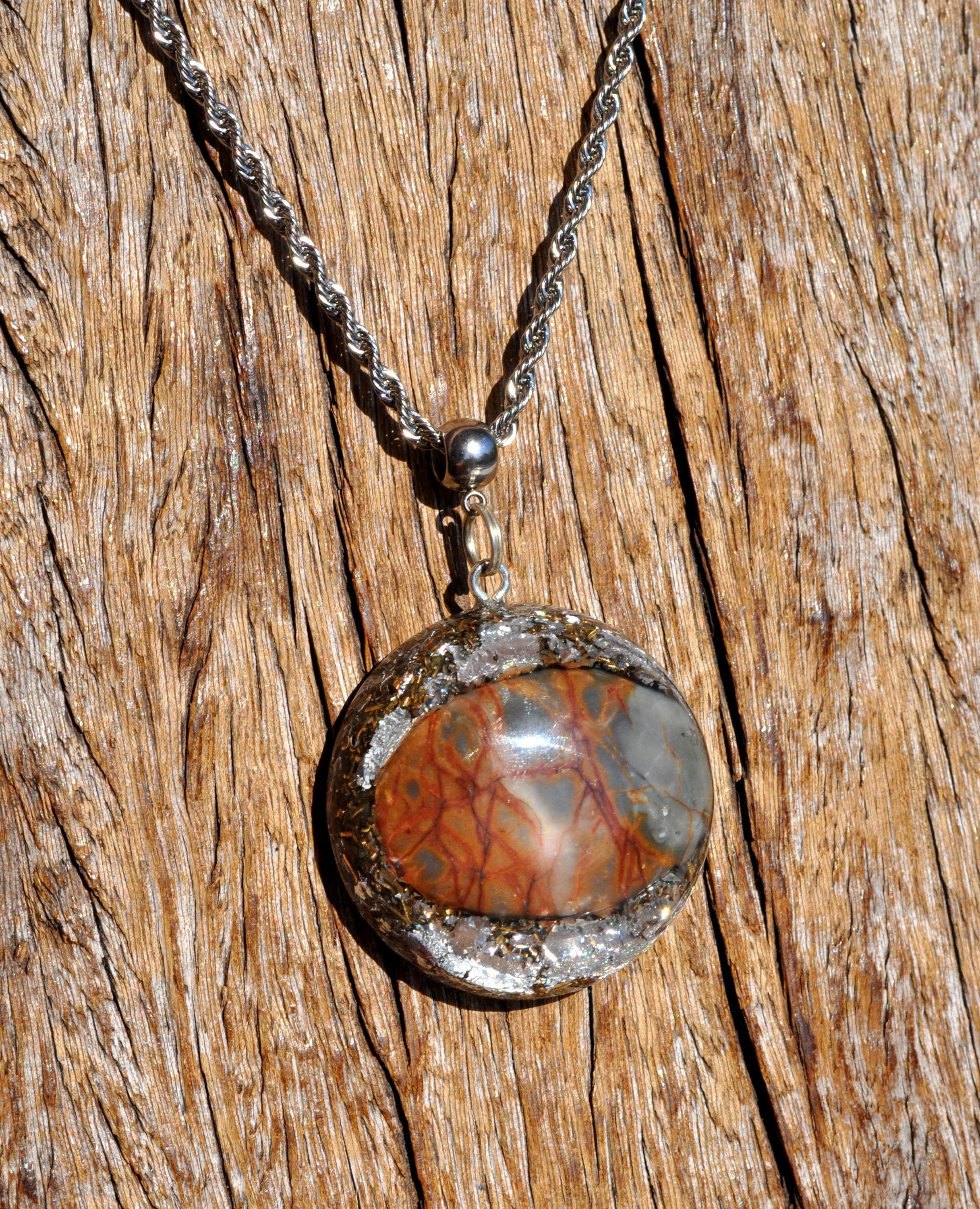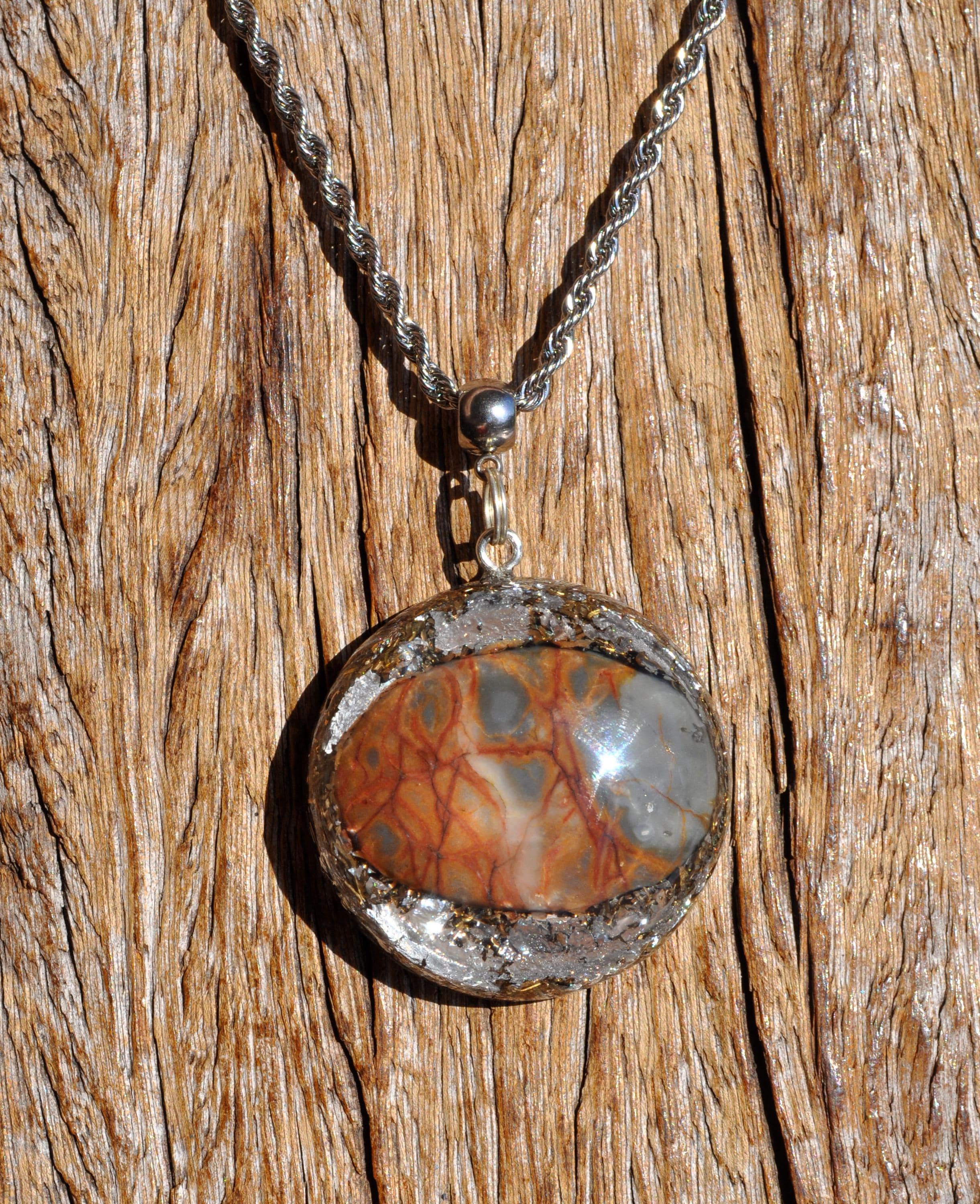 This beautiful pendant, measuring 4.2 cm (1.65 inches) in diameter, is crafted using layered metal shavings and silver leaf, creating a unique and artistic foundation. At its center sits a striking Maligano Jasper cabochon, carefully shaped and polished from raw stone by lapidarist Stefan, a member of this shop. This makes the piece especially unique, as the stone has been transformed by hand from its natural form into a finished cabochon.