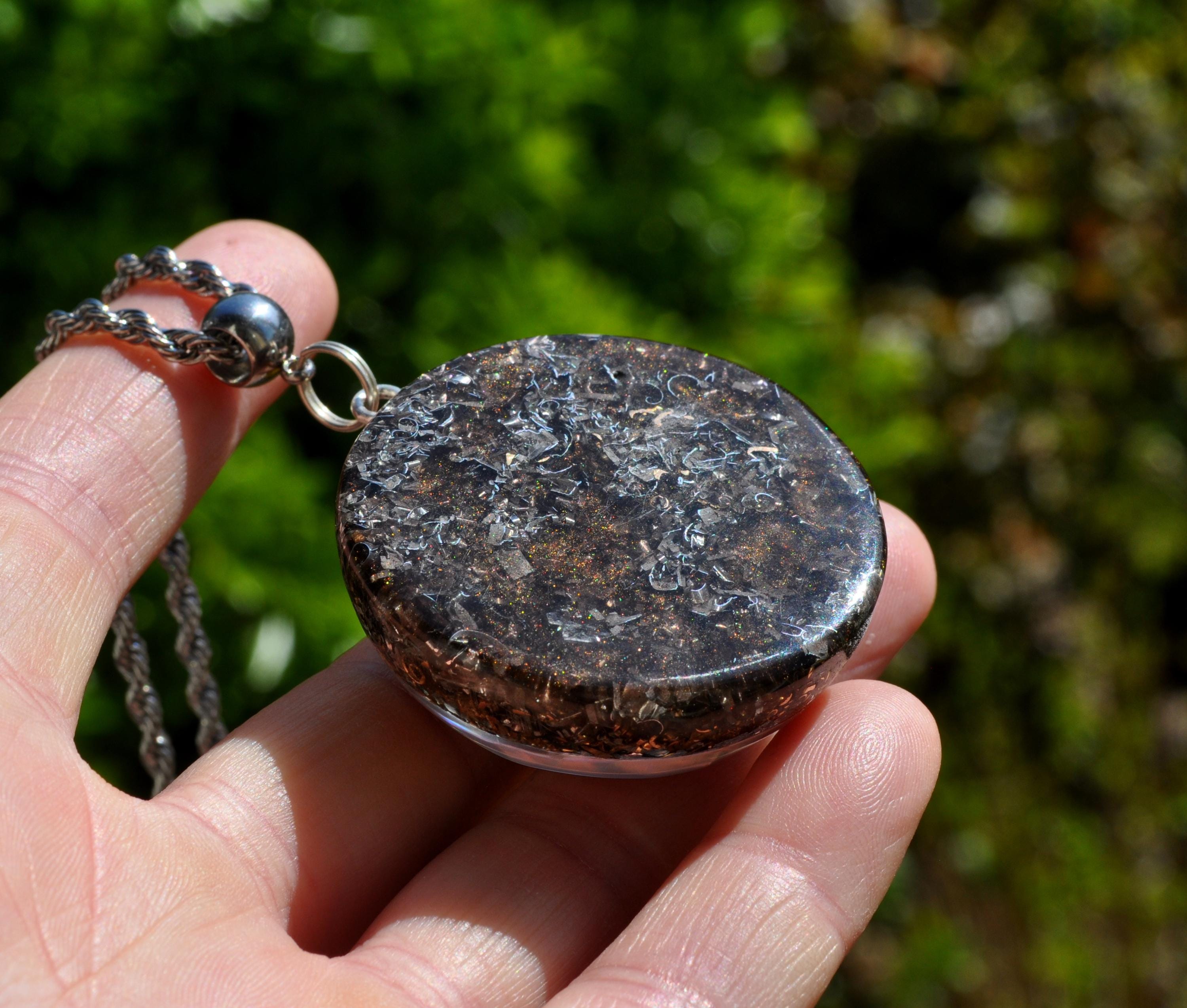 The pendant also incorporates Rose Quartz, Pyrite, Black Tourmaline, Rhodizite, Elite Shungite, and Clear Quartz, all set securely in durable resin. These materials are combined into an orgonite-style composition, resulting in a layered design that is visually rich and detailed.