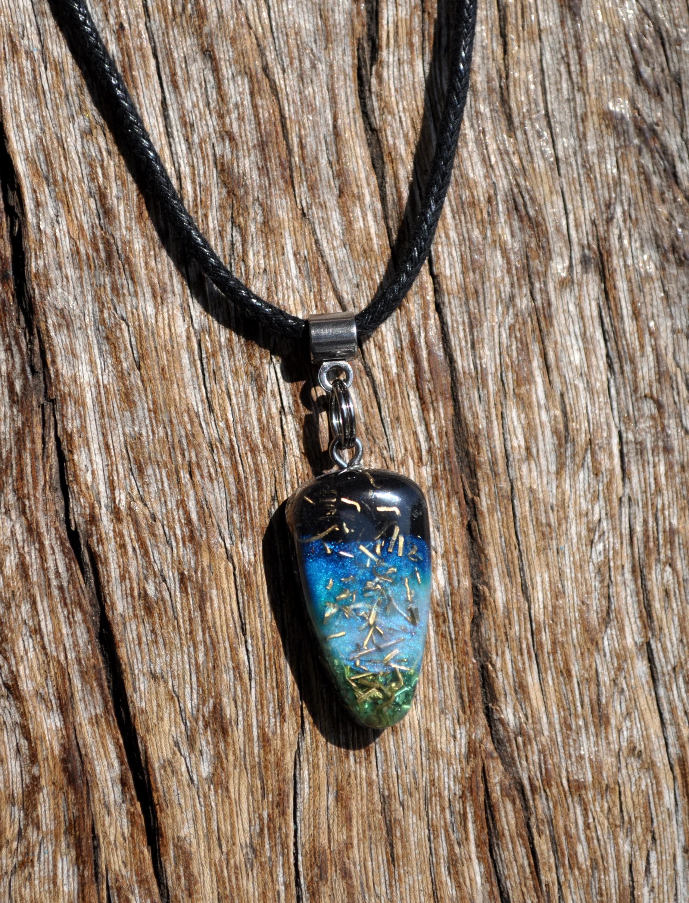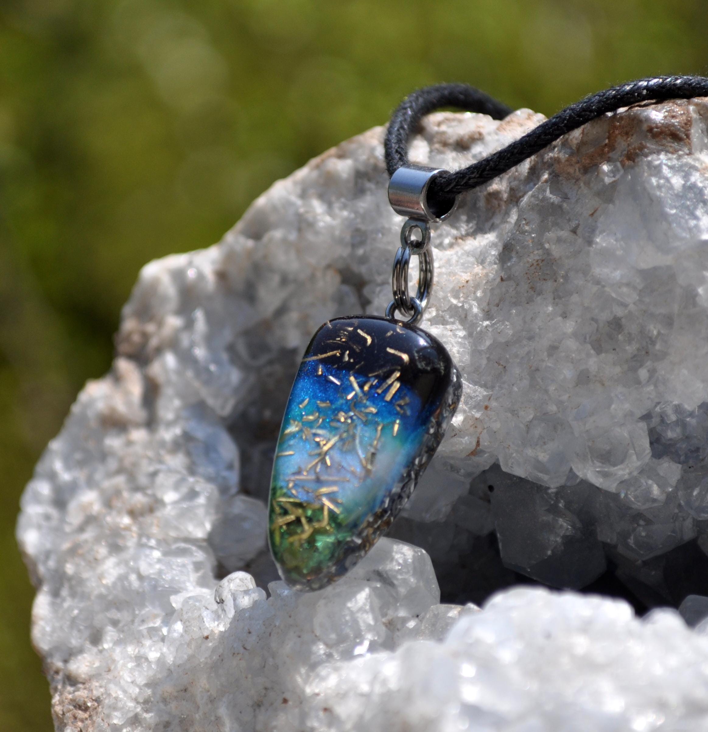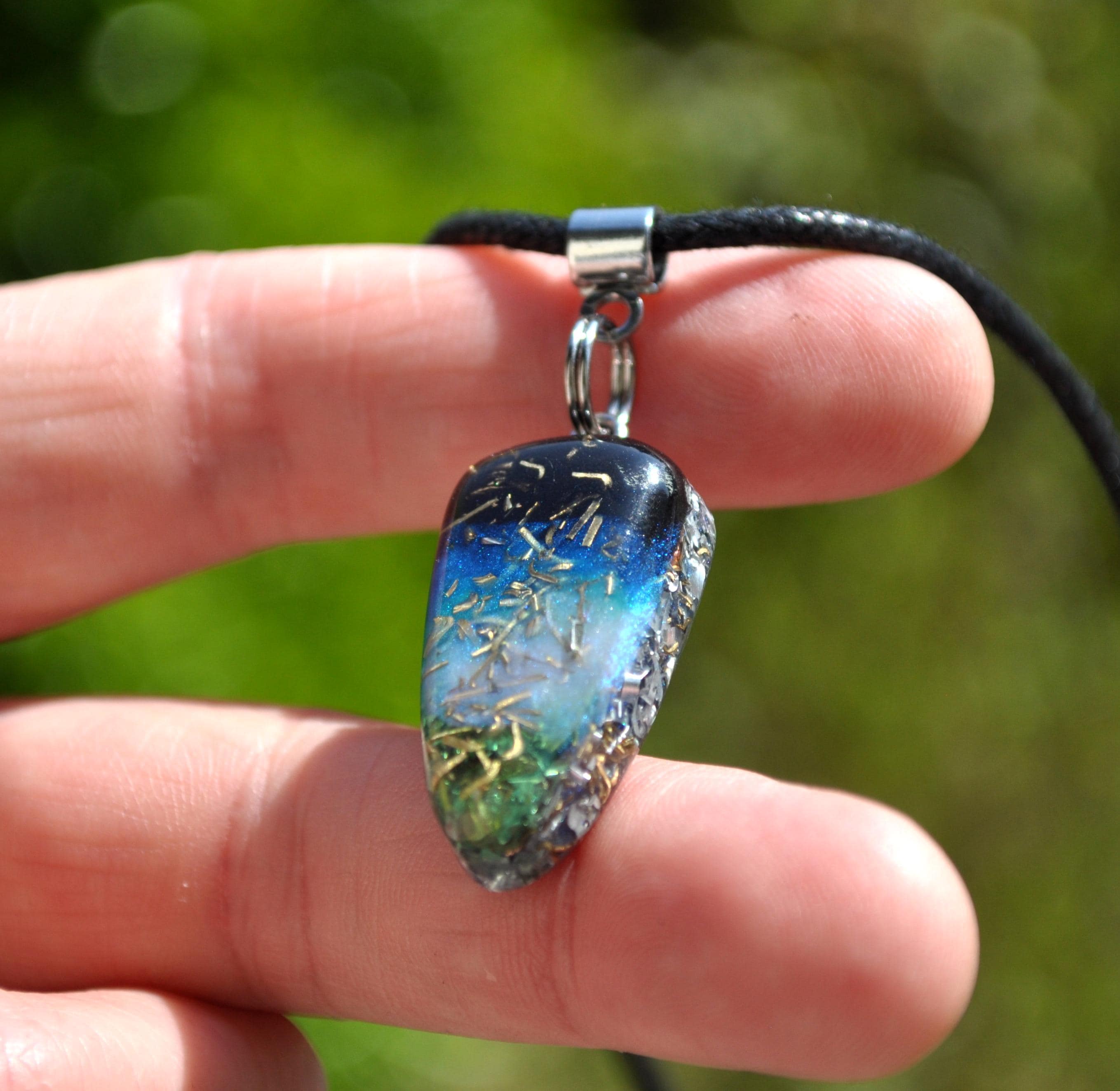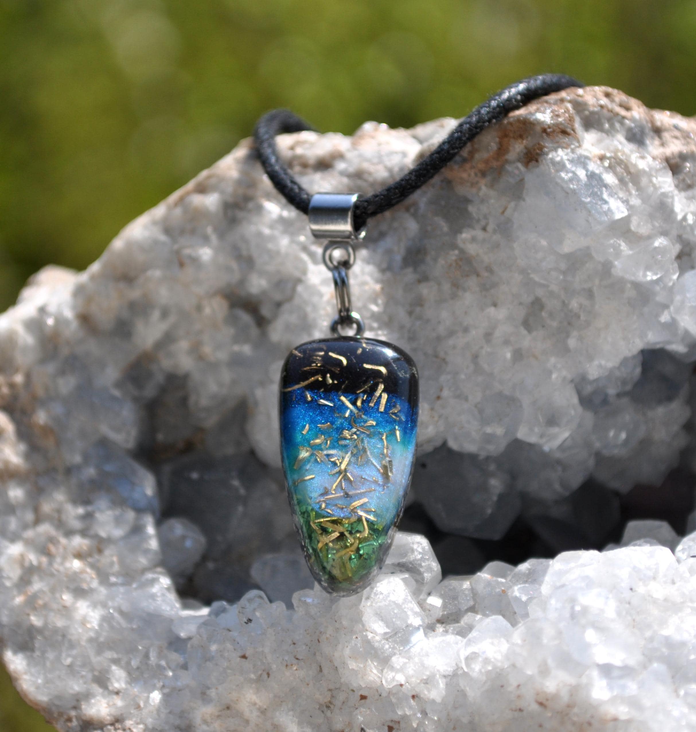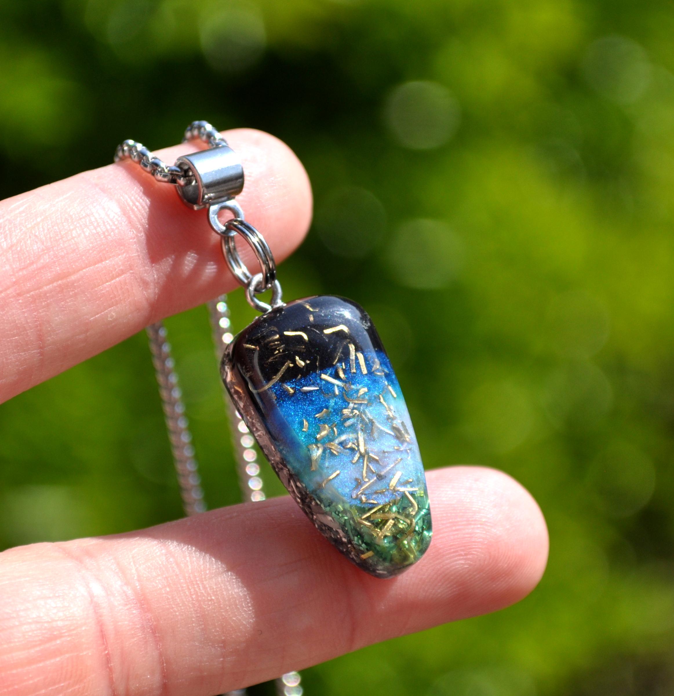 This one-of-a-kind teardrop Orgonite® pendant is a piece of intentional jewelry, thoughtfully handcrafted with a calming blend of light green, blue, and subtle black tones. Designed with care and attention, it carries both a unique aesthetic and meaningful presence.