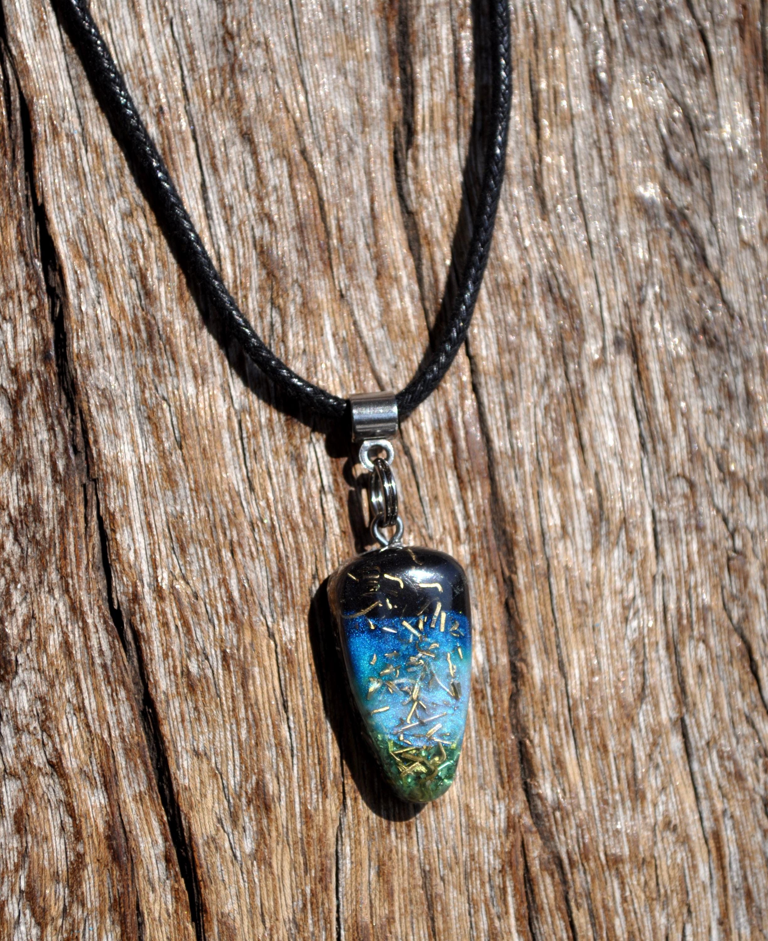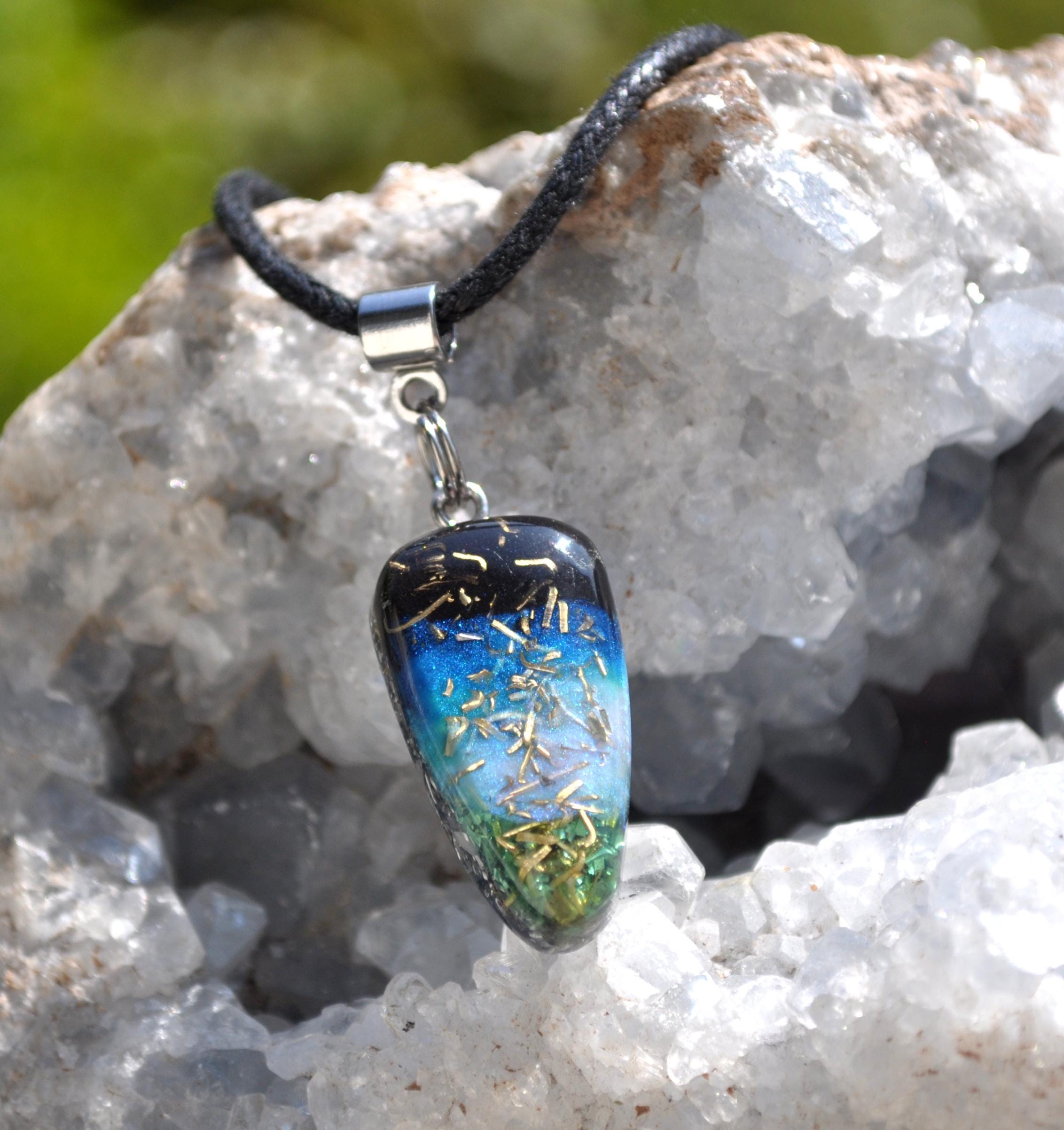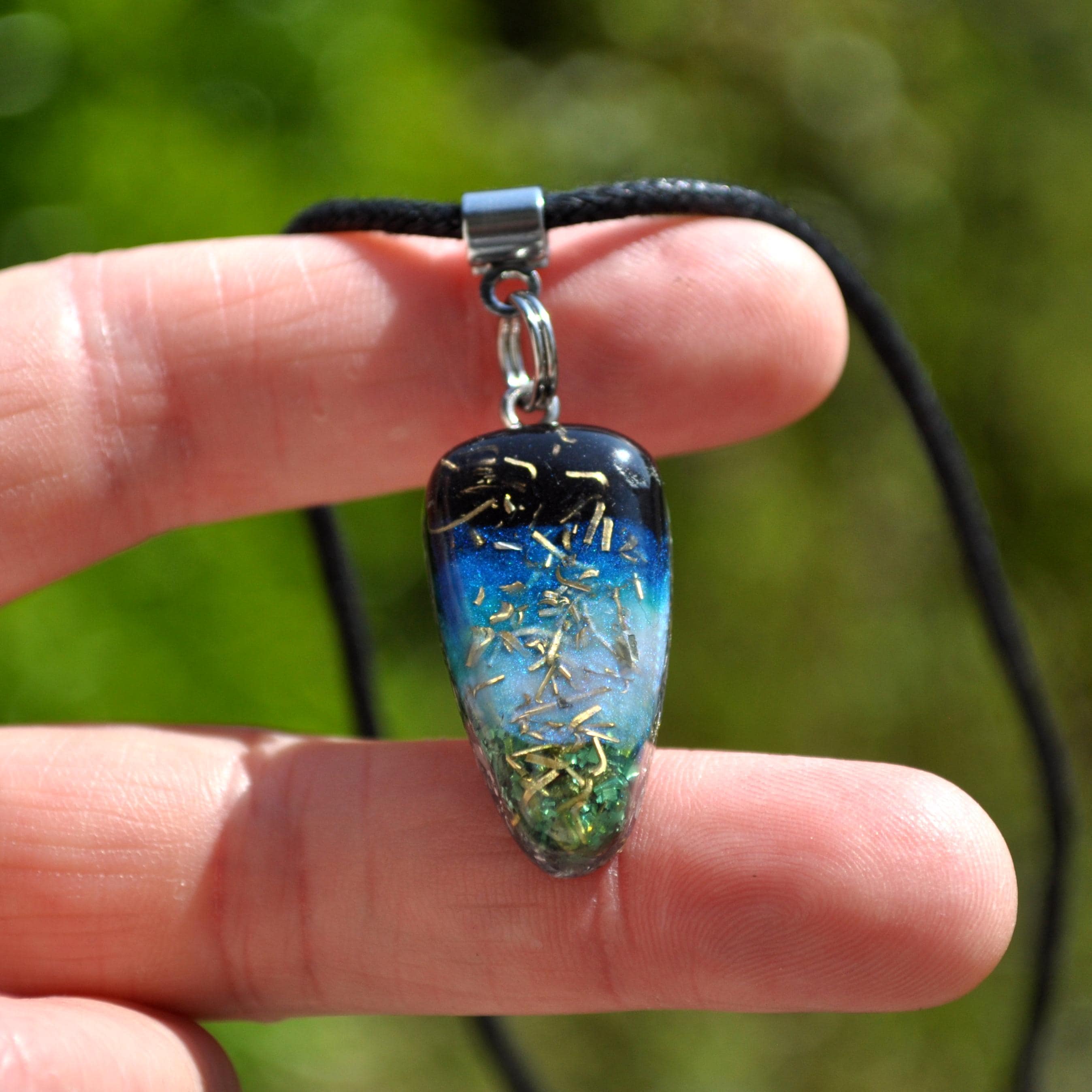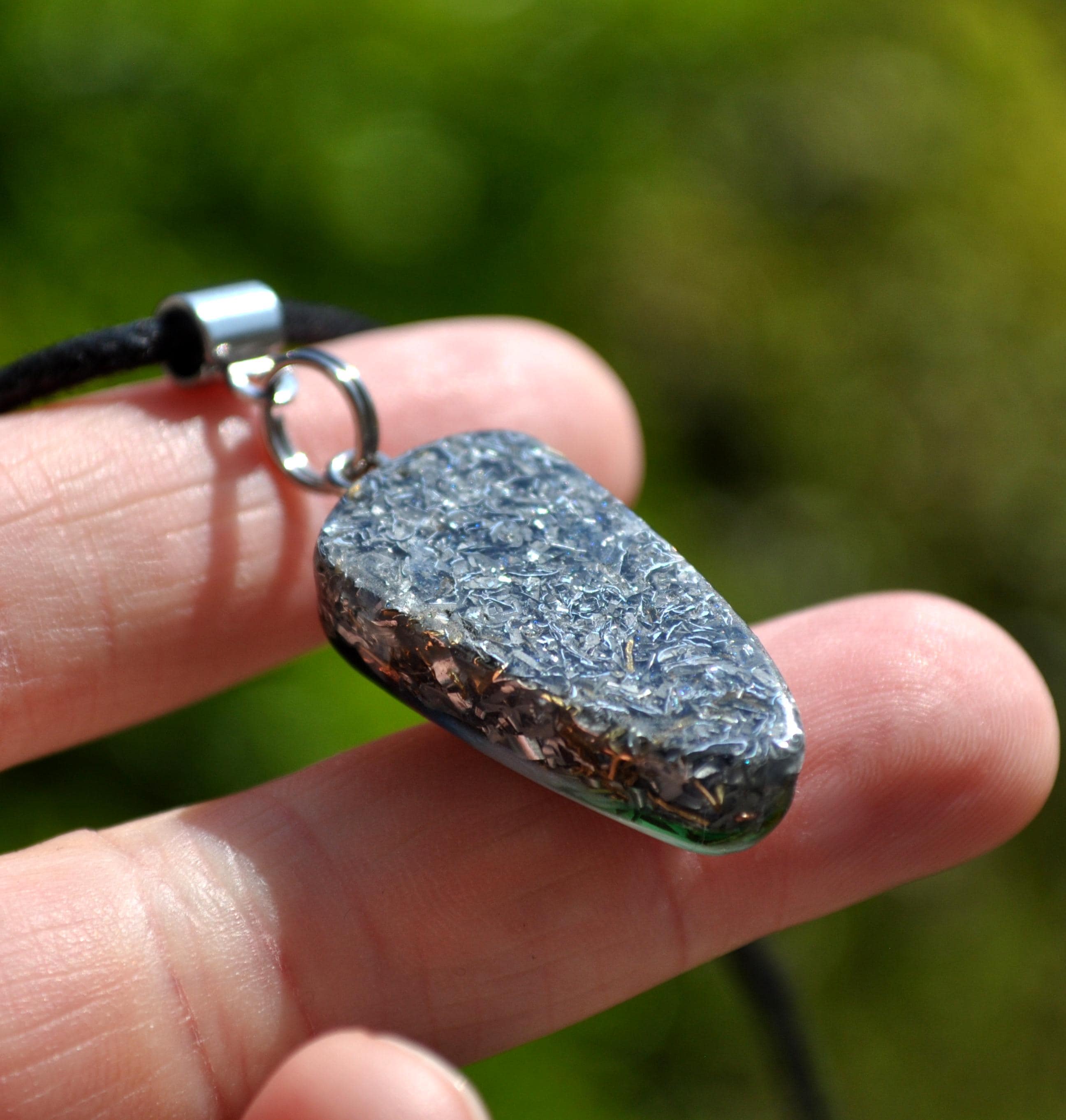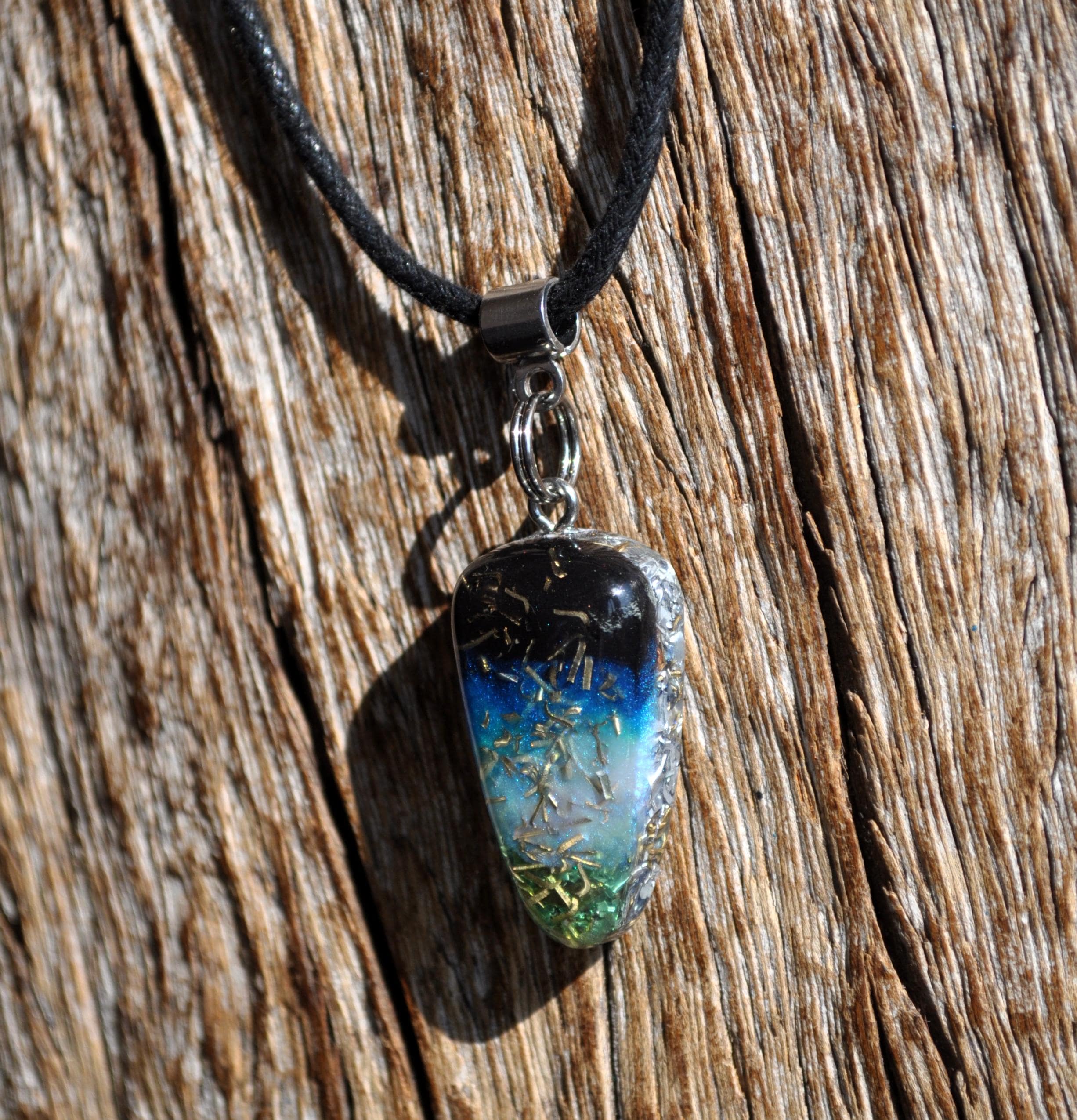 This one-of-a-kind teardrop Orgonite® pendant is a piece of intentional jewelry, thoughtfully handcrafted with a calming blend of light green, blue, and subtle black tones. Designed with care and attention, it carries both a unique aesthetic and meaningful presence.
