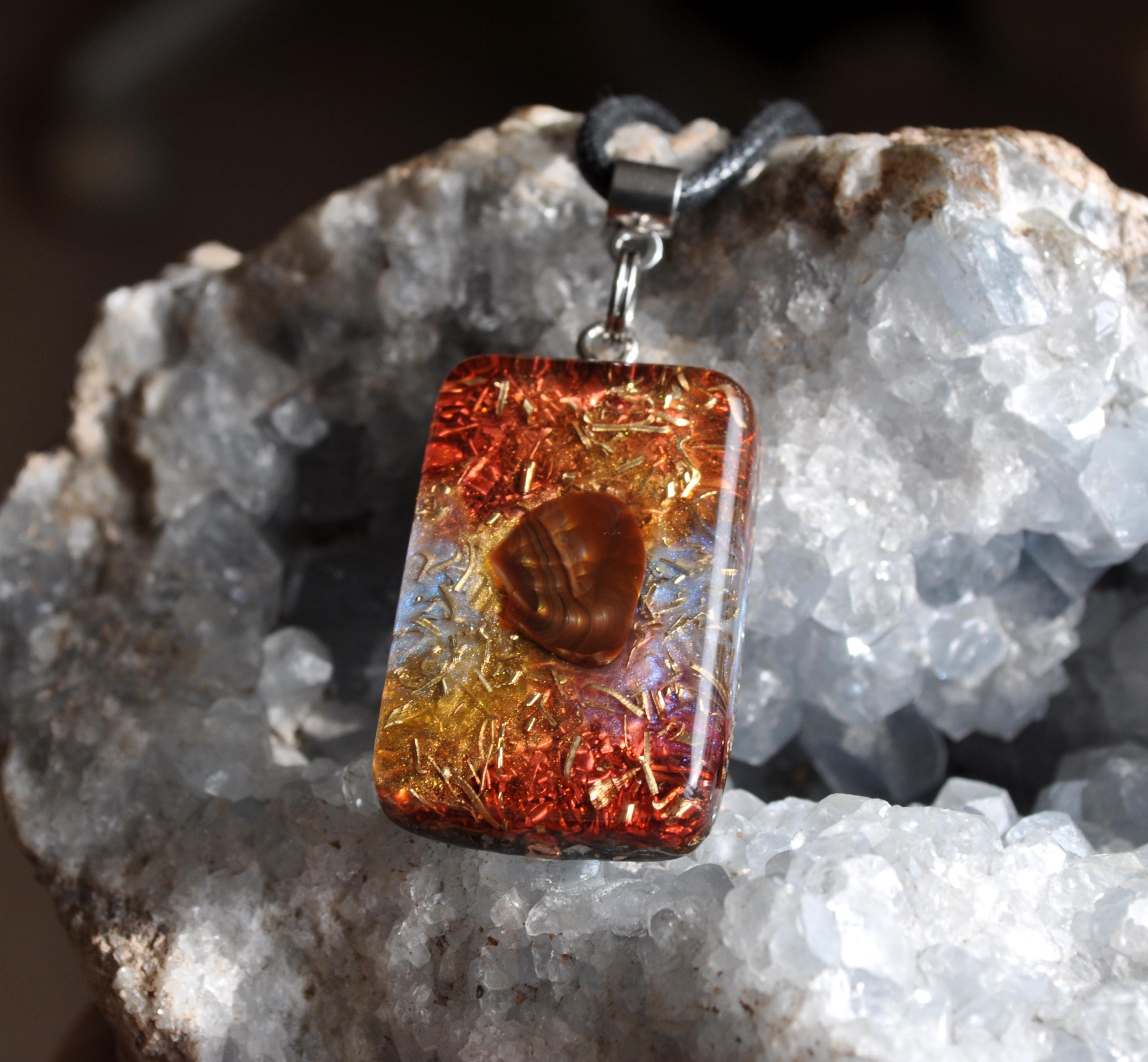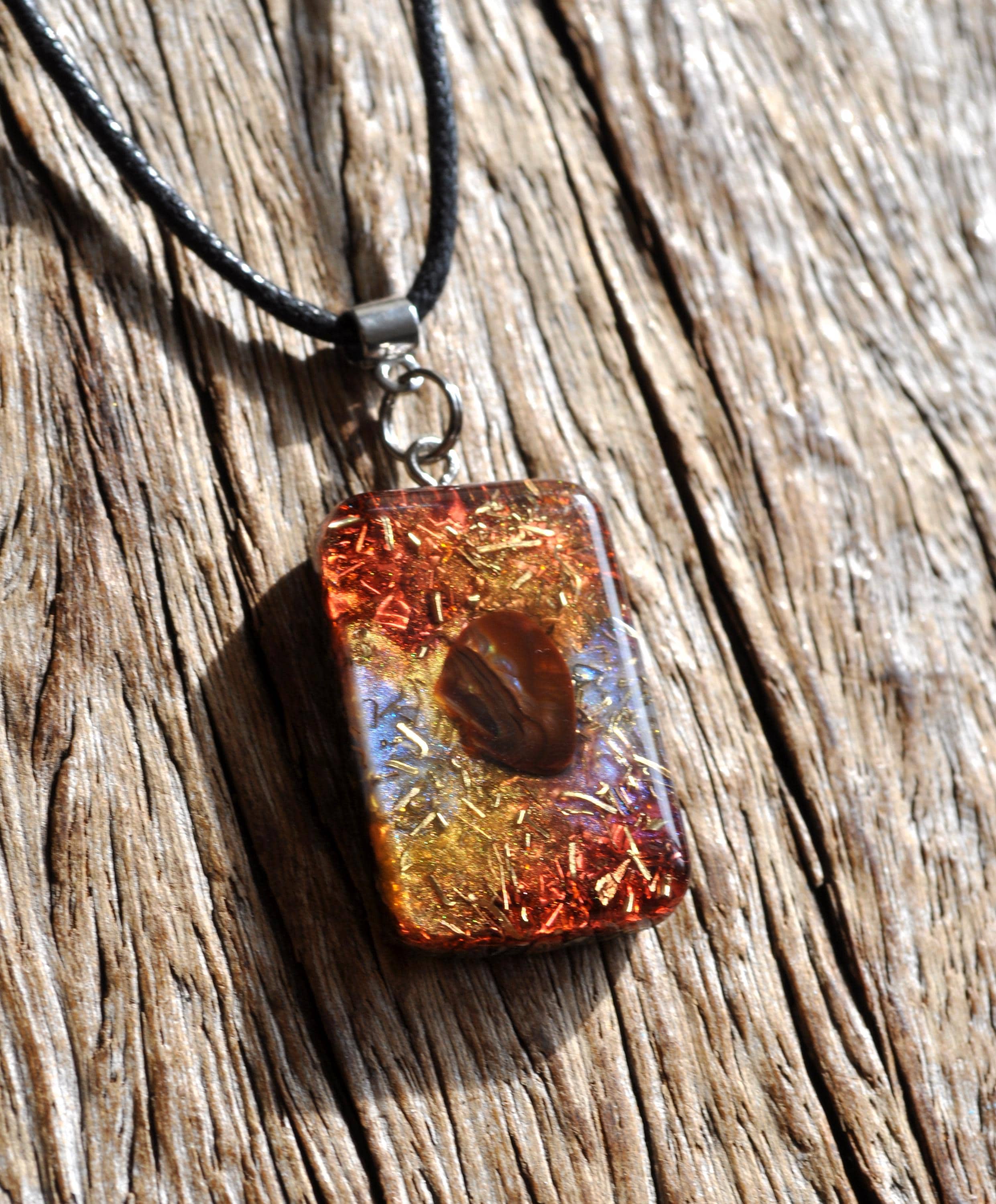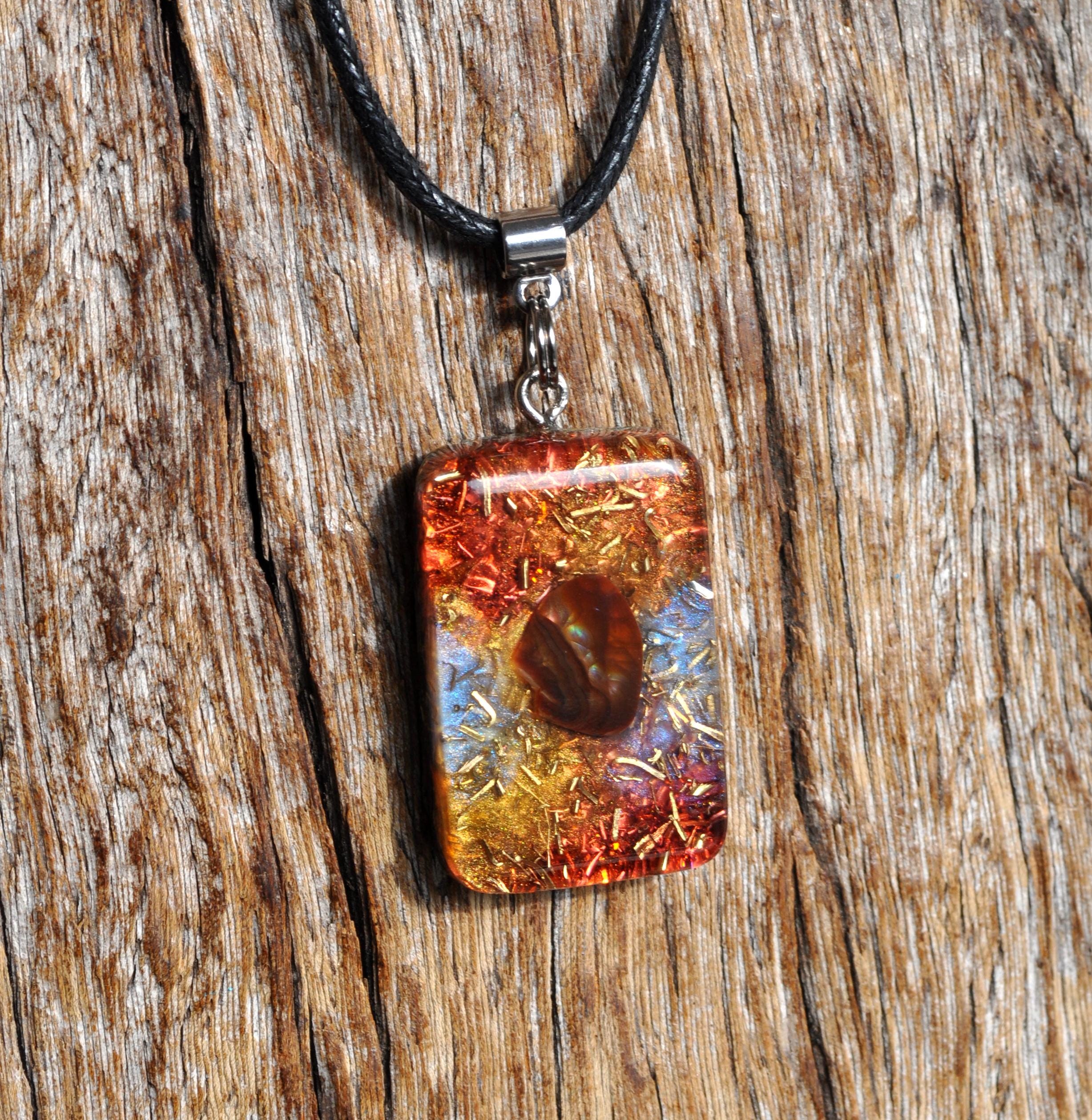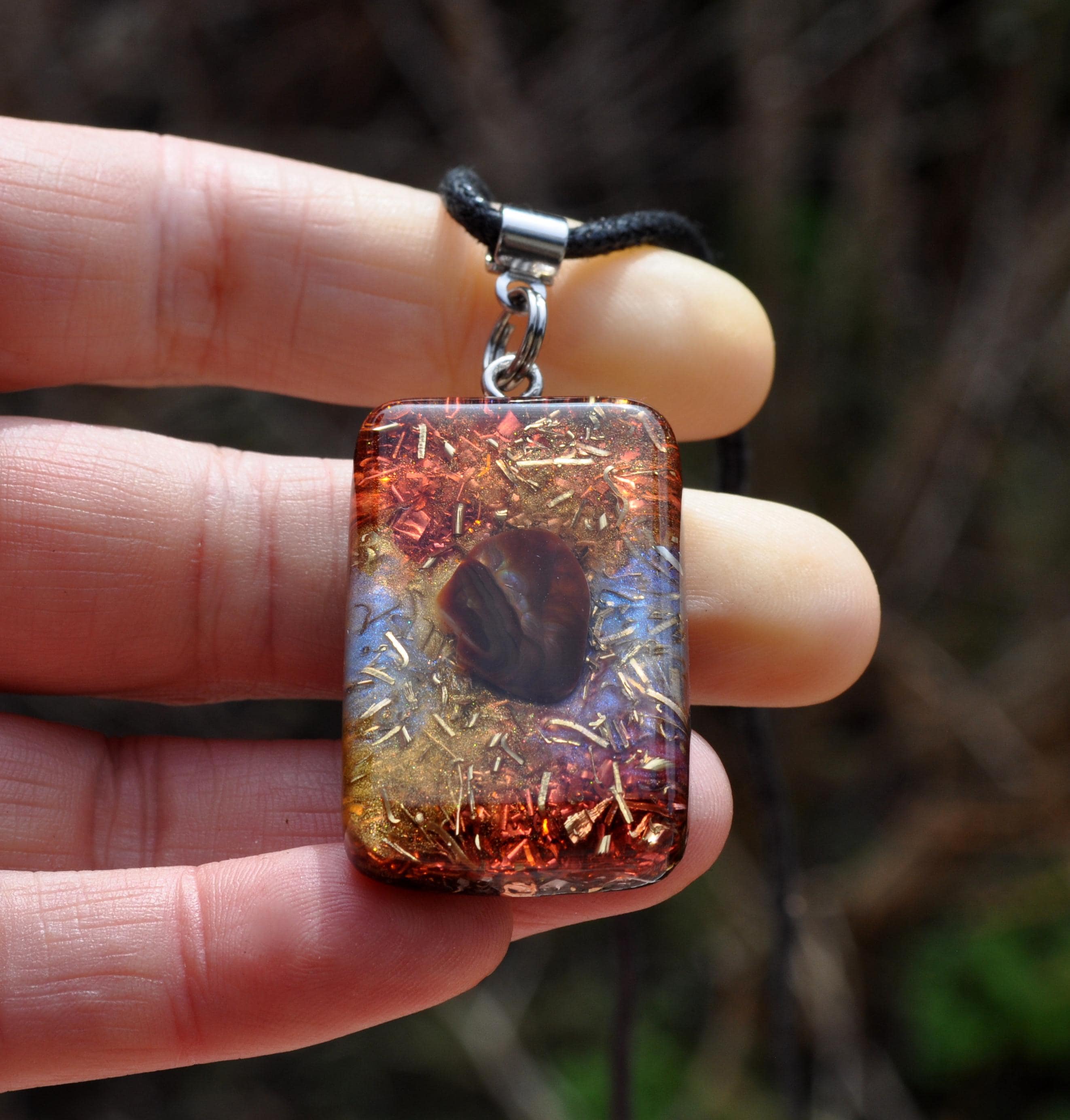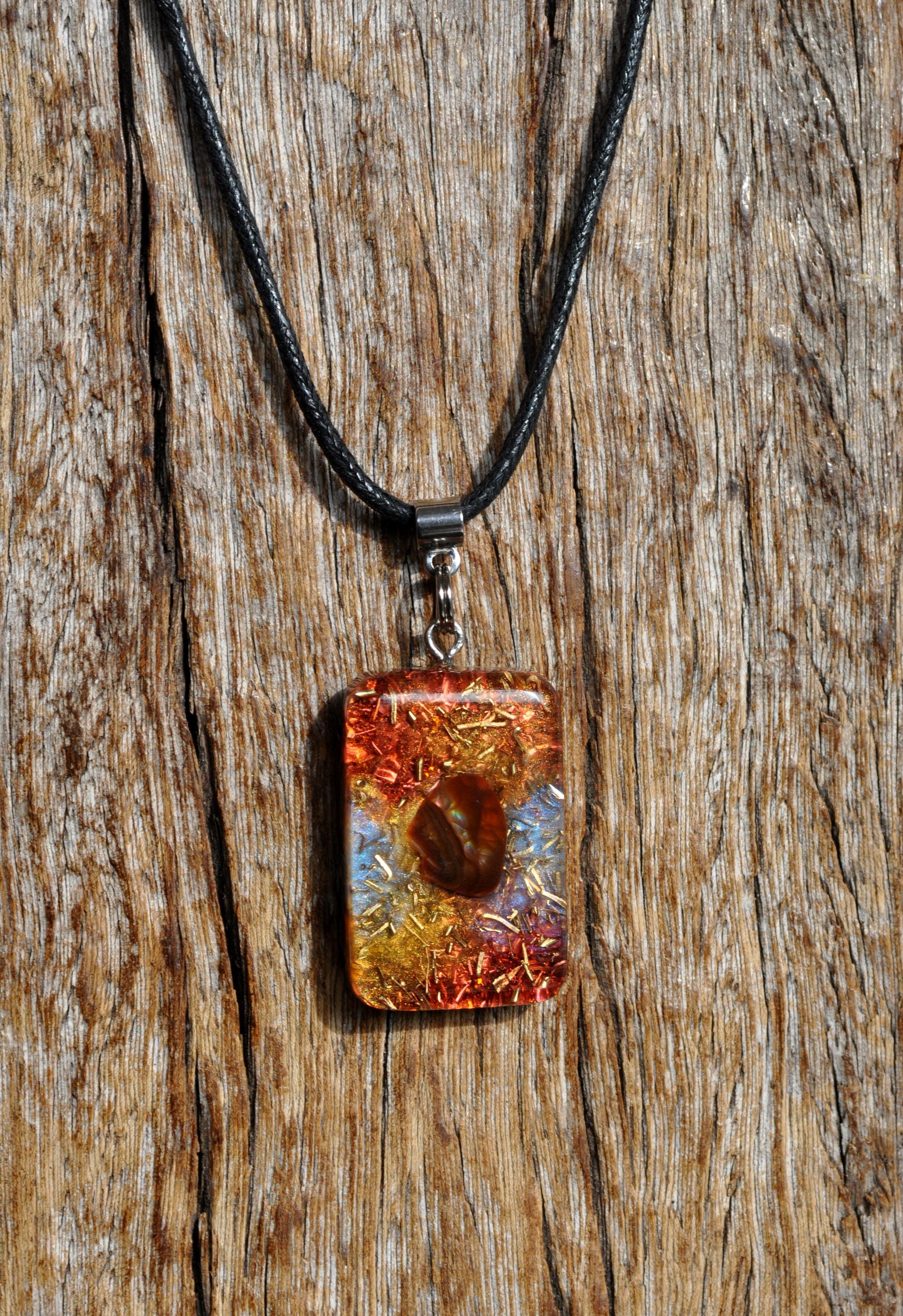 Multicolor Fire Agate Orgonite® Pendant – Handmade Crystal Energy Necklace with Black Tourmaline, Quartz & EMF-Style Protection Elements