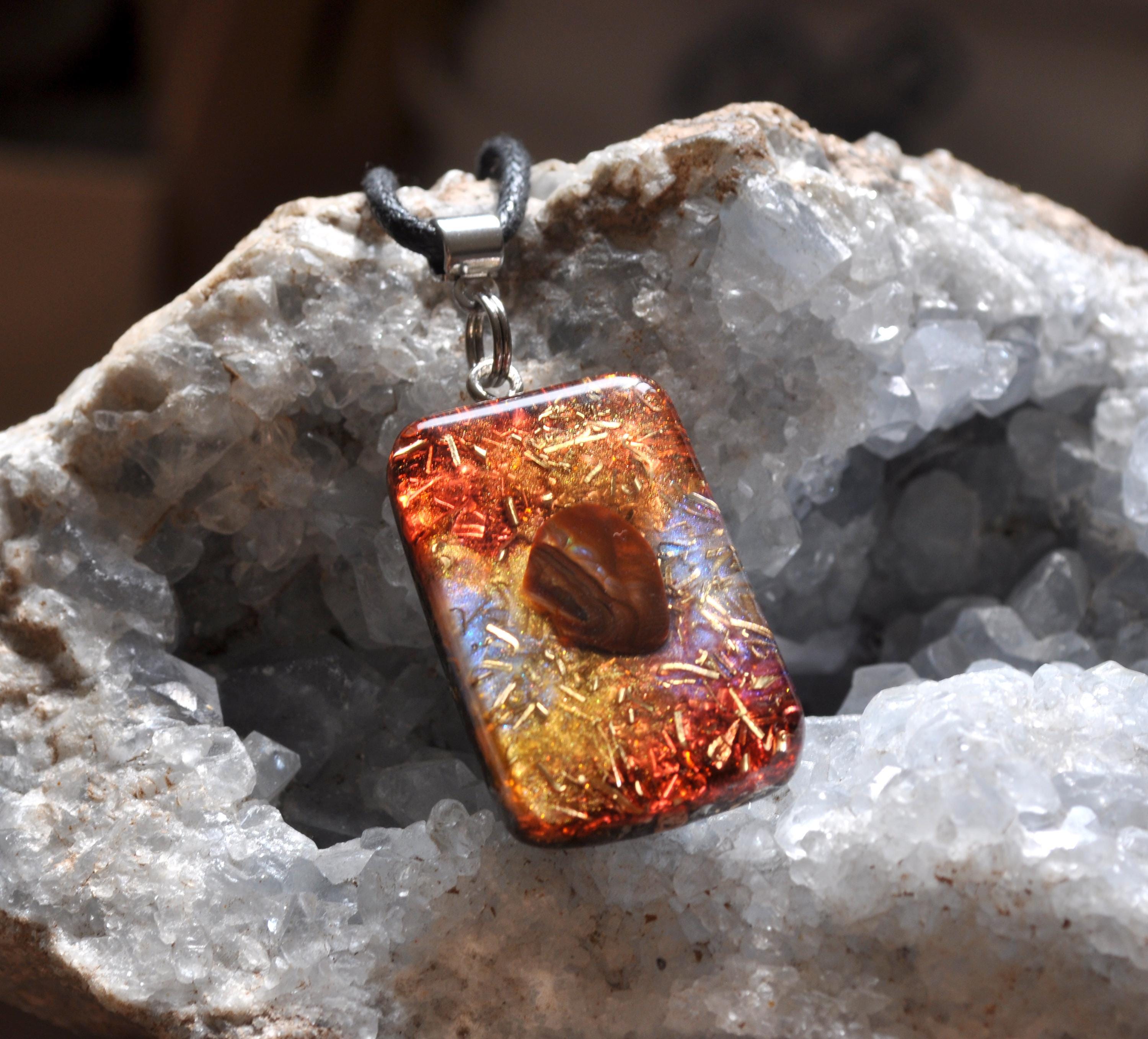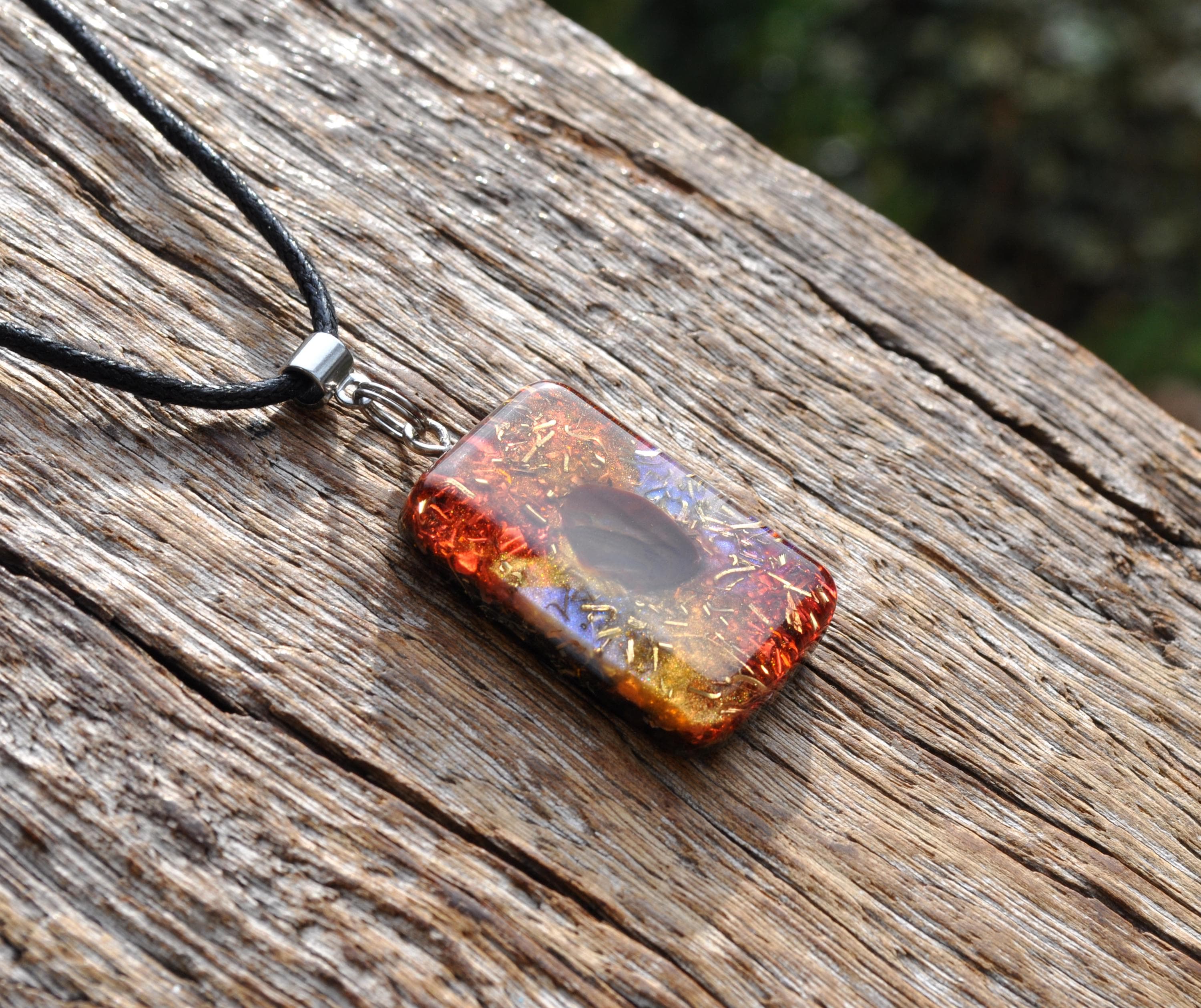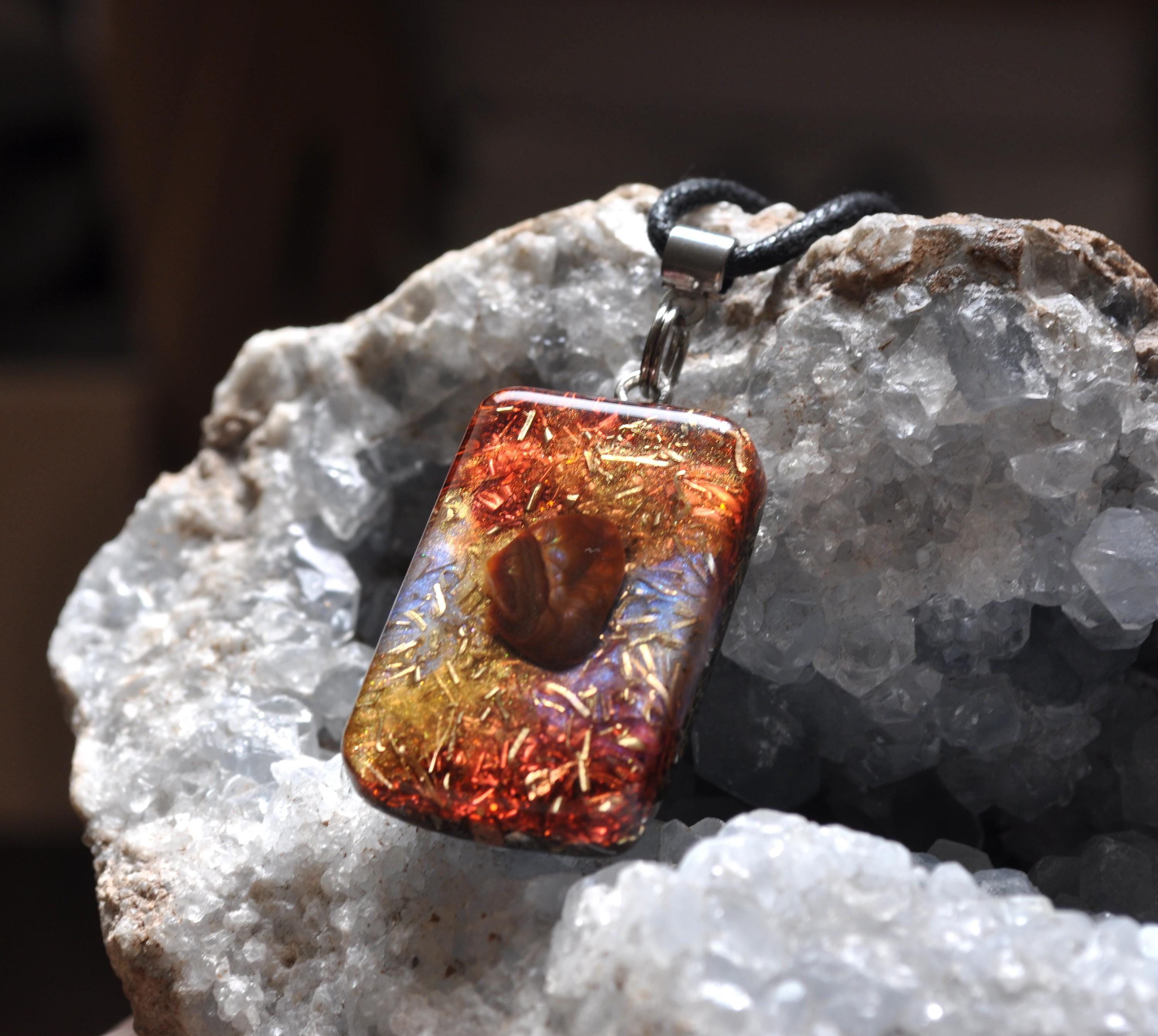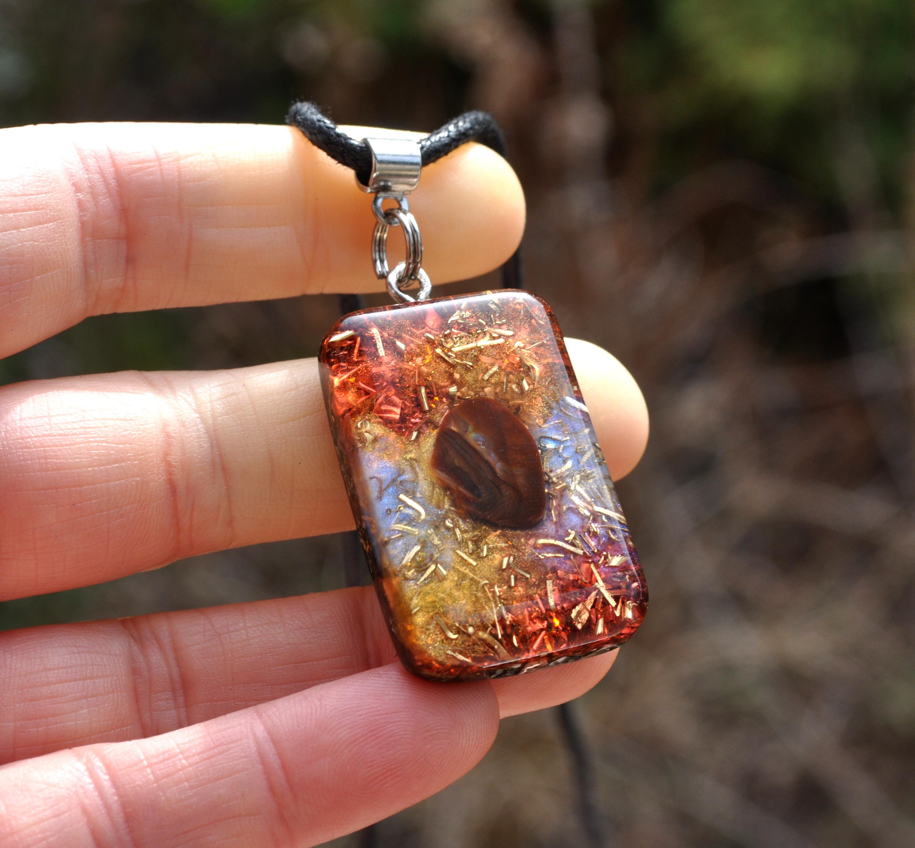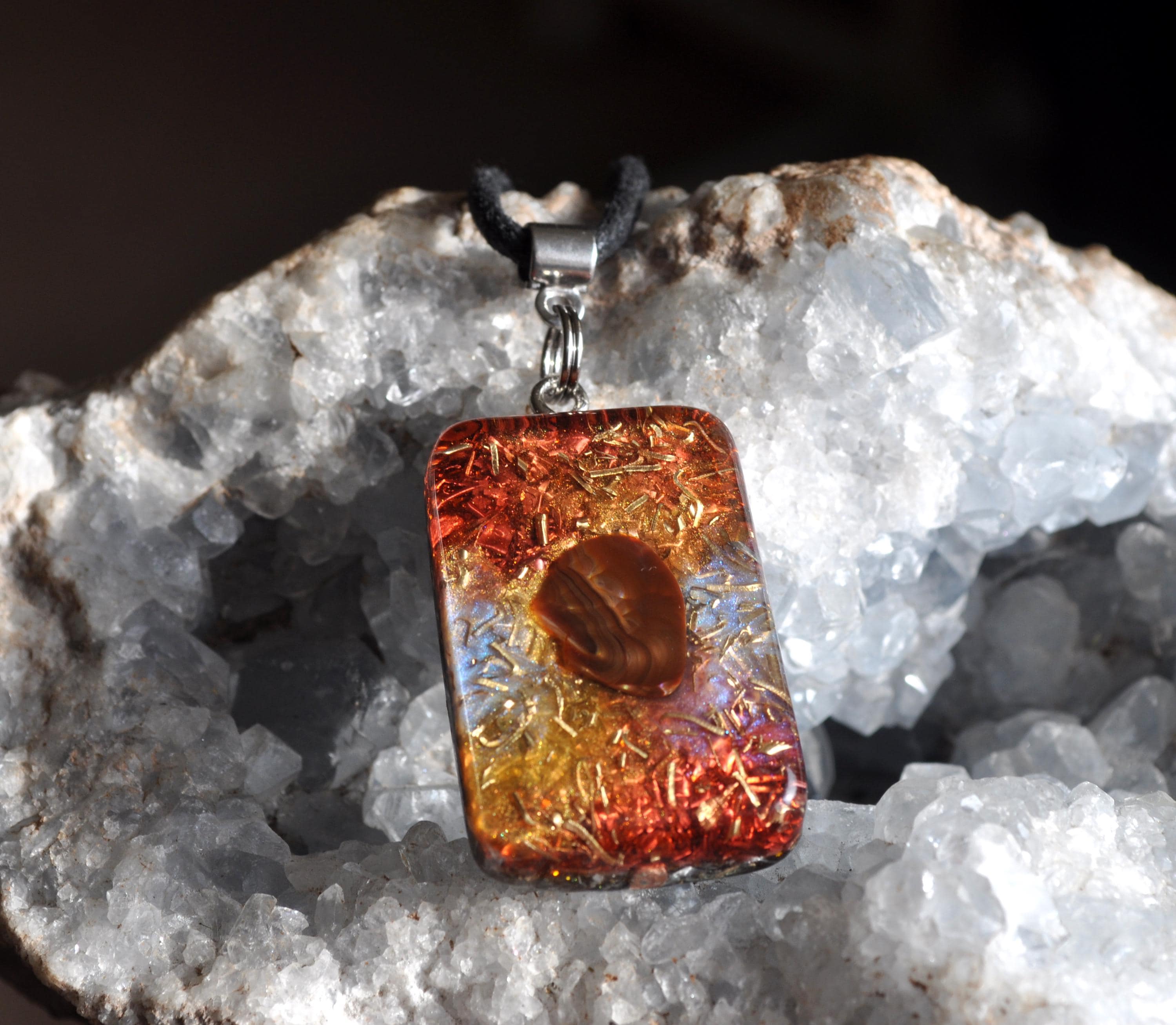 Multicolor Fire Agate Orgonite® Pendant – Handmade Crystal Energy Necklace with Black Tourmaline, Quartz & EMF-Style Protection Elements