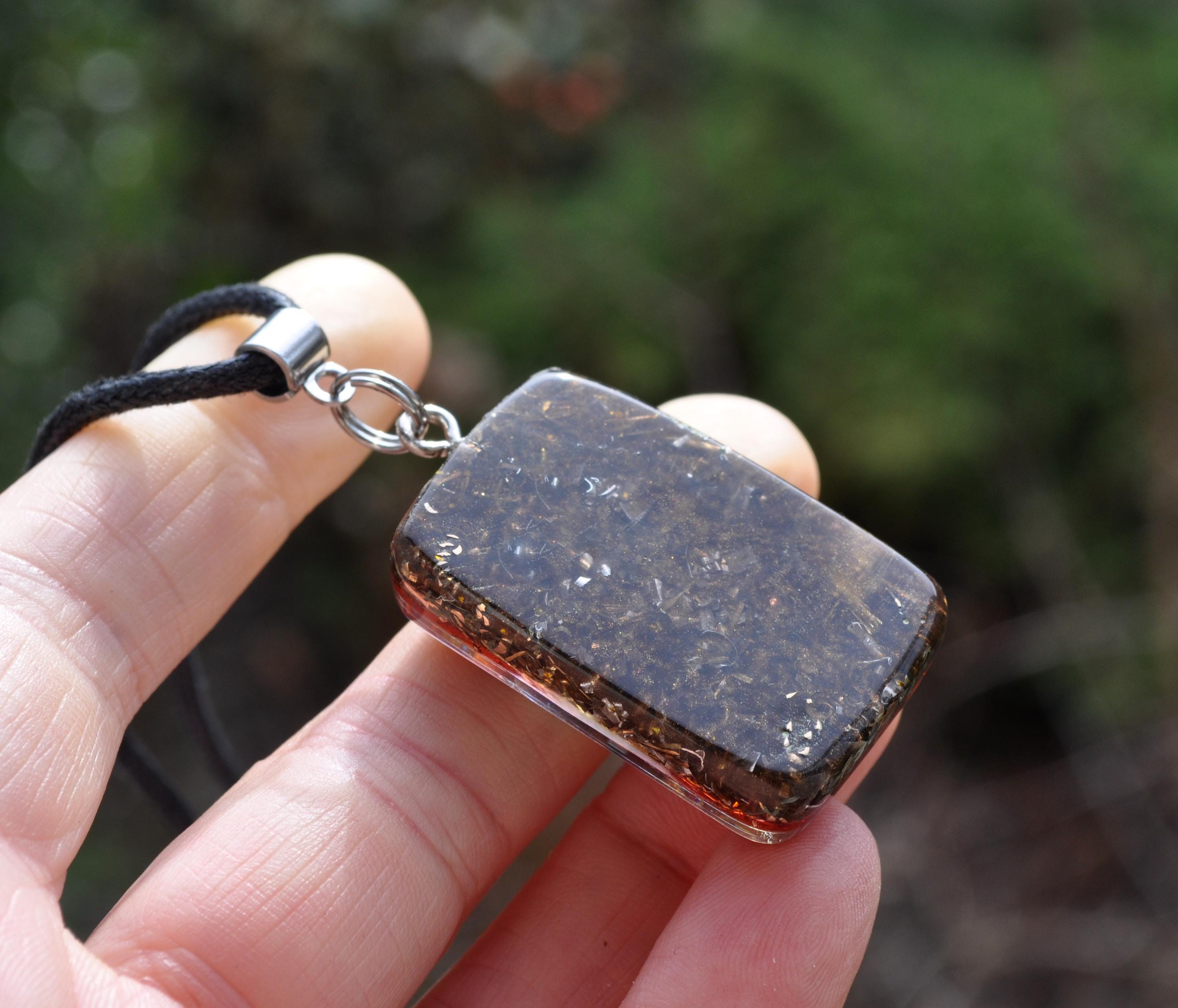 It is designed as a wearable orgone-style pendant combining organic and inorganic materials, traditionally used in orgonite designs to create a harmonized energetic field. The combination of resin, metals, and quartz is often associated with supporting energetic balance in environments, including those with electronic devices and EMF sources, as part of a symbolic, metaphysical approach.