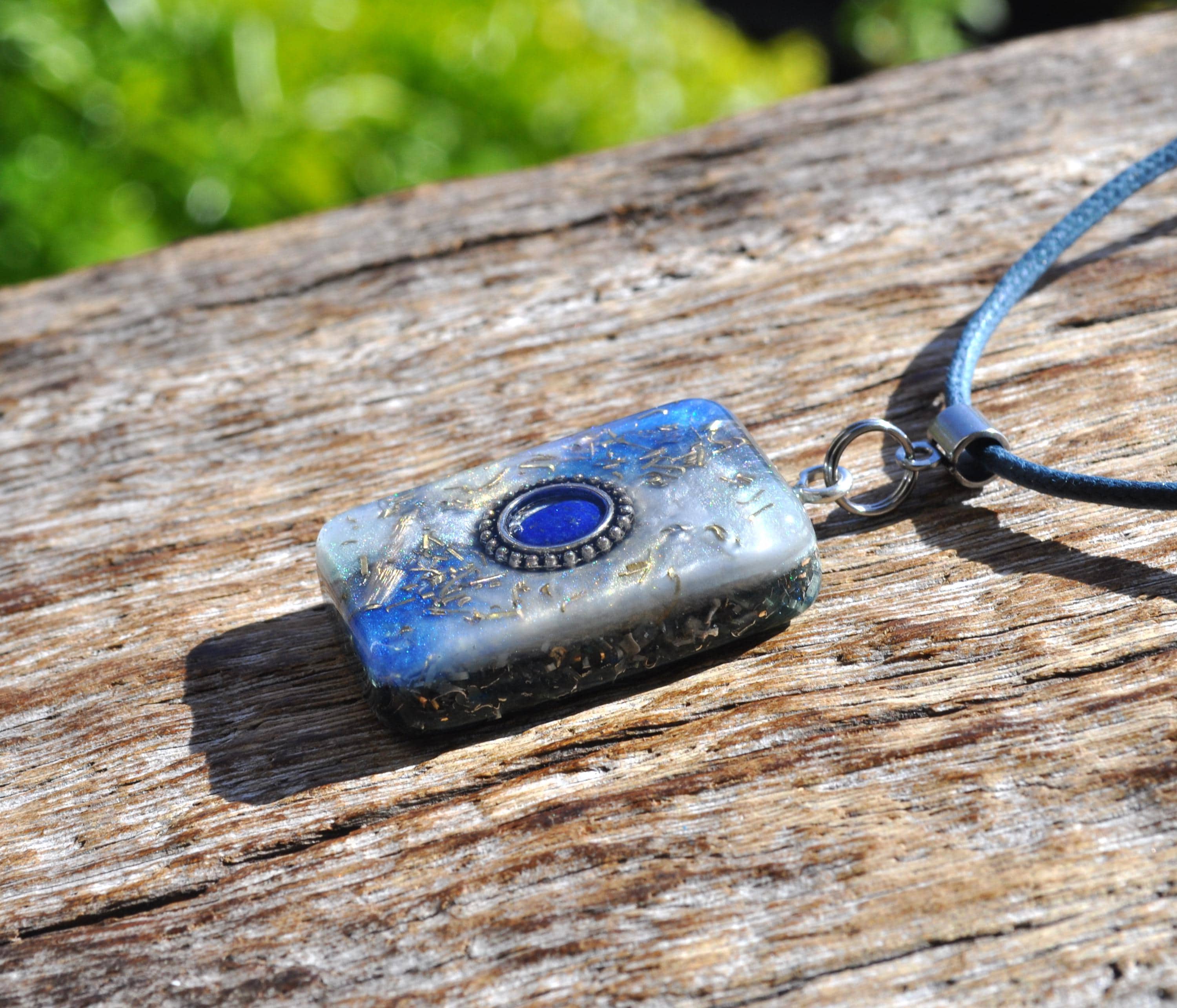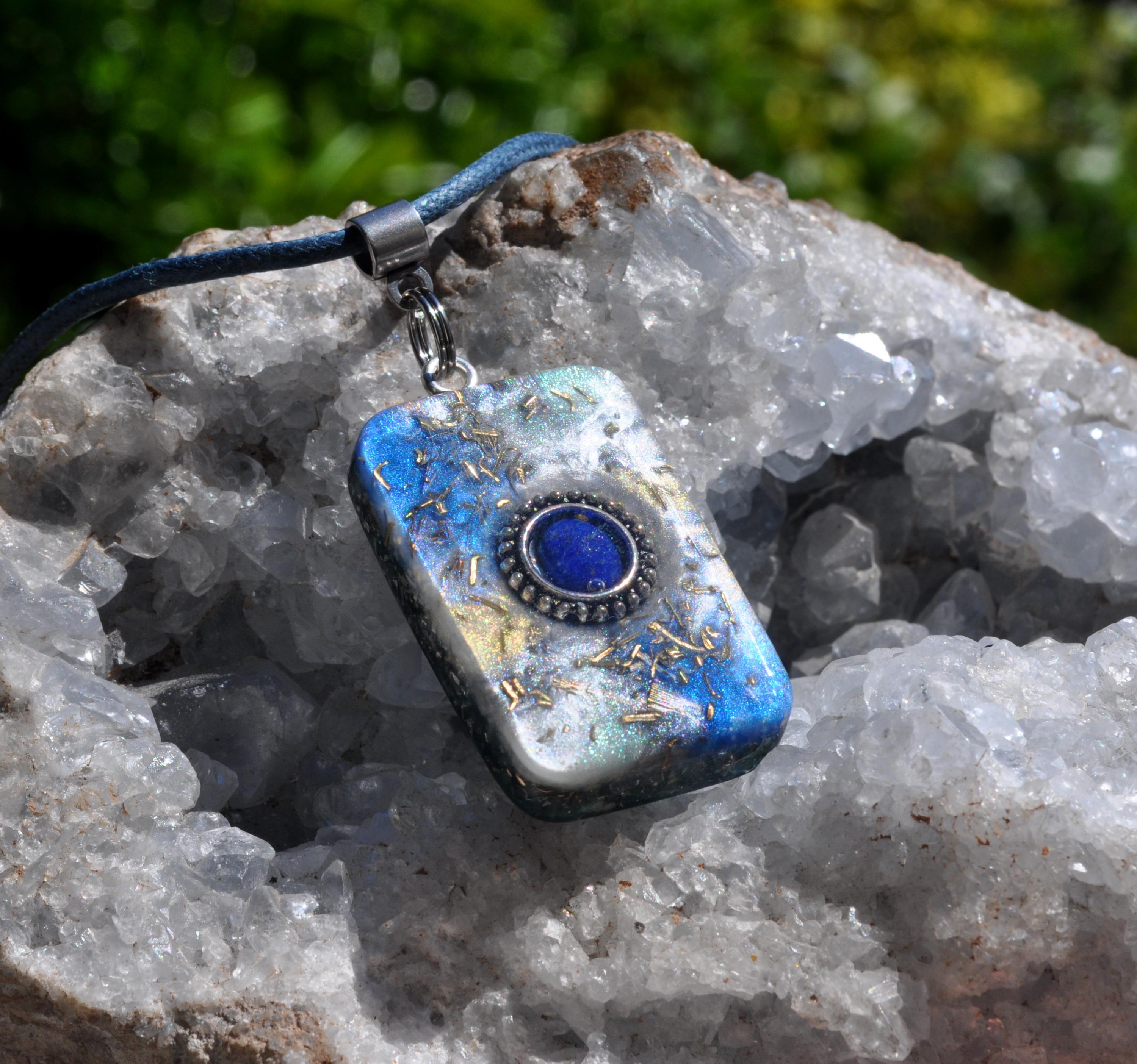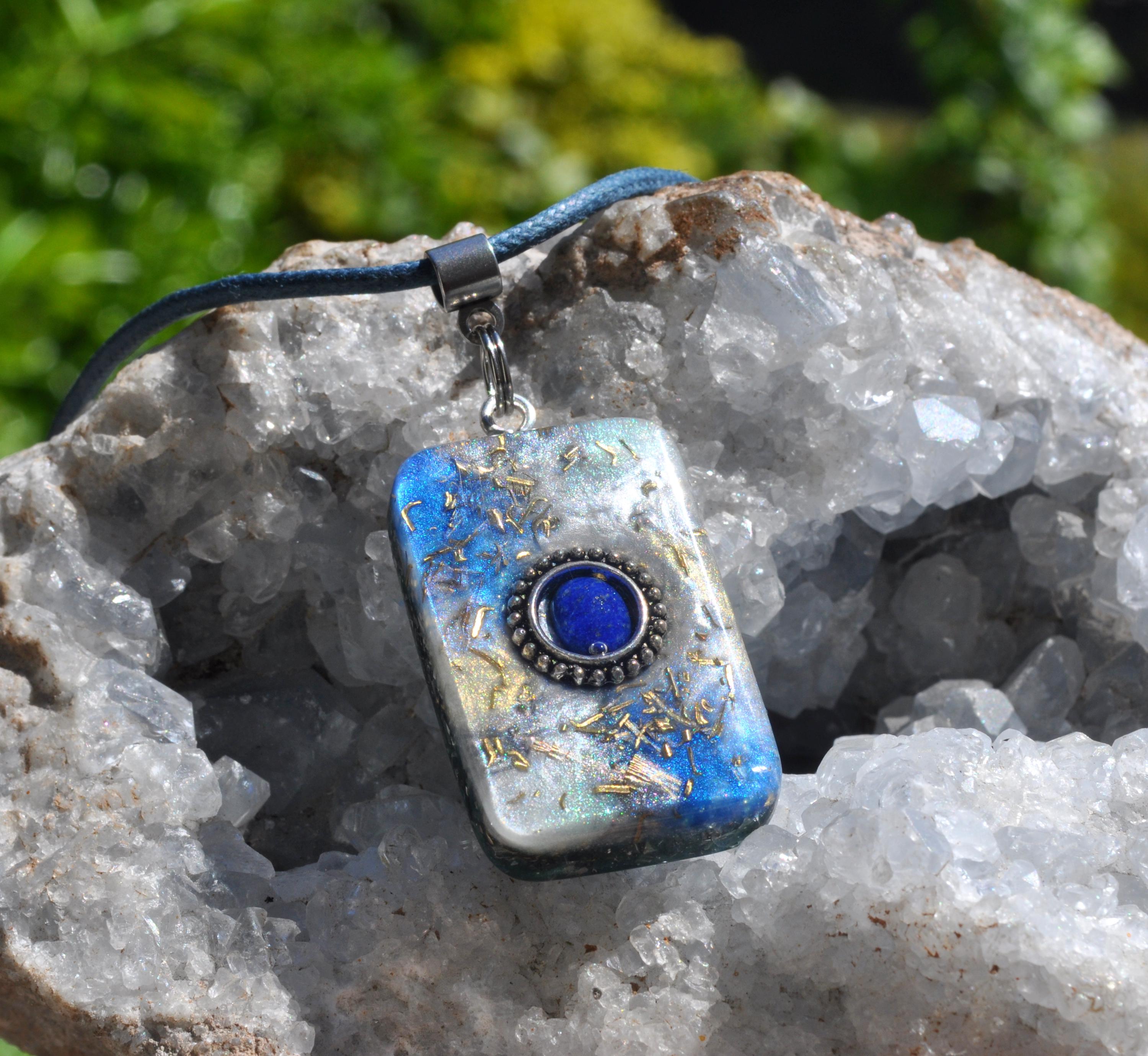 This orgonite pendant is a unique piece of handmade crystal art, centered around a polished Lapis Lazuli gemstone. It combines natural crystals and metals in a layered resin design, creating a striking and meaningful piece of jewelry.