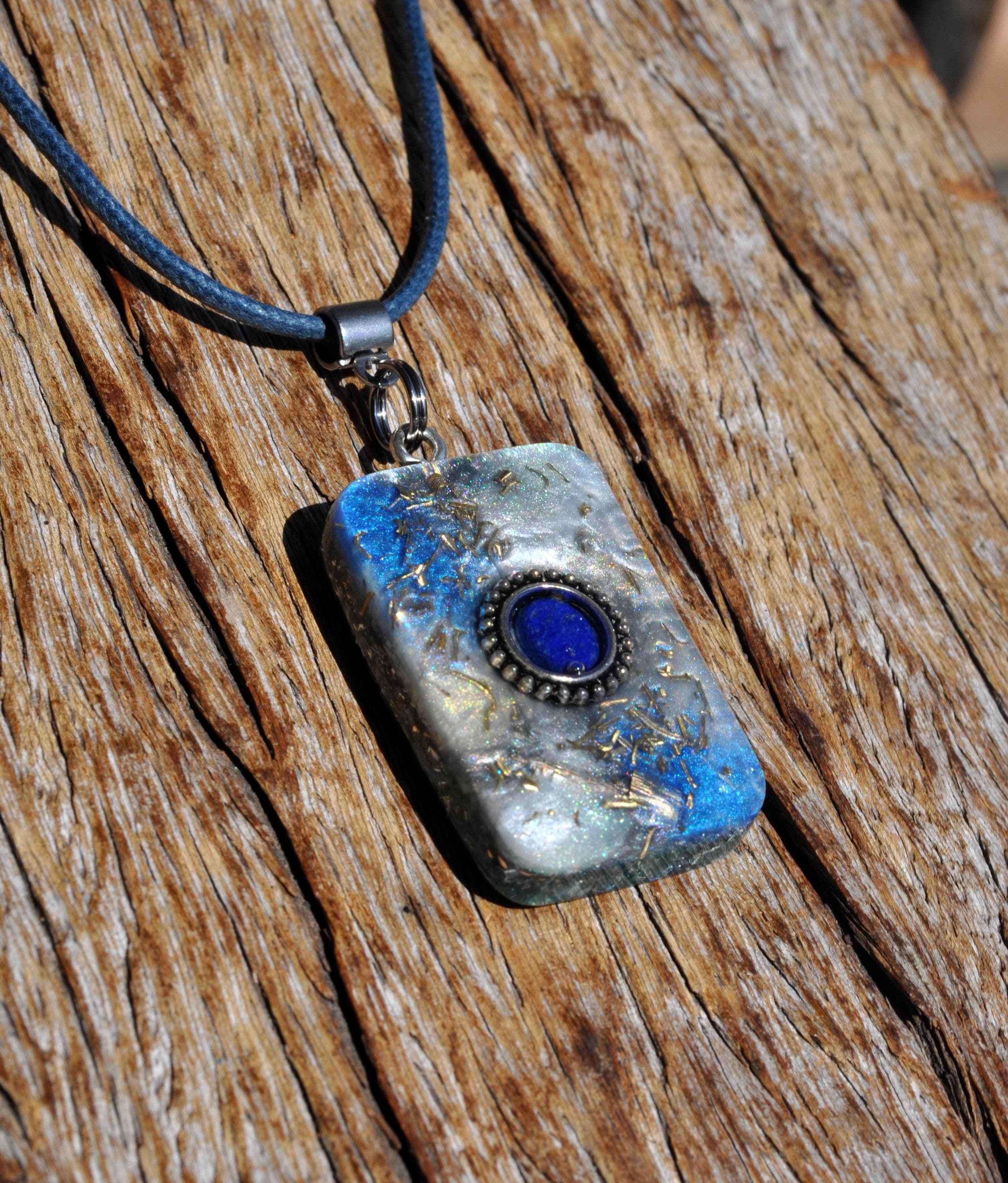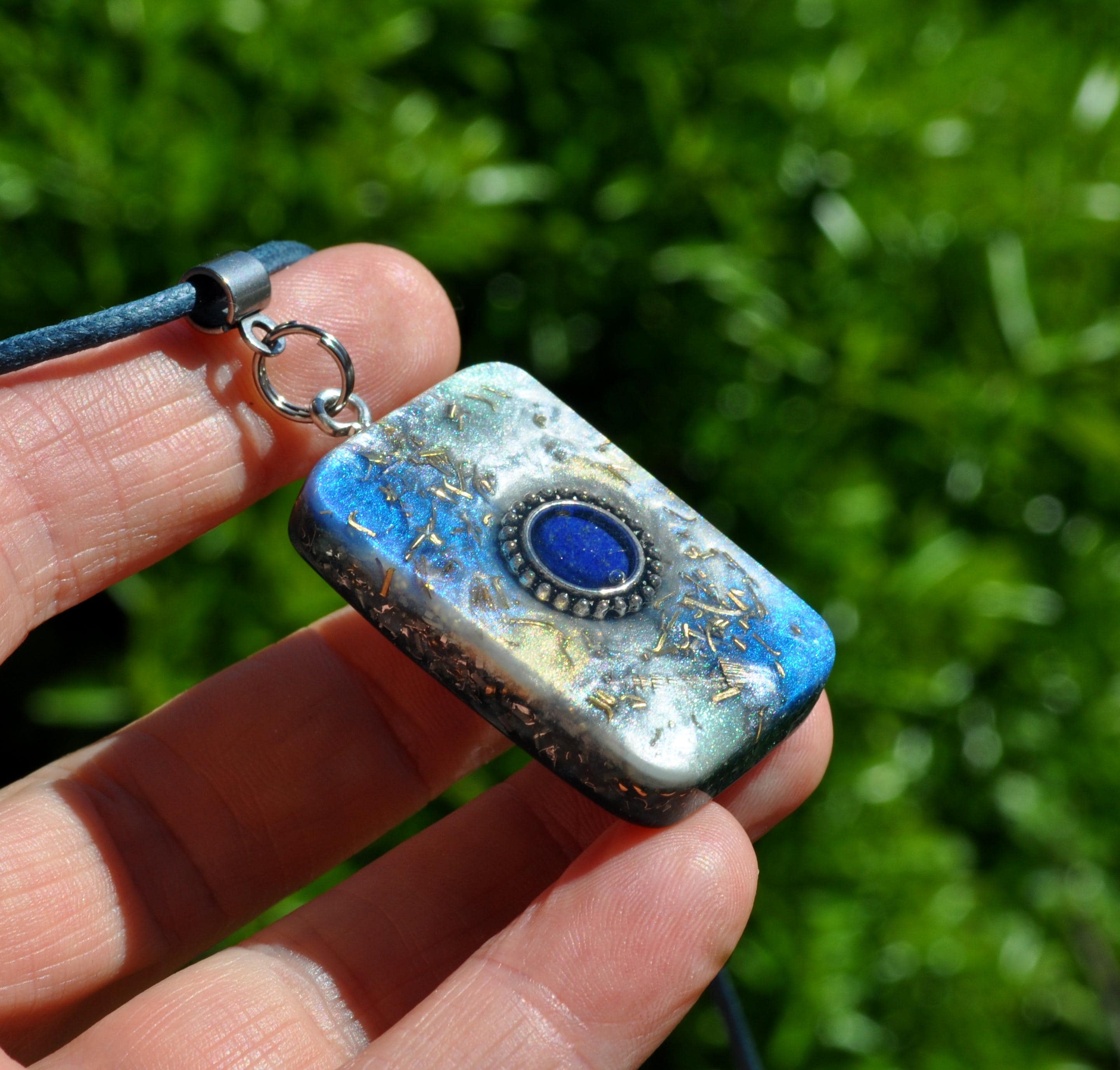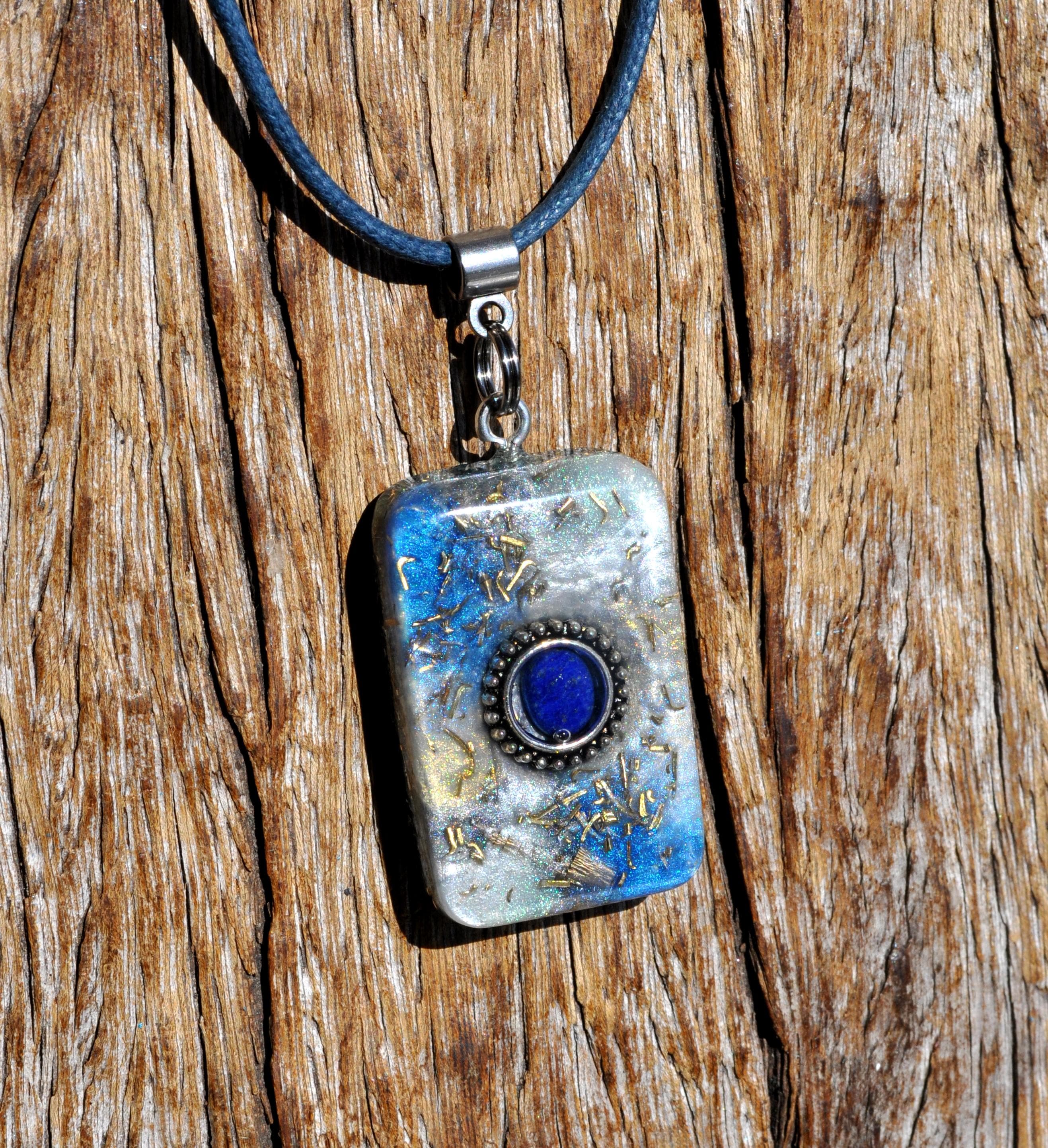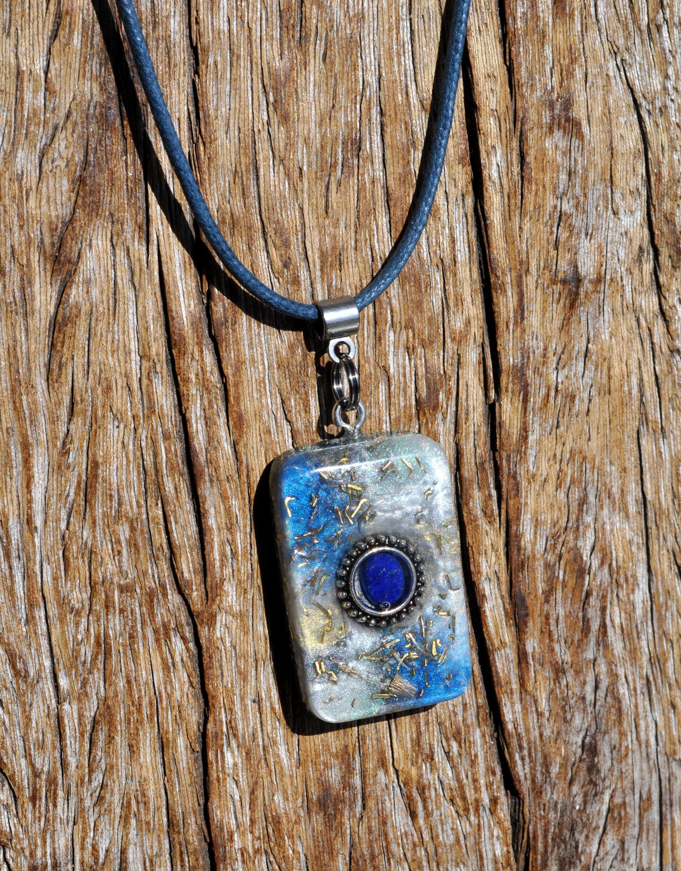 This orgonite pendant is a unique piece of handmade crystal art, centered around a polished Lapis Lazuli gemstone. It combines natural crystals and metals in a layered resin design, creating a striking and meaningful piece of jewelry.