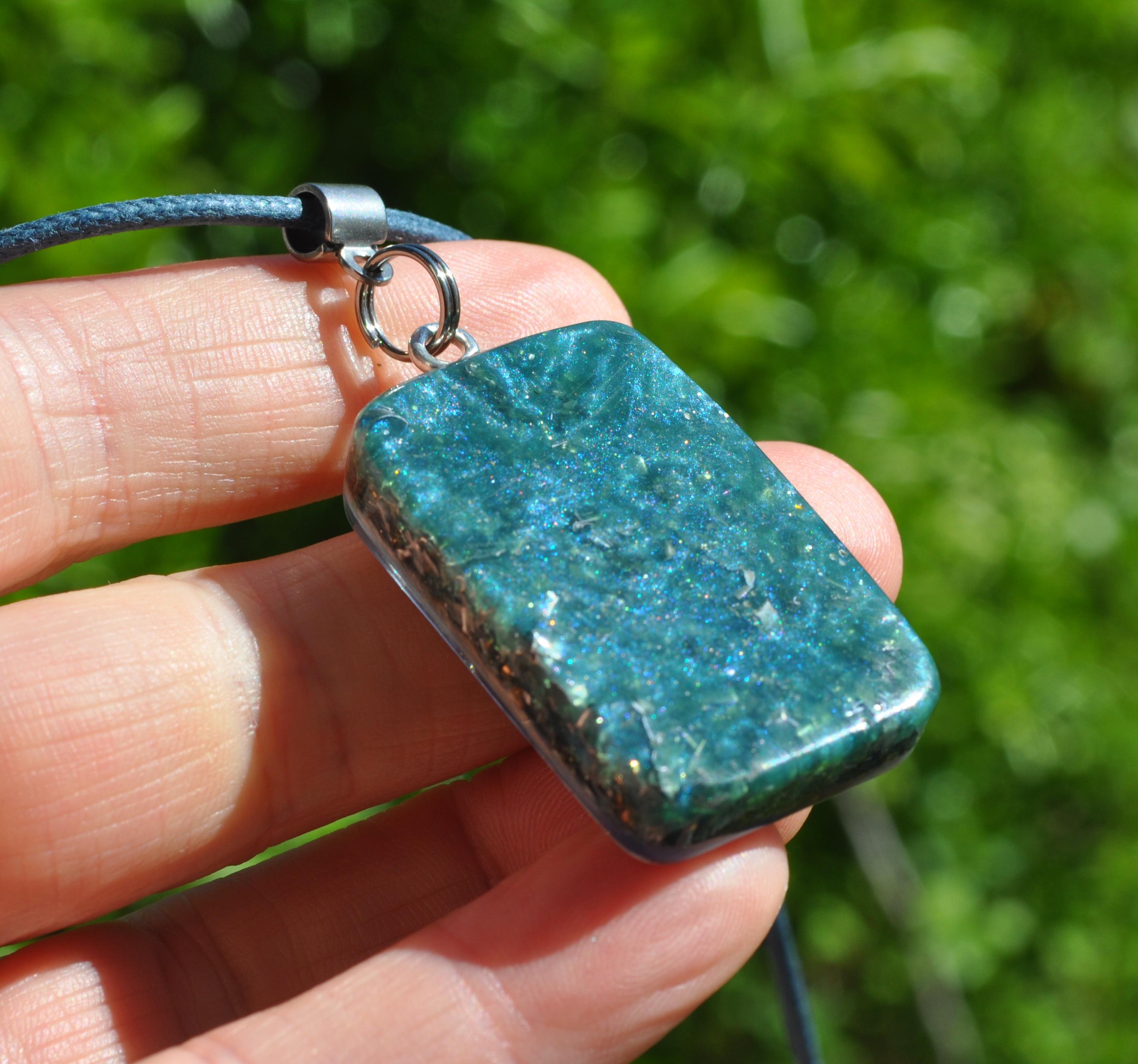 This pendant is made using layered resin combined with a mix of metals such as copper, brass, aluminium, and bronze. These materials are commonly used in orgonite-style art for their contrasting textures and visual depth.