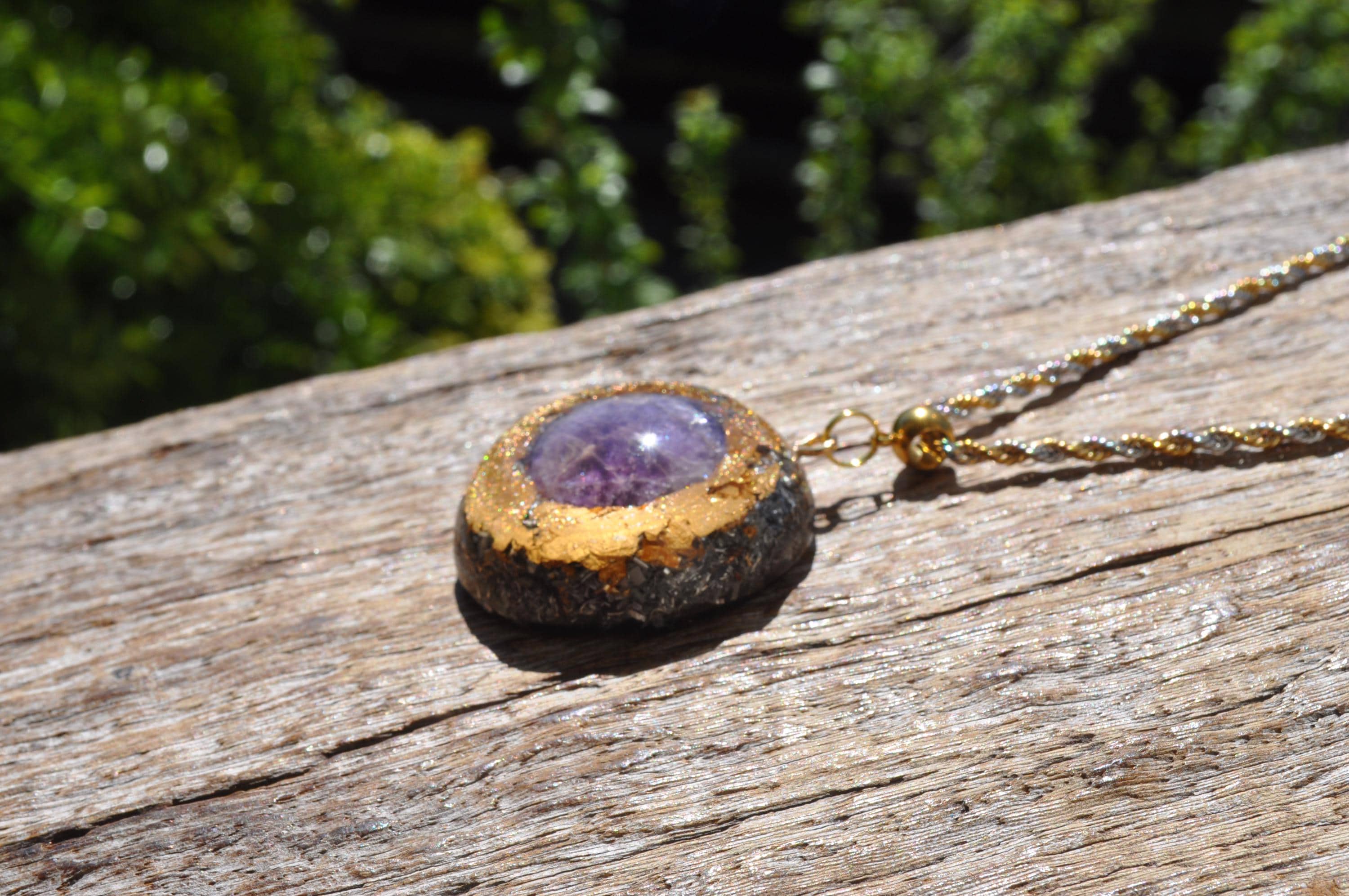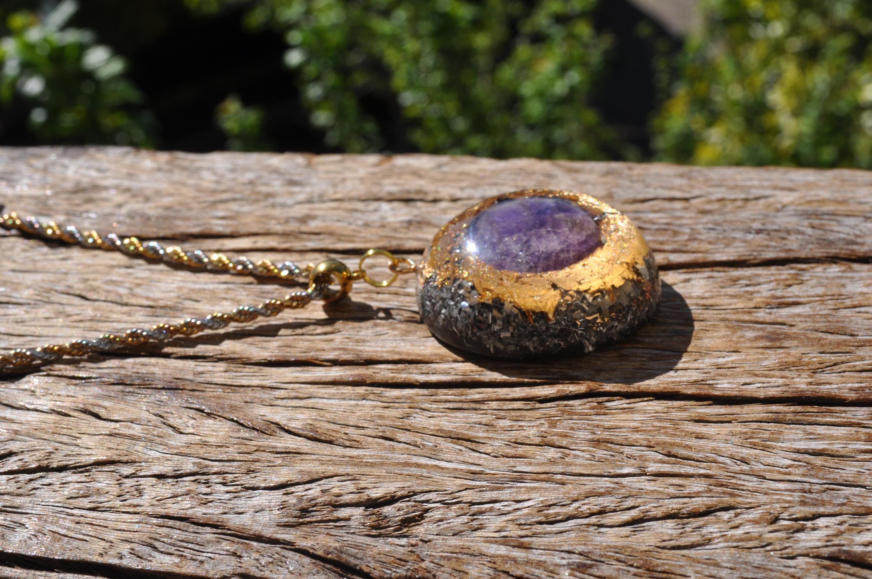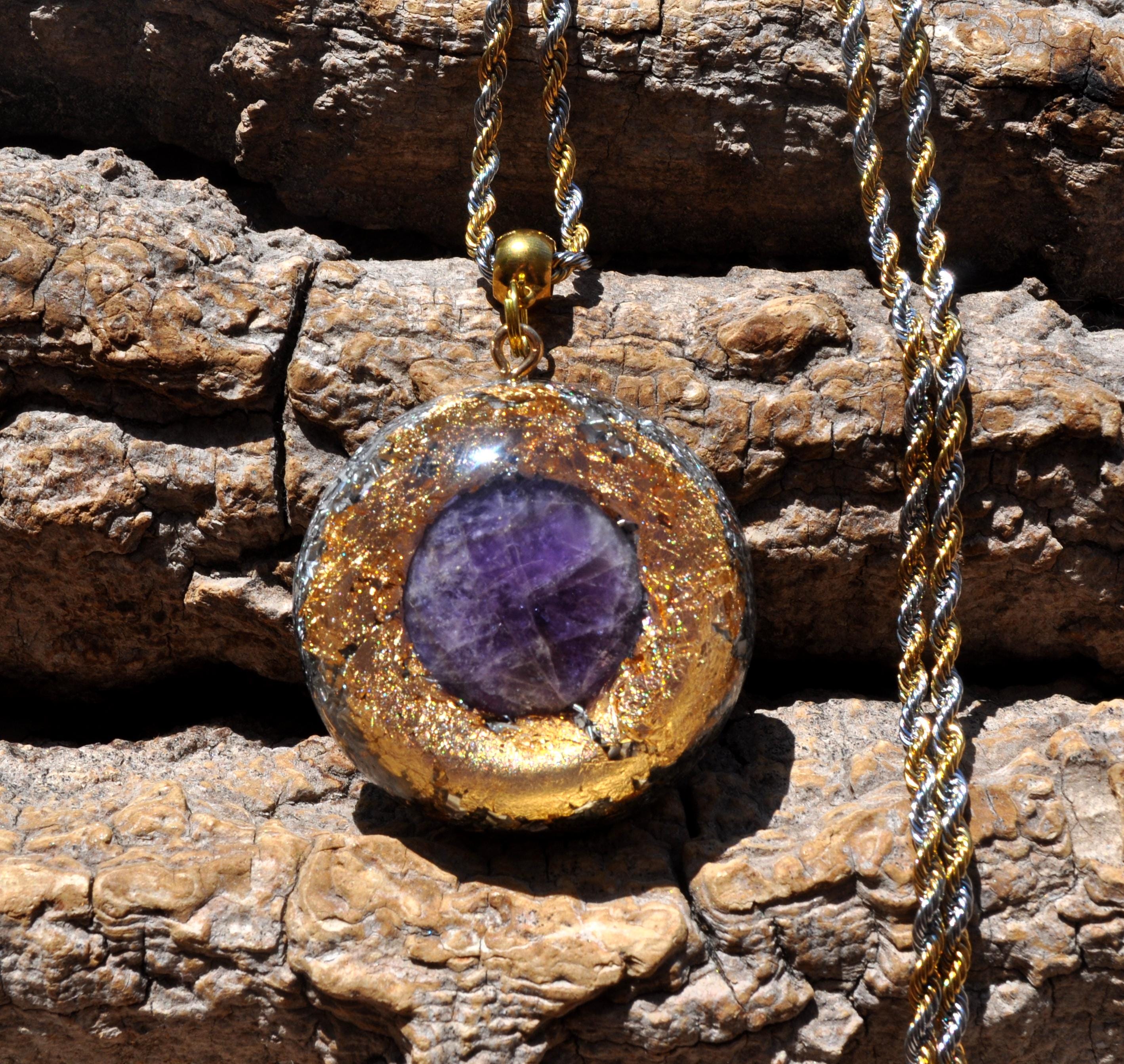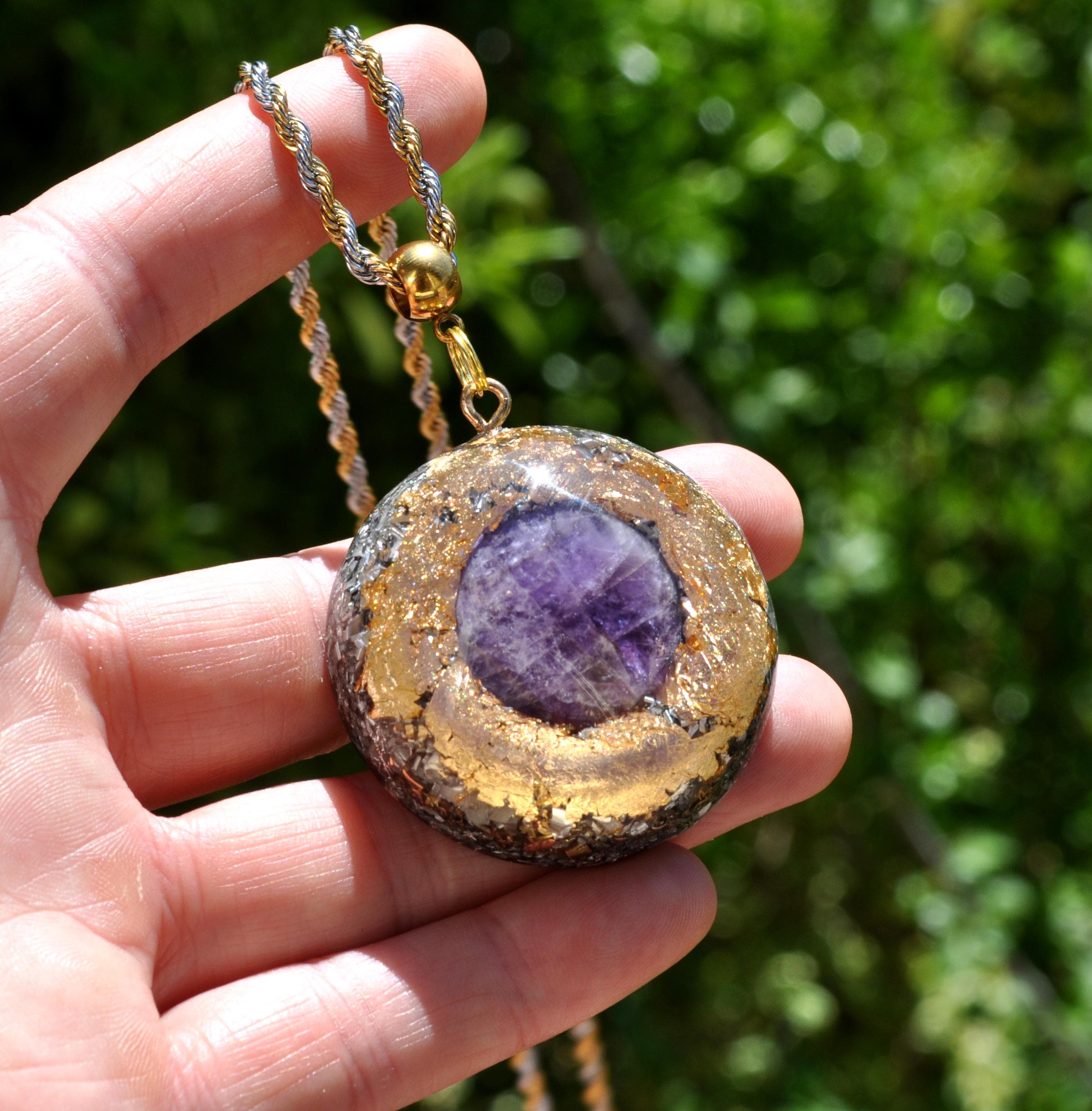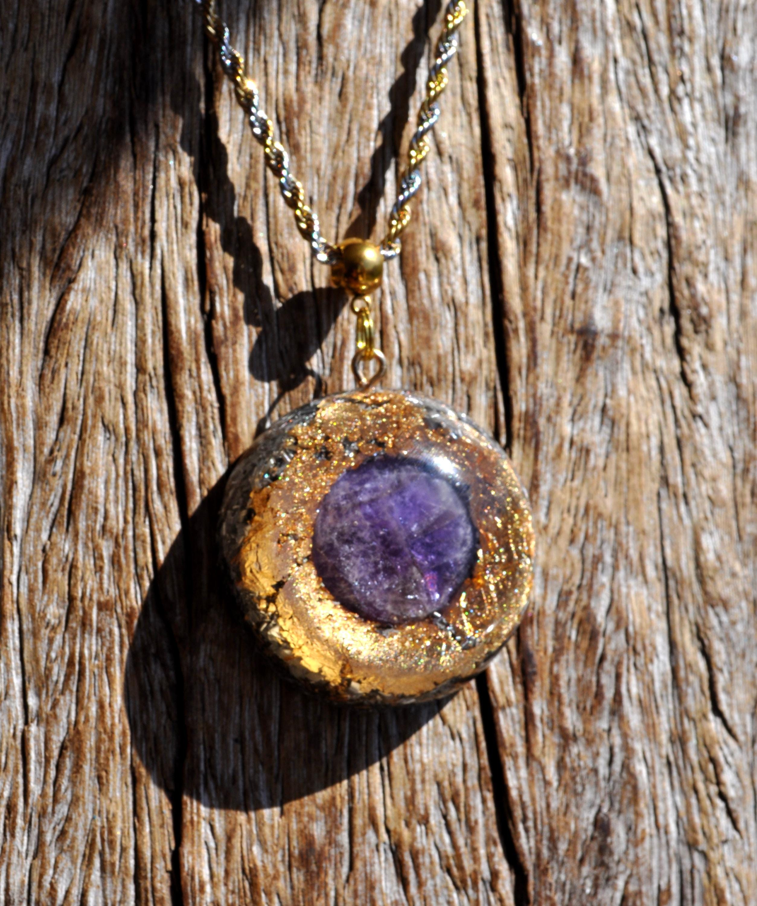 Large Orgonite® Pendant – 4.2 cm / 1.6" Amethyst Crystal Necklace with Mixed Stones, Gold Leaf & Resin Art Jewelry