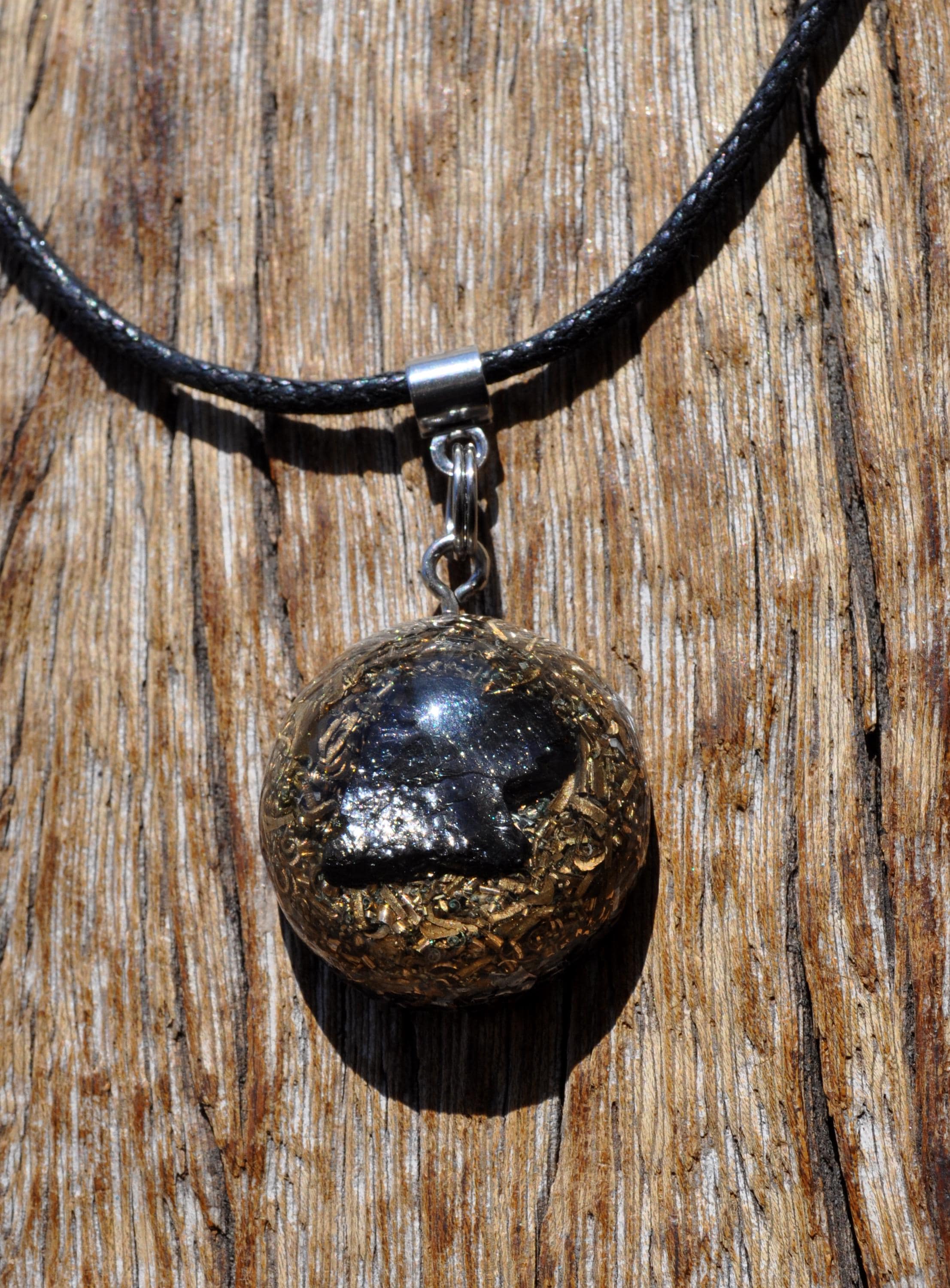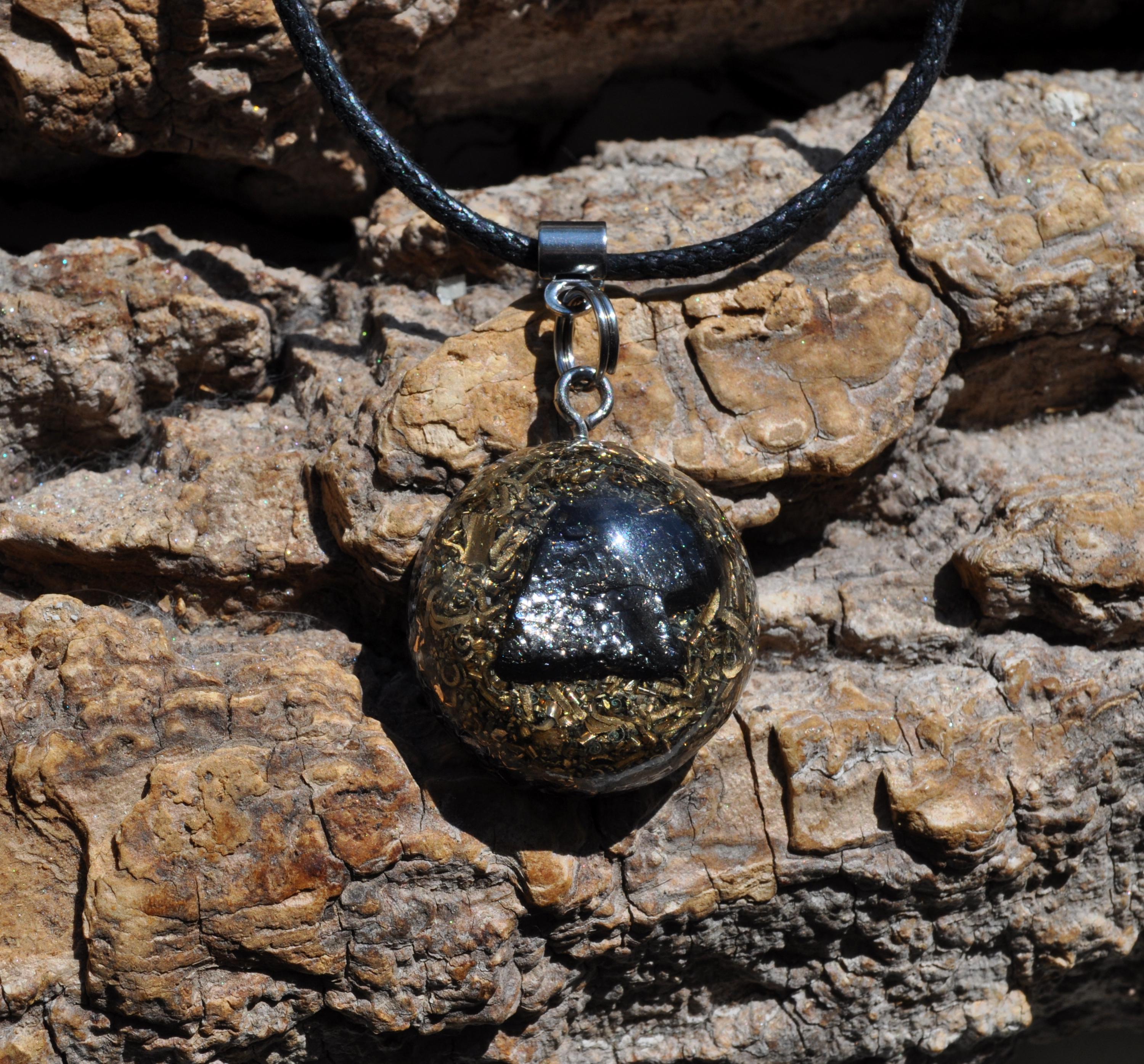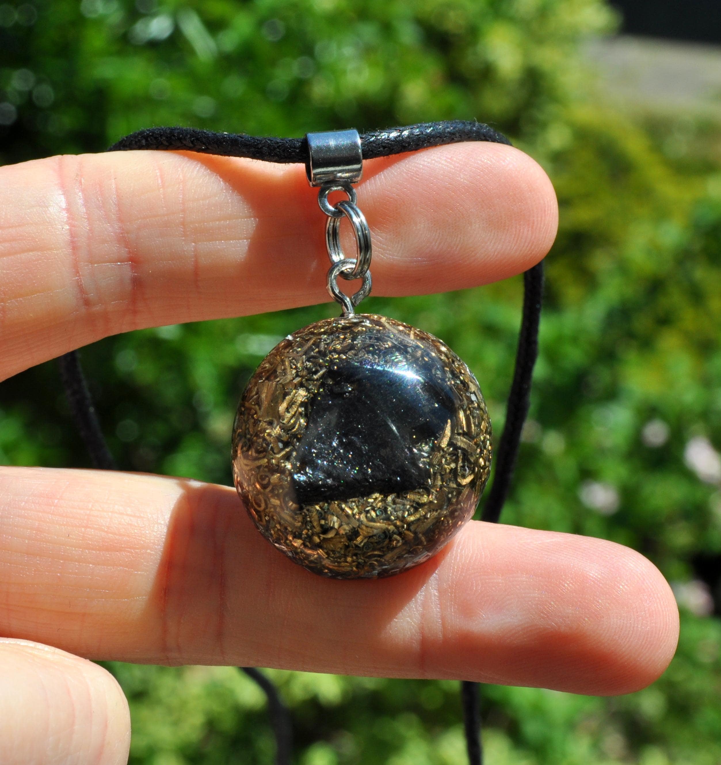 Material: Polyester resin, brass, bronze, aluminium, copper shavings, orgonite composite, stainless steel bail