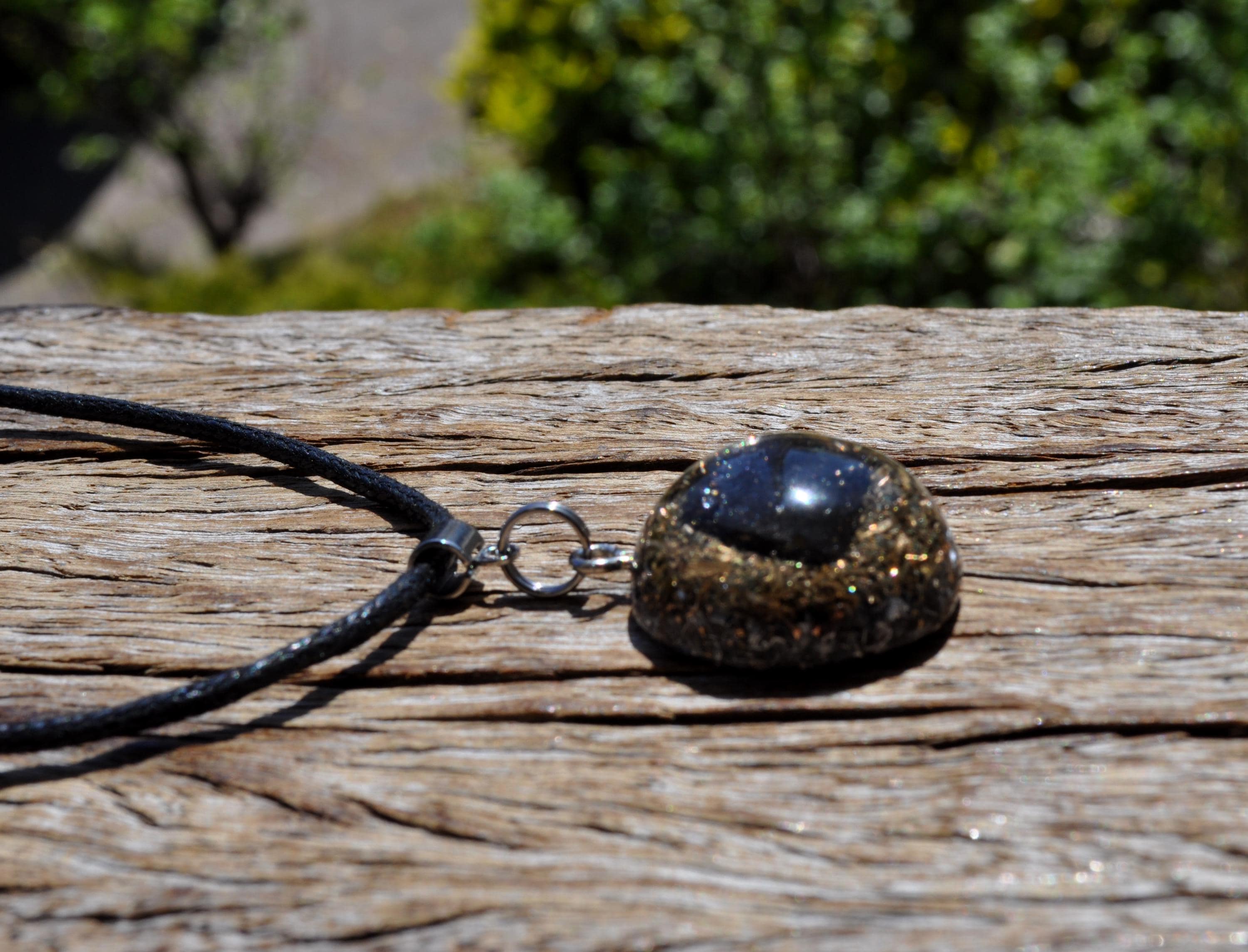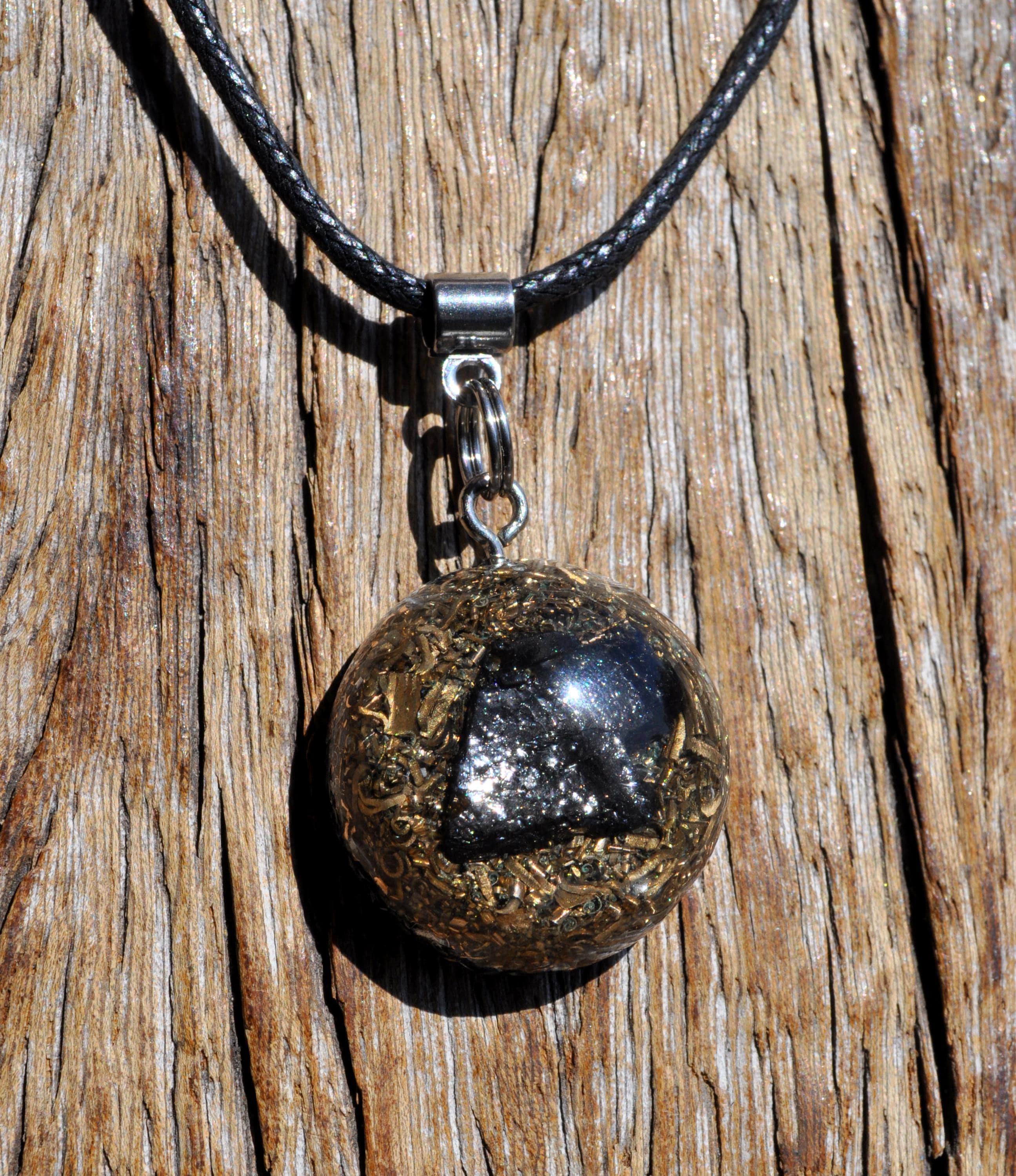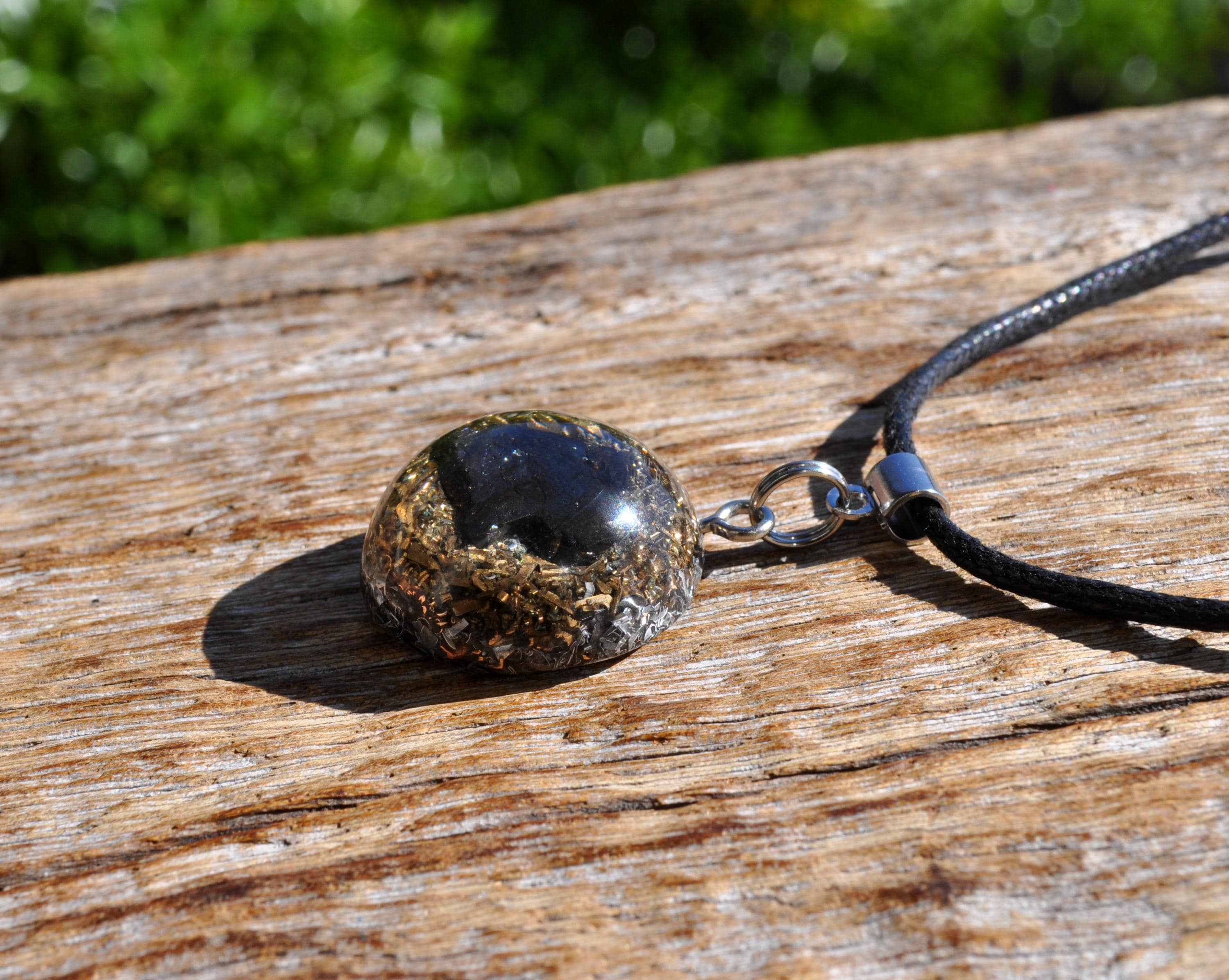 Material: Polyester resin, brass, bronze, aluminium, copper shavings, orgonite composite, stainless steel bail