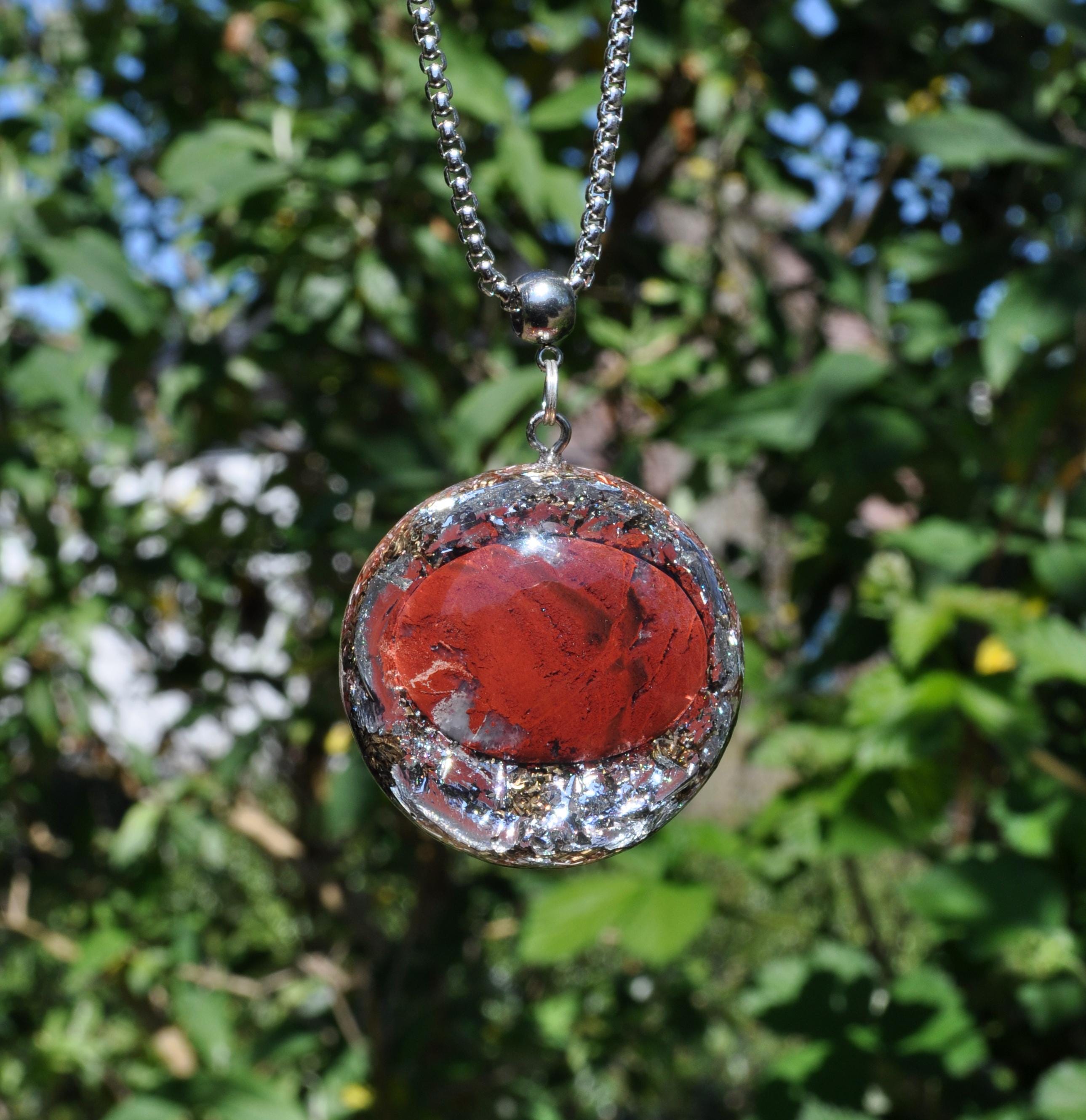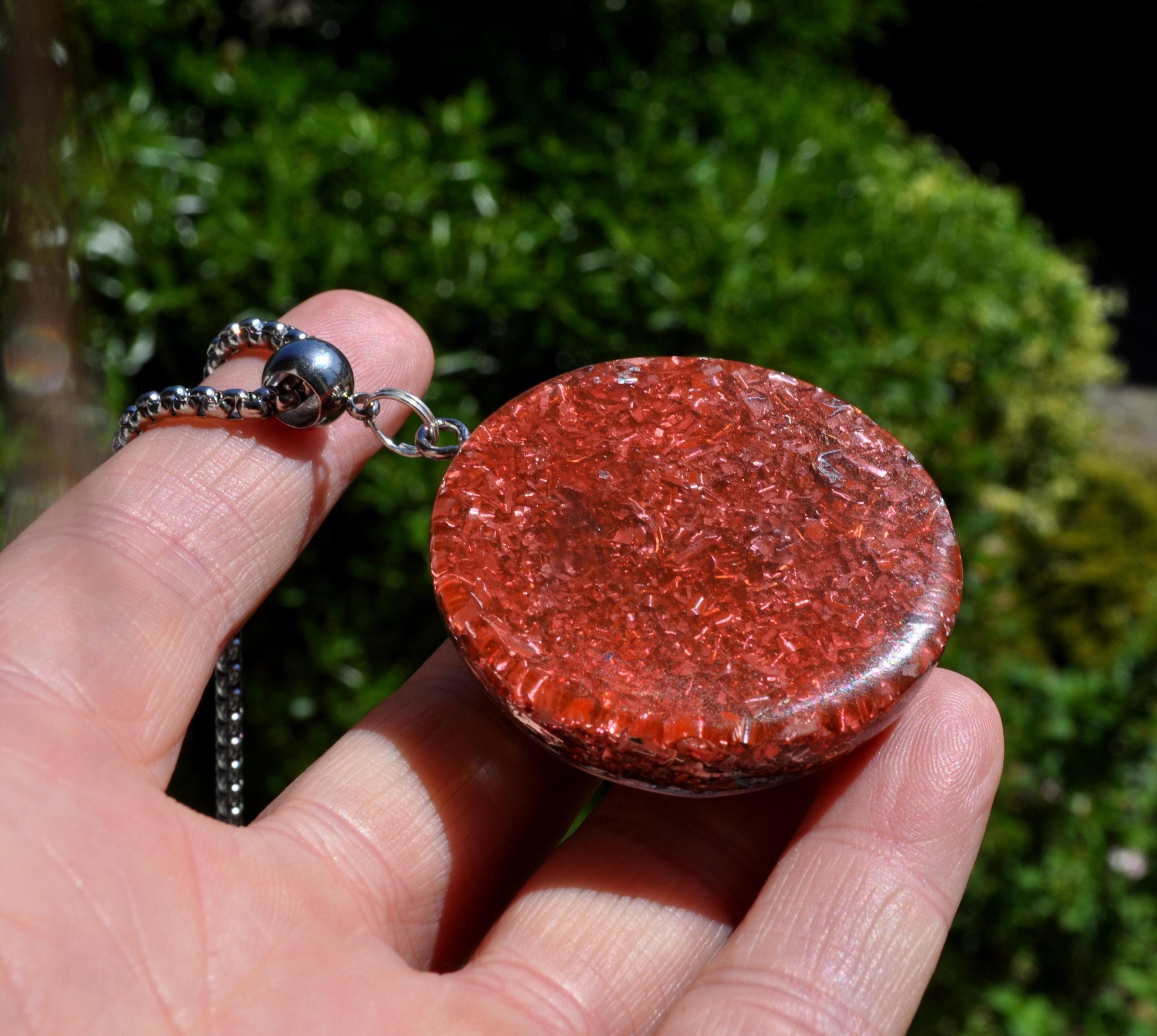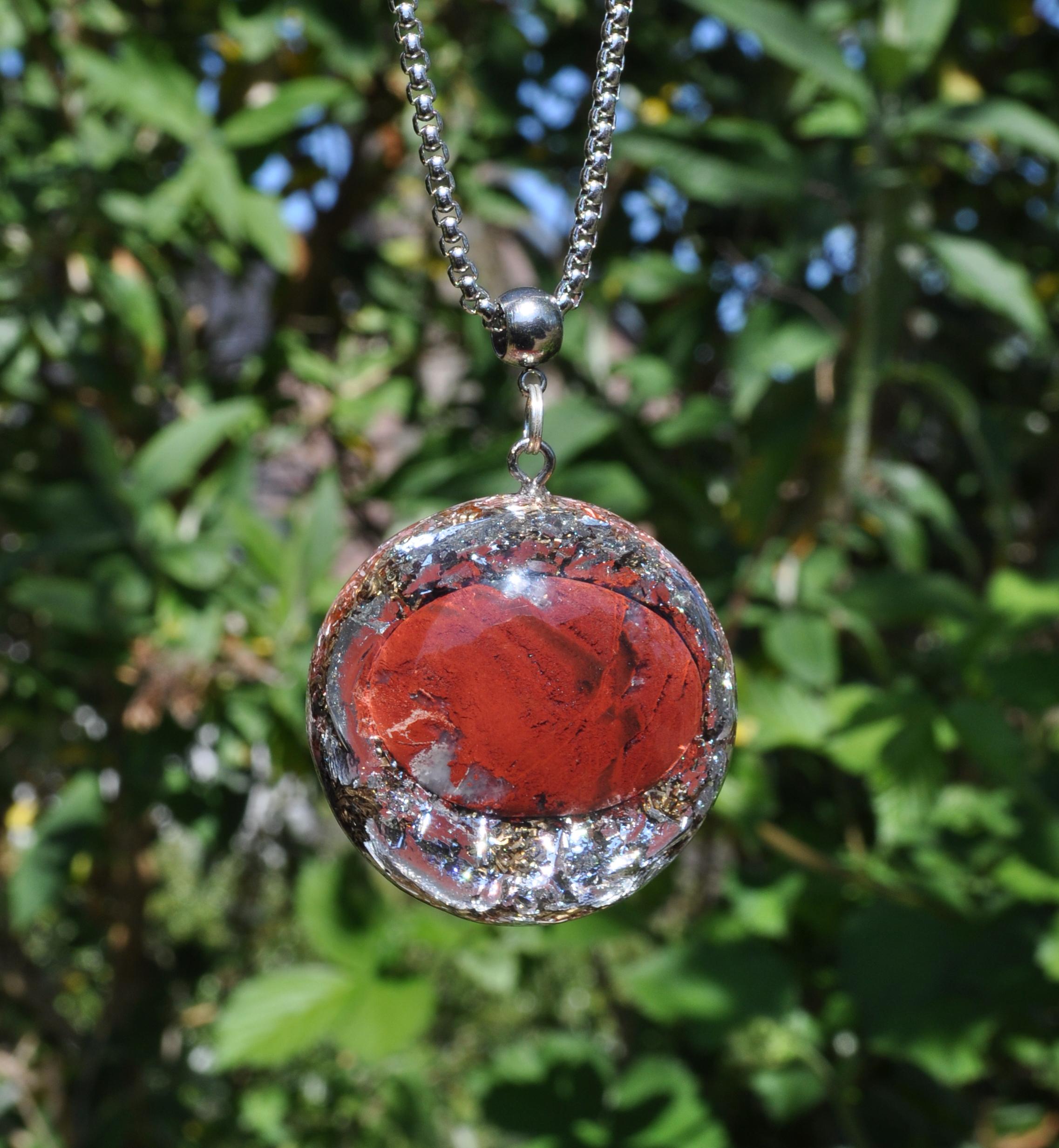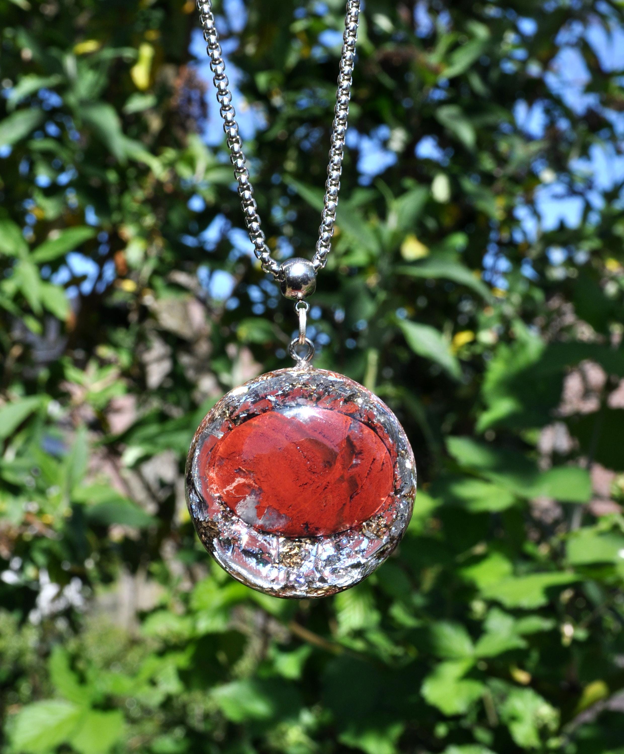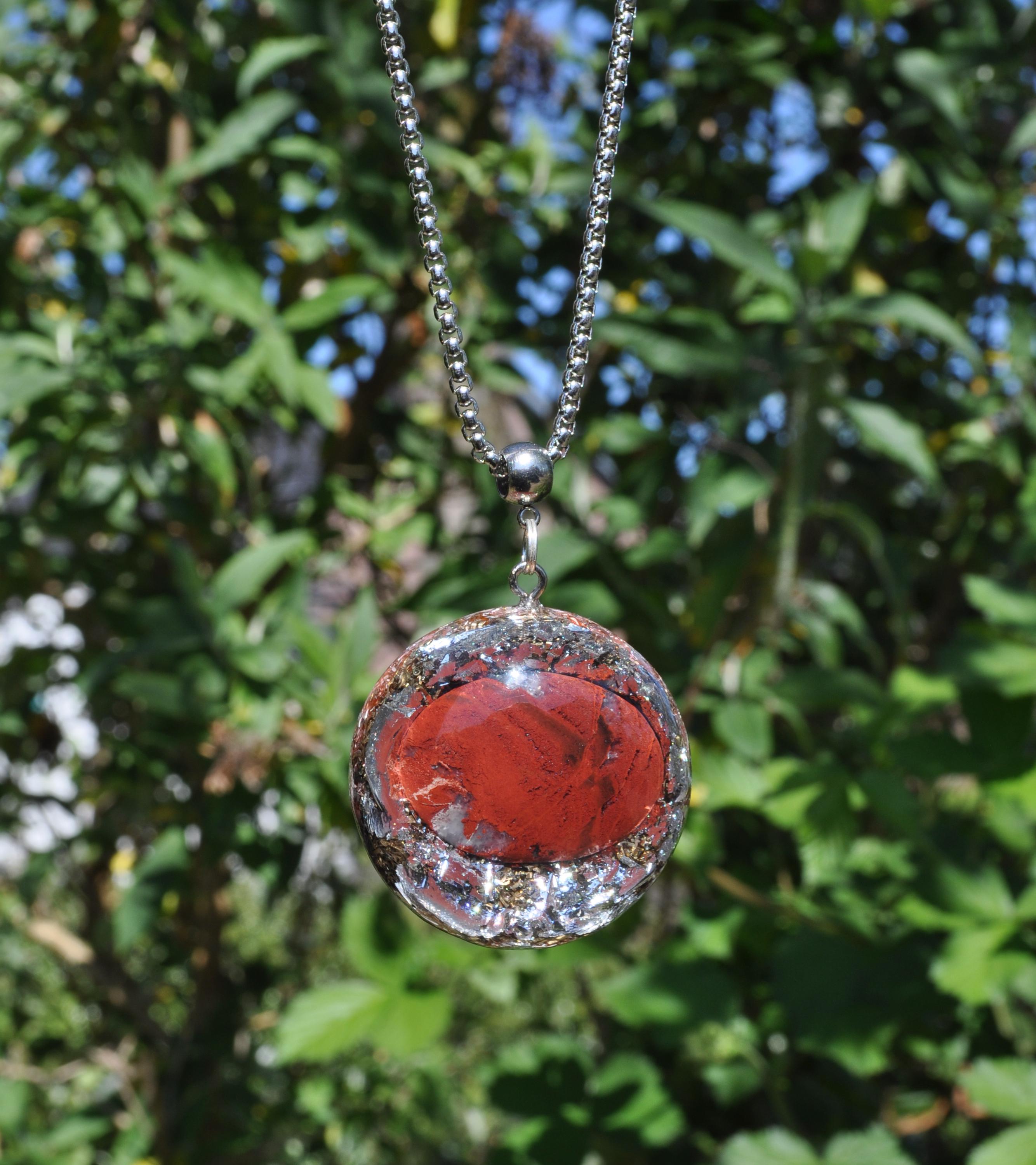 This beautiful handmade pendant, measuring 4.2 cm (1.65 inches) in diameter, is crafted using layered metal shavings and silver leaf, creating a unique orgonite-style energy structure. At its center sits a striking Red Jasper cabochon, carefully shaped and polished from raw stone by lapidarist Stefan. Each piece is individually handcrafted, making every pendant one of a kind.