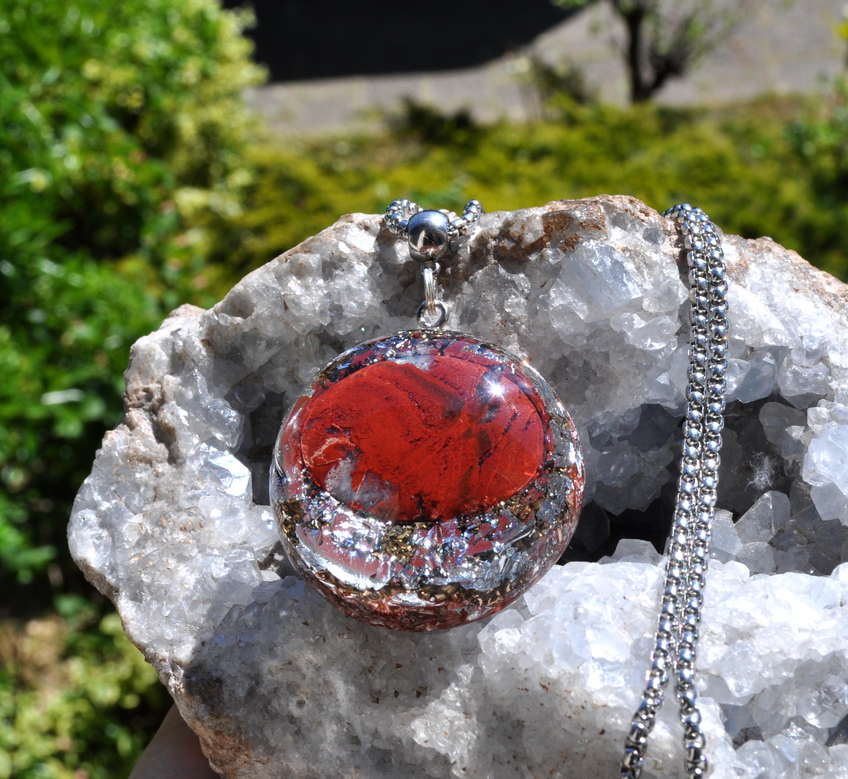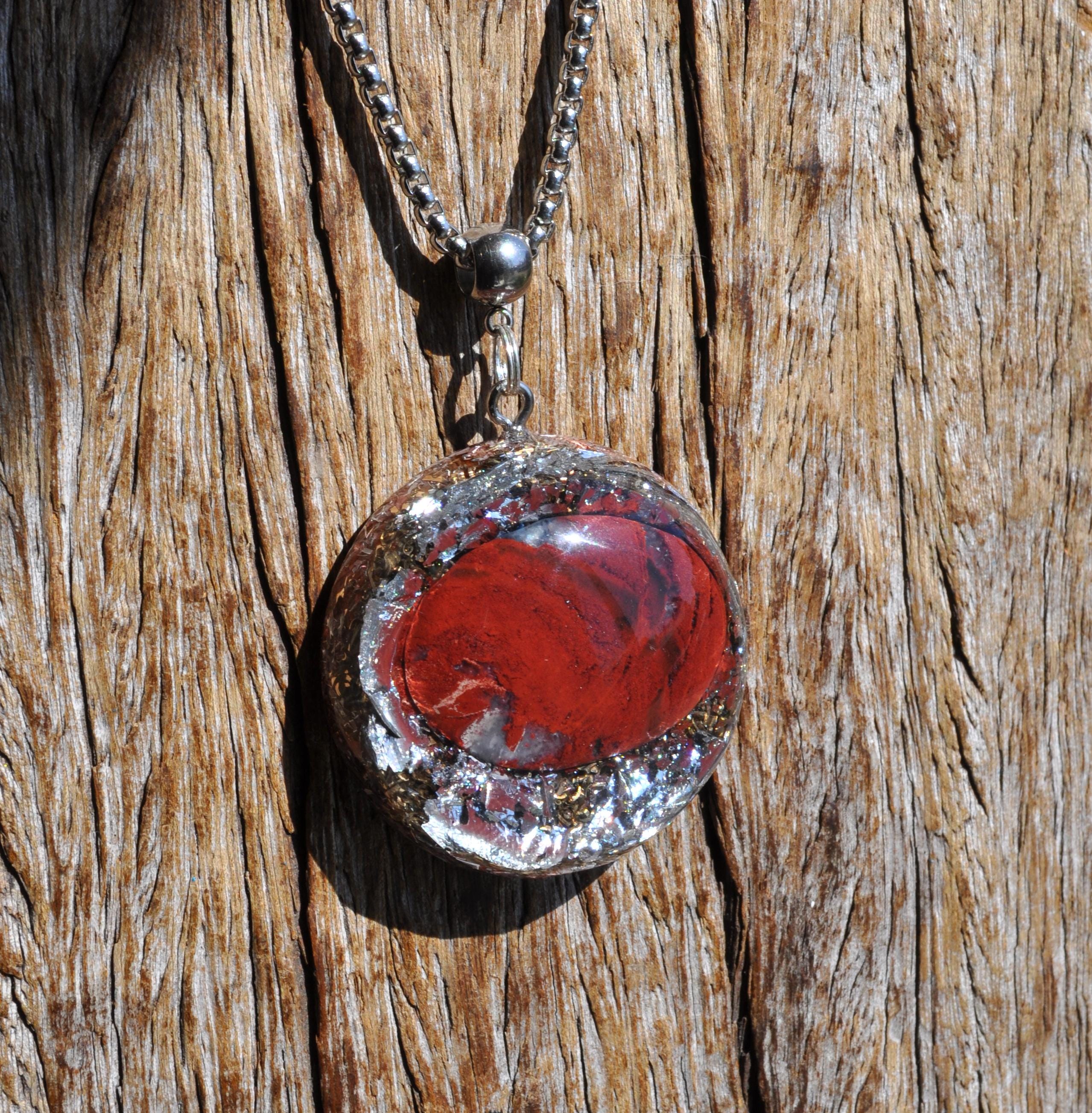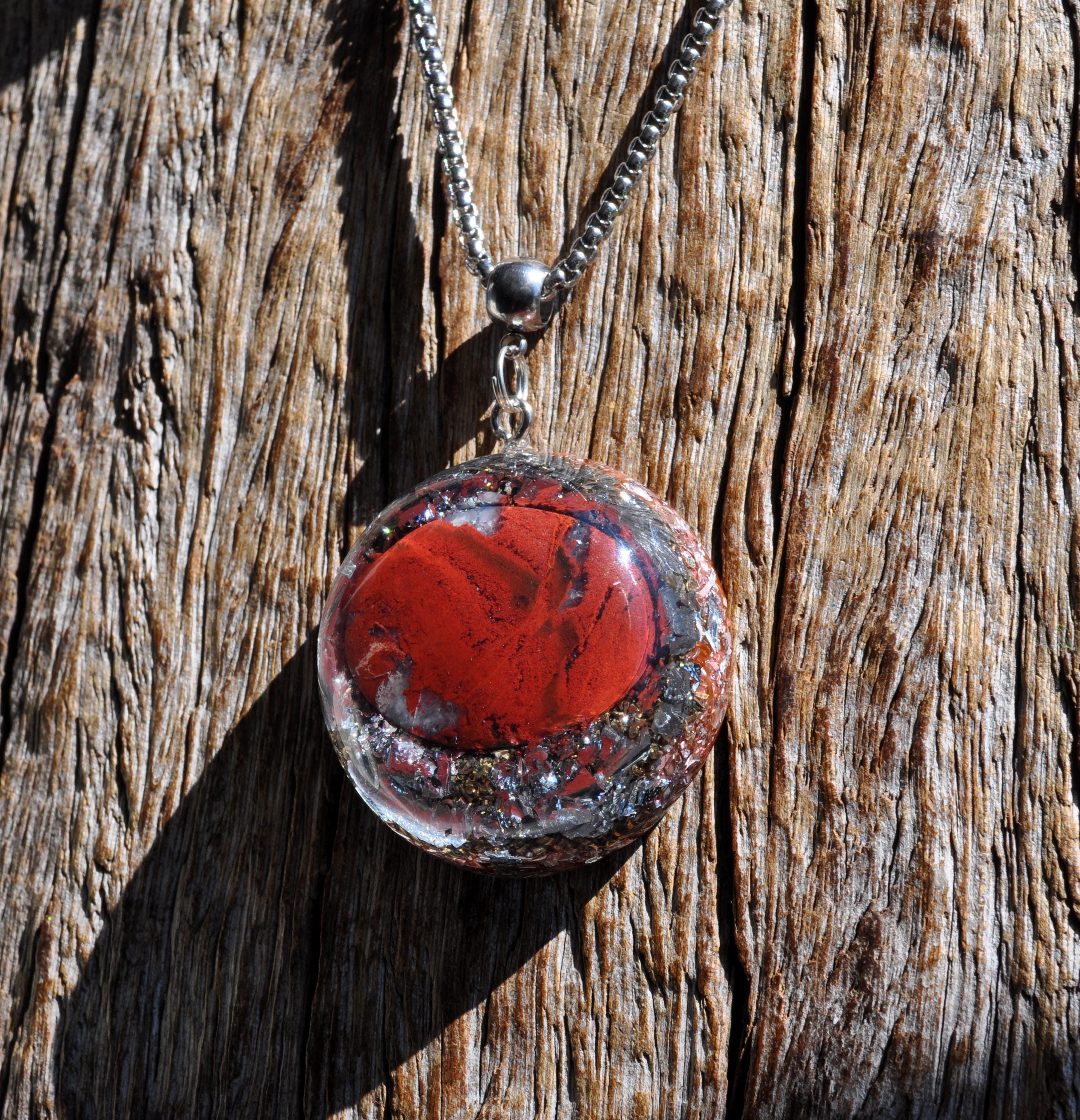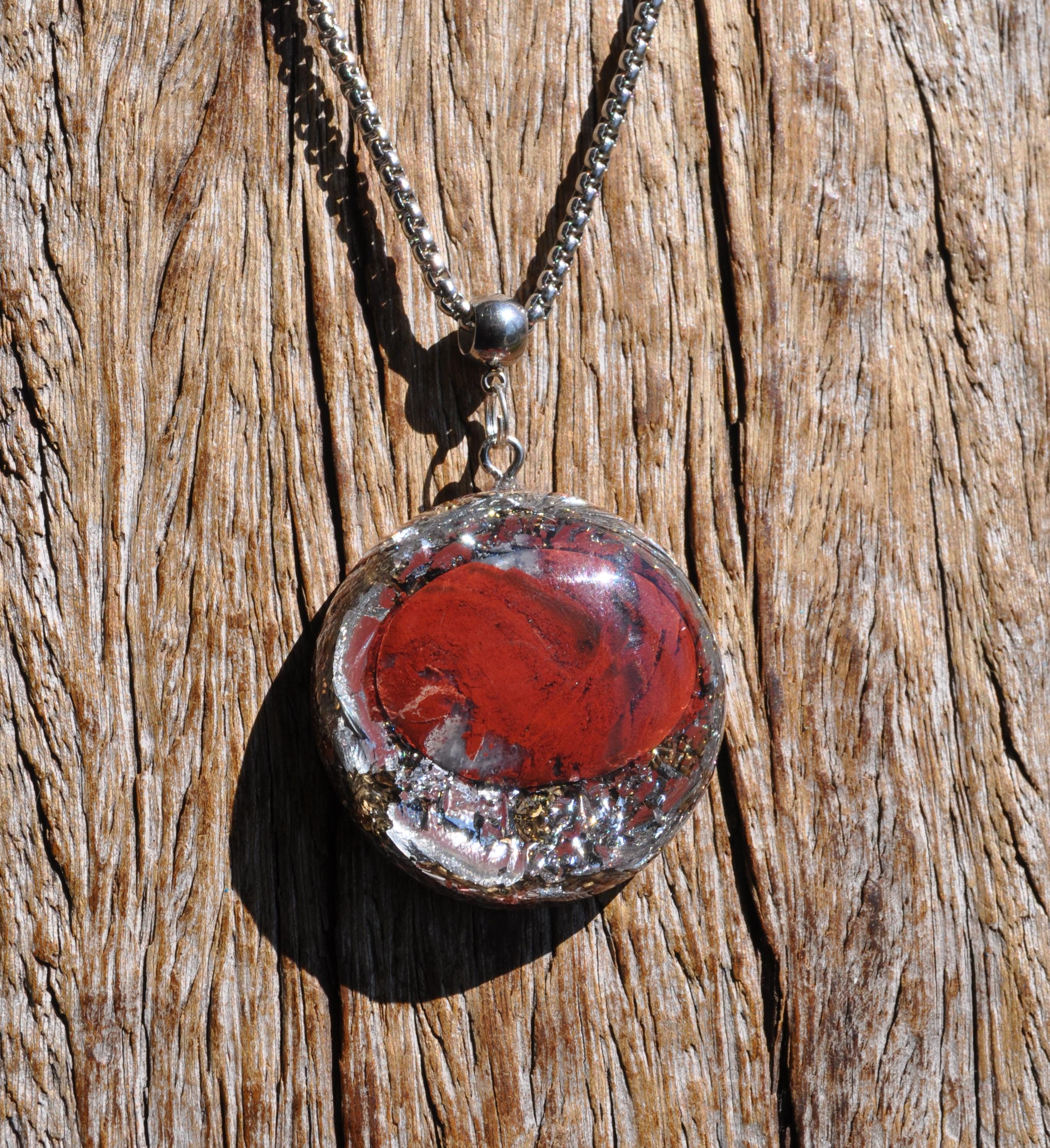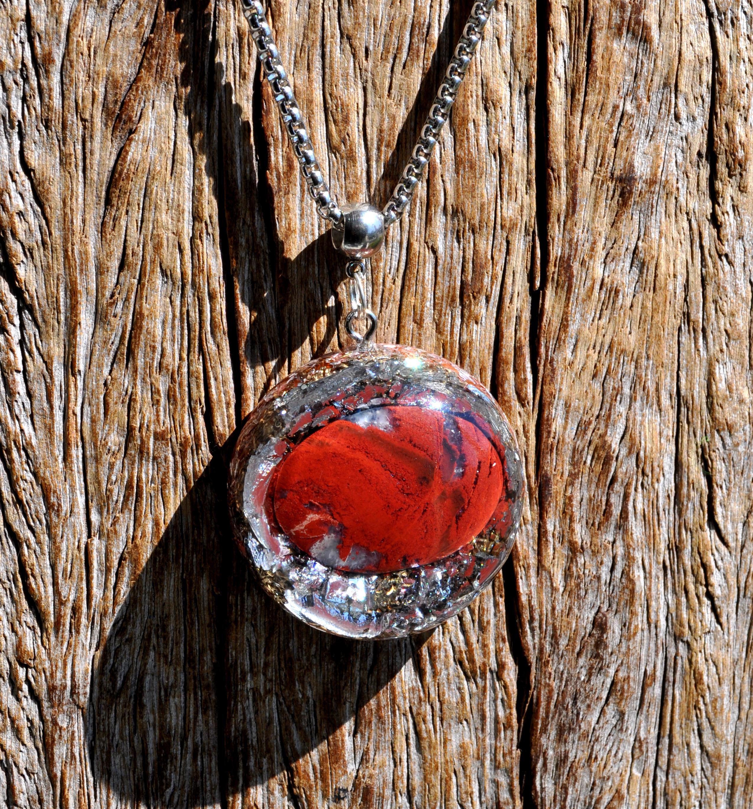This beautiful handmade pendant, measuring 4.2 cm (1.65 inches) in diameter, is crafted using layered metal shavings and silver leaf, creating a unique orgonite-style energy structure. At its center sits a striking Red Jasper cabochon, carefully shaped and polished from raw stone by lapidarist Stefan. Each piece is individually handcrafted, making every pendant one of a kind.