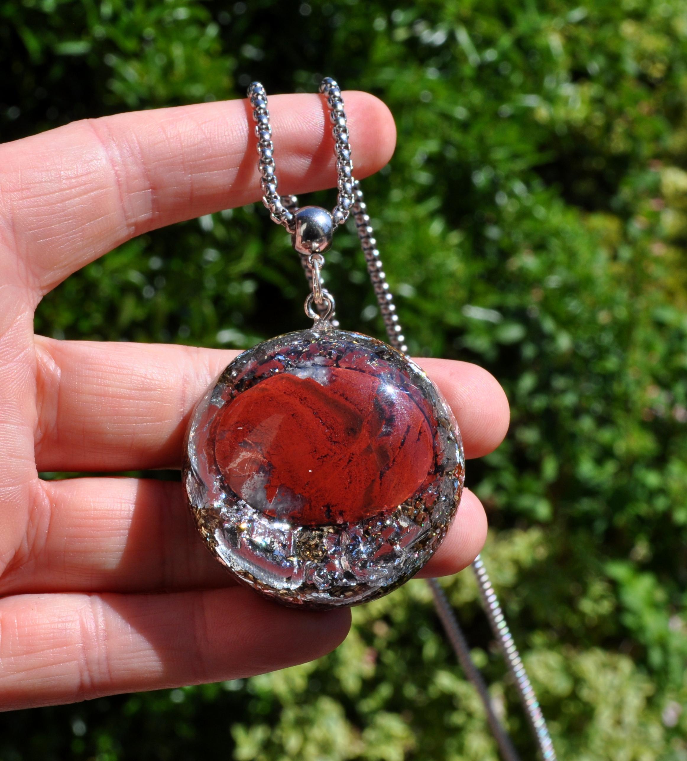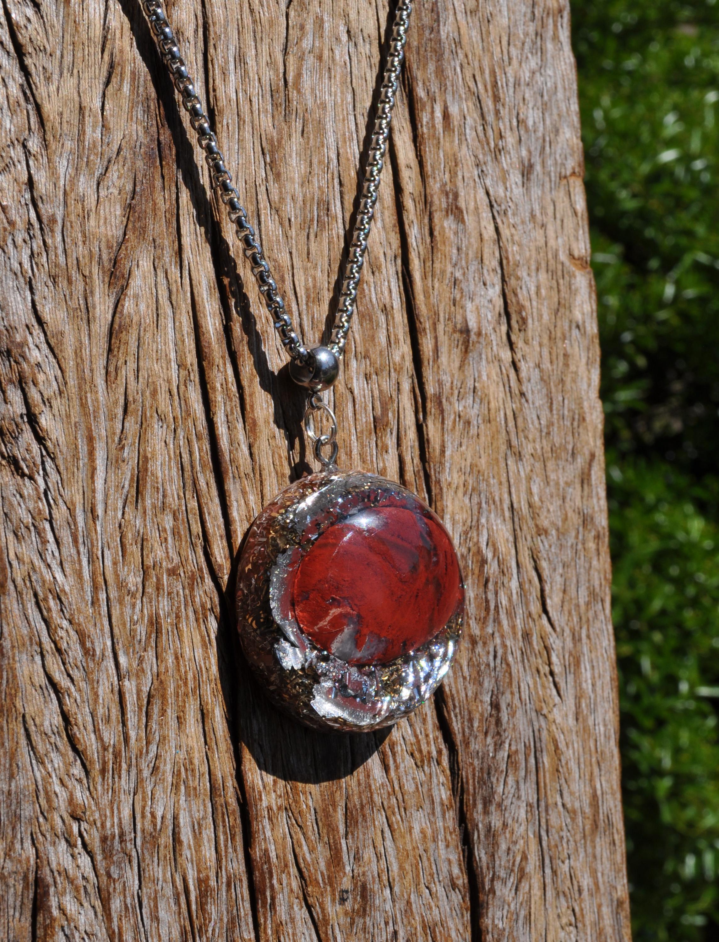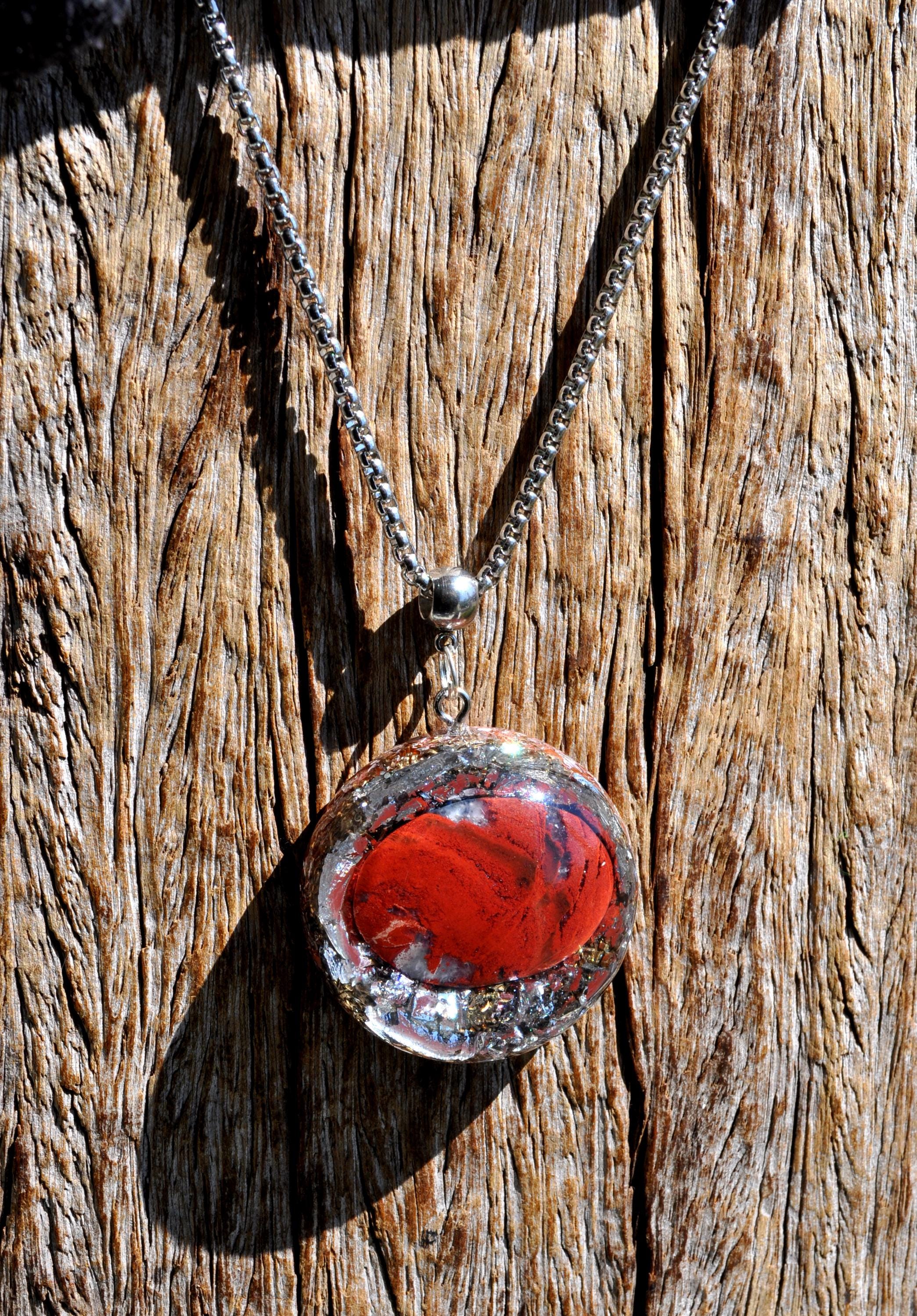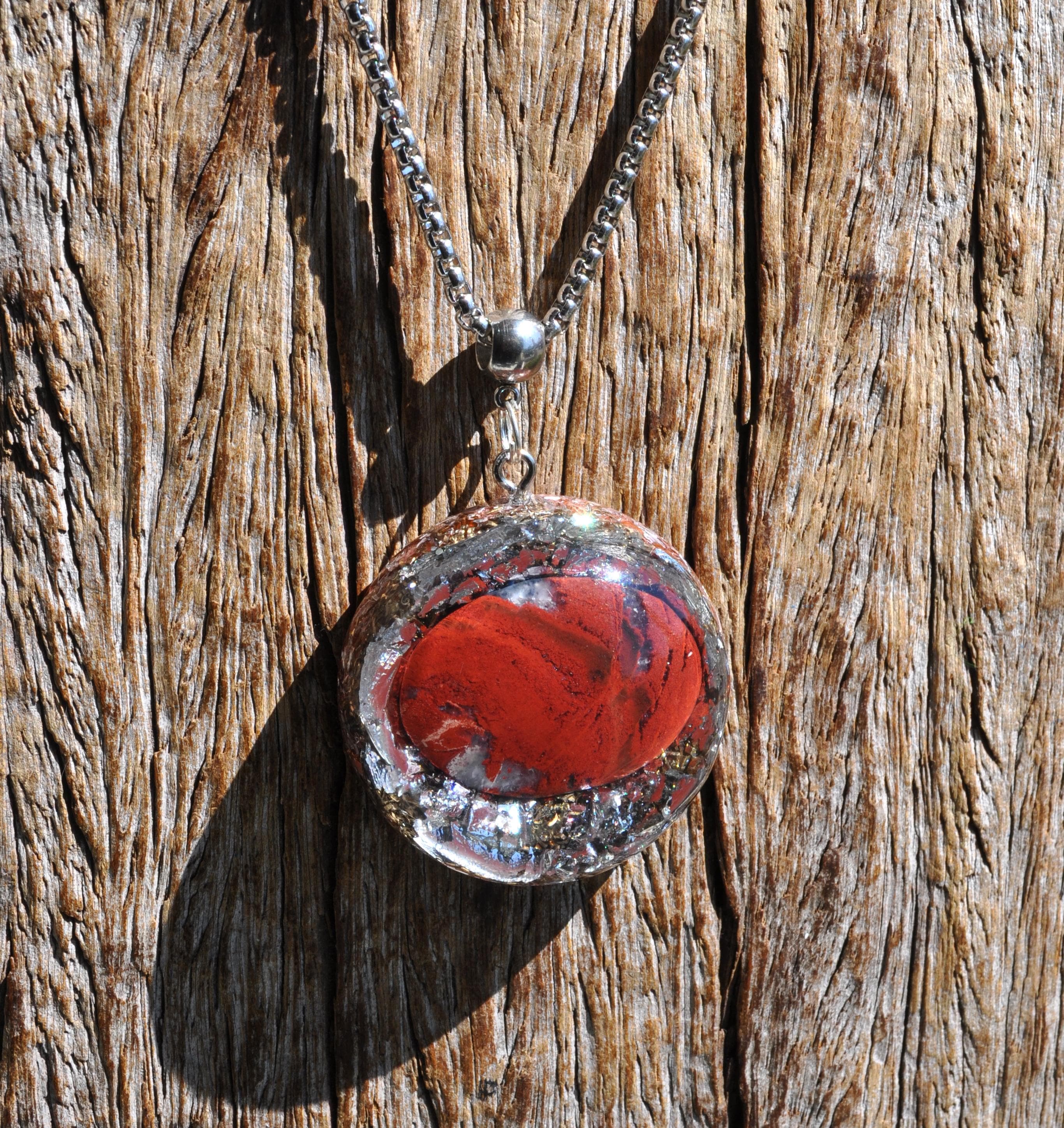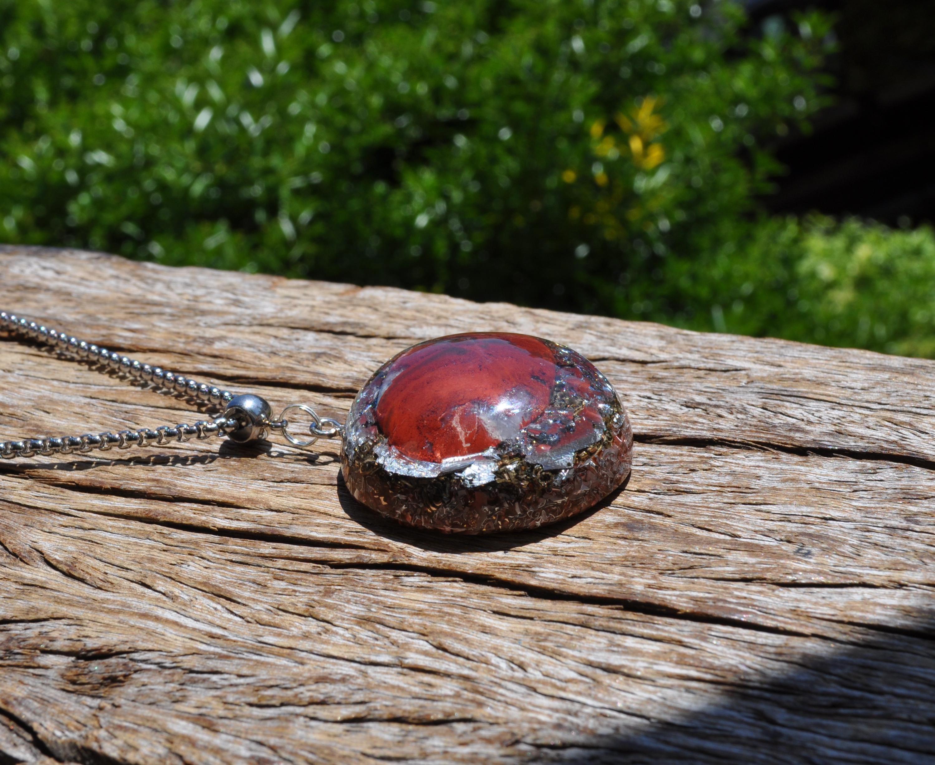 This beautiful handmade pendant, measuring 4.2 cm (1.65 inches) in diameter, is crafted using layered metal shavings and silver leaf, creating a unique orgonite-style energy structure. At its center sits a striking Red Jasper cabochon, carefully shaped and polished from raw stone by lapidarist Stefan. Each piece is individually handcrafted, making every pendant one of a kind.