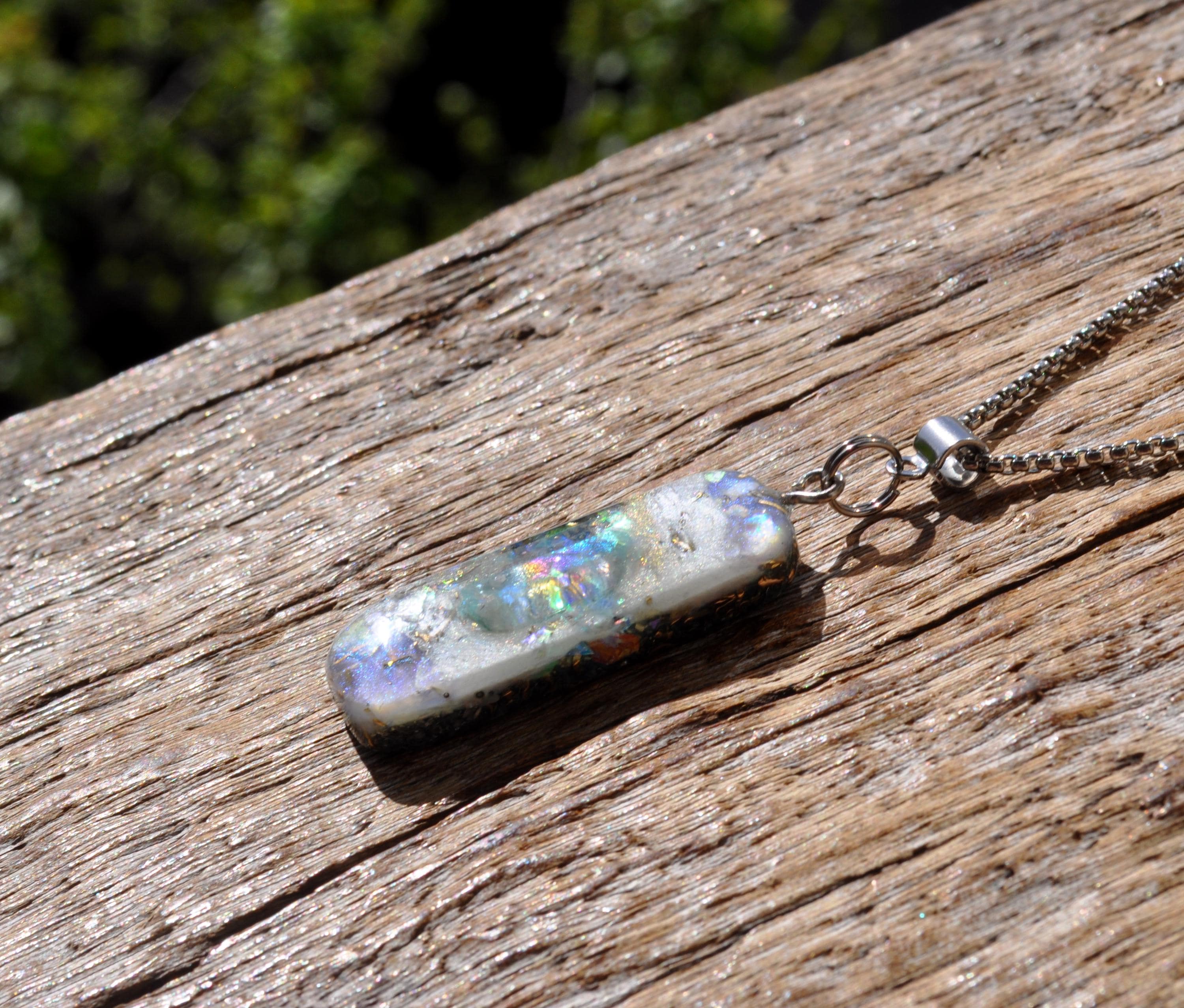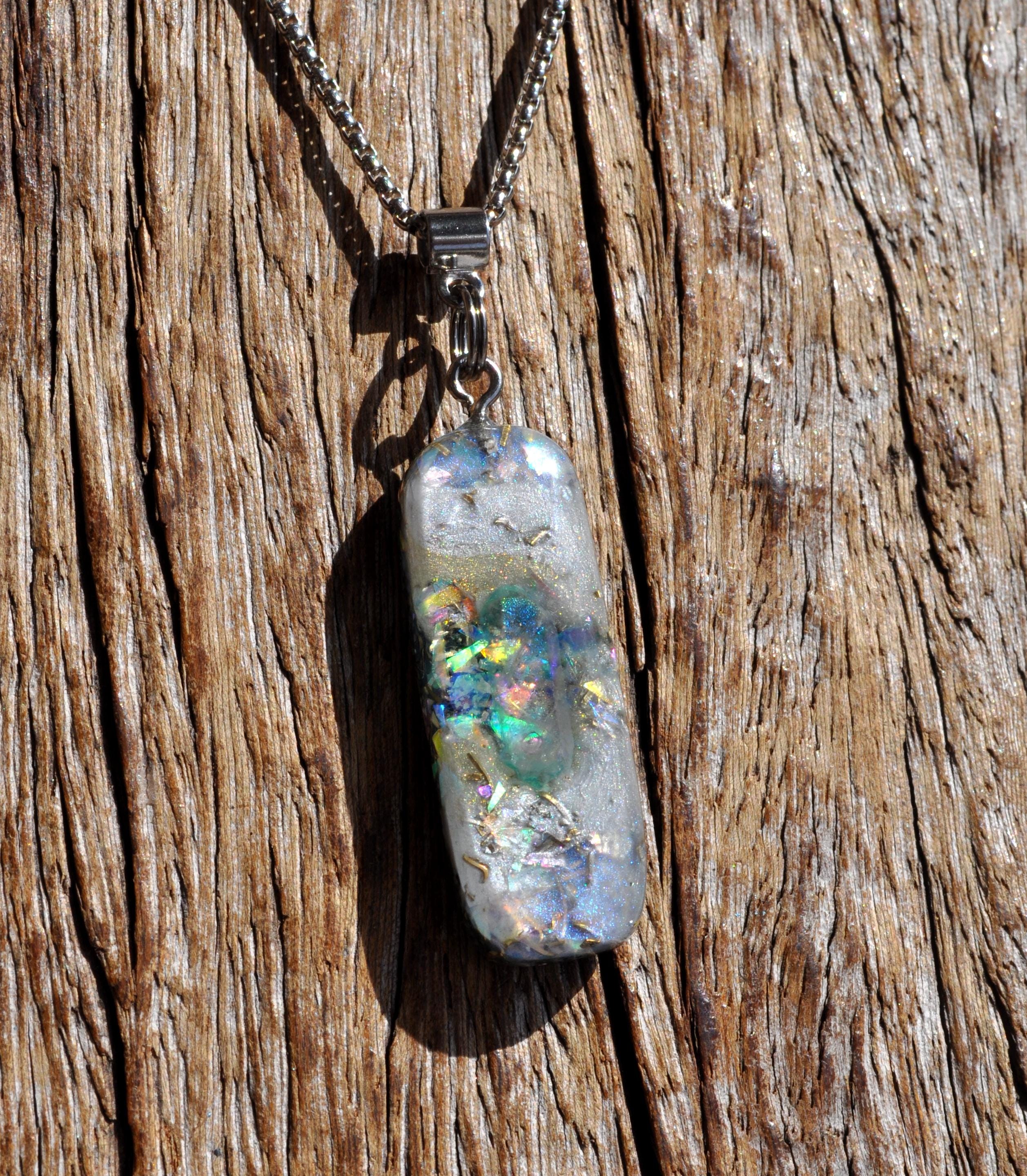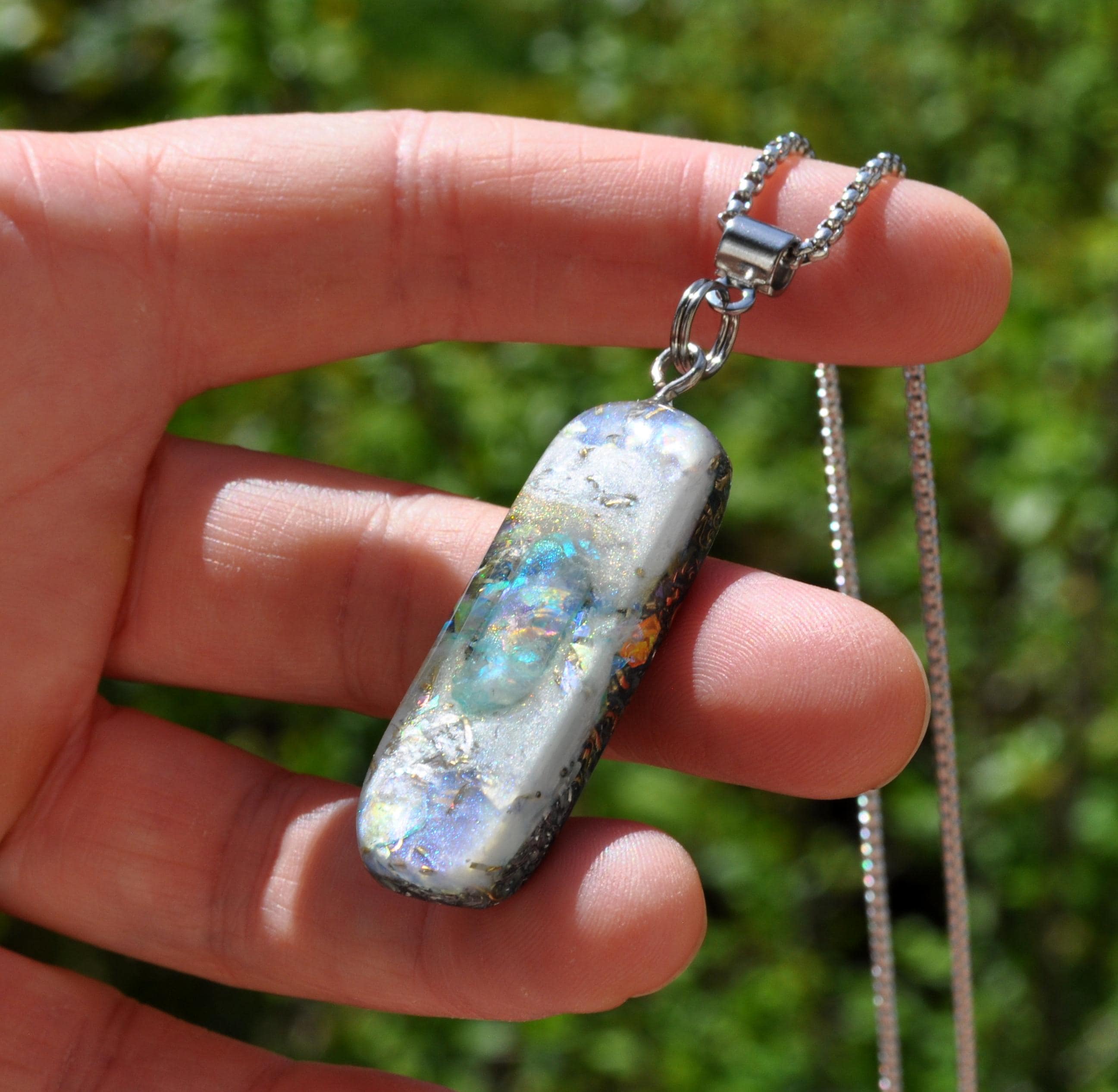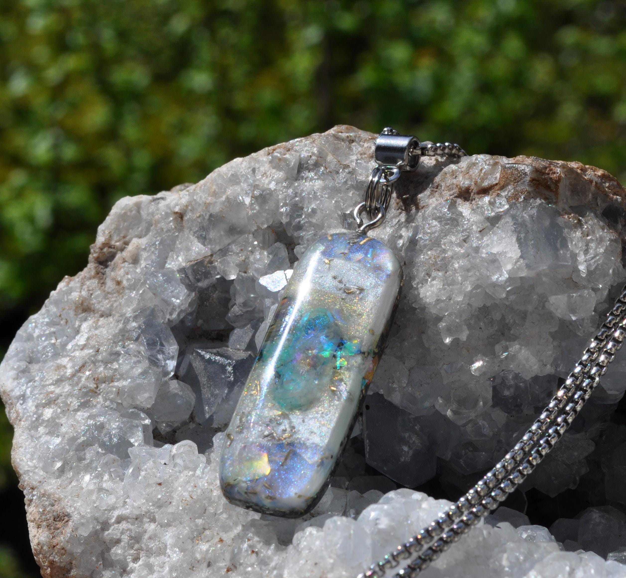 All materials are encased in a durable, high-gloss resin, hand-sanded and polished to a silky-smooth finish. The pendant follows a 50/50 resin-to-metal ratio, a classic orgonite design inspired by early orgone research.