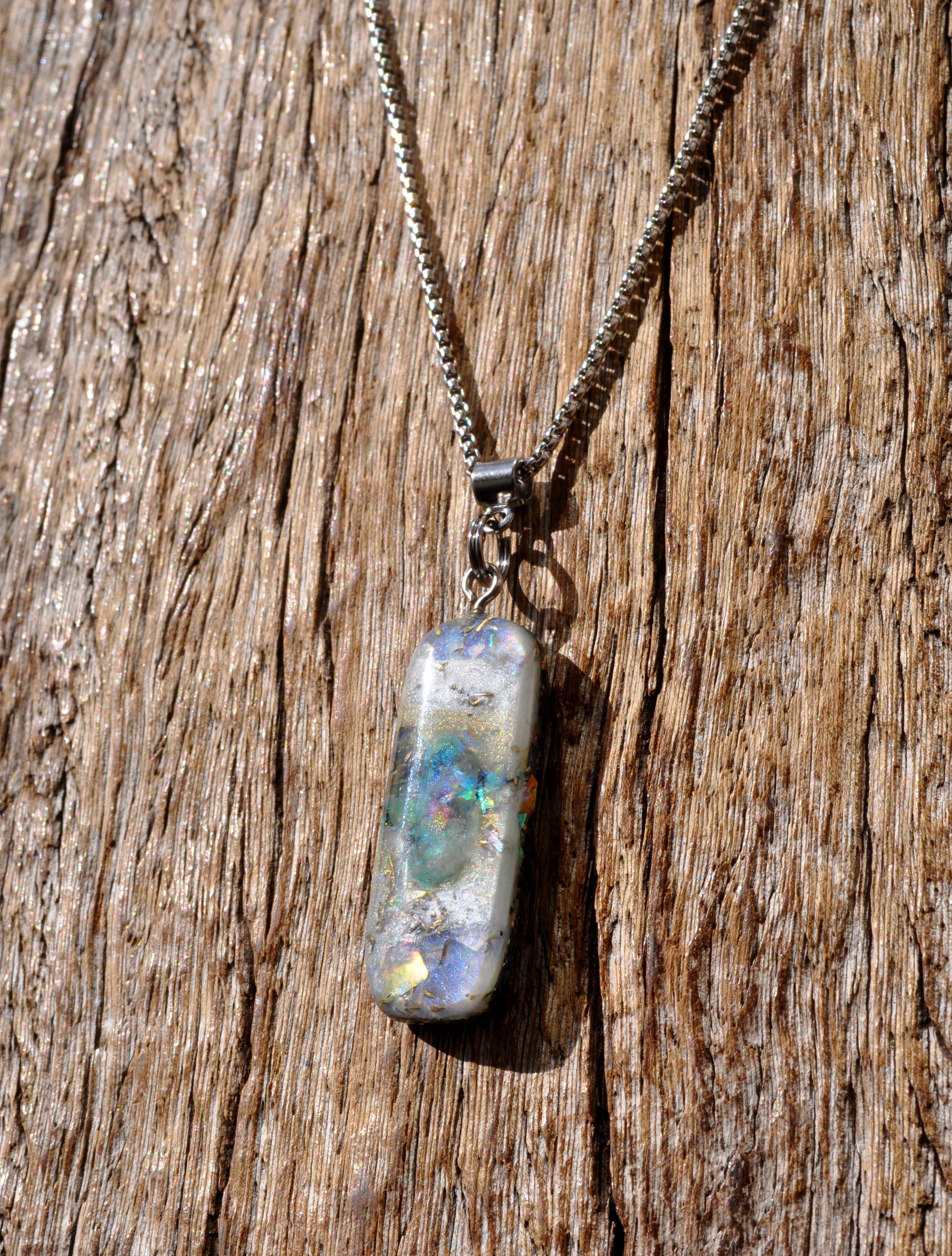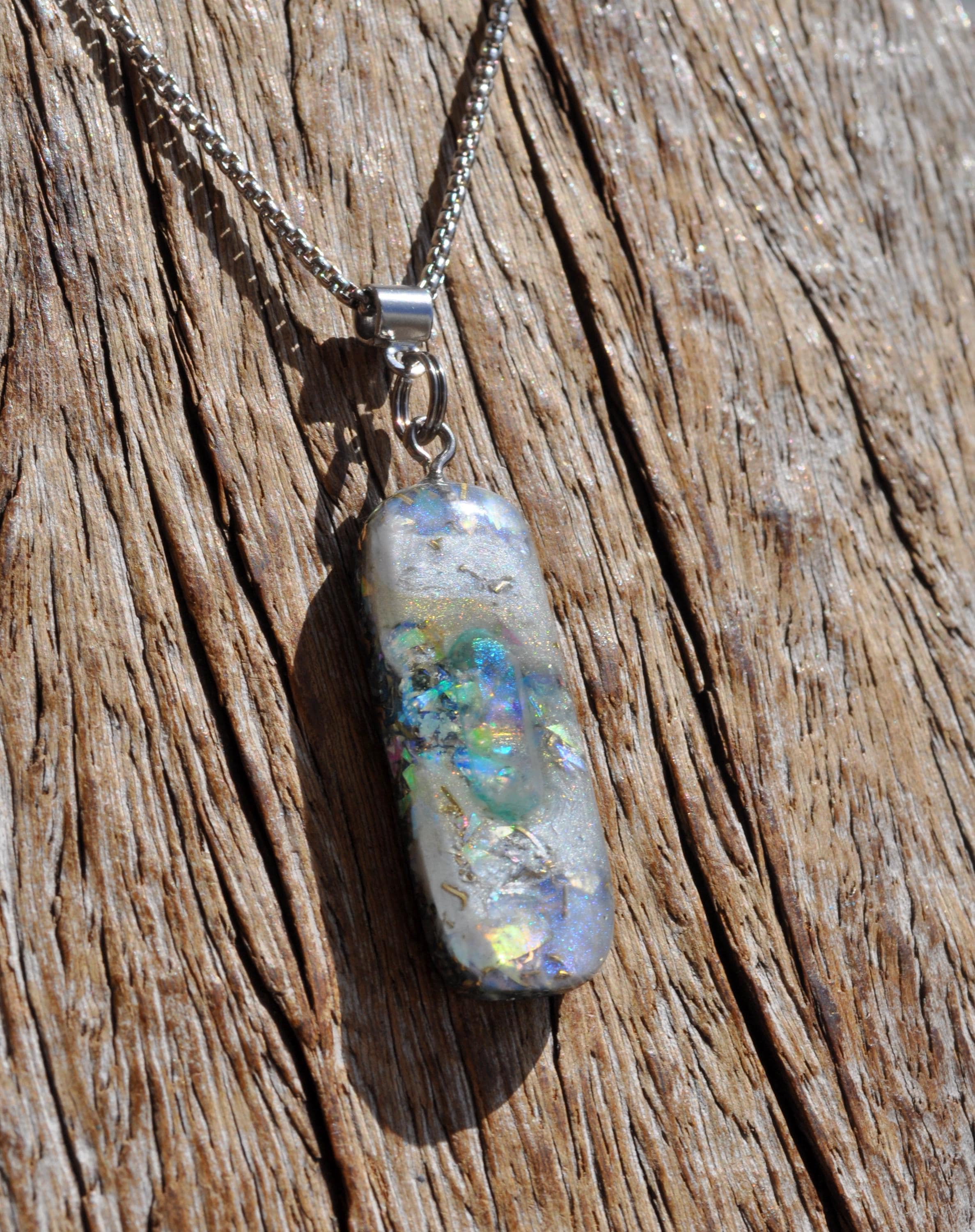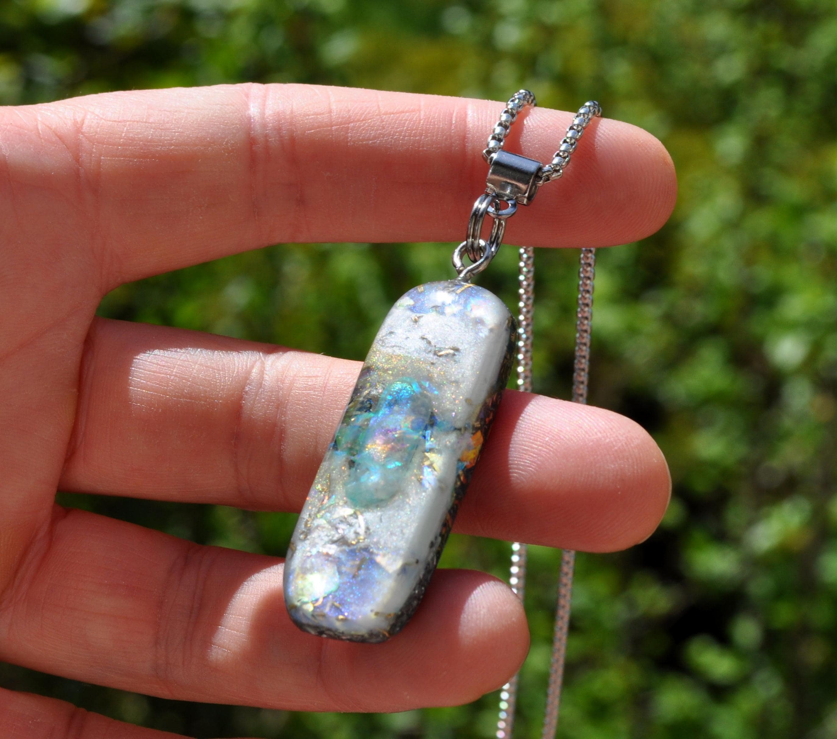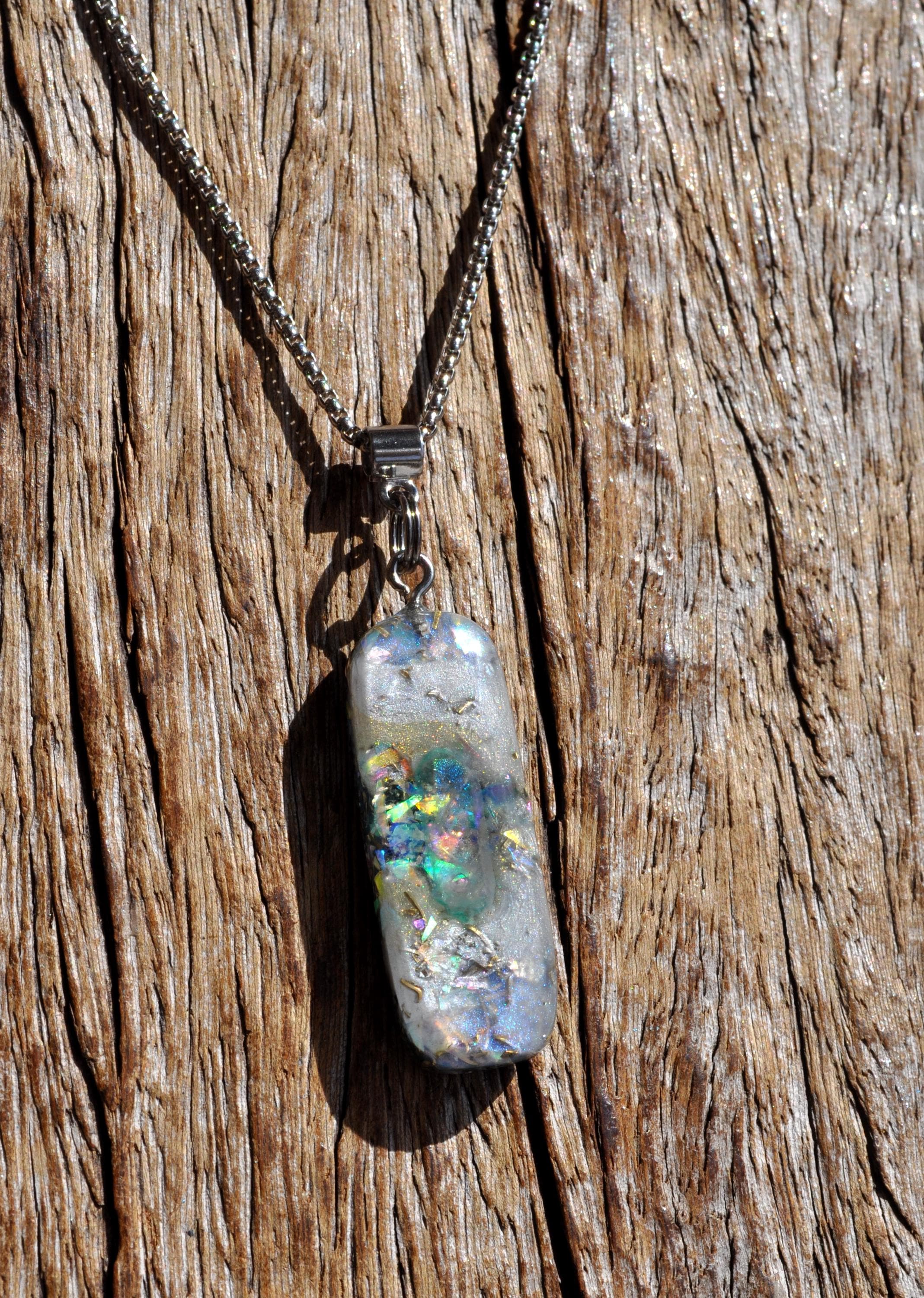 All materials are encased in a durable, high-gloss resin, hand-sanded and polished to a silky-smooth finish. The pendant follows a 50/50 resin-to-metal ratio, a classic orgonite design inspired by early orgone research.