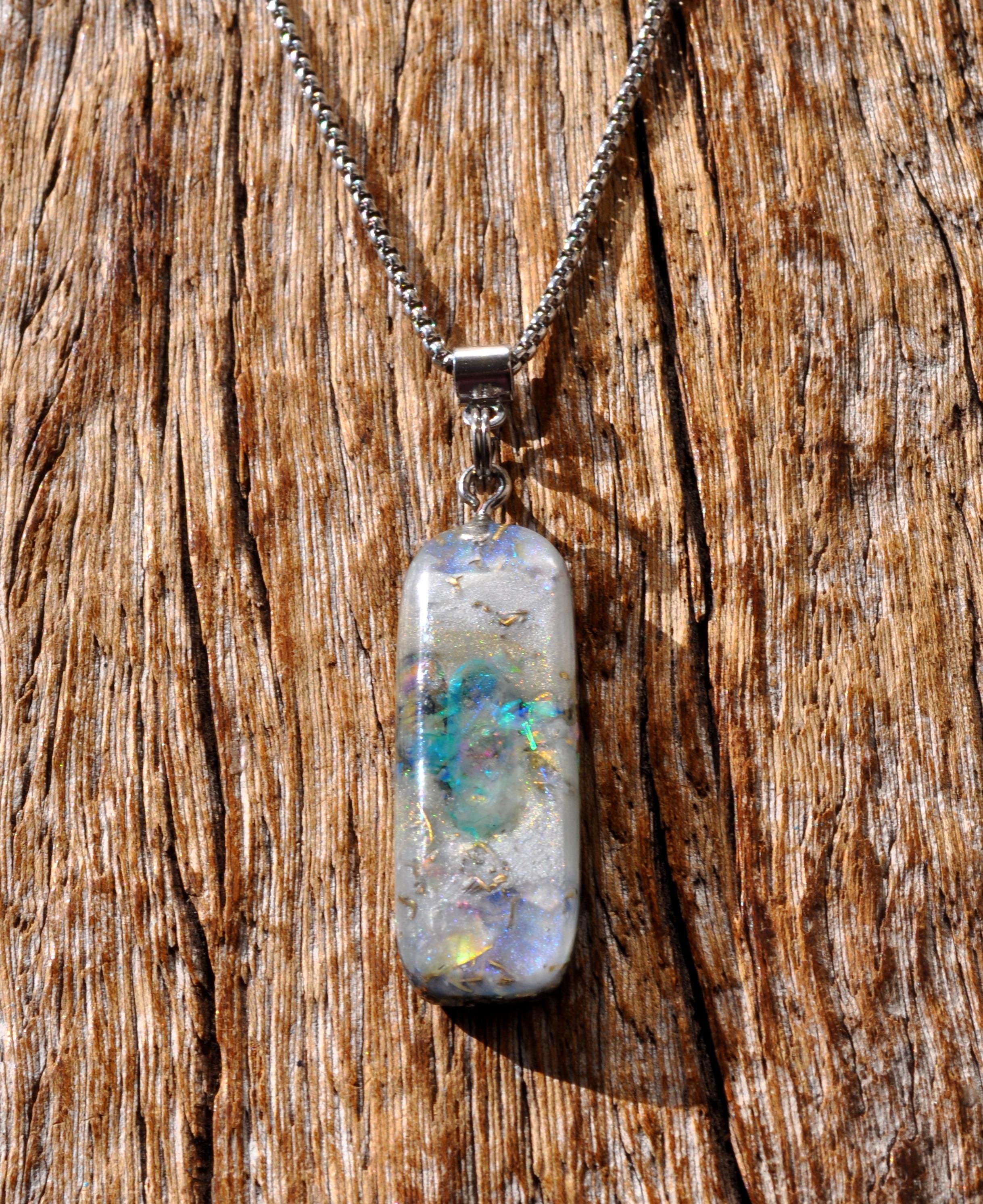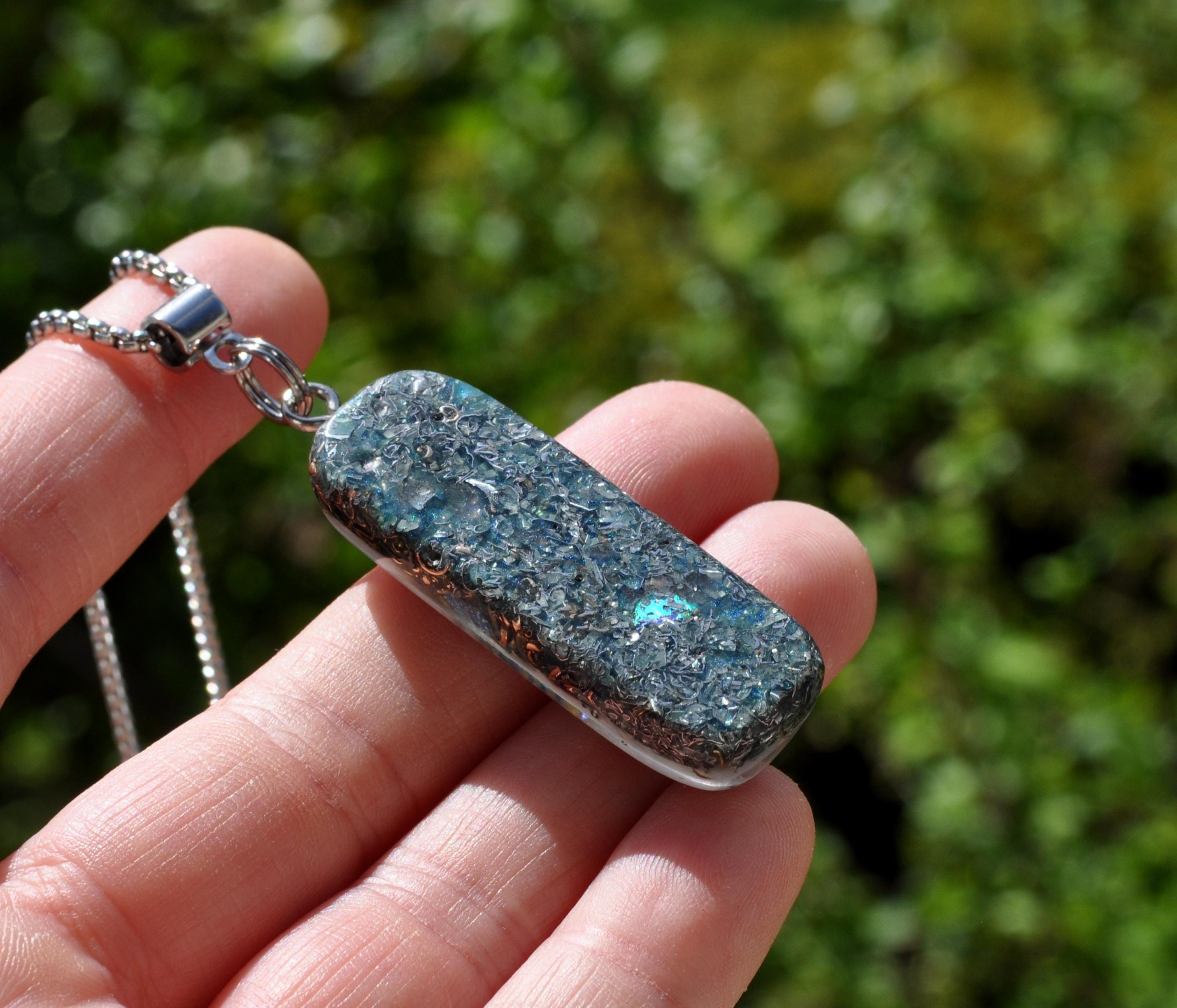 A unique handmade Orgonite® pendant with a striking Aqua Aura Quartz focal point