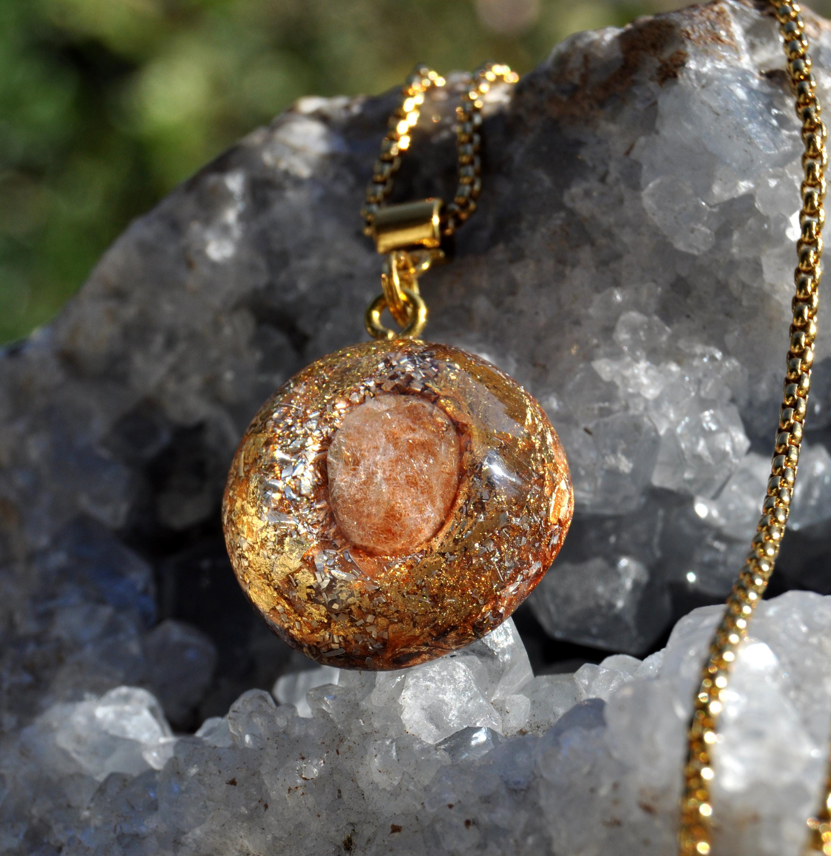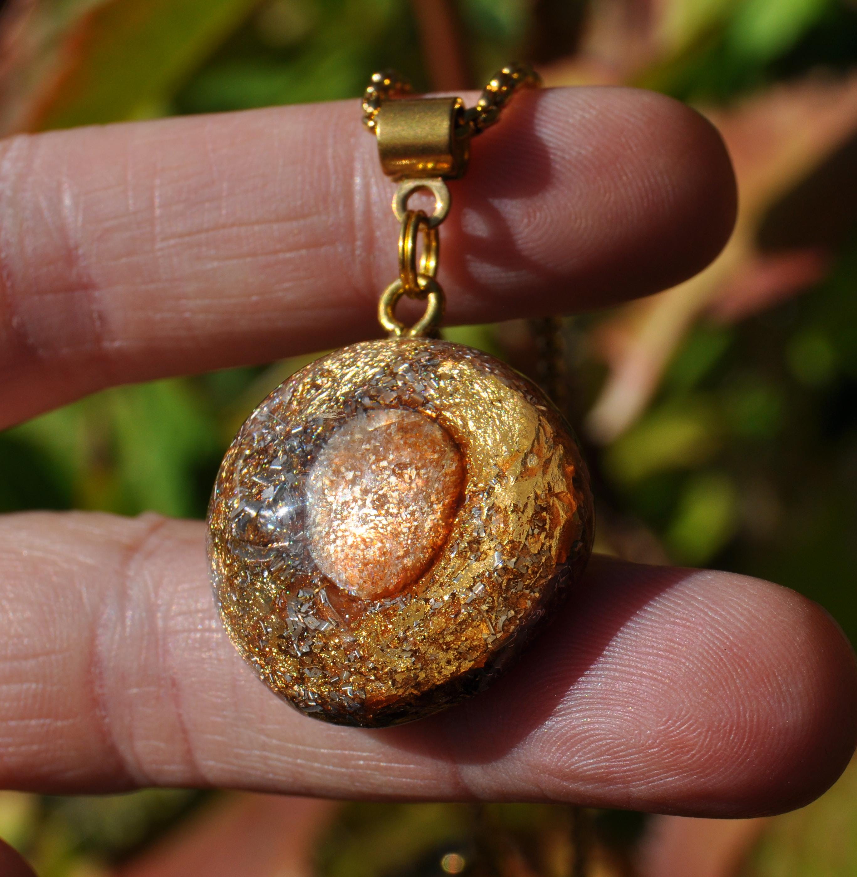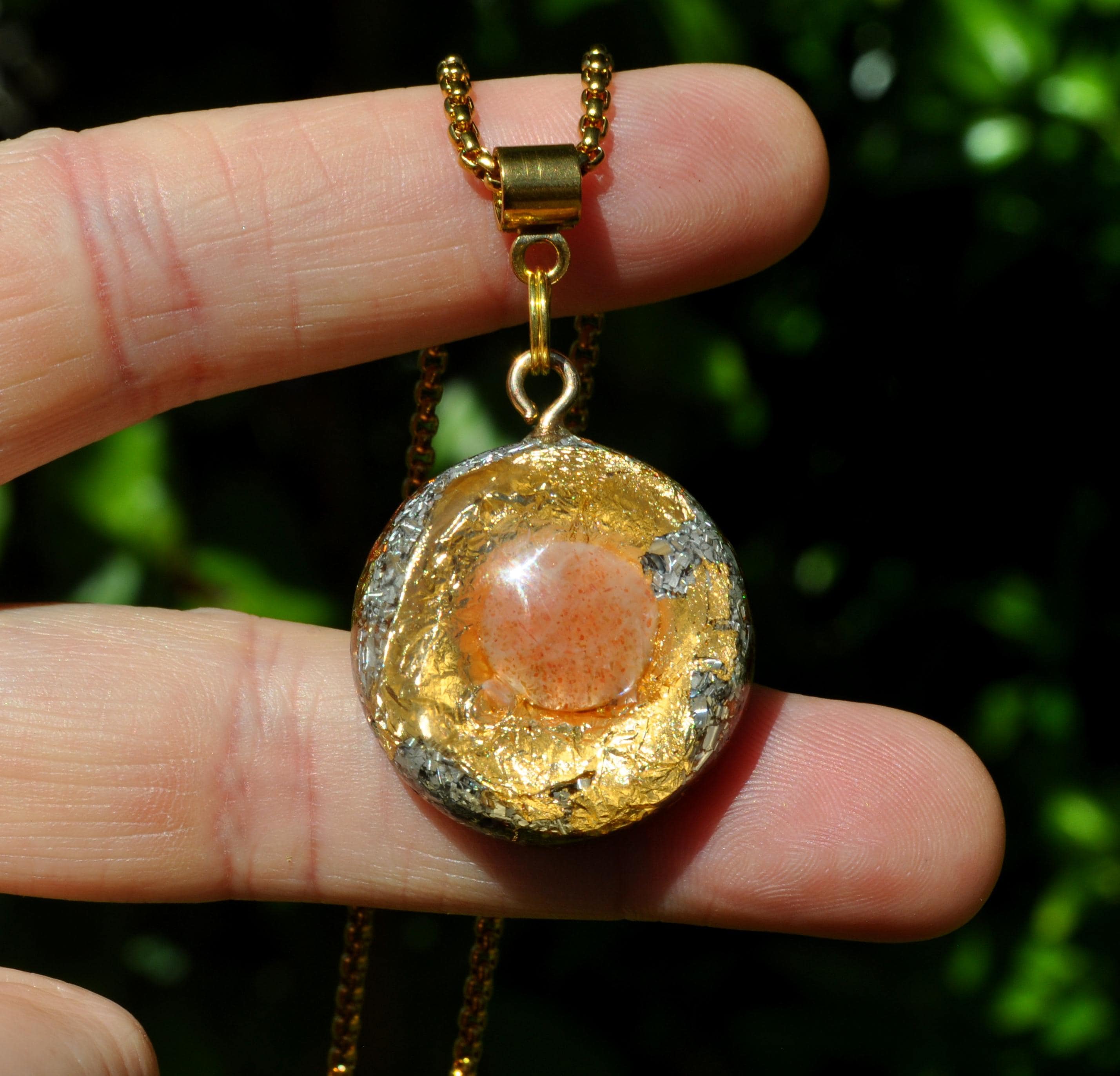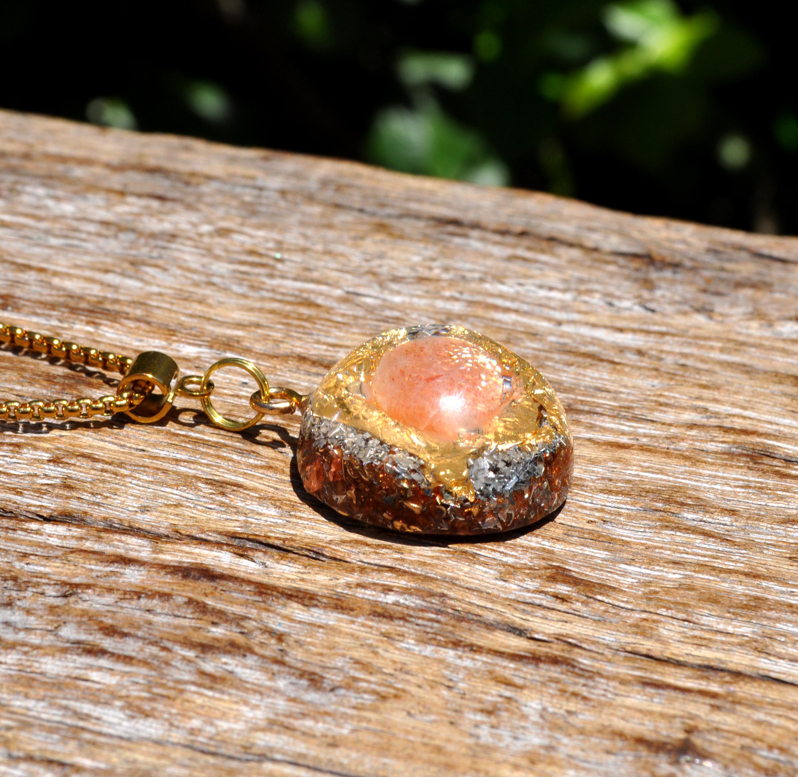Crafted from a harmonious blend of brass, aluminum, and copper shavings encased in durable polyester resin, this pendant embodies the principles of Wilhelm Reich's research on orgone energy. At its core, it features a polished Sunstone, revered for its ability to invoke vitality and positivity. Each component within this pendant serves a purpose: Pyrite for energizing, Rhodizite for amplification, Black Tourmaline for protection, Selenite for cleansing, and Clear Quartz for its powerful piezoelectric effect.