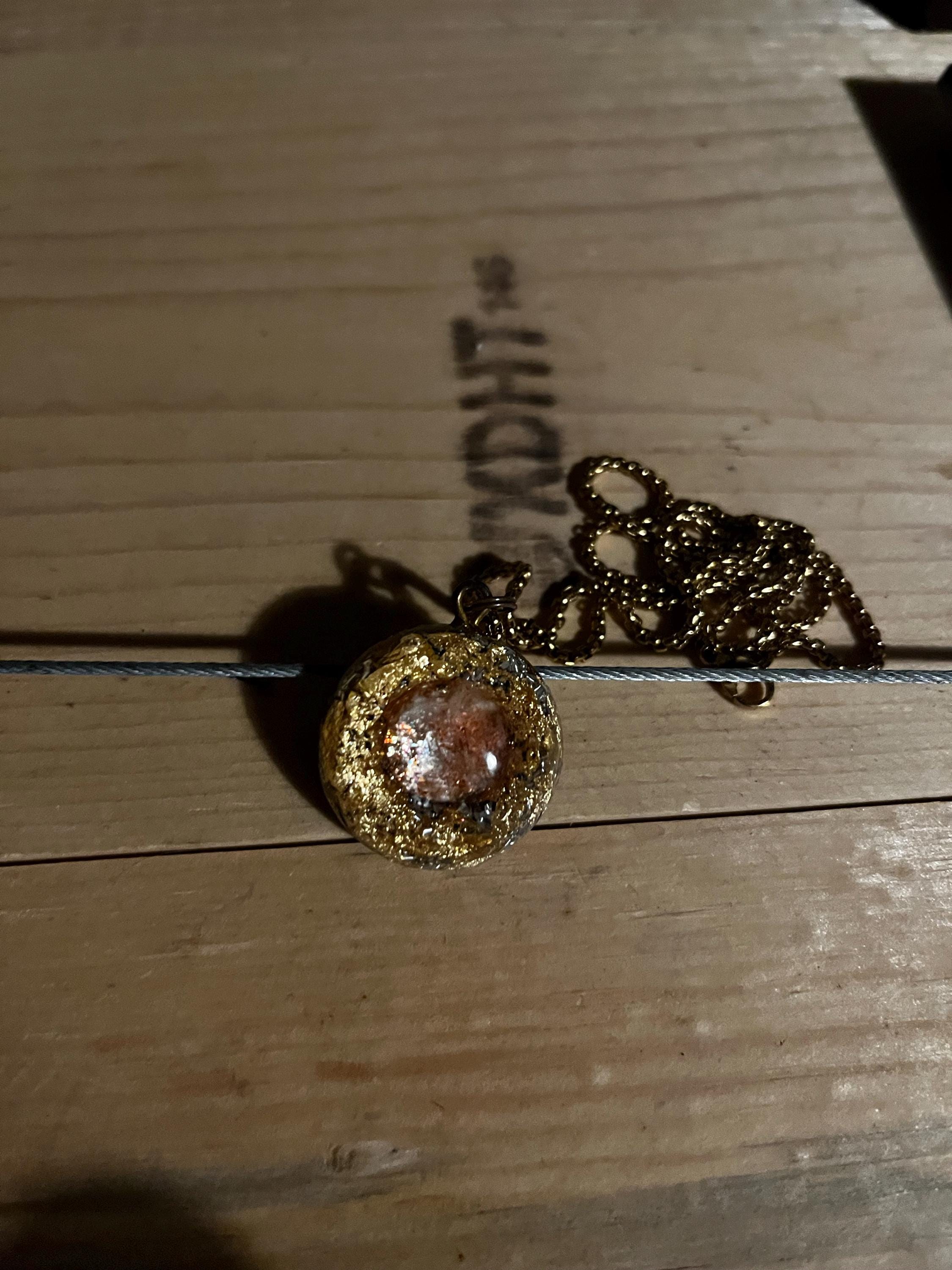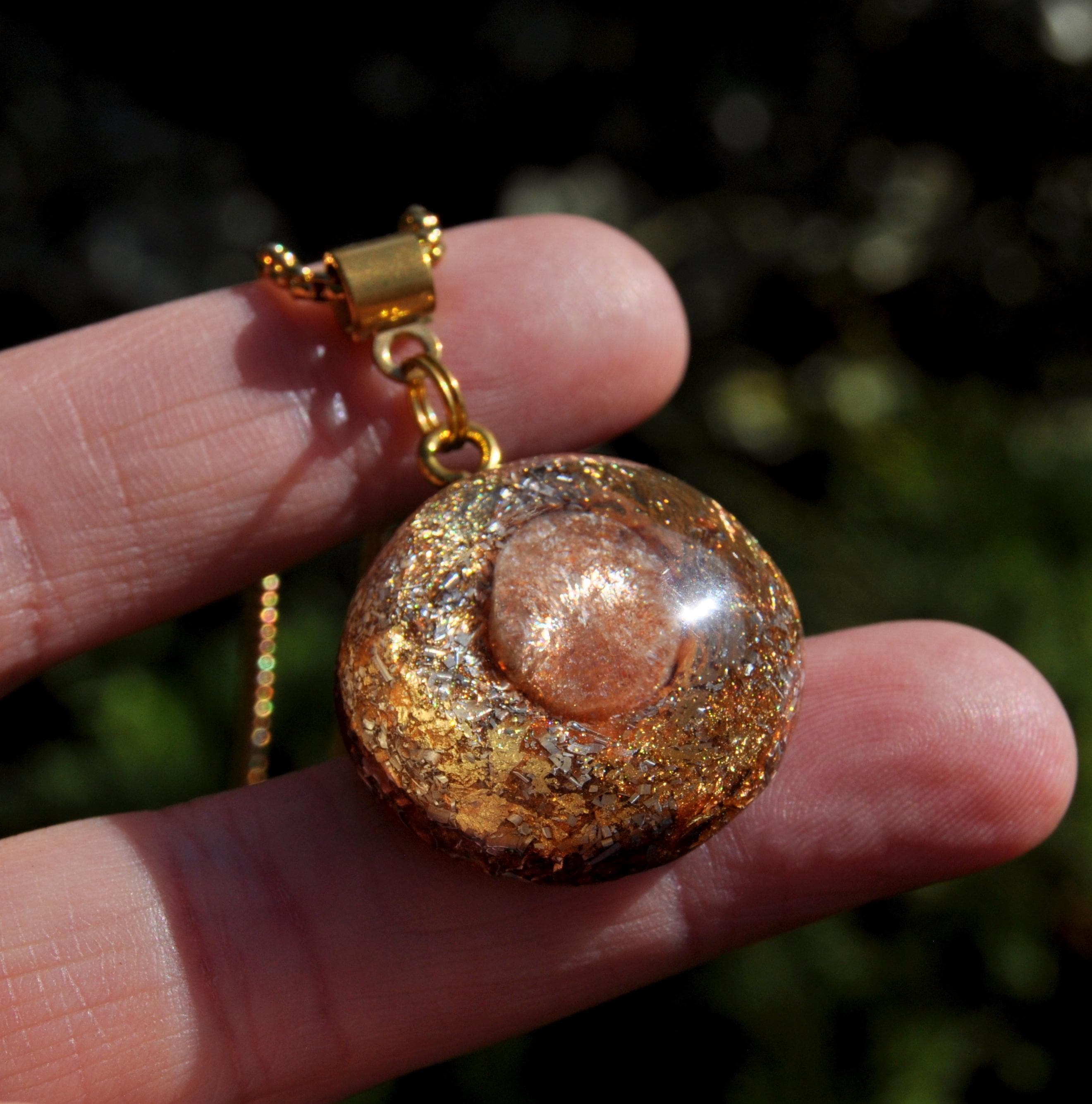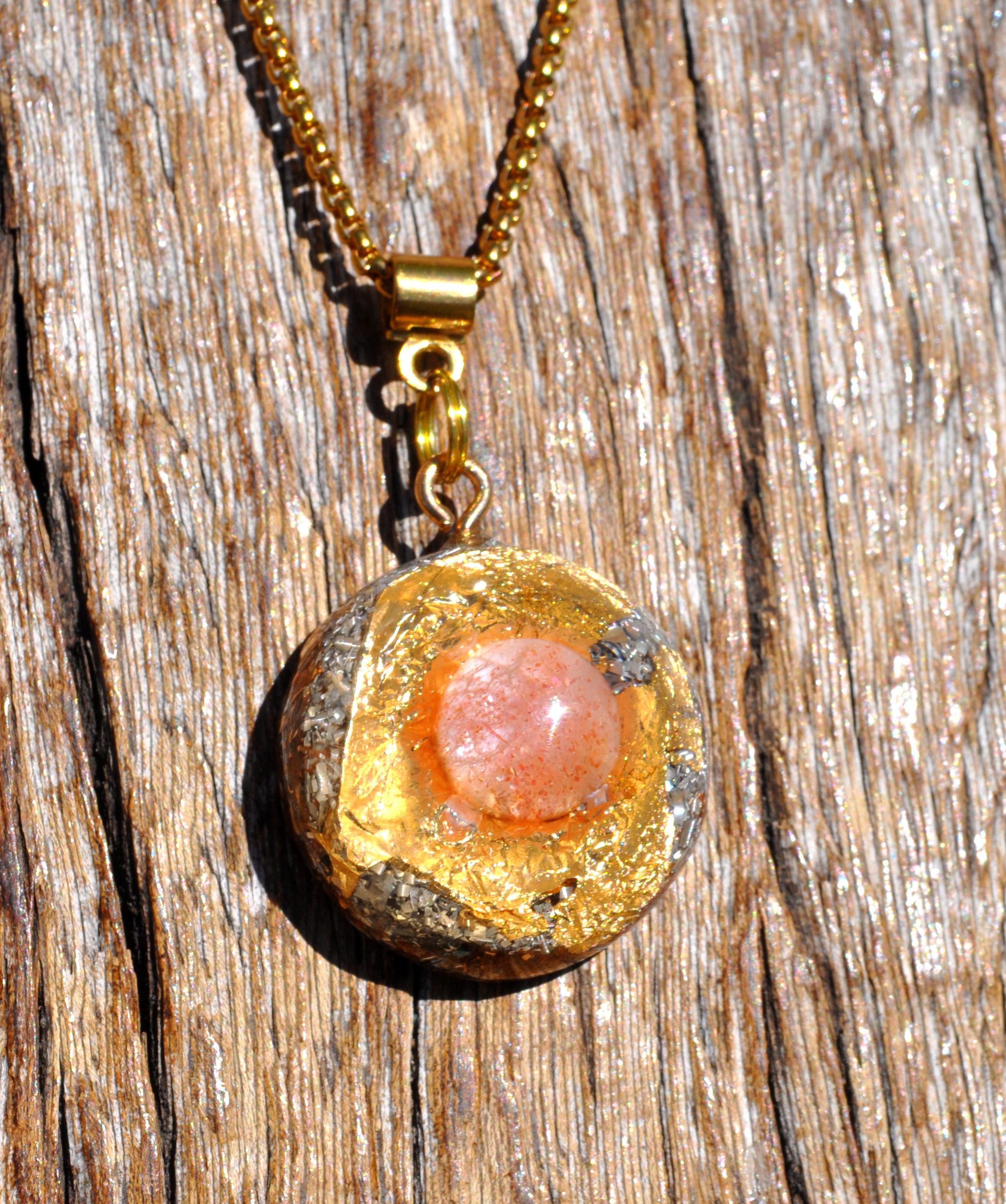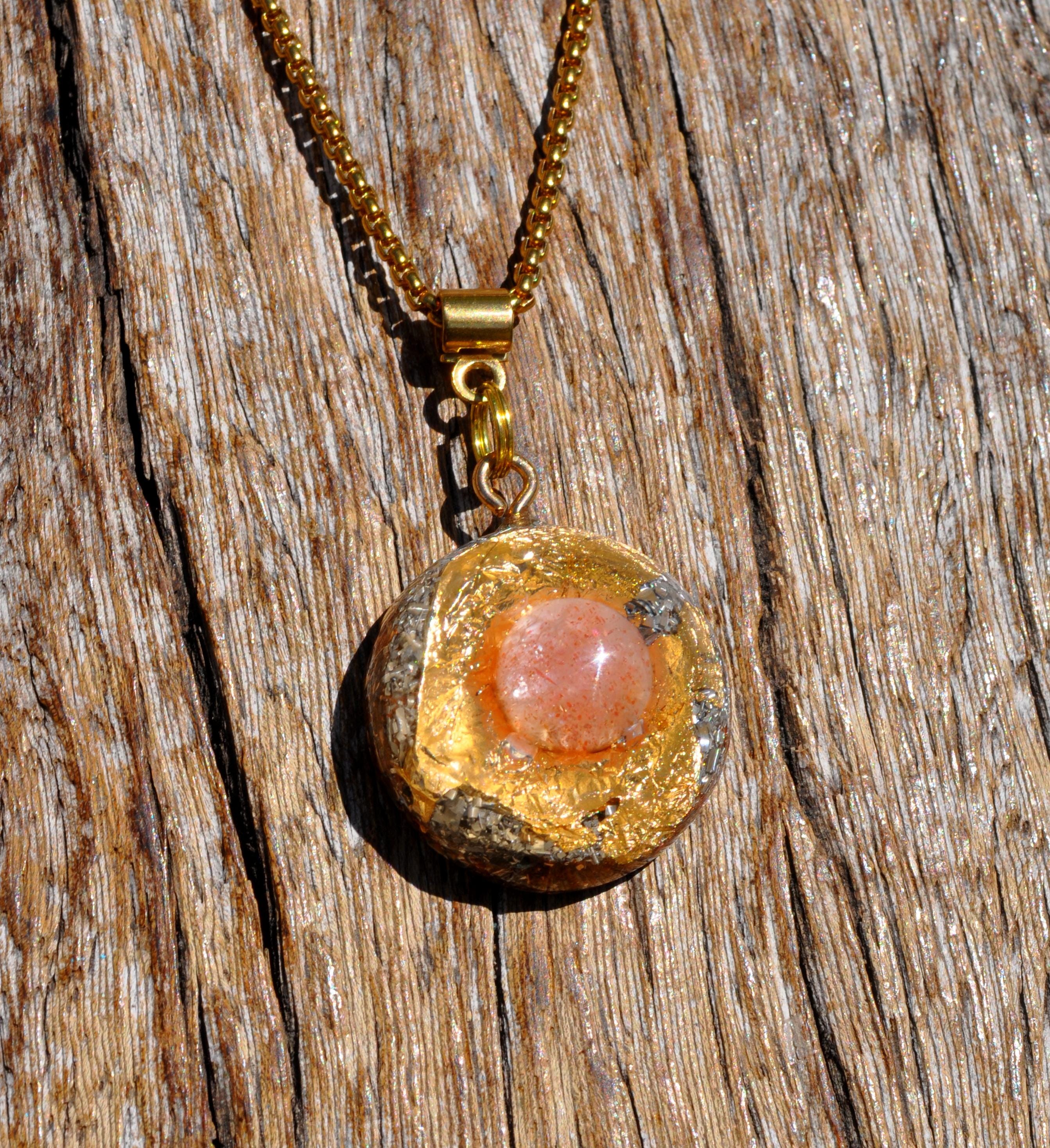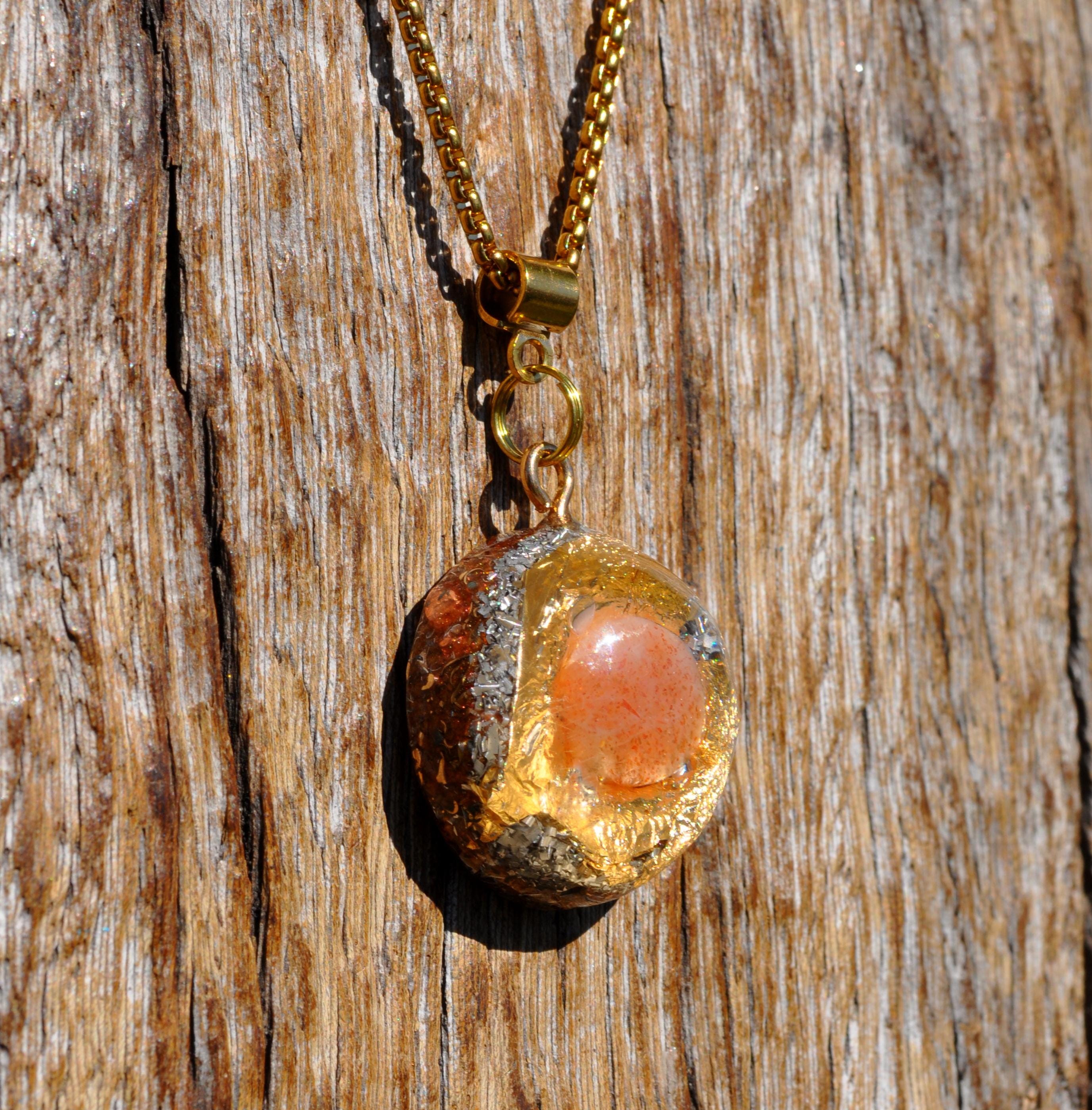 Crafted from a harmonious blend of brass, aluminum, and copper shavings encased in durable polyester resin, this pendant embodies the principles of Wilhelm Reich's research on orgone energy. At its core, it features a polished Sunstone, revered for its ability to invoke vitality and positivity. Each component within this pendant serves a purpose: Pyrite for energizing, Rhodizite for amplification, Black Tourmaline for protection, Selenite for cleansing, and Clear Quartz for its powerful piezoelectric effect.
