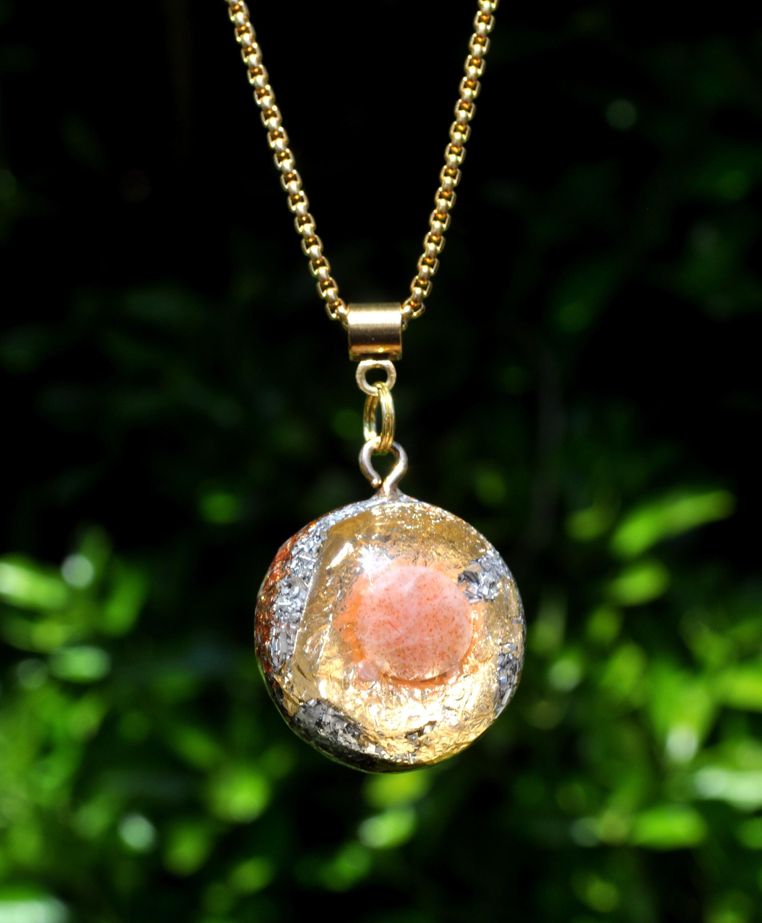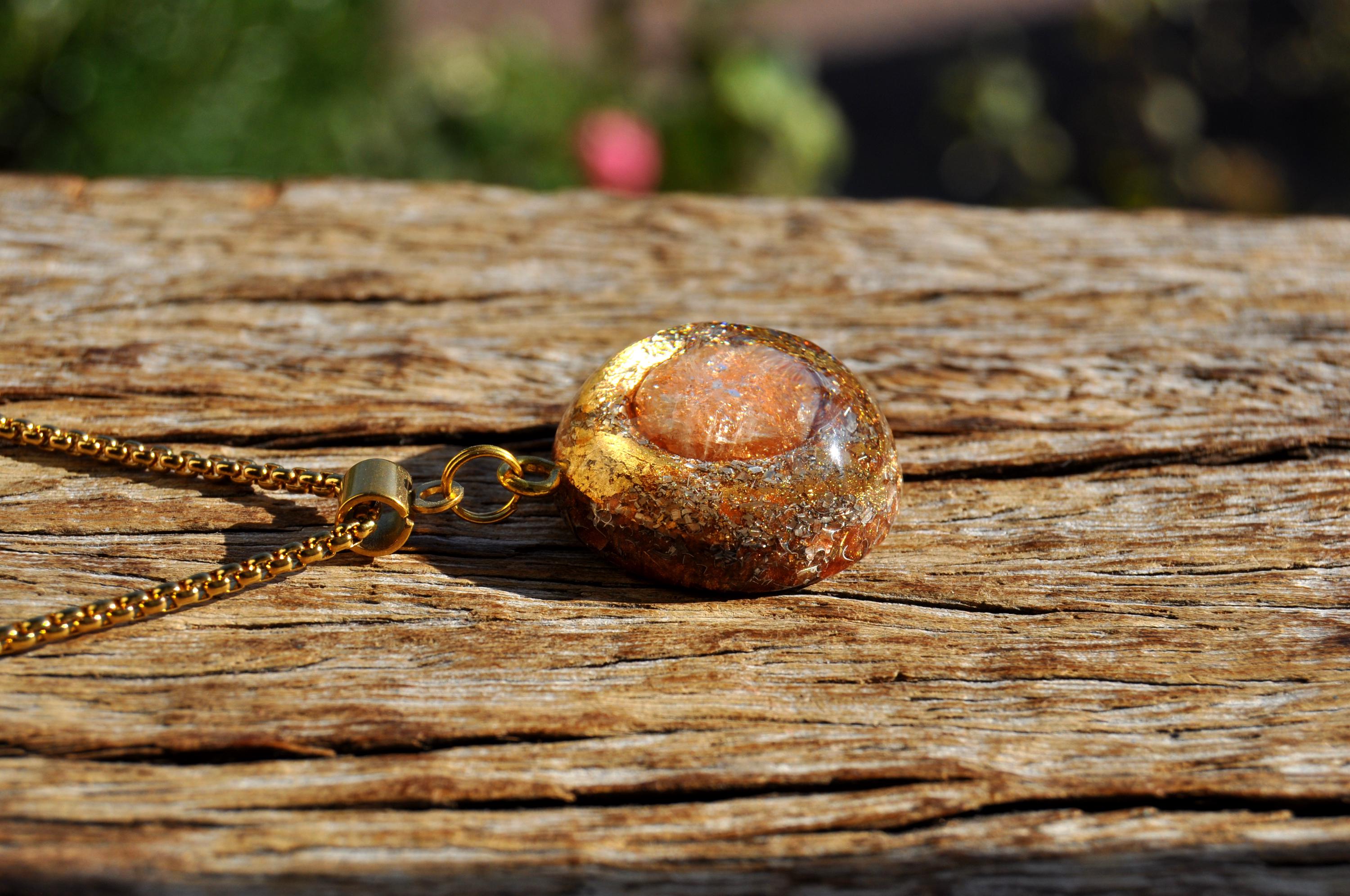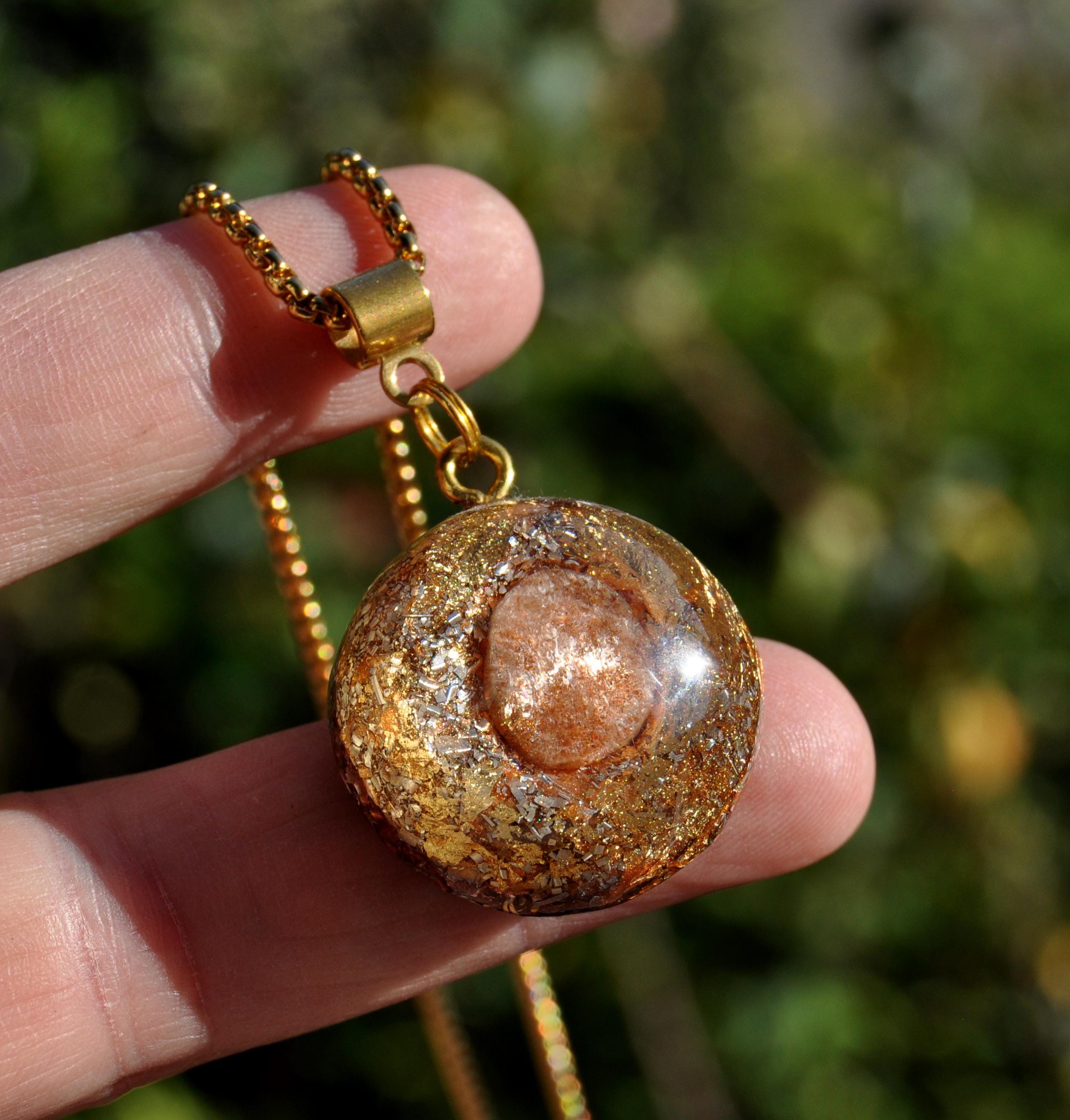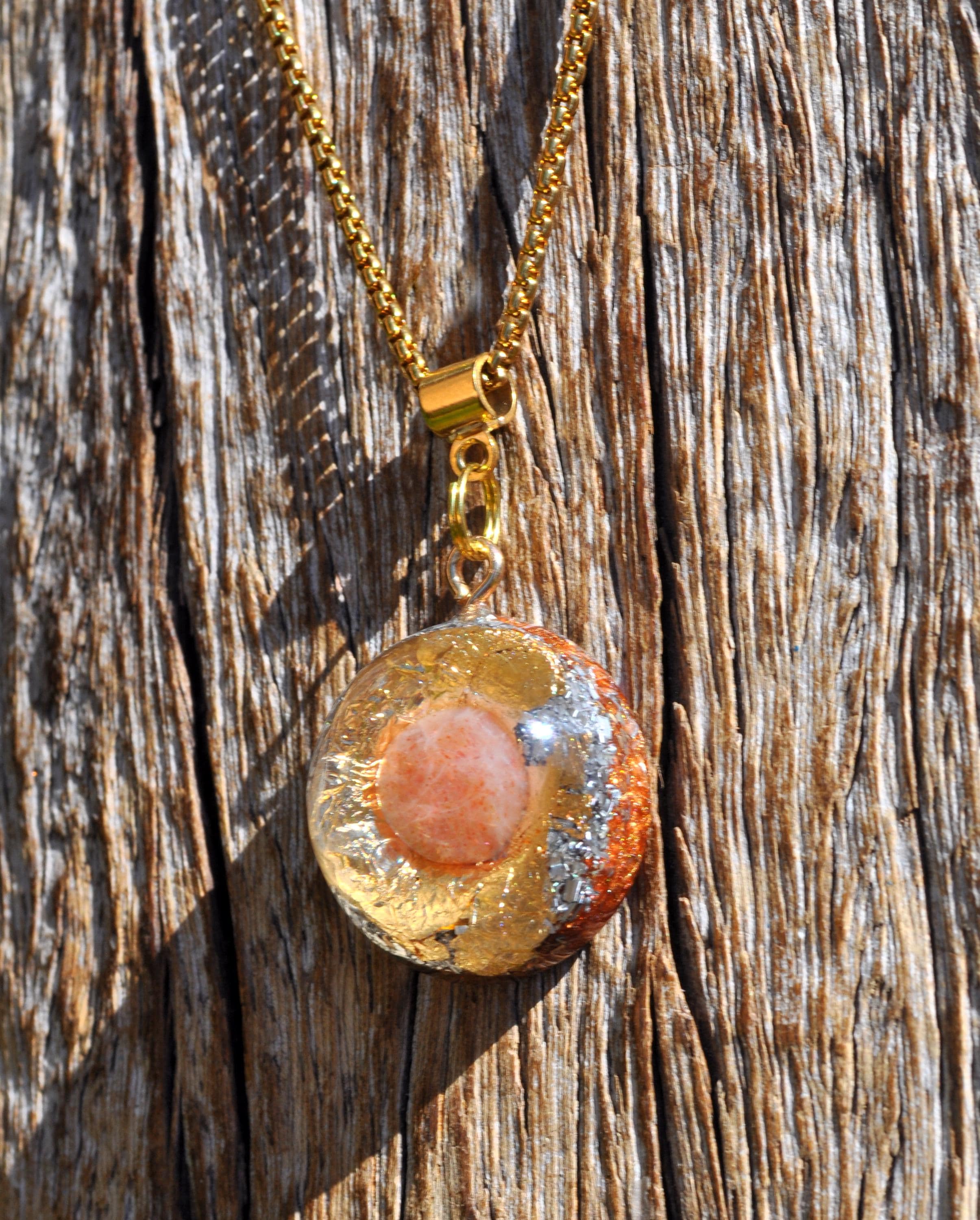 Crafted from a harmonious blend of brass, aluminum, and copper shavings encased in durable polyester resin, this pendant embodies the principles of Wilhelm Reich's research on orgone energy. At its core, it features a polished Sunstone, revered for its ability to invoke vitality and positivity. Each component within this pendant serves a purpose: Pyrite for energizing, Rhodizite for amplification, Black Tourmaline for protection, Selenite for cleansing, and Clear Quartz for its powerful piezoelectric effect.