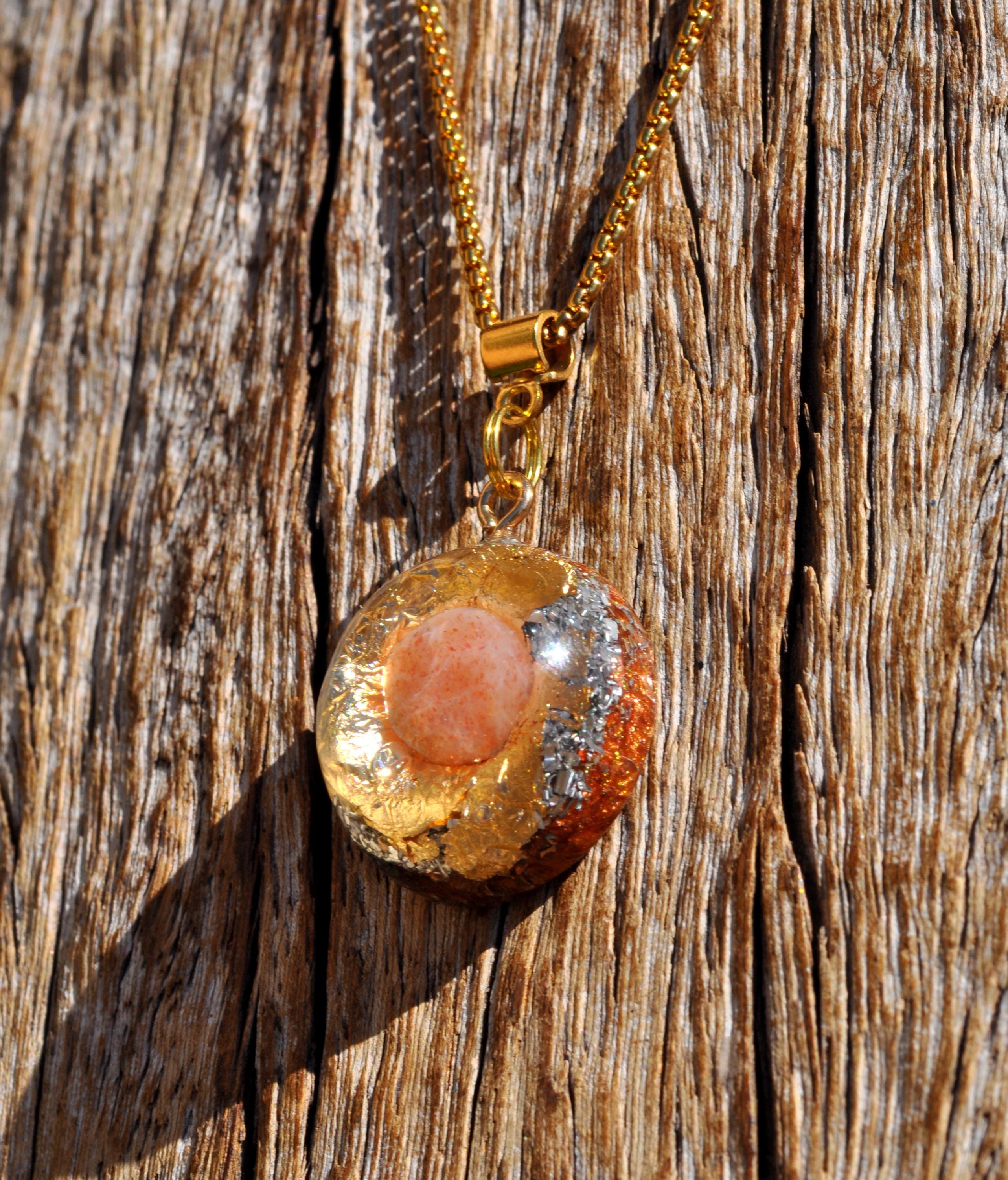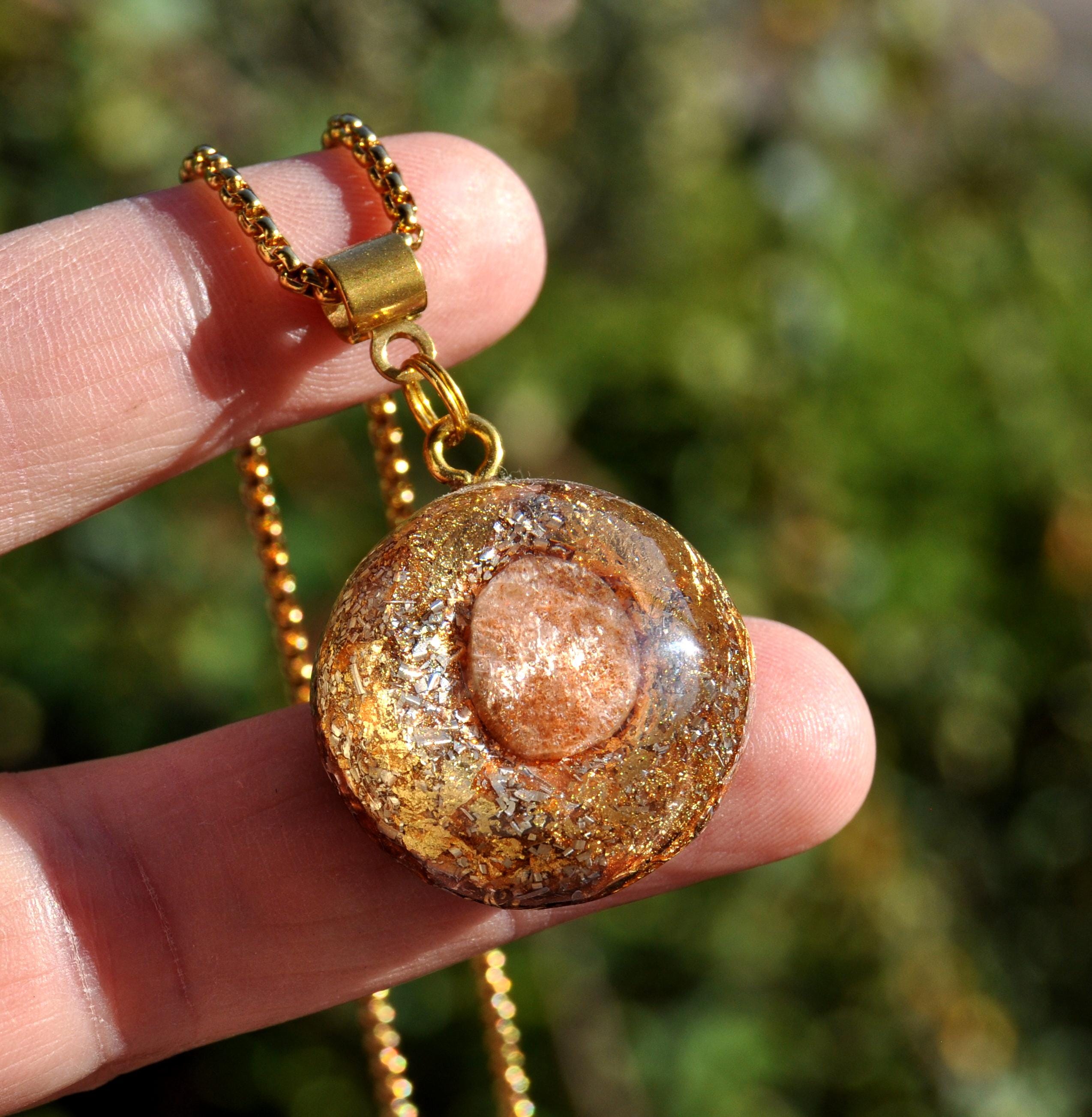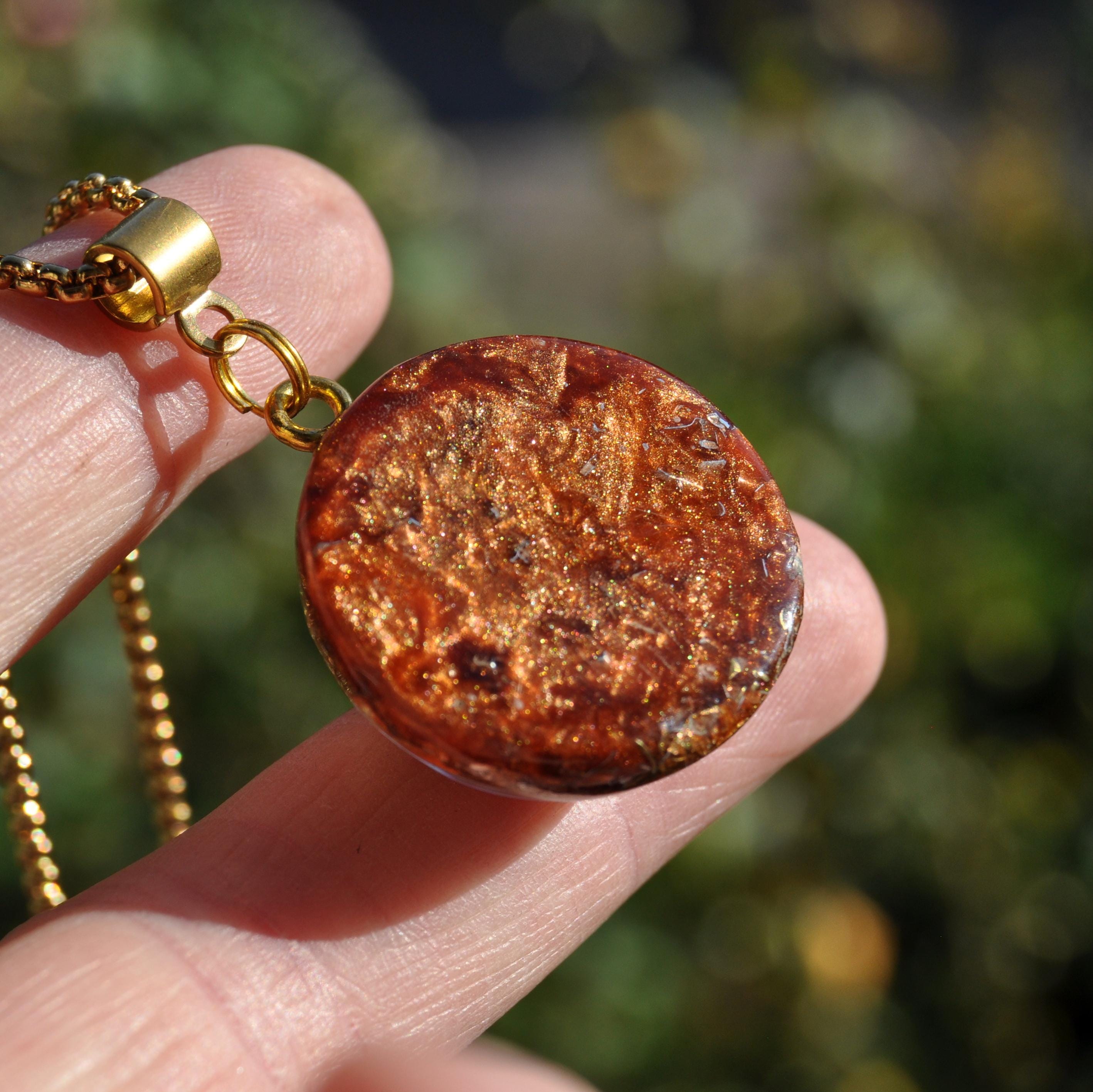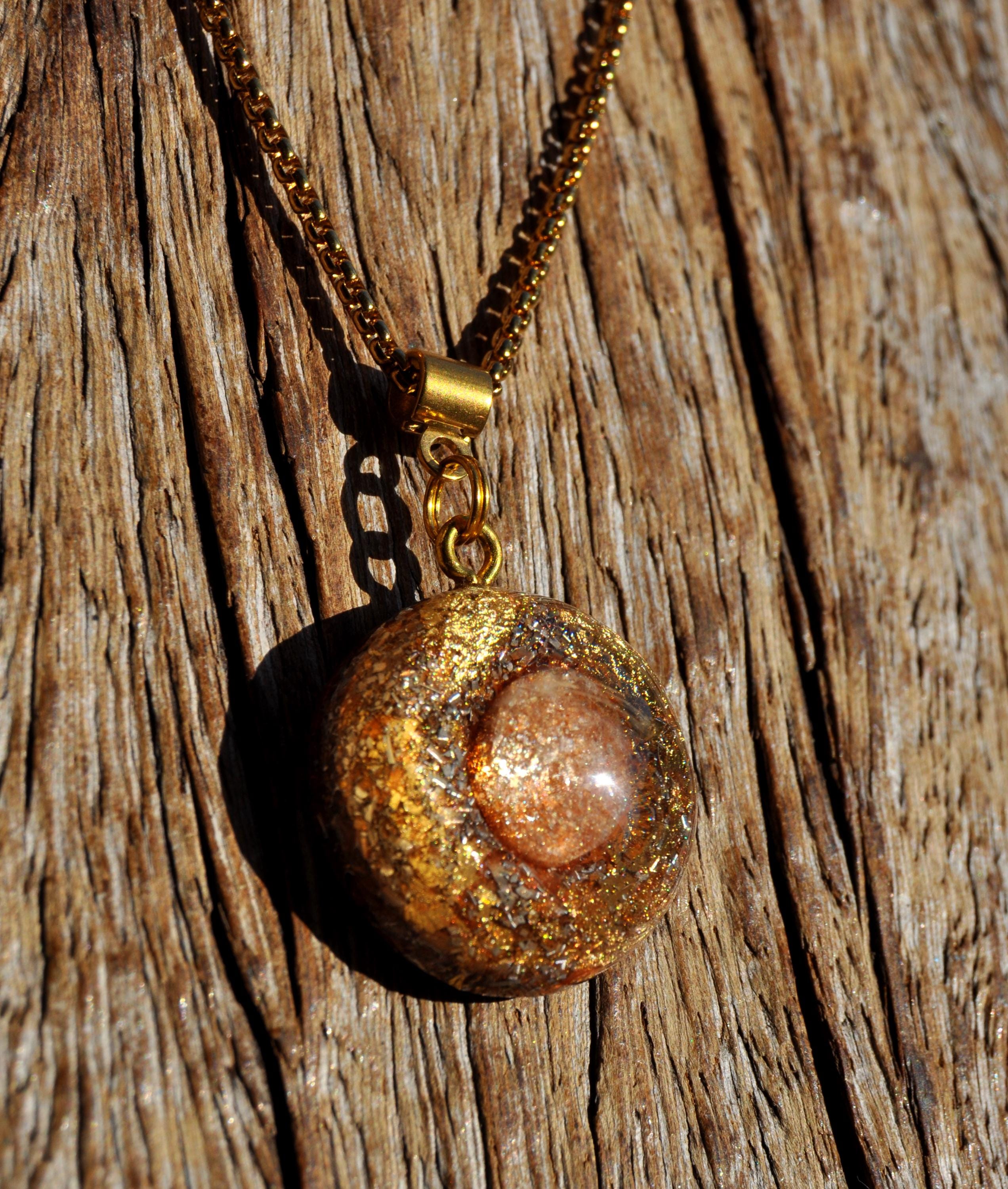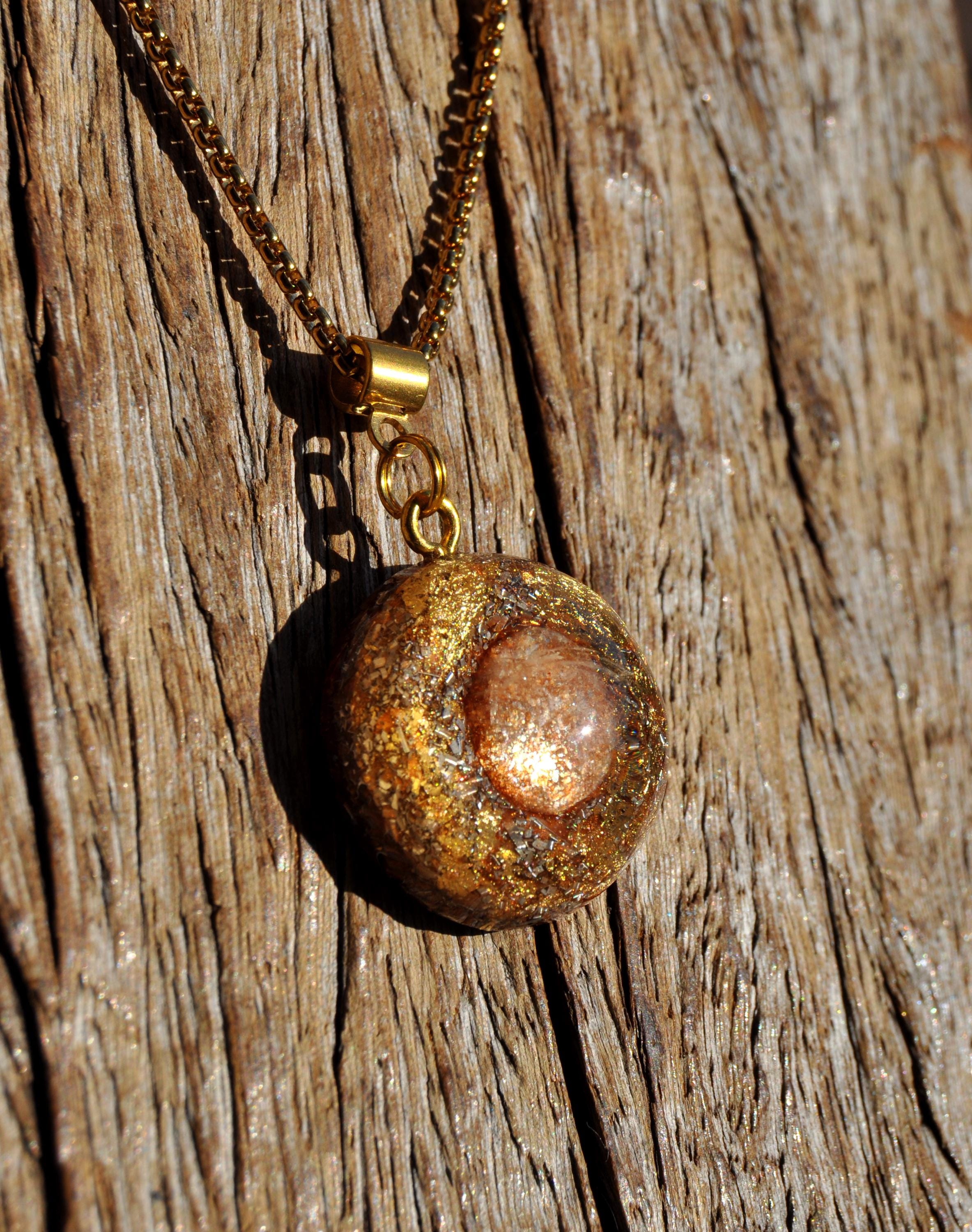 Crafted from a harmonious blend of brass, aluminum, and copper shavings encased in durable polyester resin, this pendant embodies the principles of Wilhelm Reich's research on orgone energy. At its core, it features a polished Sunstone, revered for its ability to invoke vitality and positivity. Each component within this pendant serves a purpose: Pyrite for energizing, Rhodizite for amplification, Black Tourmaline for protection, Selenite for cleansing, and Clear Quartz for its powerful piezoelectric effect.