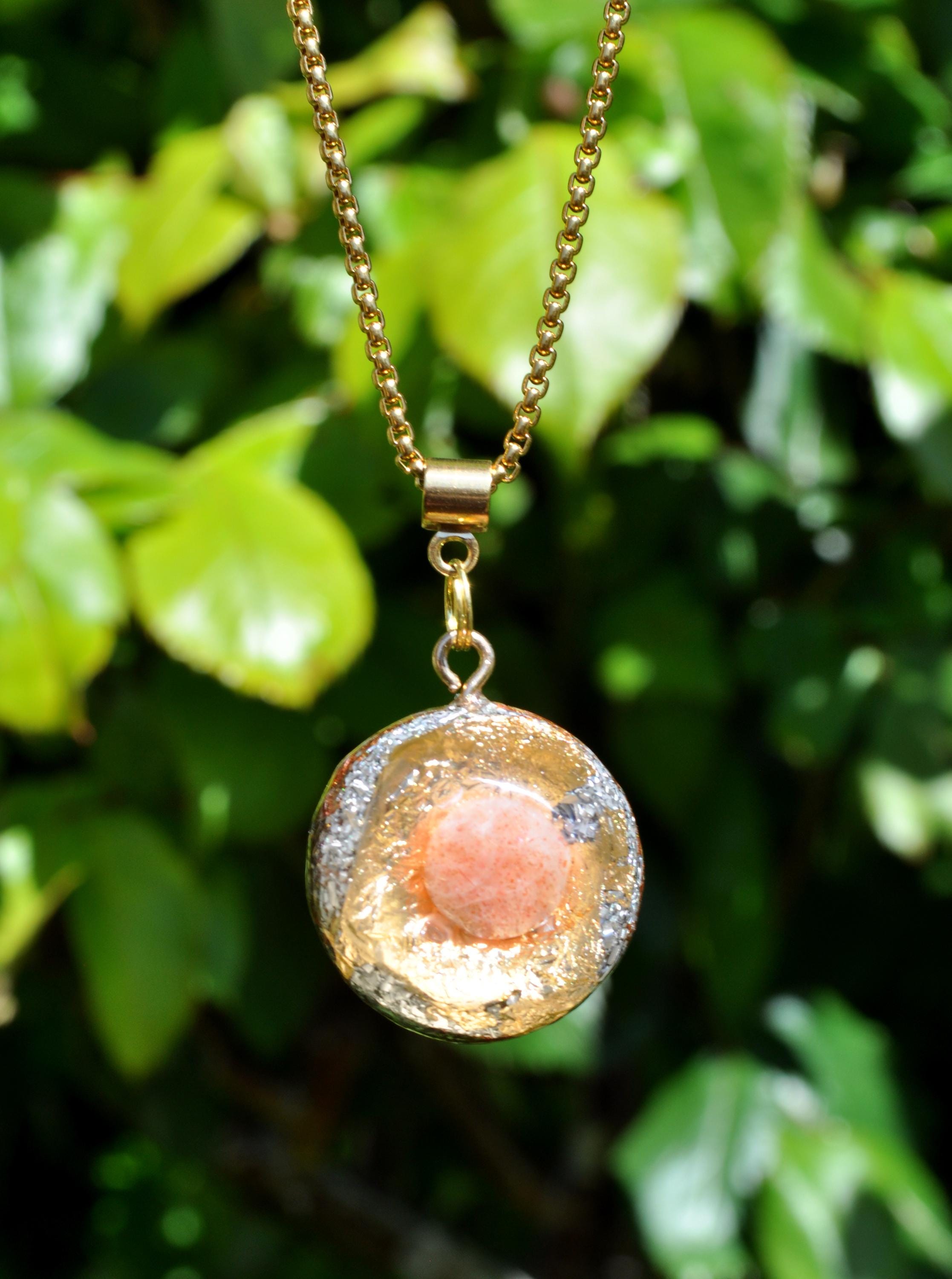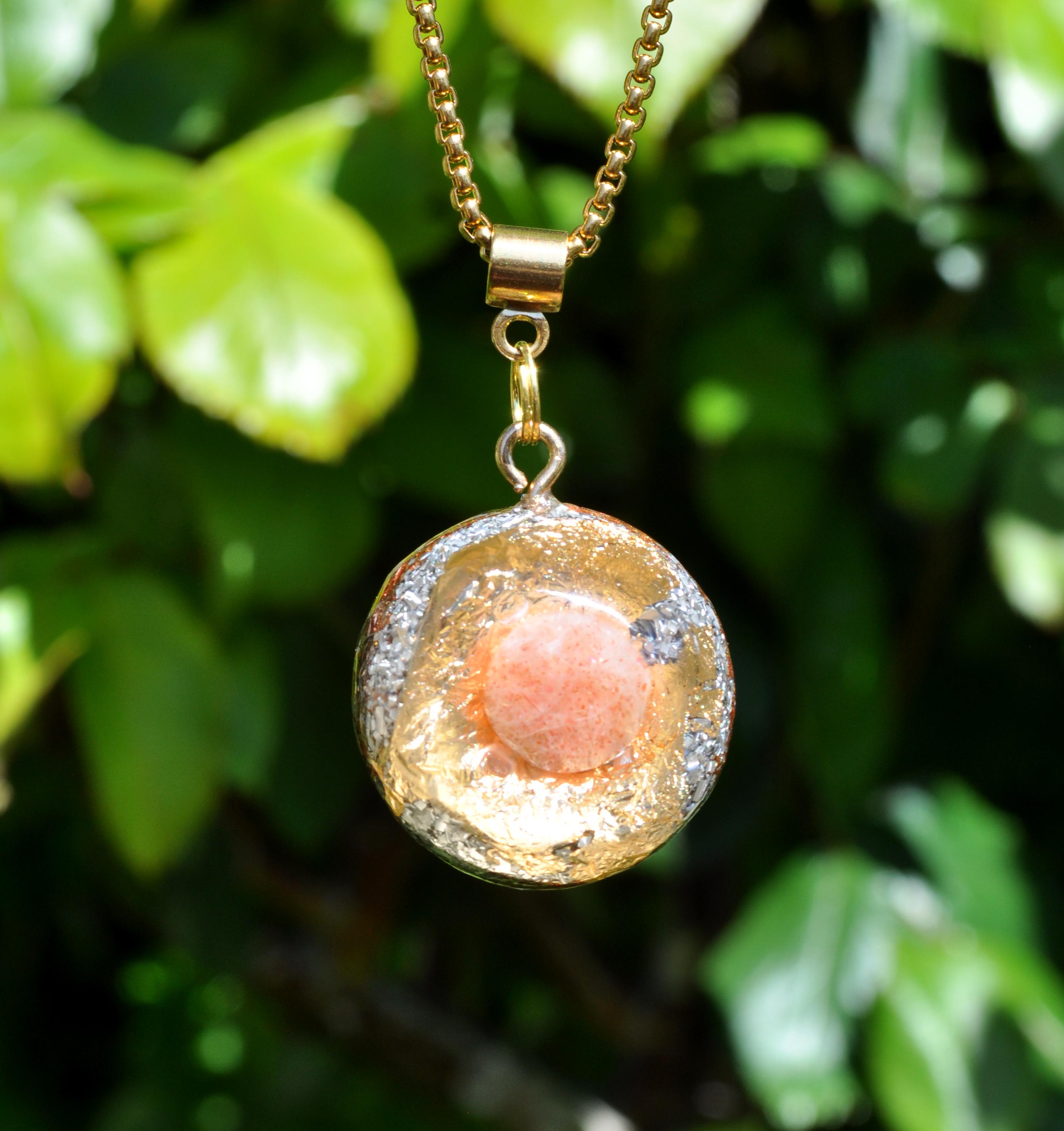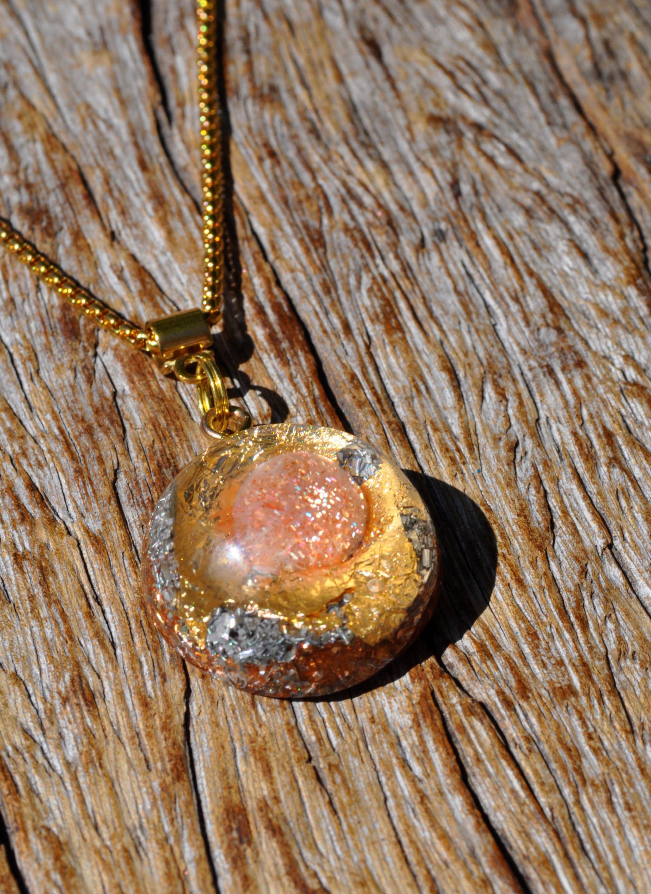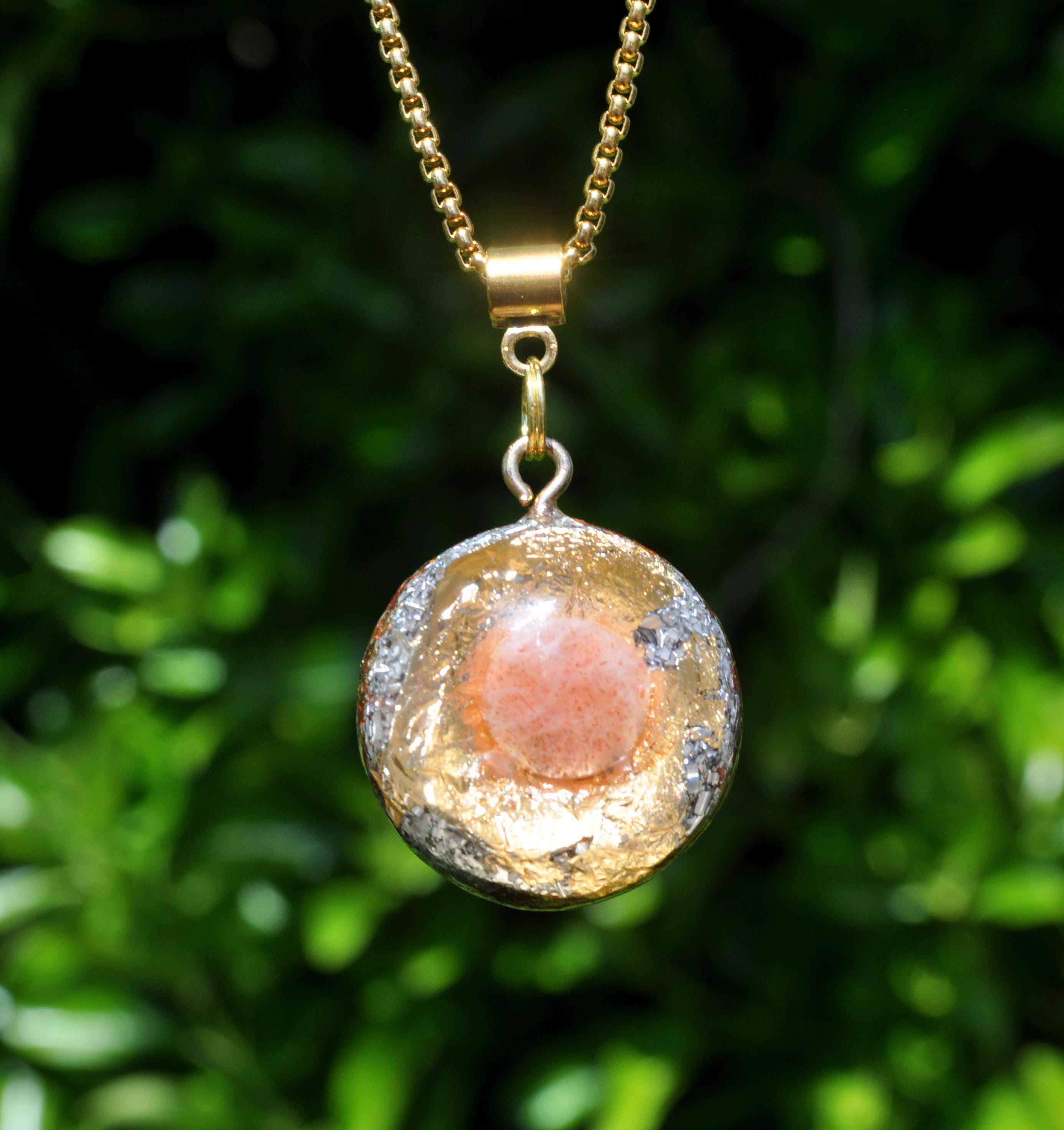Crafted from a harmonious blend of brass, aluminum, and copper shavings encased in durable polyester resin, this pendant embodies the principles of Wilhelm Reich's research on orgone energy. At its core, it features a polished Sunstone, revered for its ability to invoke vitality and positivity. Each component within this pendant serves a purpose: Pyrite for energizing, Rhodizite for amplification, Black Tourmaline for protection, Selenite for cleansing, and Clear Quartz for its powerful piezoelectric effect.