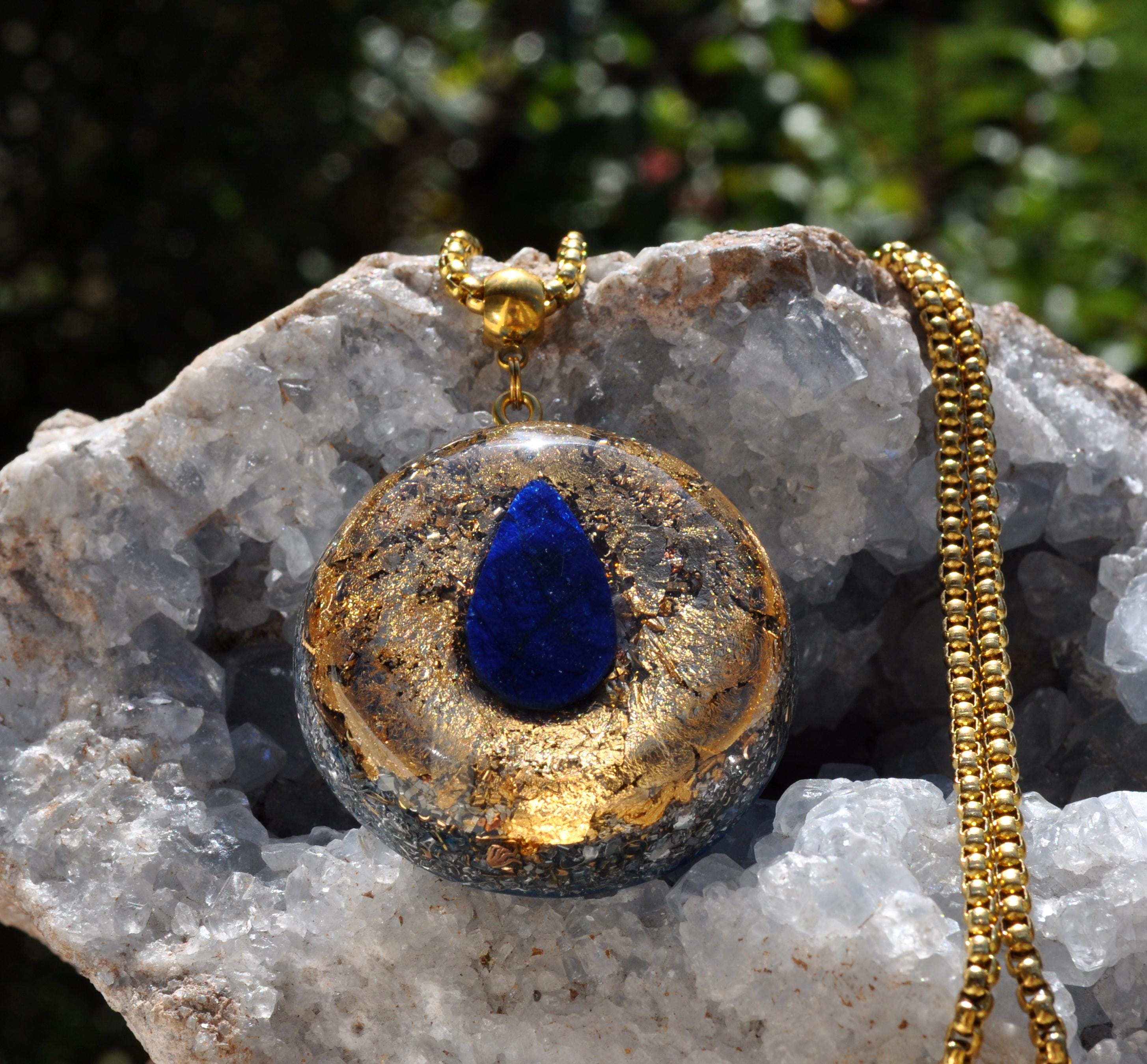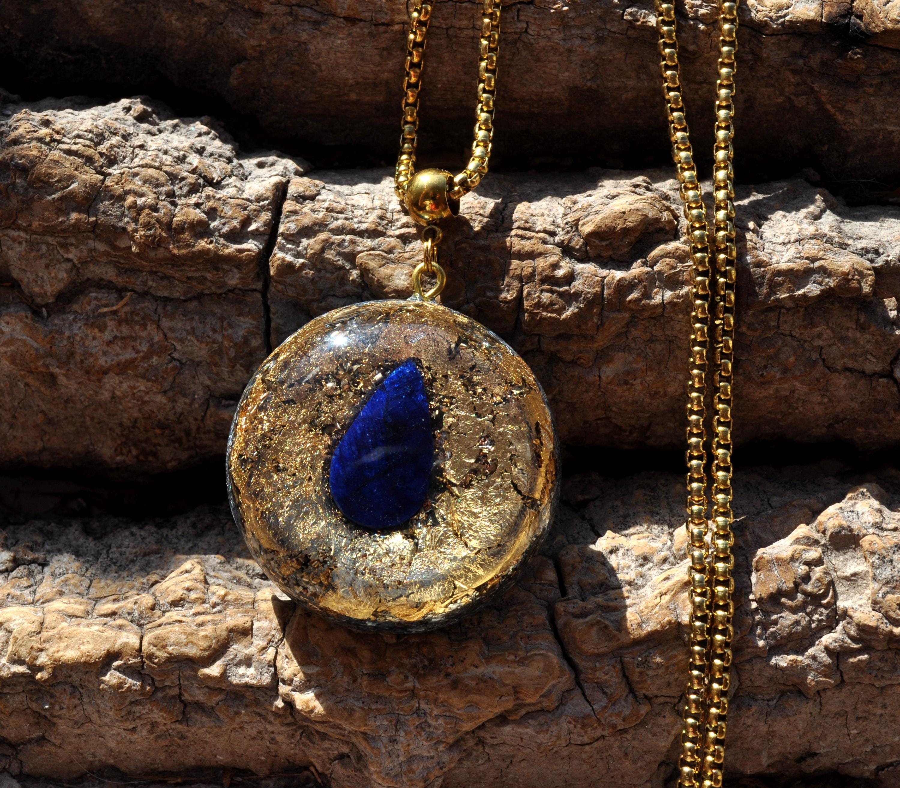 Elevate your energy with this stunning 4.2 cm (1.65") teardrop Orgonite® pendant, handcrafted from a harmonious blend of brass, bronze, copper shavings, and 24K gold leaf. At its heart lies a natural teardrop Blue Sapphire, encircled by shimmering 24K gold leaf, radiating beauty and personal inspiration.